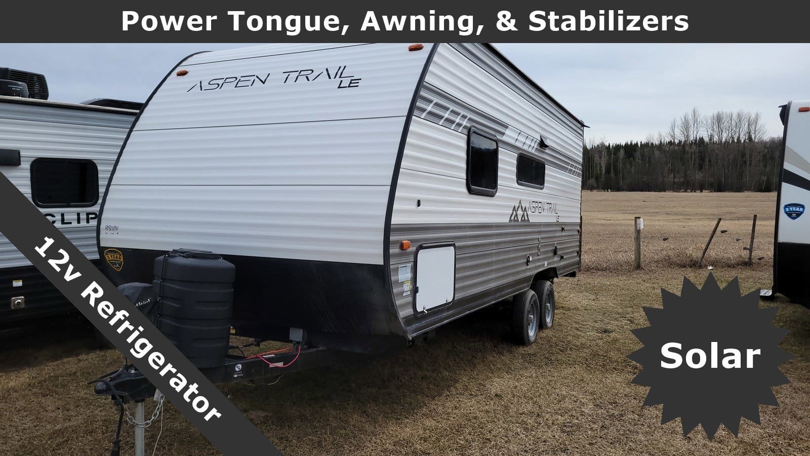 Aspen Trail has the most dynamic range of floorplan options to fit any camping style. With more standard features than its competitors and a focus on quality value and design Aspen Trail delivers the best RV in its class. Whether your trail leads across this great country or simply a staycation the Aspen Trail is your basecamp.Standard Equipment:ExteriorFront/Rear Power Stabilizer JacksPower Awning with LED LightsBattery Disconnect SwitchMagnetic Baggage Door CatchesBlack Tank Flush15000 BT