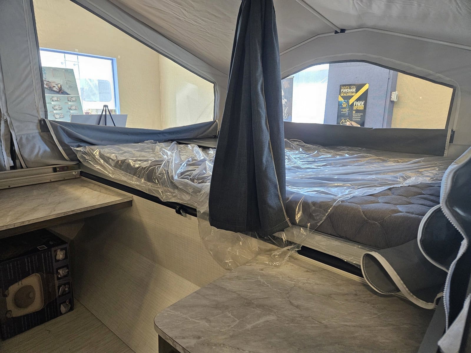 Standard Features (2024)Autumn Wood InteriorWood Look FlooringResidential Style Cabinet DoorsWood Drawers w/ Full Extension Metal GuidesOne Piece Screen DoorRoof VentPrivacy Curtains2 Rear Stabilizer Jacks w/ Sand PadsQuilted Top Bed Mattress12 Radial TiresNitrogen Filled TiresLeaf Spring AxlesTakes 2 BallSolar Prep on FrameOff The Ground PackageBlack ExteriorBattery Box & WireStepCO DetectorElectric BrakesSpare Tire w/ Carrier & CoverInterior LED Lights