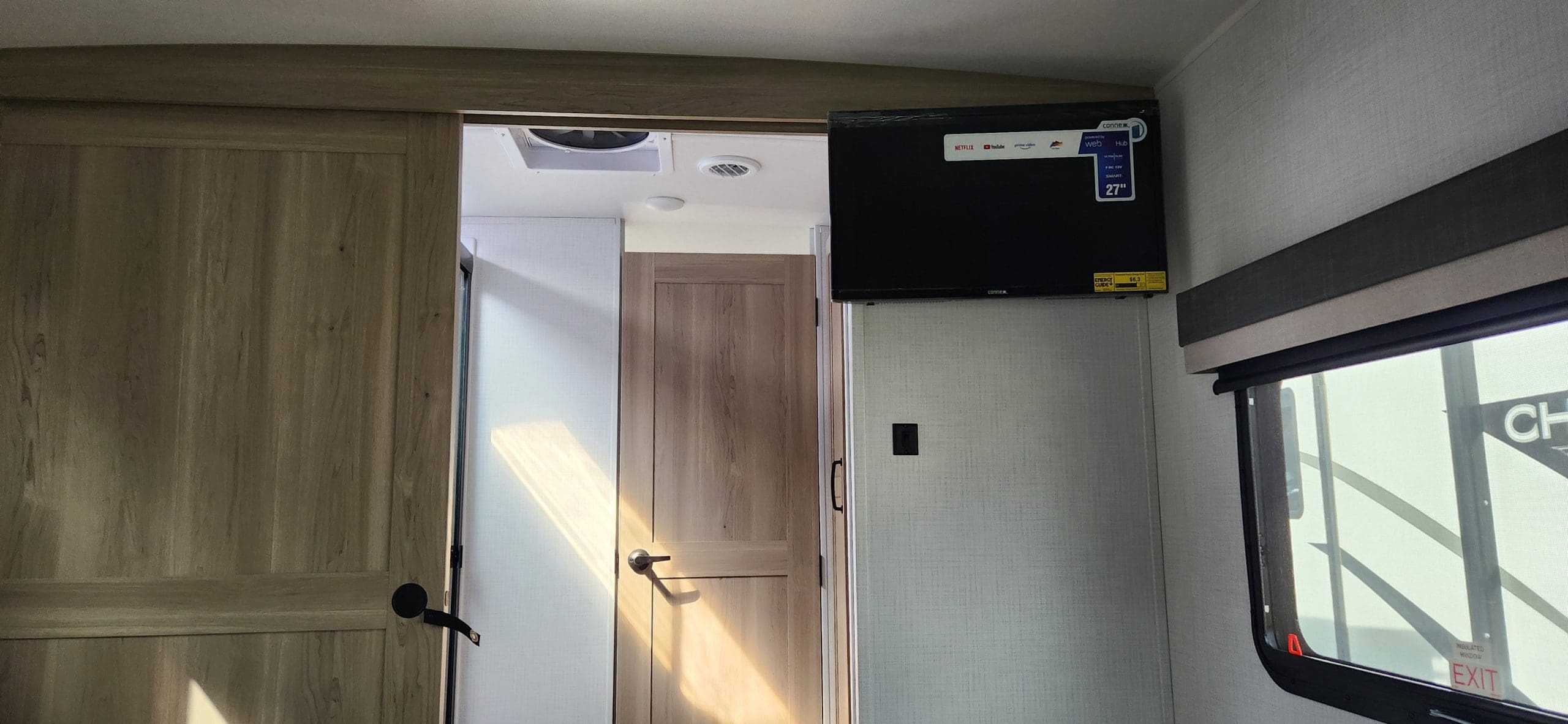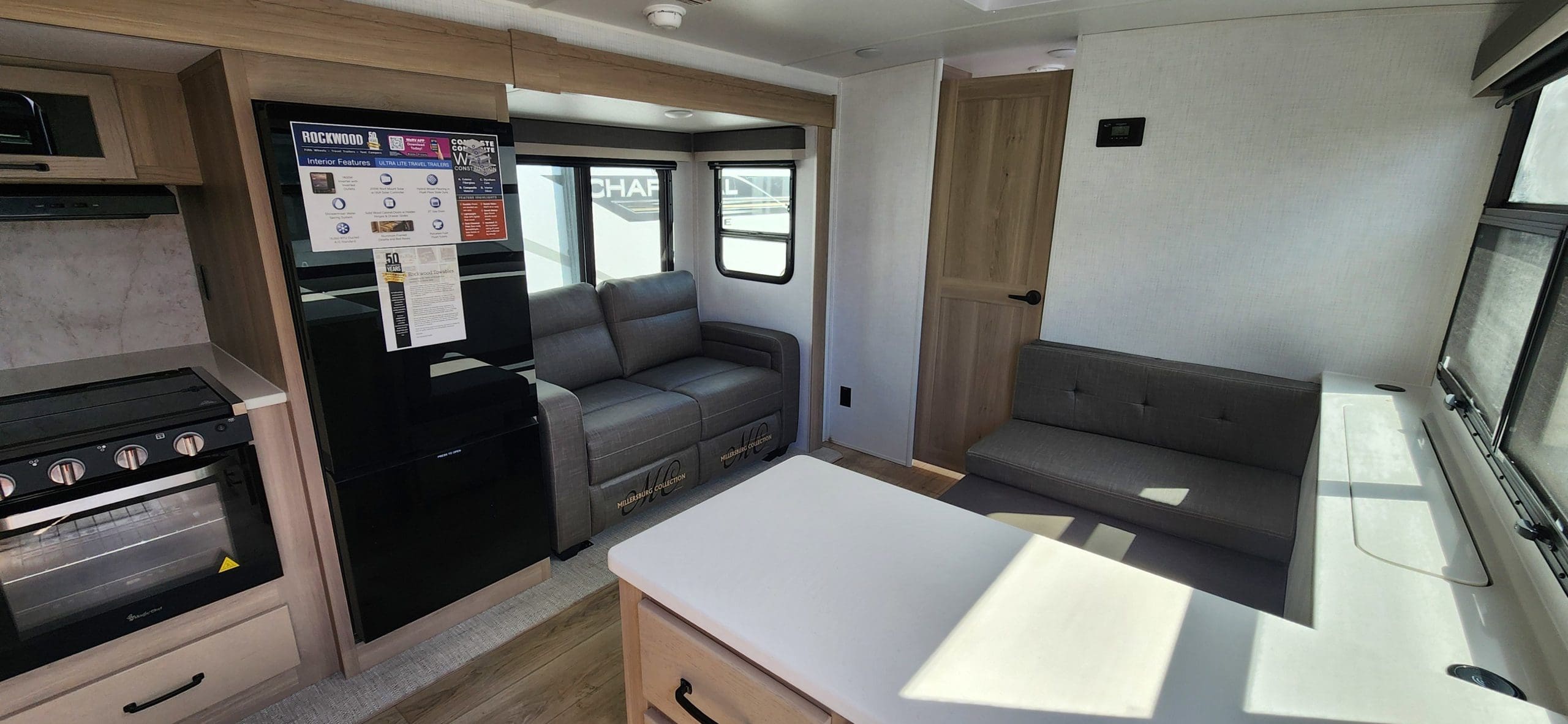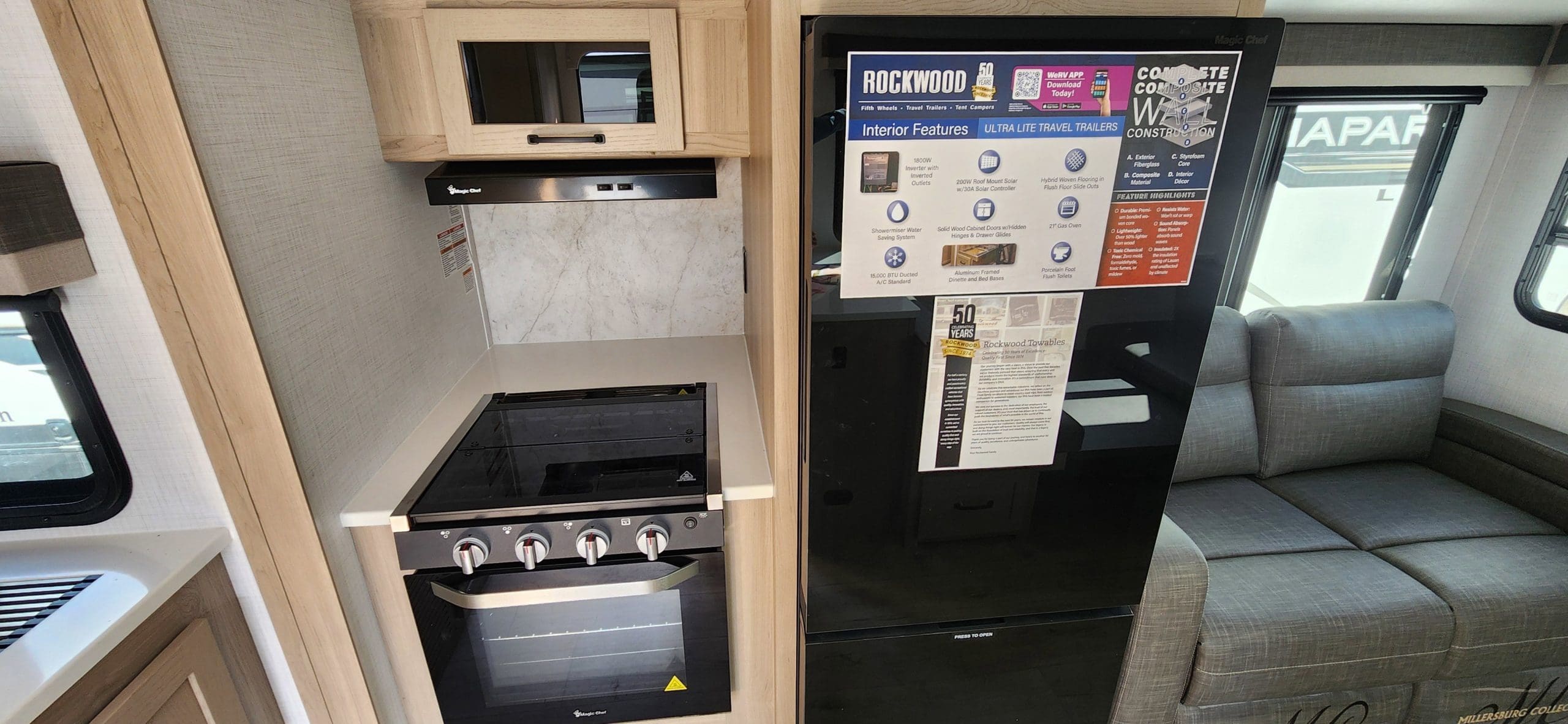 Interior FeaturesSedonwood CabinetryScrewed & Glued Solid Wood Cabinet Doors & Drawers with Hidden Hinges Metal Drawer Glides & Residential-Style Hardware35K BTU FurnaceCarbon Monoxide DetectorInterior 12V USB OutletOneControl Panel with WeRV App Control55 AMP Converter with ChargerCeiling LED 12V Interior LightingQuick Recovery Water Heater w/ Interior Gas/Electric Switches50 Amp Service and Digital Dual Thermostat Control15000 BTU Ducted Air ConditionerNight Roller ShadeLiving Area Features