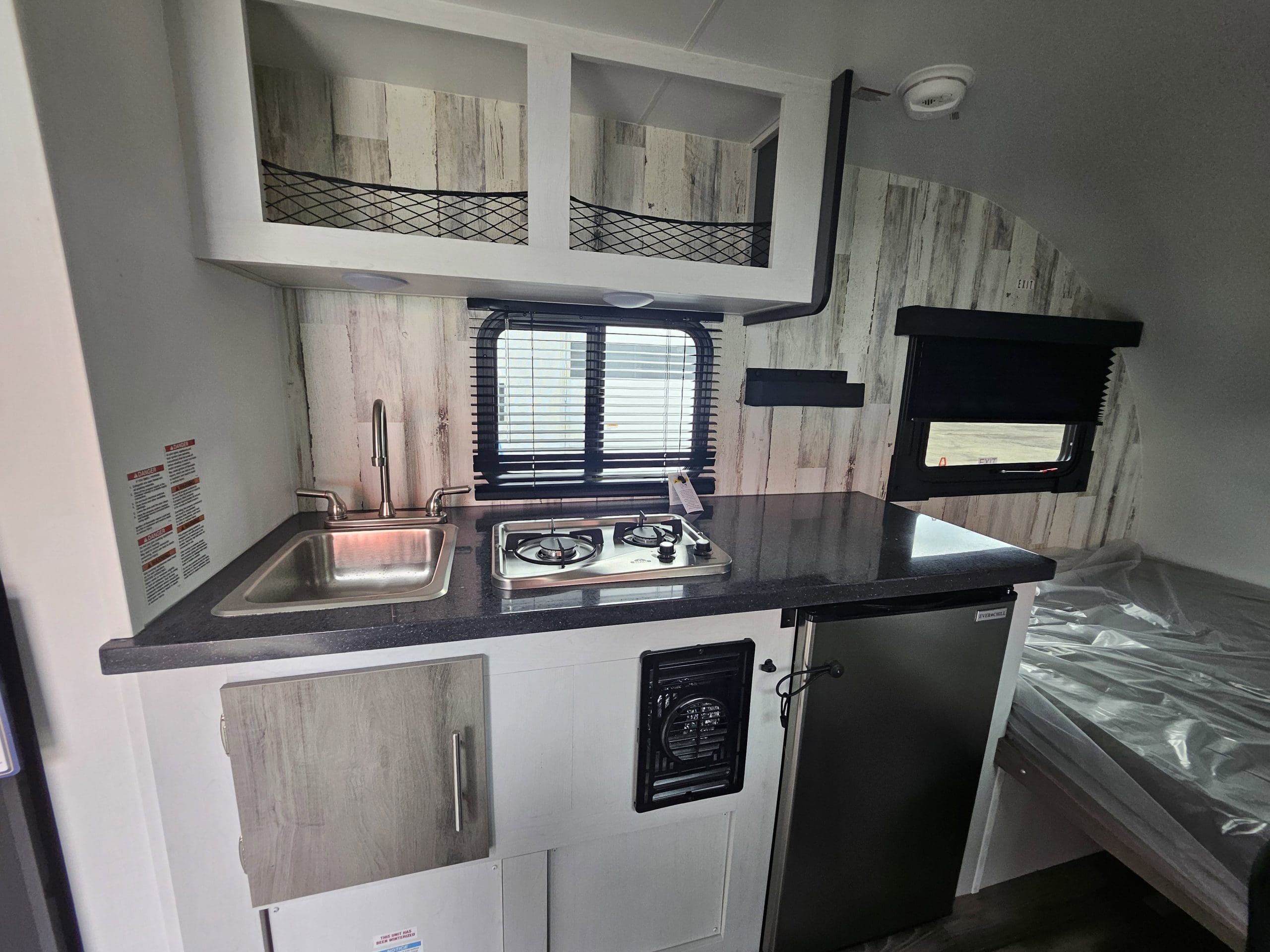 Standard FeaturesHydro-Lite Sidewalls13 Custom Lite-weight Aluminum Wheels2500# Axle w/Electric Brakes (3500# on RB Models)Rear Stabilizer JacksLED DOT Running Lights10GL Fresh/30GL Gray/15GL Black Water Tanks (10/30/30 16RB)On-Demand Tankless Hot Water HeaterSingle Bowl Stainless Steel SinkHigh Rise Kitchen FaucetShur-Flo Water Pump40 AMP ConverterBattery Disconnect SwitchSolid Surface Kitchen & TableWood Grain Cabinetry12volt 3.3Cu Refrigerator2-Burner Stainless Steel Stovetop18000 BTU Fur