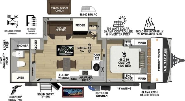 Go Discover Value Package:Aluminum Framed Floor w/ Block Foam InsulationSealed Underbelly w/ Forced Heat & Radiant Foil Barrier12V Tank Heaters,Goodyear Tires w/ TPMSCustom King Bed400 Watt Solar30 Amp Charge Controller w/ Solar Inverter Prep15K A/CCentral VAC SystemTankless on Demand Water Heater12V Black Glass RefrigeratorAir Fryer MicrowaveBar2Table Pull-Out Dinette (N/A 25RL)Trailgate Outdoor Bar (N/A 25RL)Outdoor Camp KitchenHot & Cold Exterior Spray PortSeamless Surf-X Kitchen CountertopsB