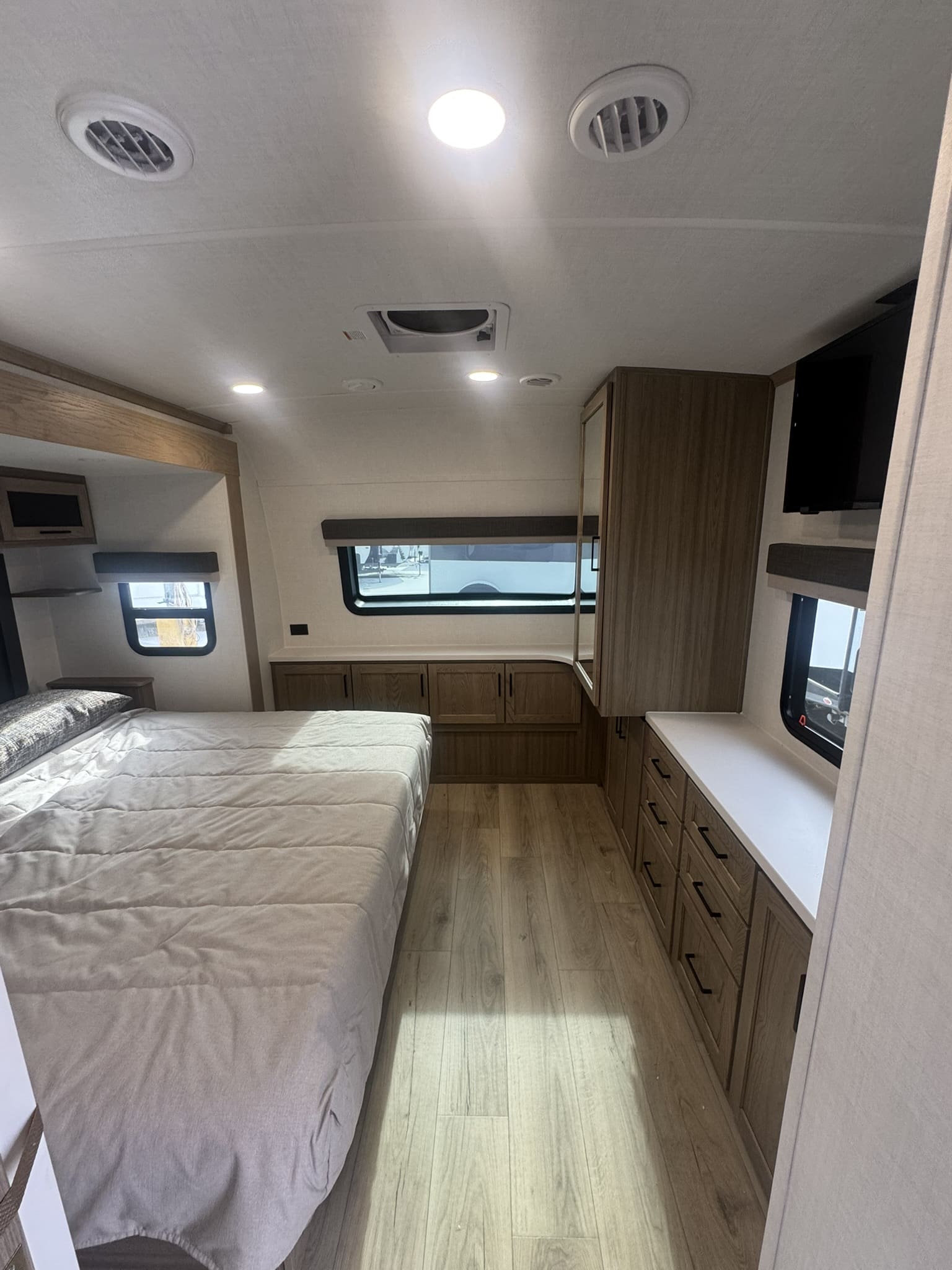 Bedroom Suite: Features a standard King Bed slide-out, a large front wardrobe, and a dedicated closet. The front wall includes additional countertop space with storage underneath.
