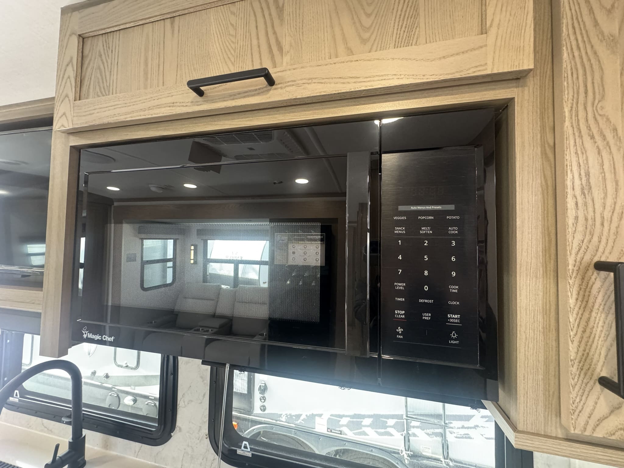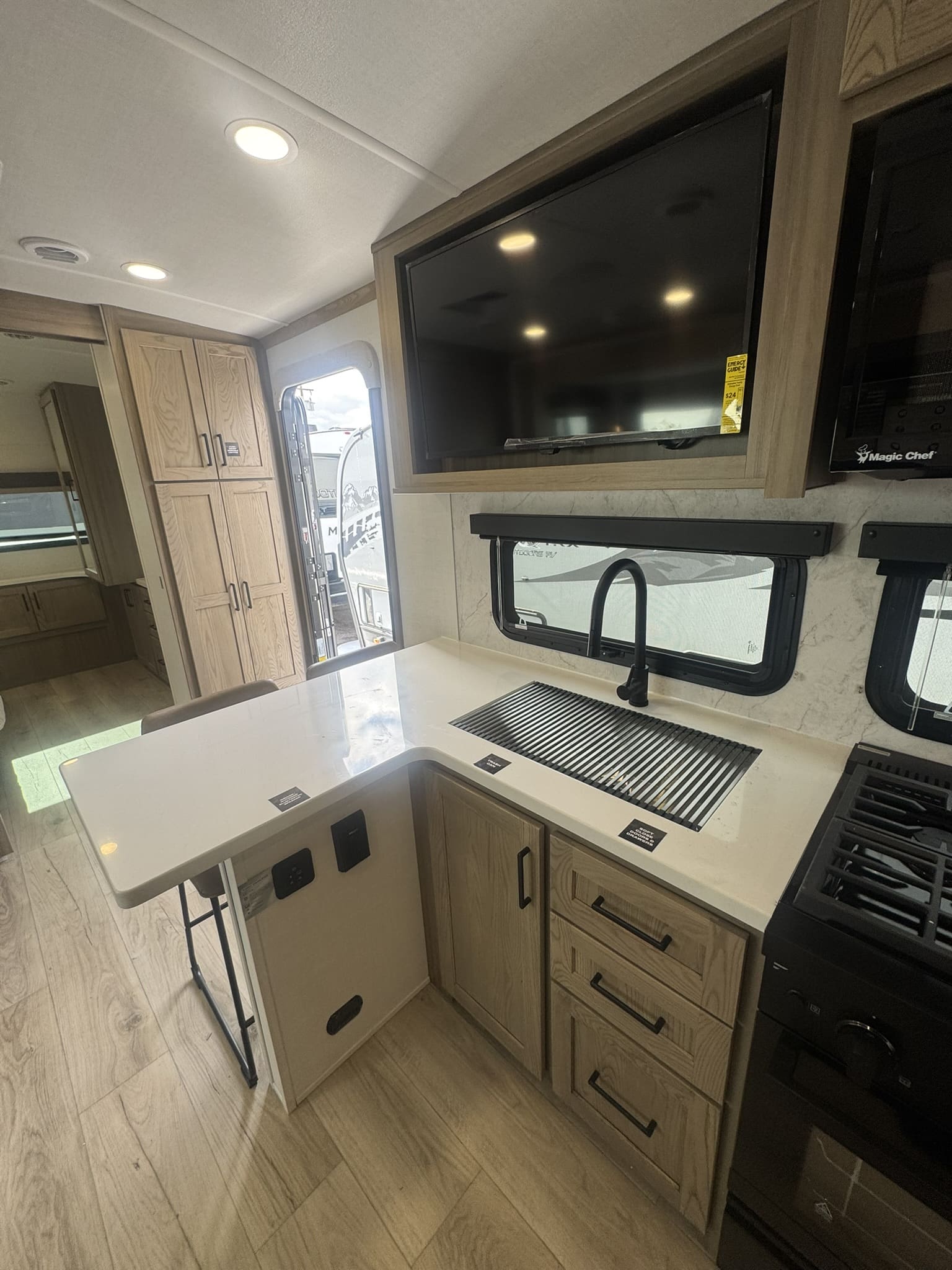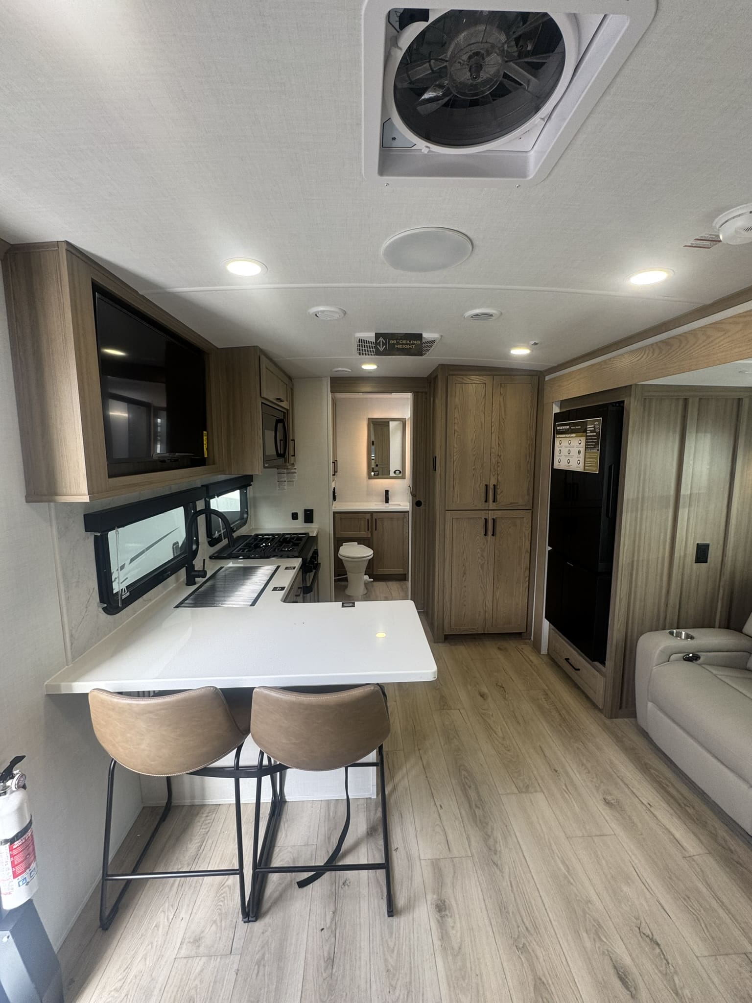Gourmet Kitchen: Equipped with a 12V refrigerator, residential-style gas range, and solid-surface countertops. It also includes a unique counter with stools for indoor dining.