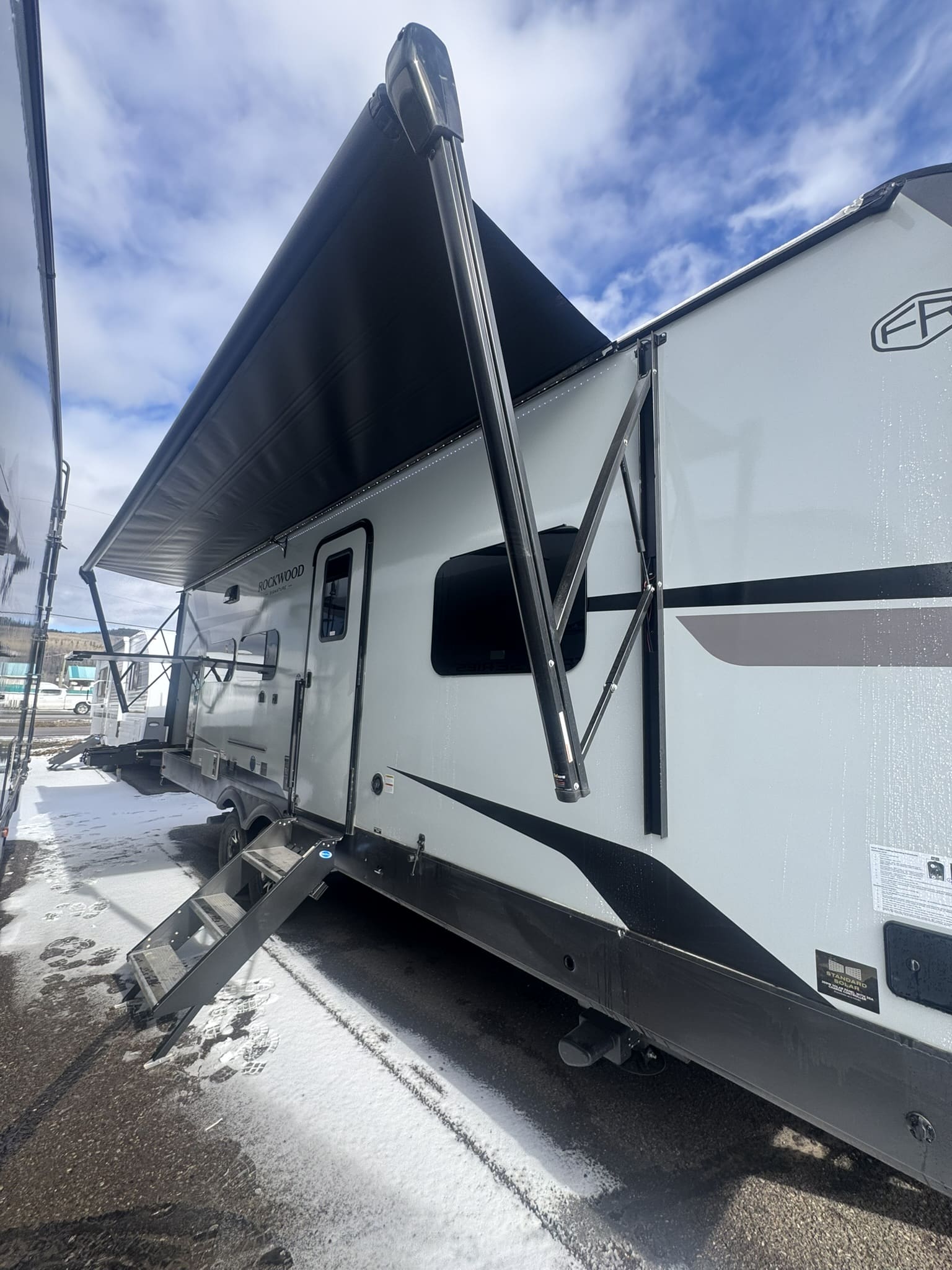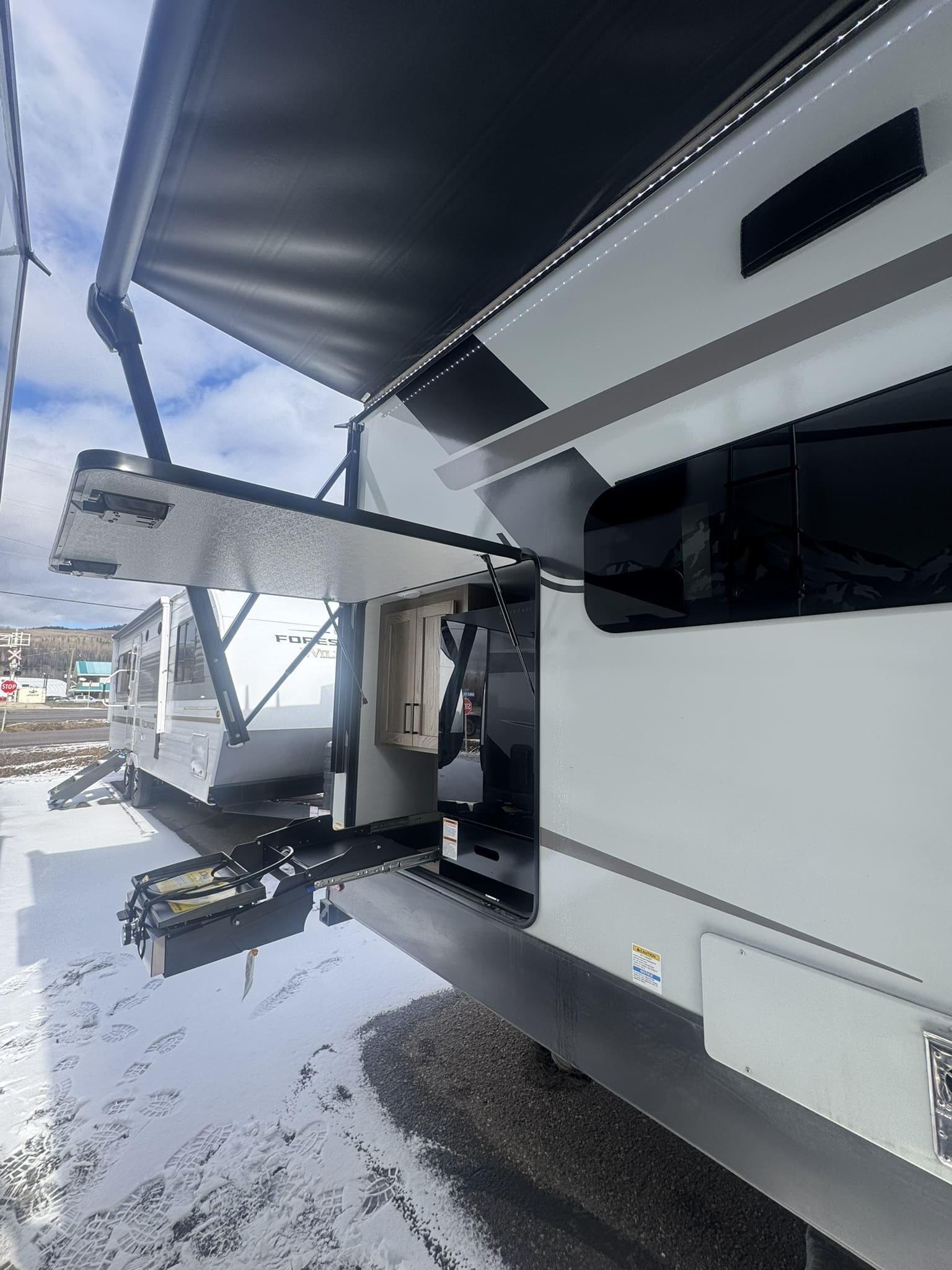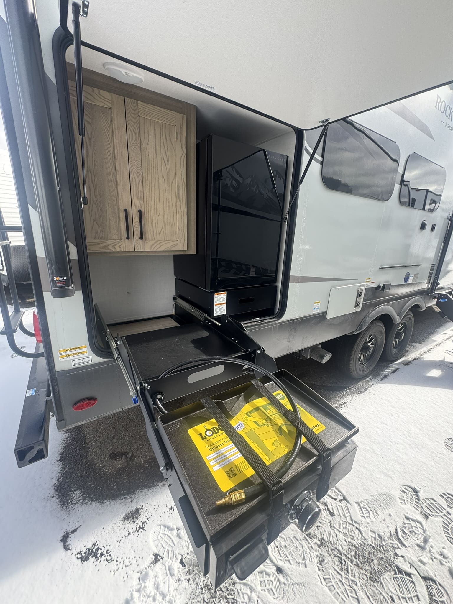 Outdoor Amenities: Includes a full outside kitchen with a griddle and a massive 22′ power awning for outdoor entertaining.