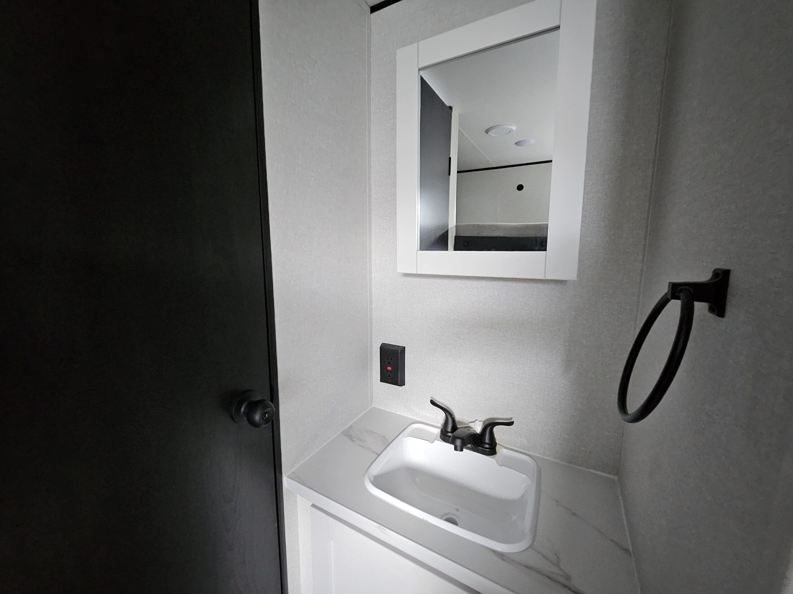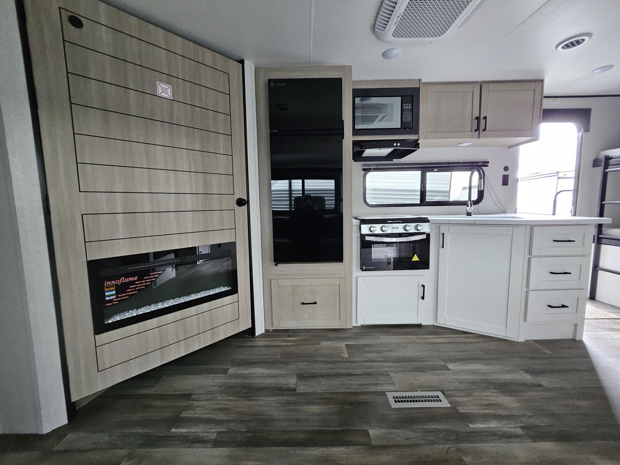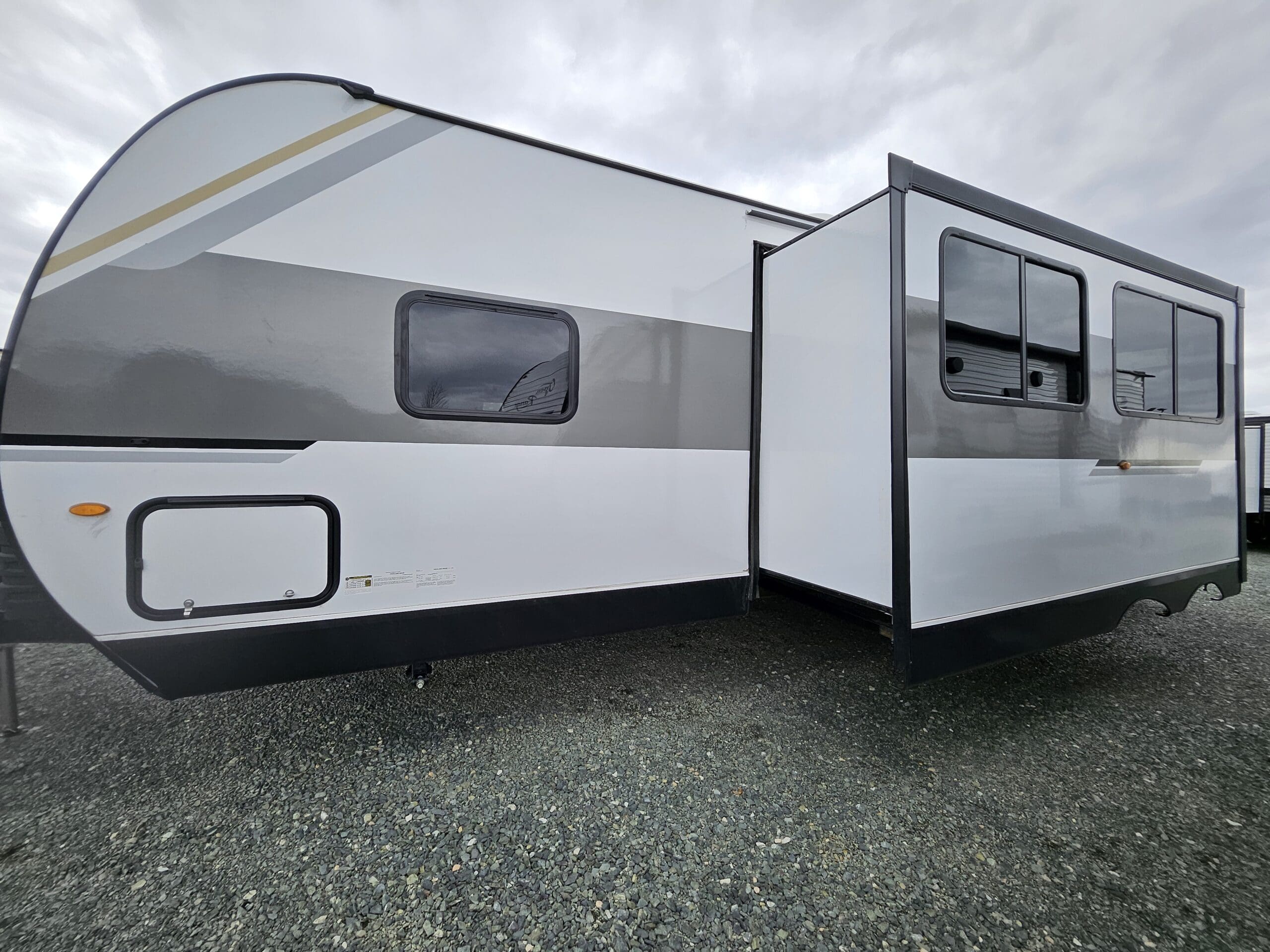 Outdoor Amenities: Equipped with a 20-foot power awning with LED lighting and an outside kitchen, perfect for tailgating or keeping the heat out of the trailer.