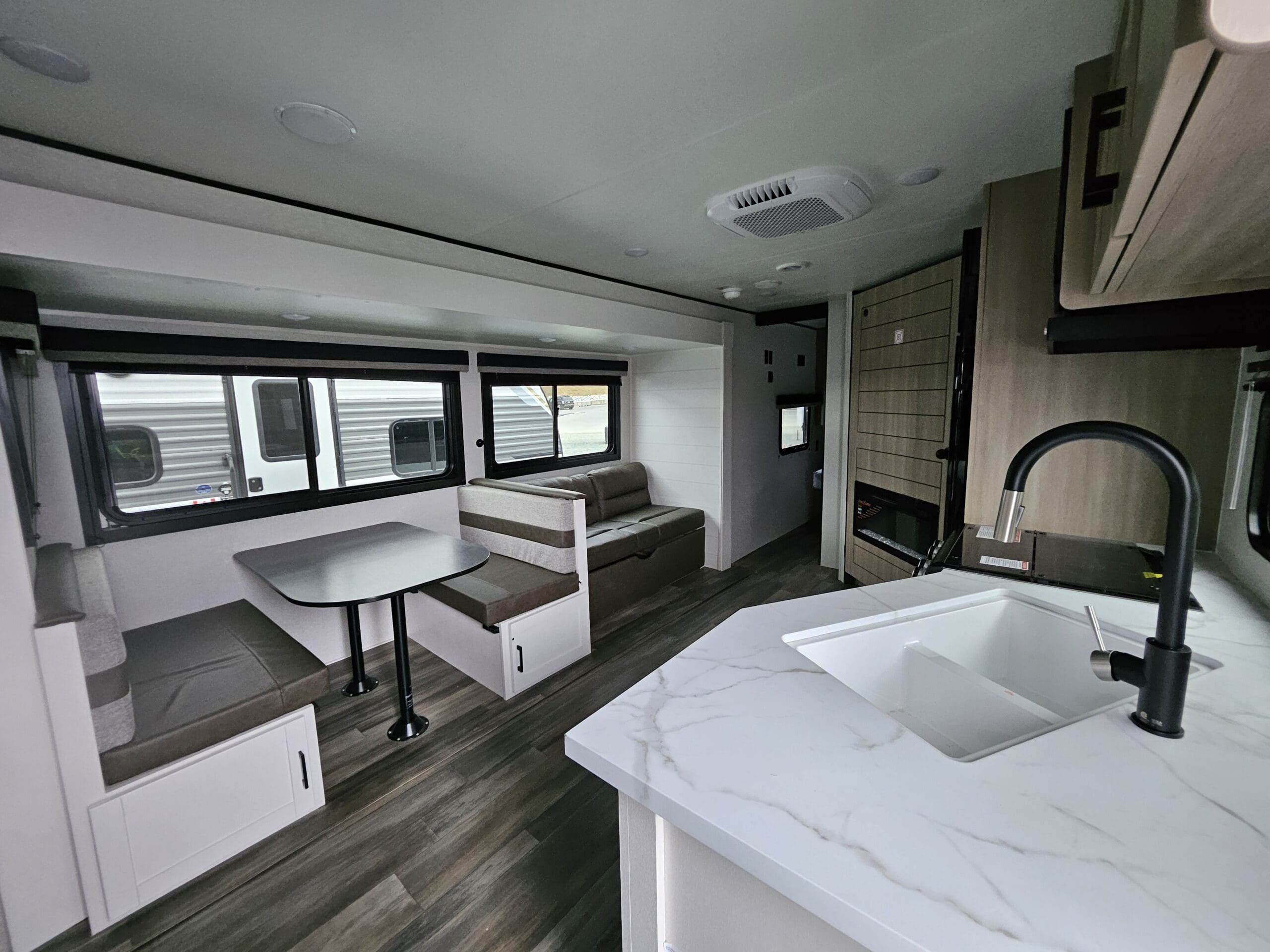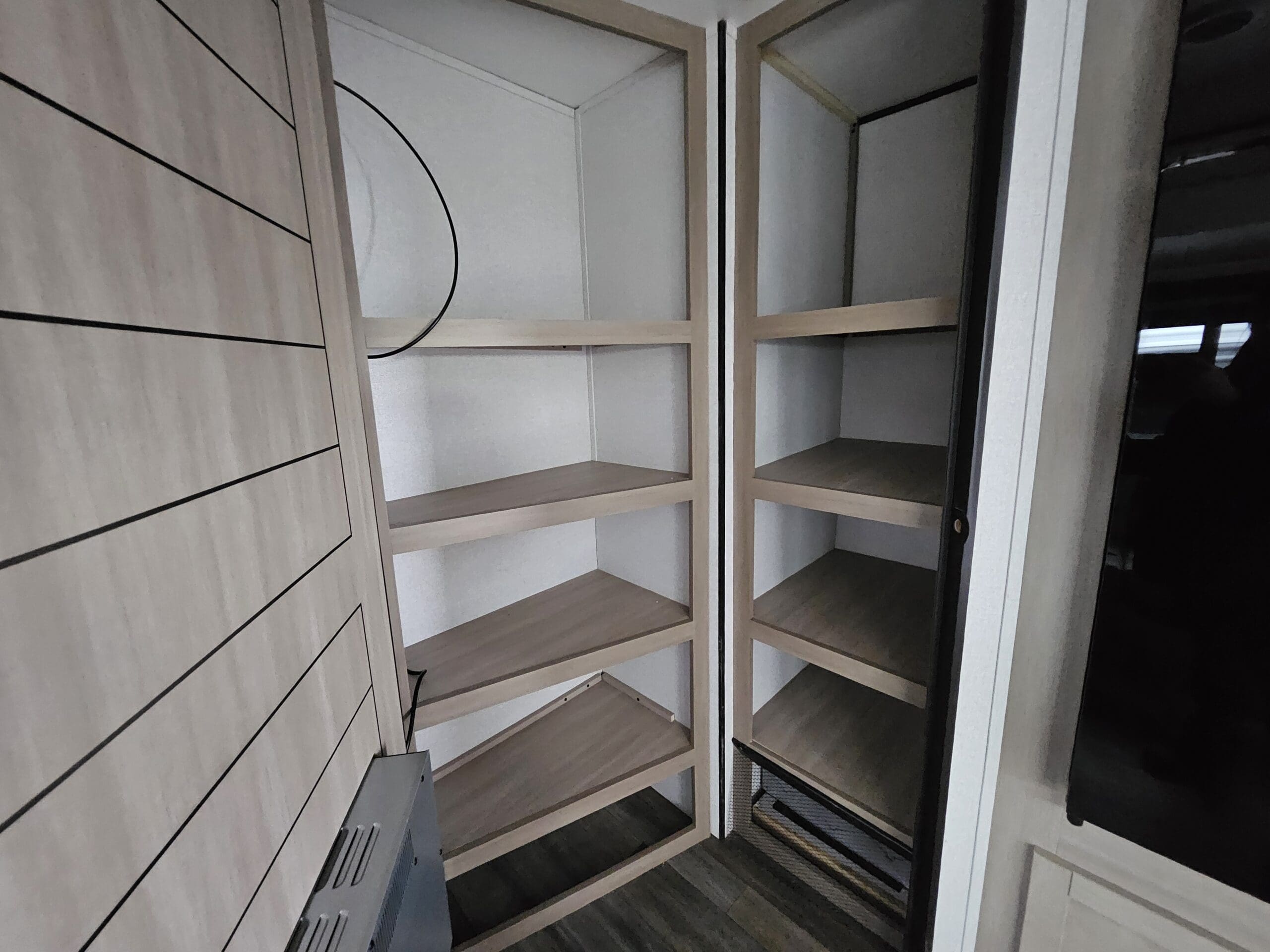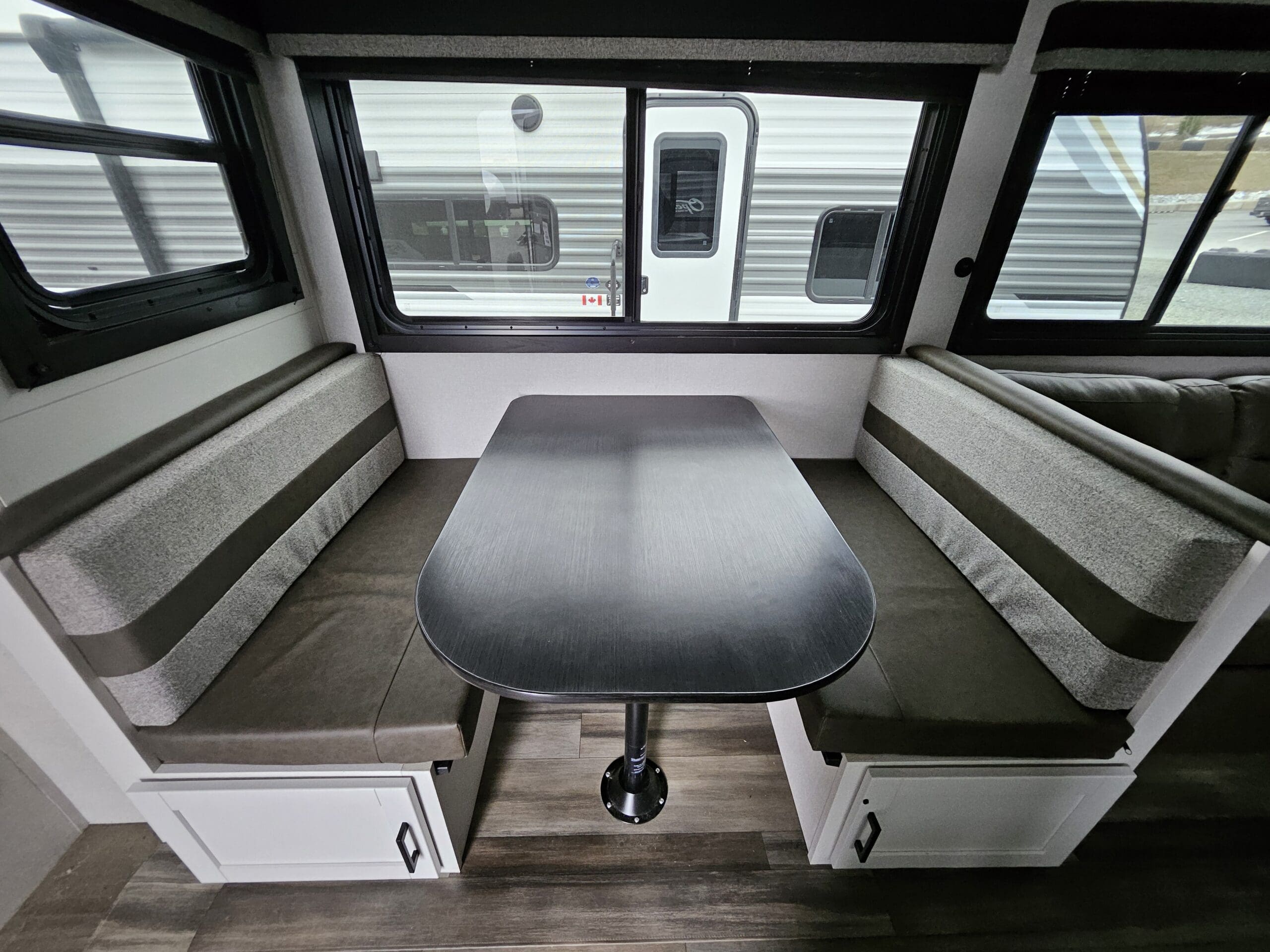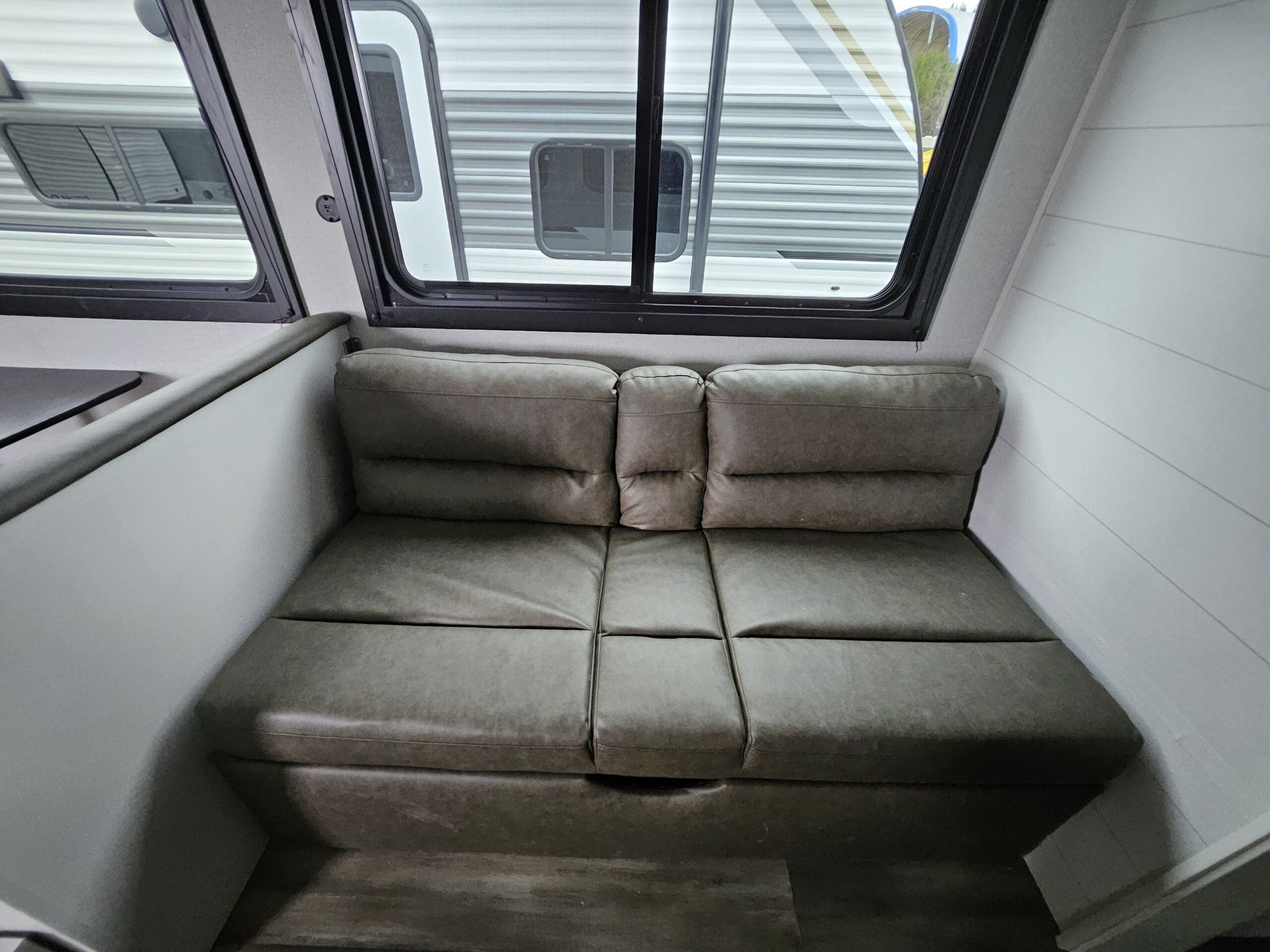 Kitchen & Dining: Includes a large slide-out that houses a booth dinette and a jack-knife sofa. It features an 8 cu. ft. 12V refrigerator and a “hidden pantry” for extra storage.
