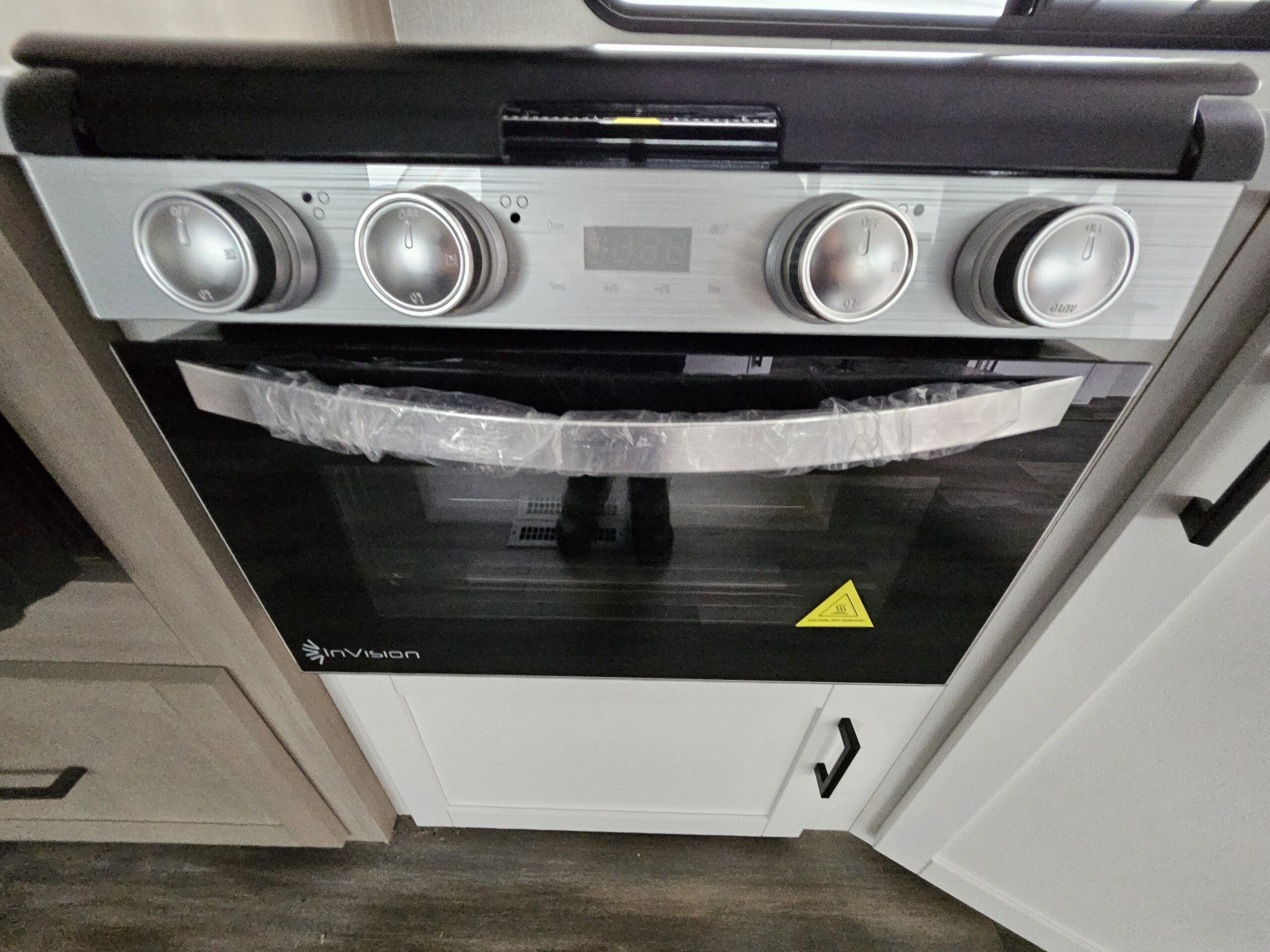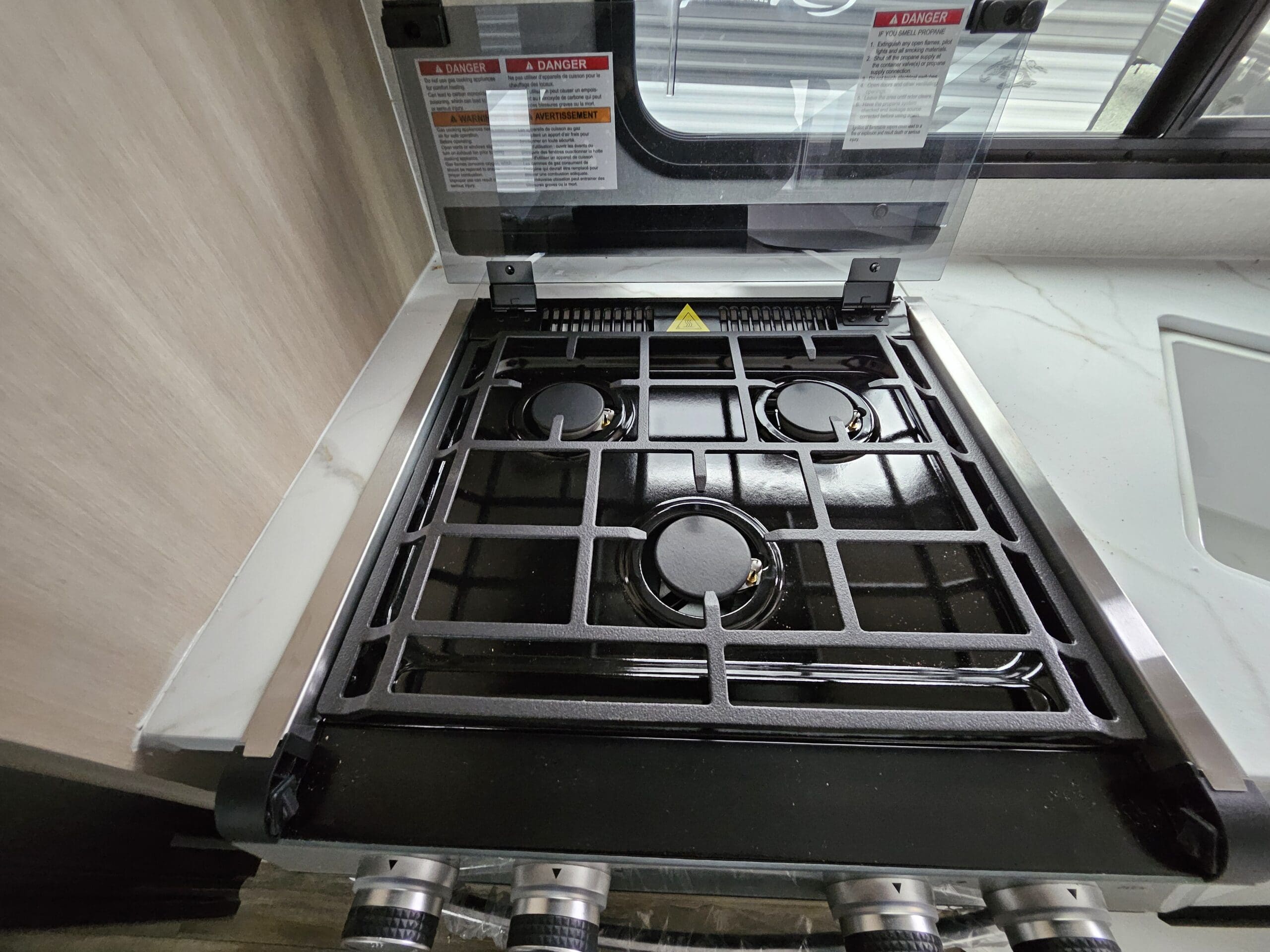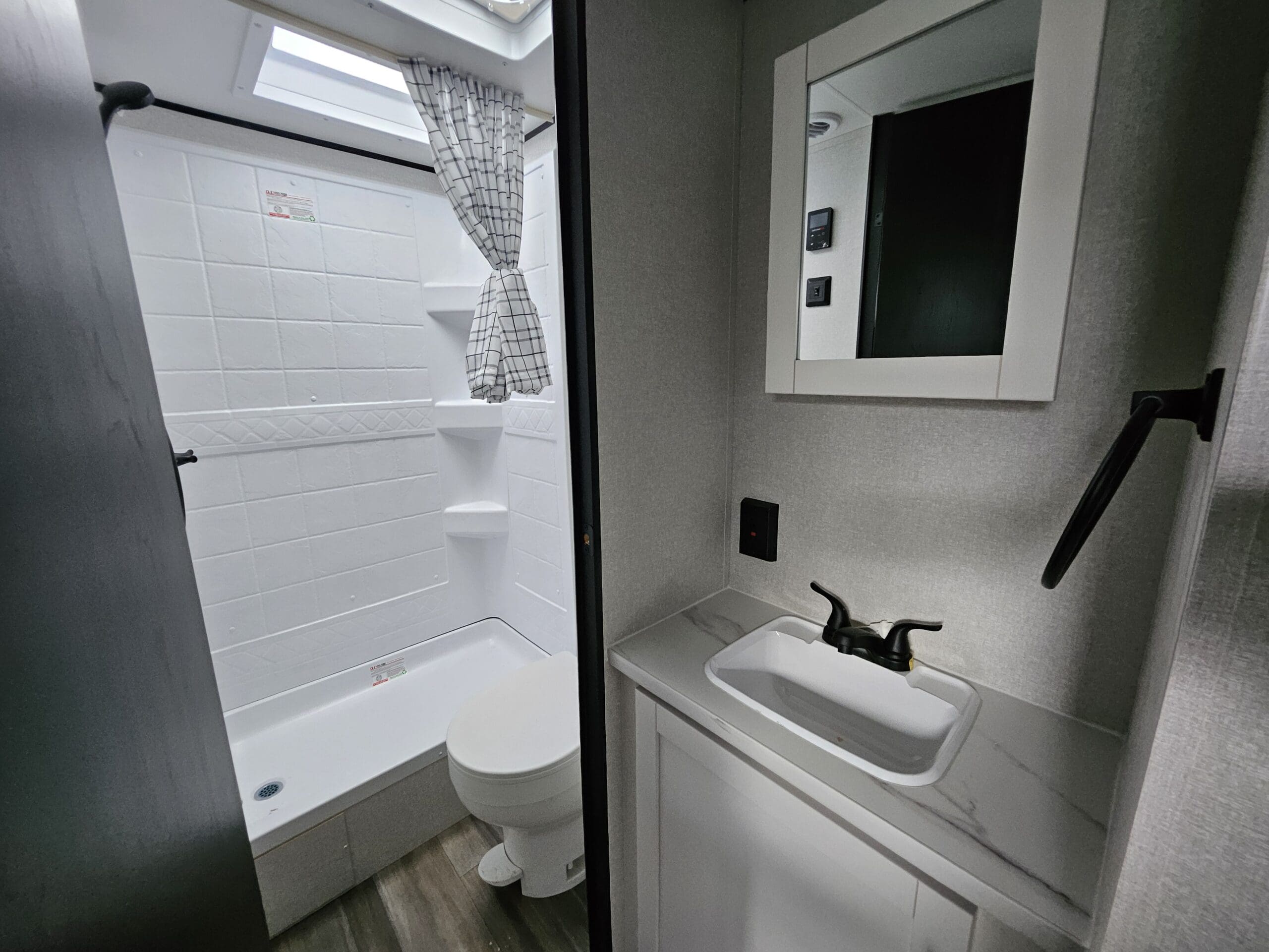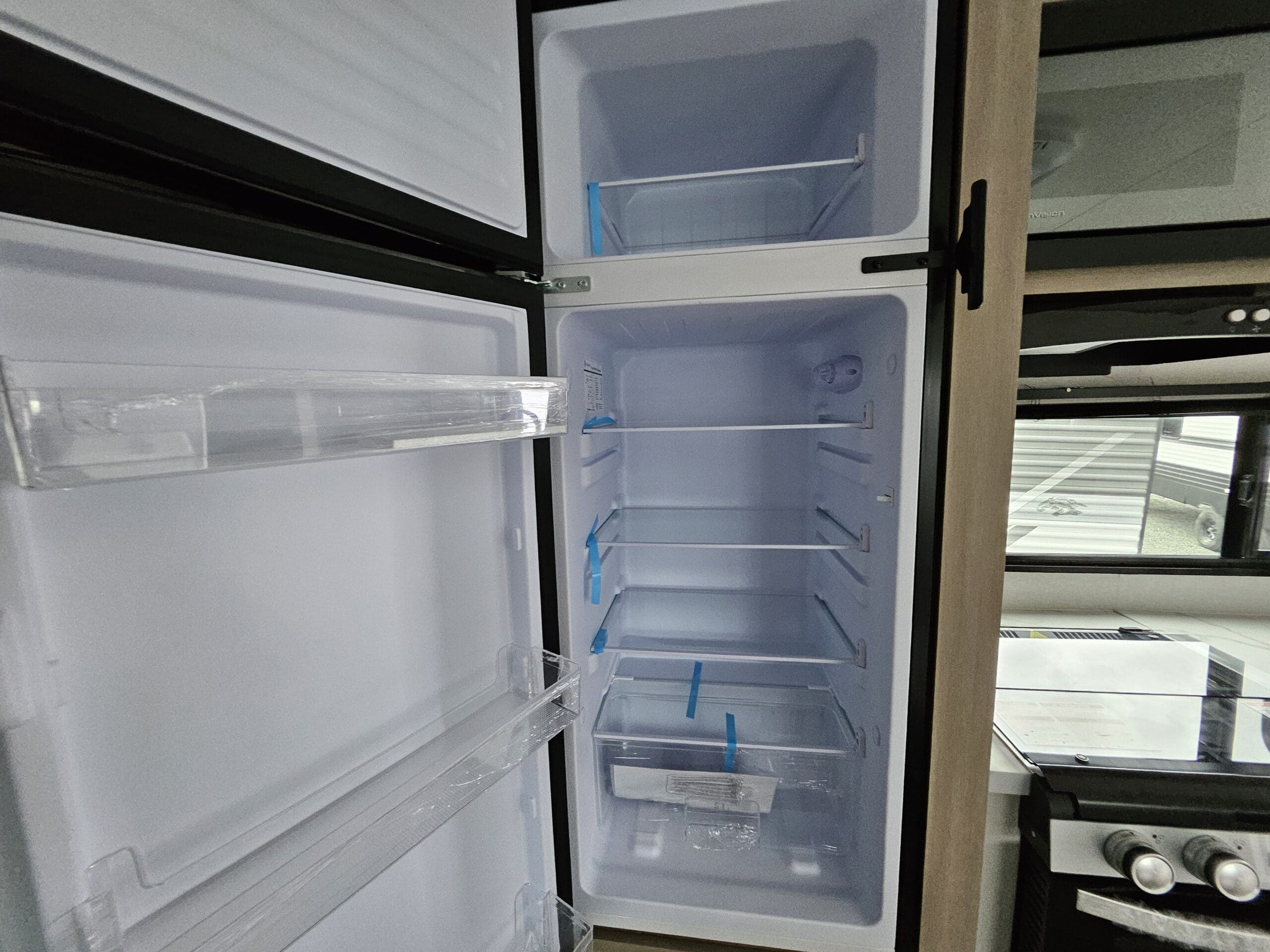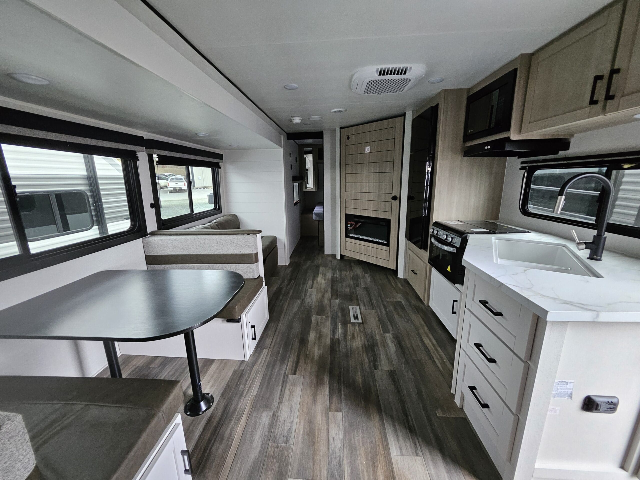 Kitchen & Dining: Includes a large slide-out that houses a booth dinette and a jack-knife sofa. It features an 8 cu. ft. 12V refrigerator and a “hidden pantry” for extra storage.