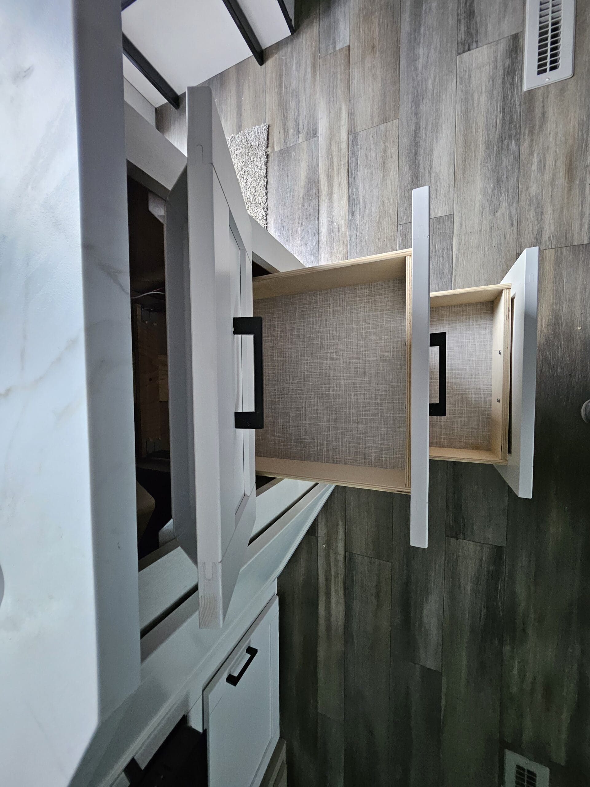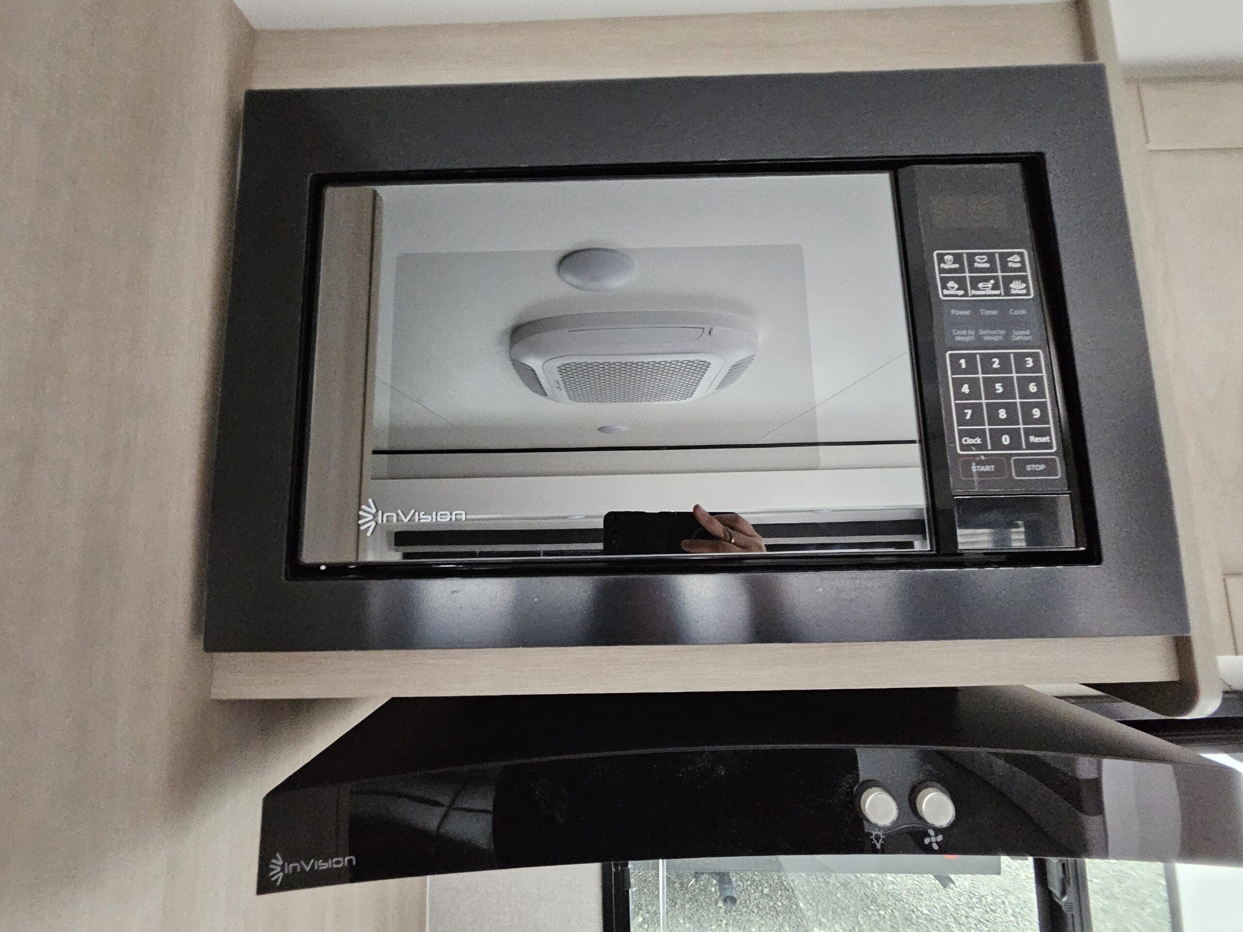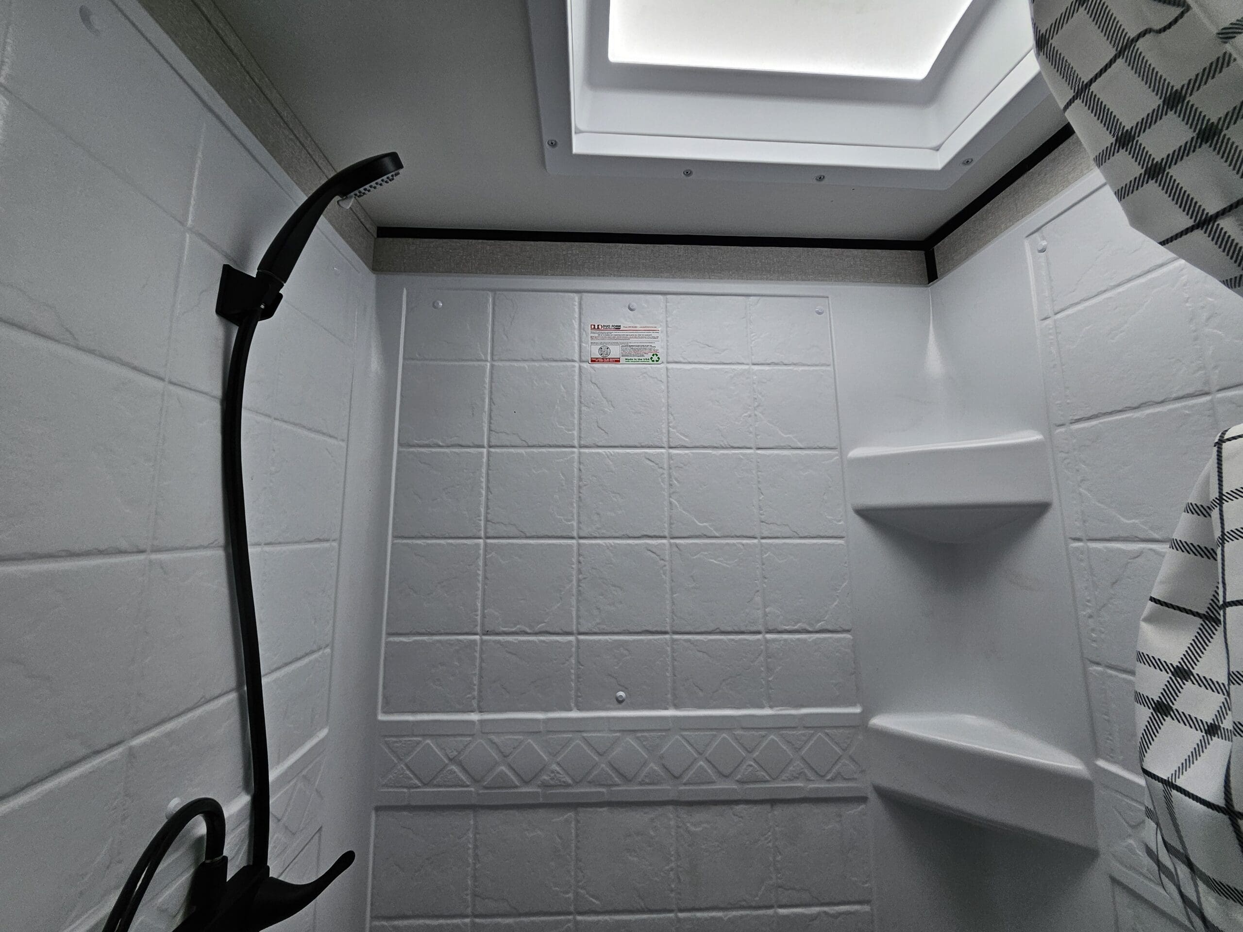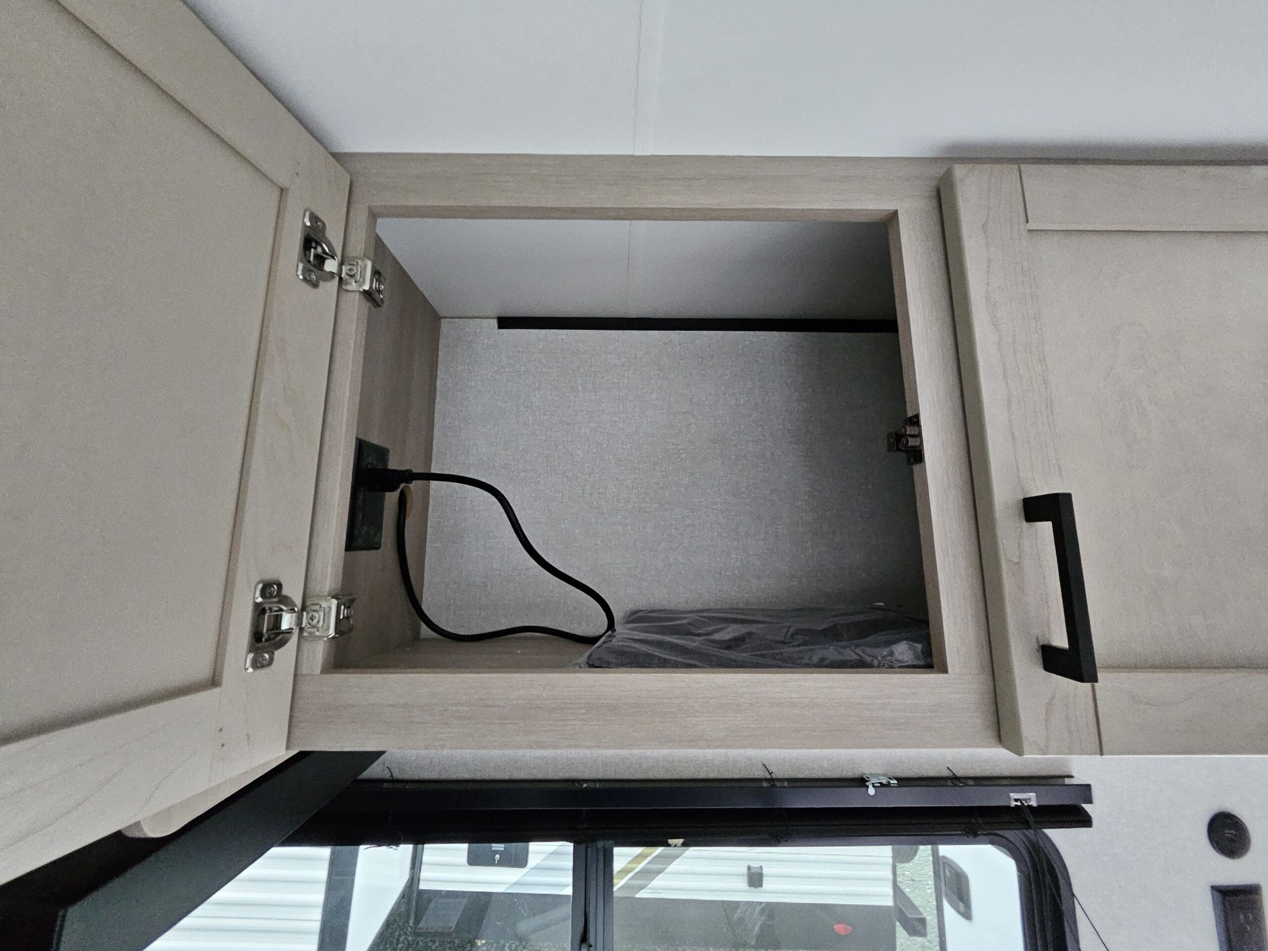 Kitchen & Dining: Includes a large slide-out that houses a booth dinette and a jack-knife sofa. It features an 8 cu. ft. 12V refrigerator and a “hidden pantry” for extra storage.