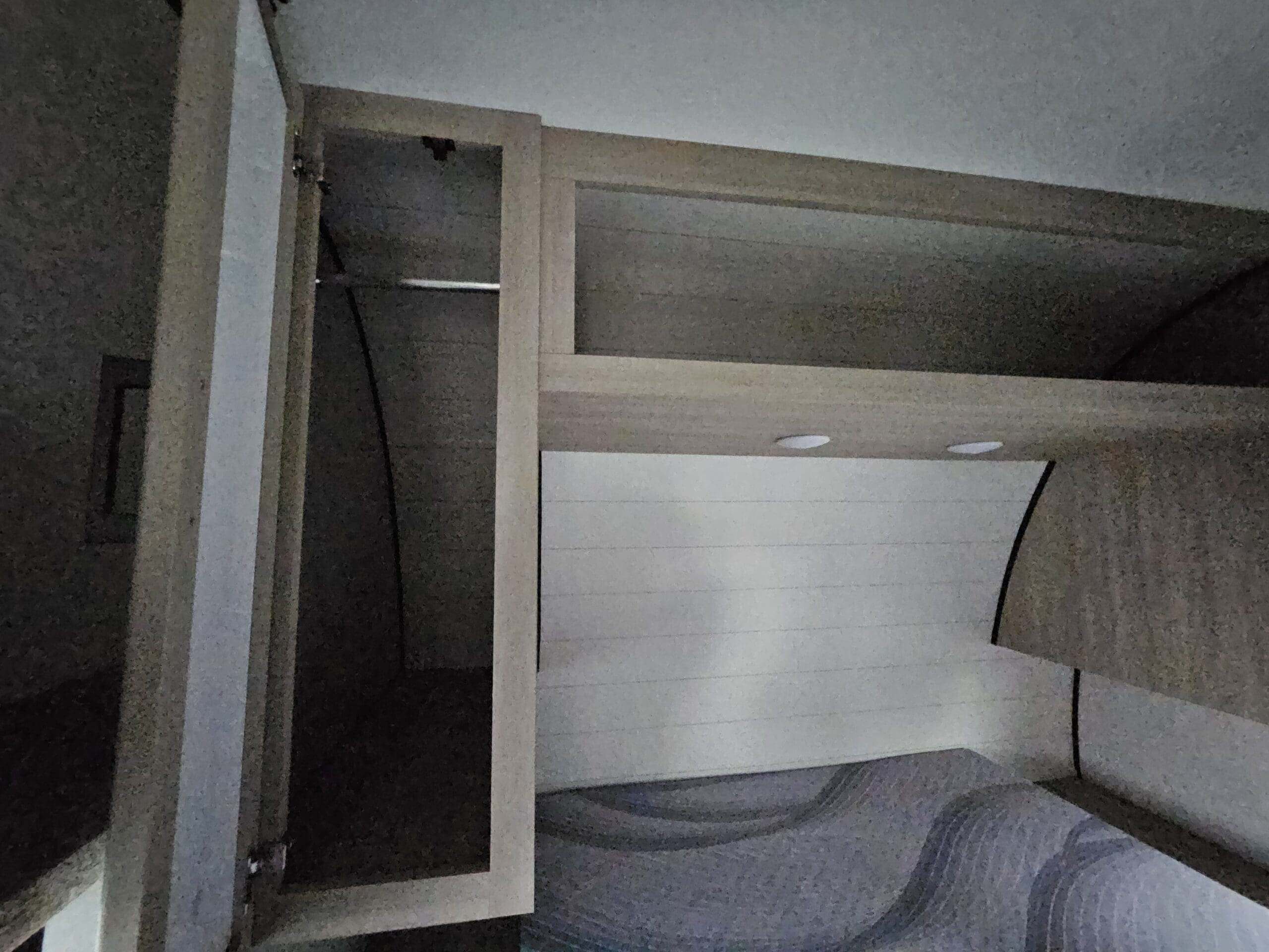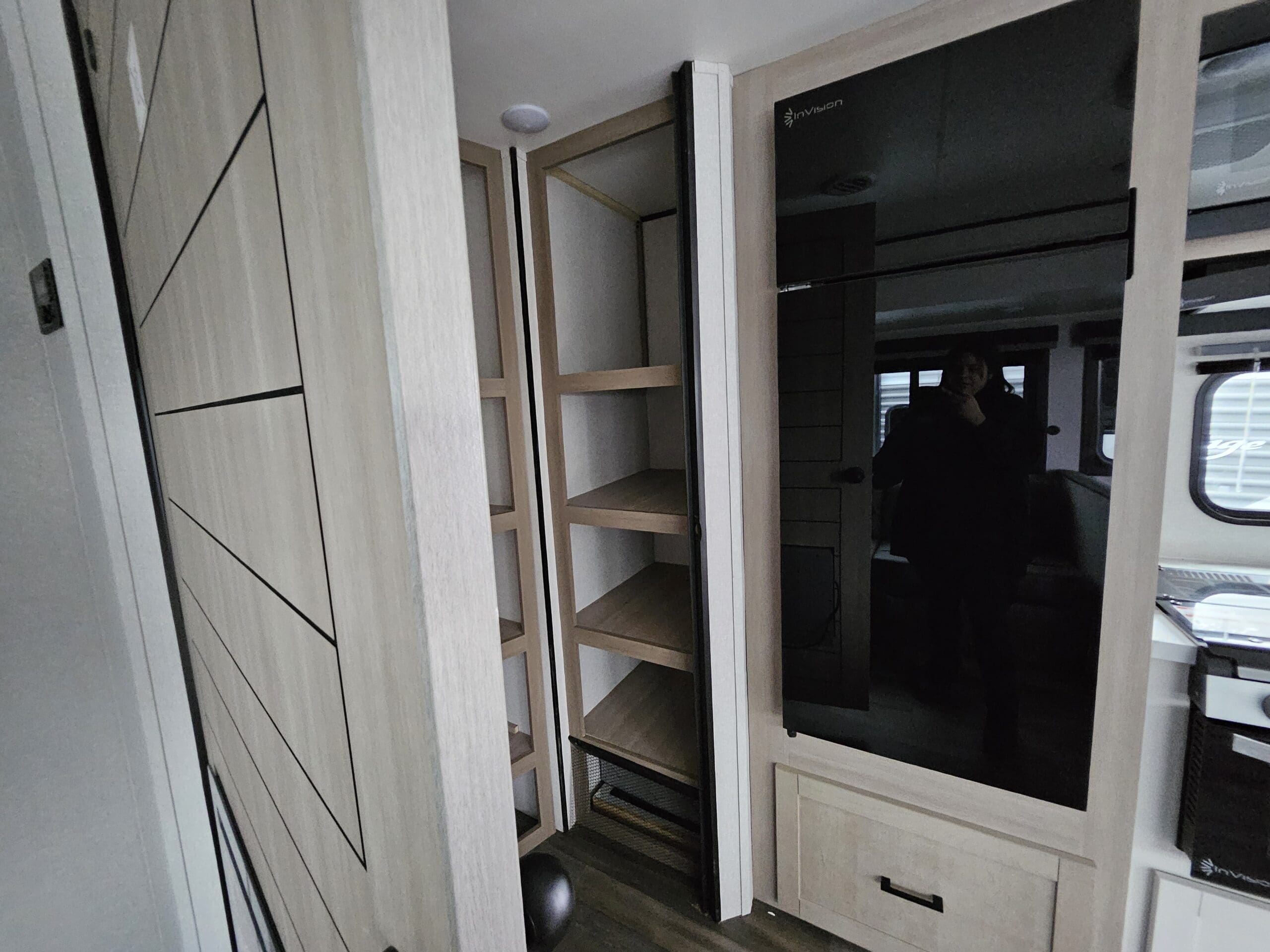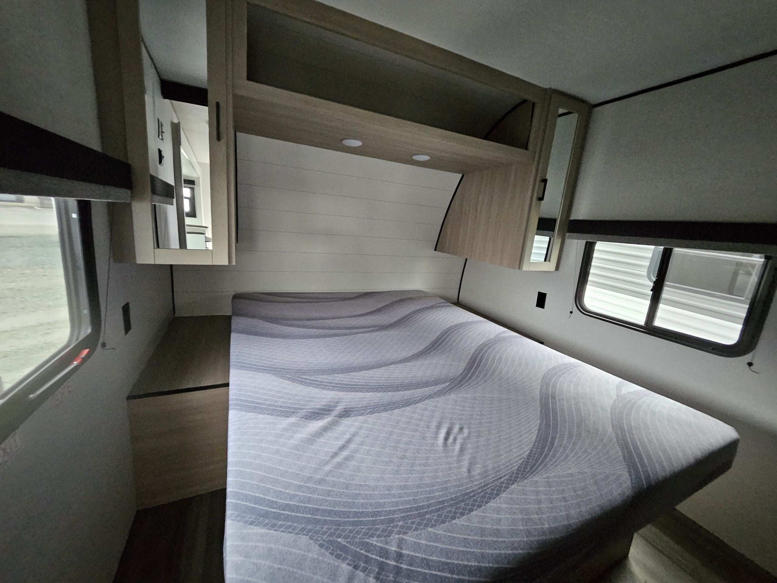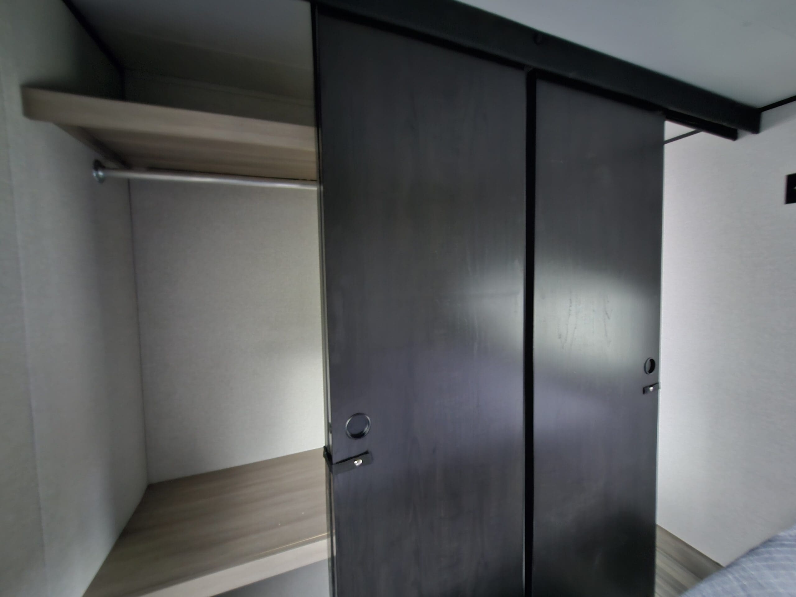 Front Private Bedroom: Offers a standard RV Queen bed with dual wardrobes and a dedicated closet, providing separation from the main living area.