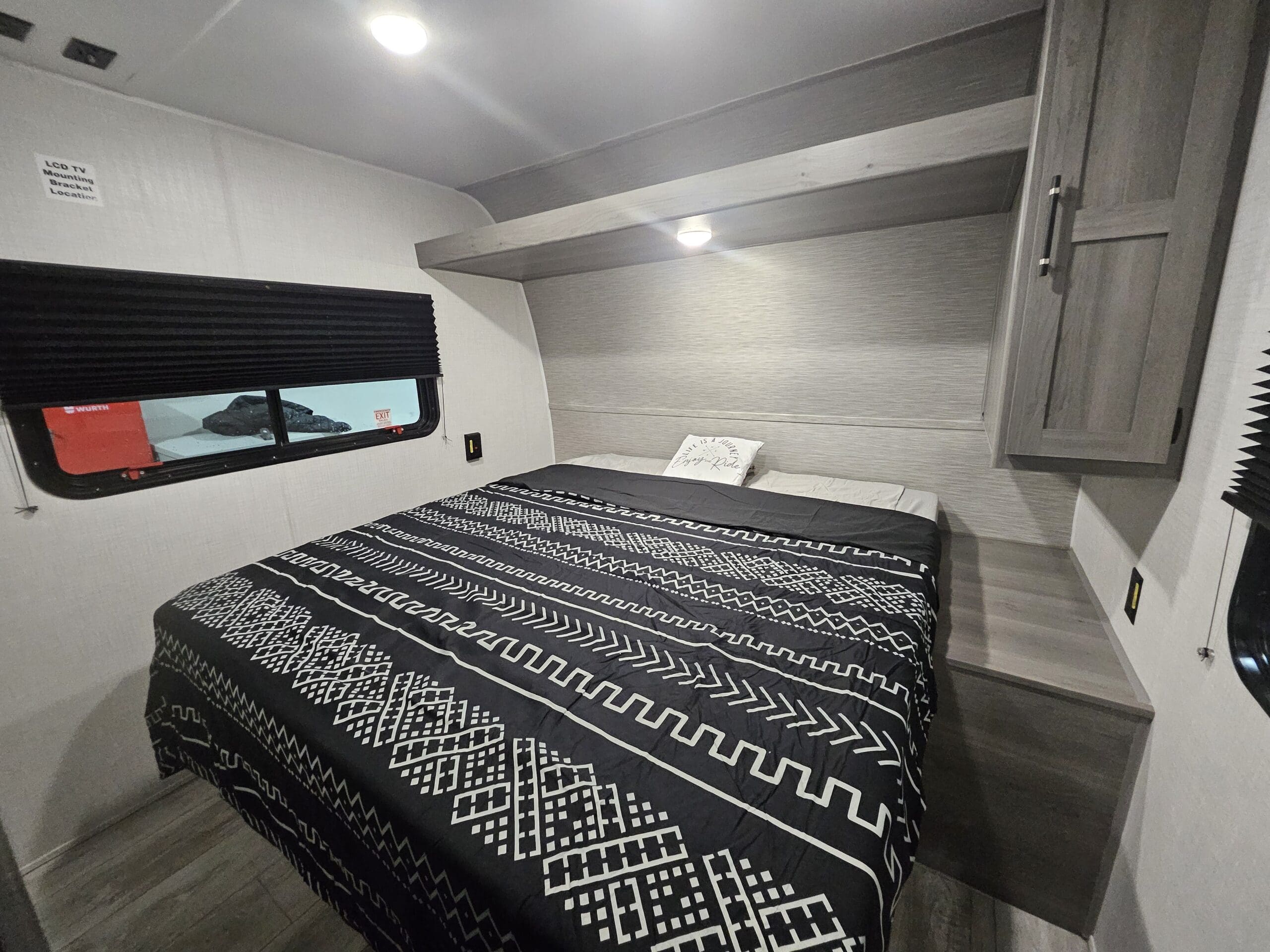• Private Master Bedroom: A front bedroom with a queen bed, dual closets, and nightstands, separated by a real door rather than just a curtain.