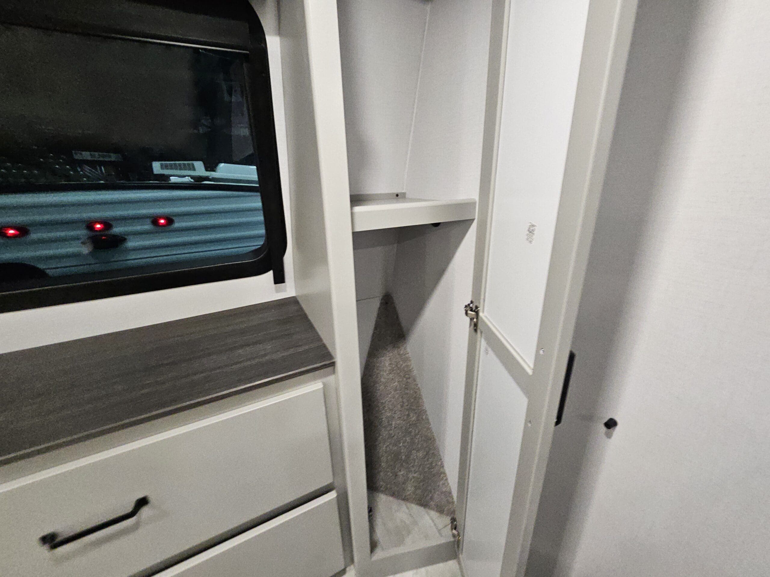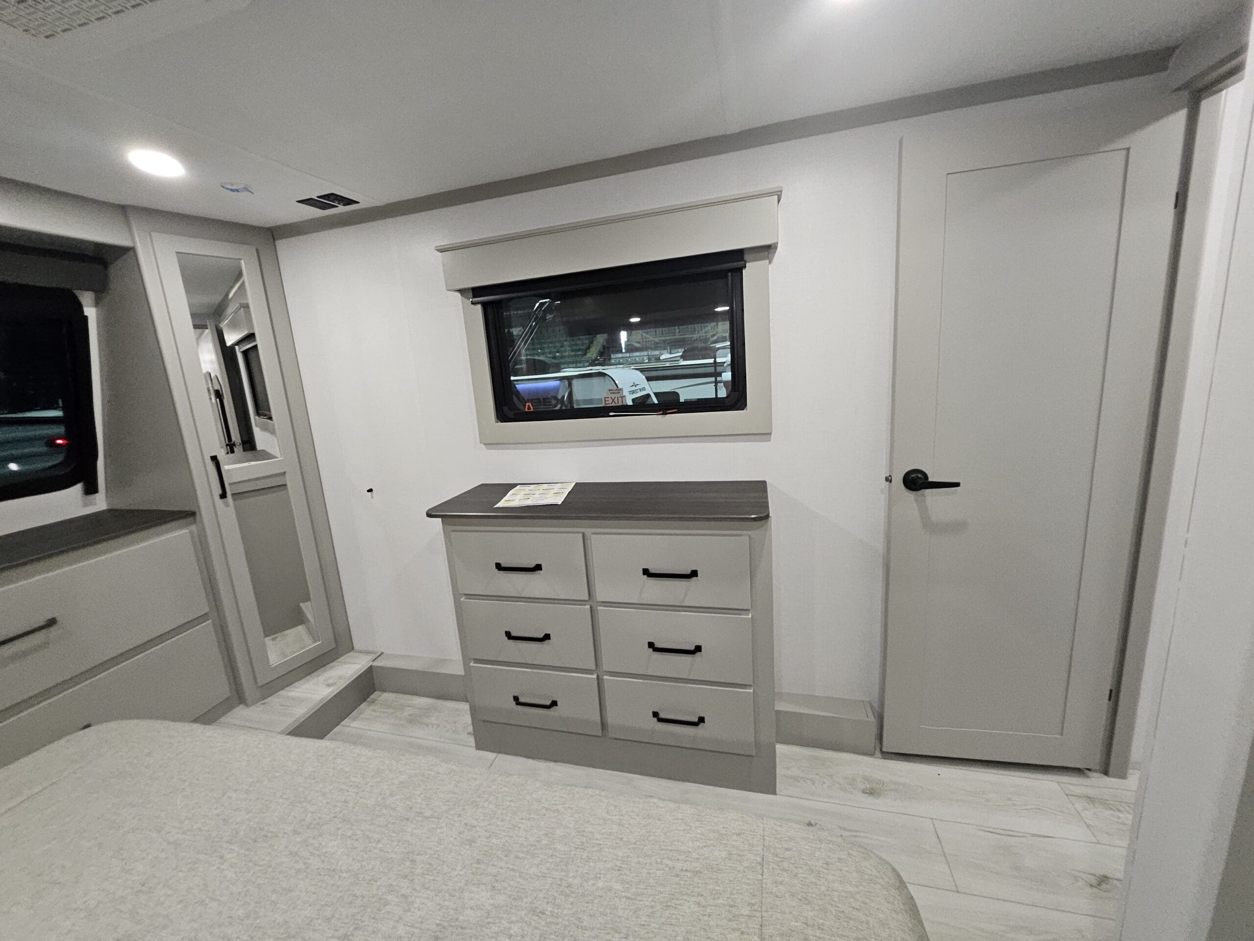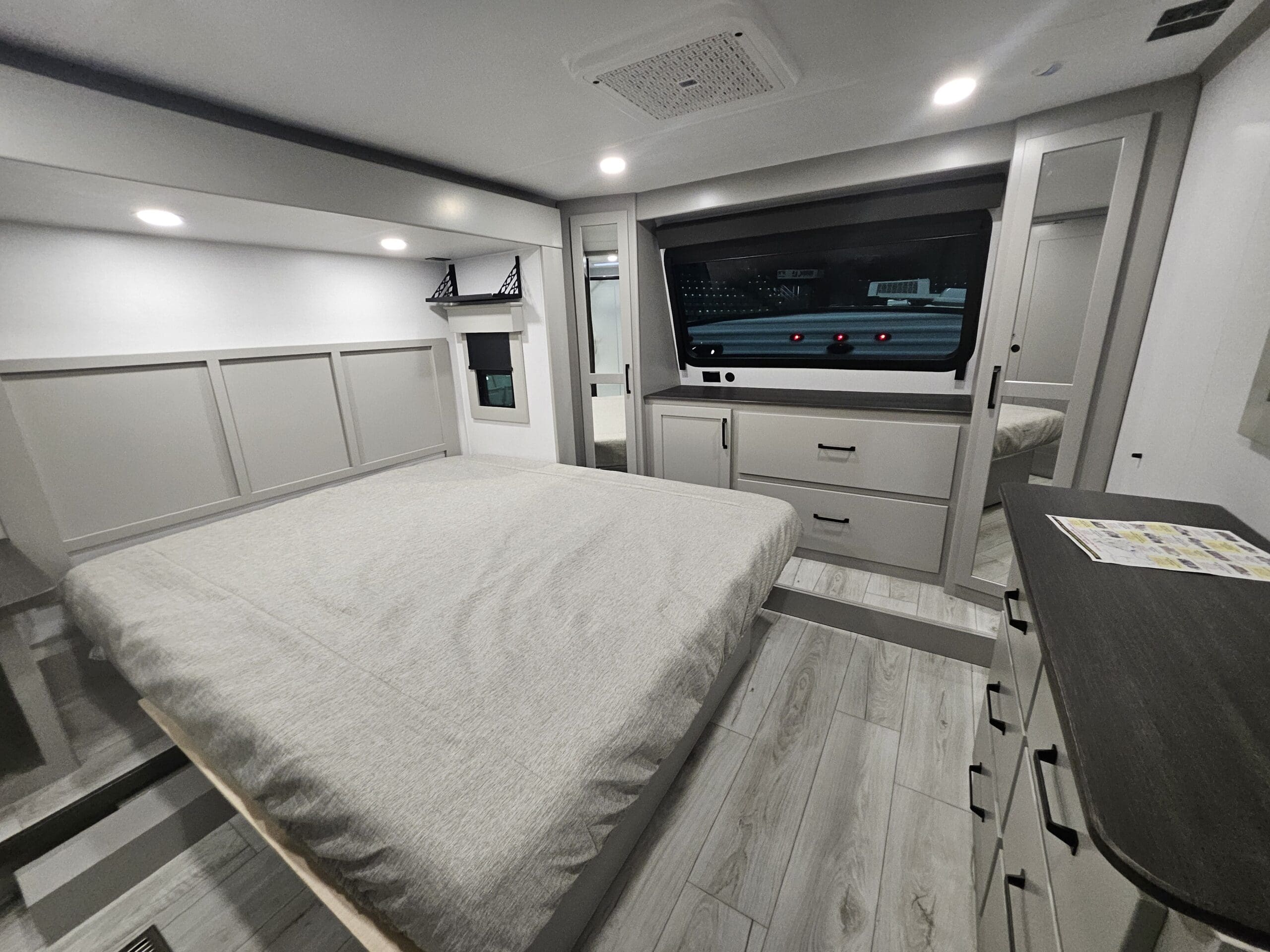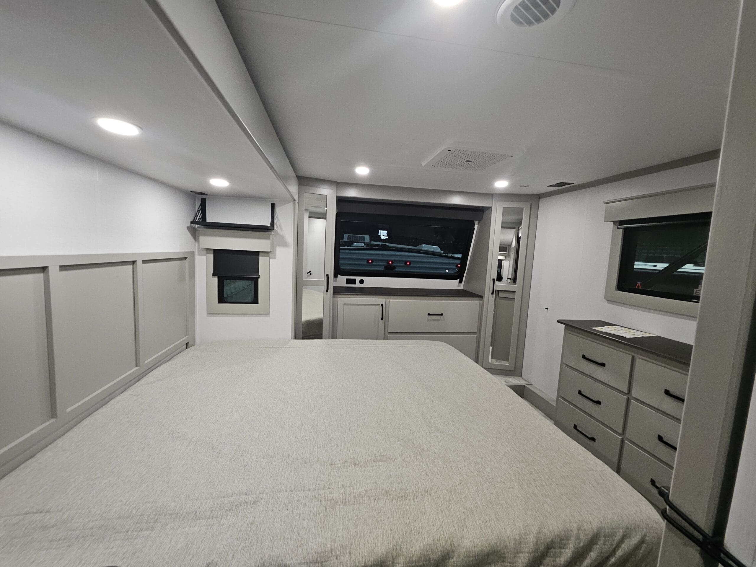 Private Master Suite: The front of the unit houses a private bedroom with a standard King bed. One of the most unique features is the patent-pending front windshield, which provides a view from the front cap. It also includes a dedicated closet prepped for a washer/dryer.