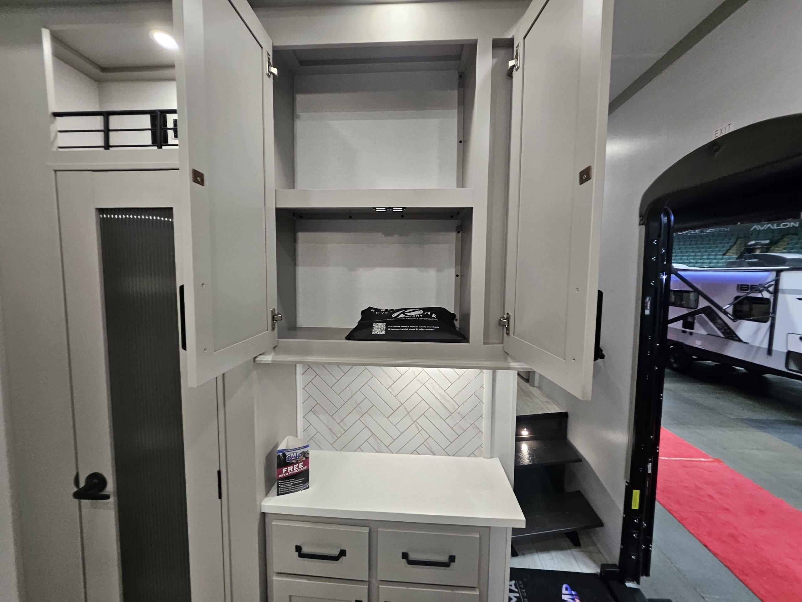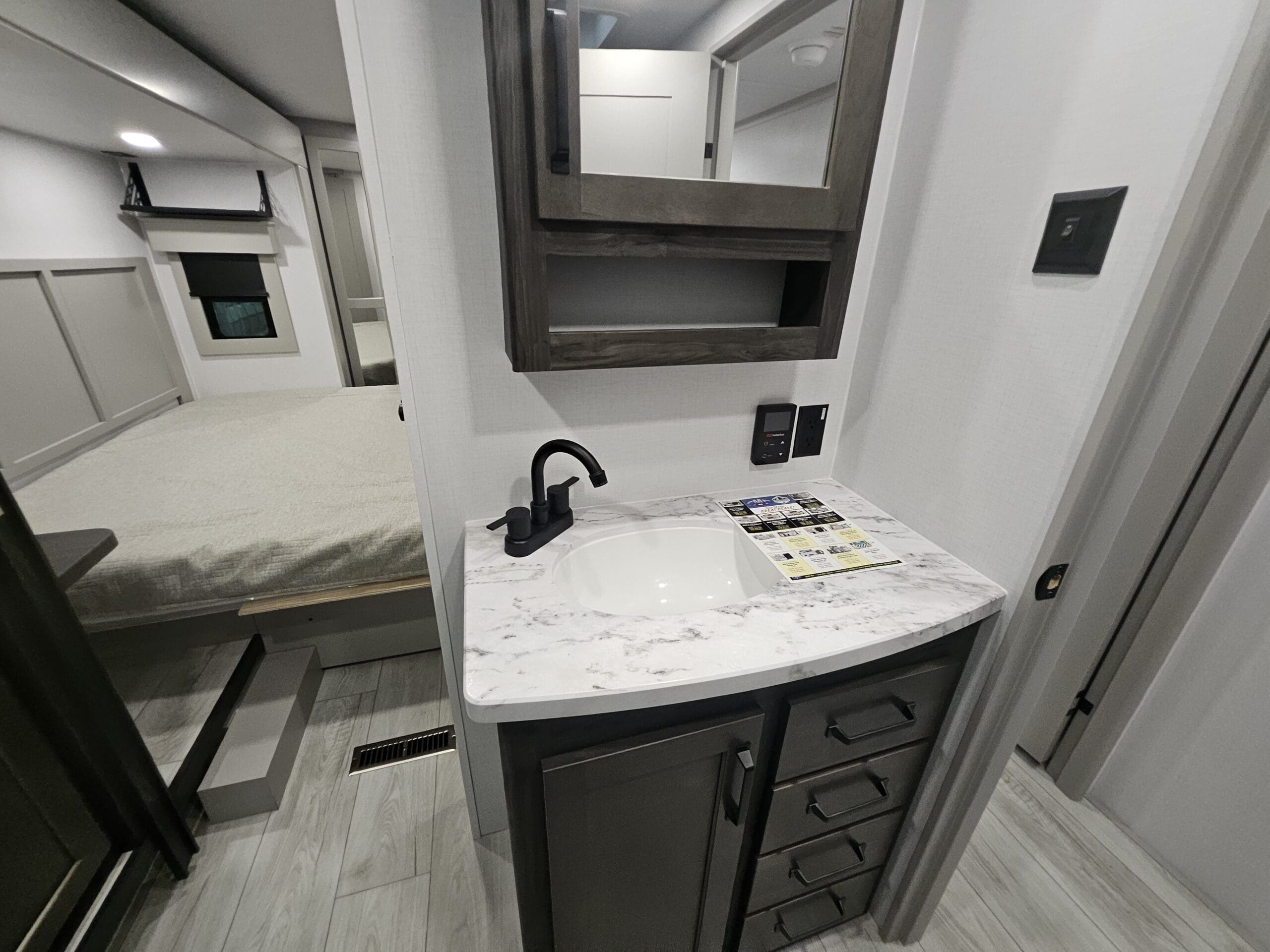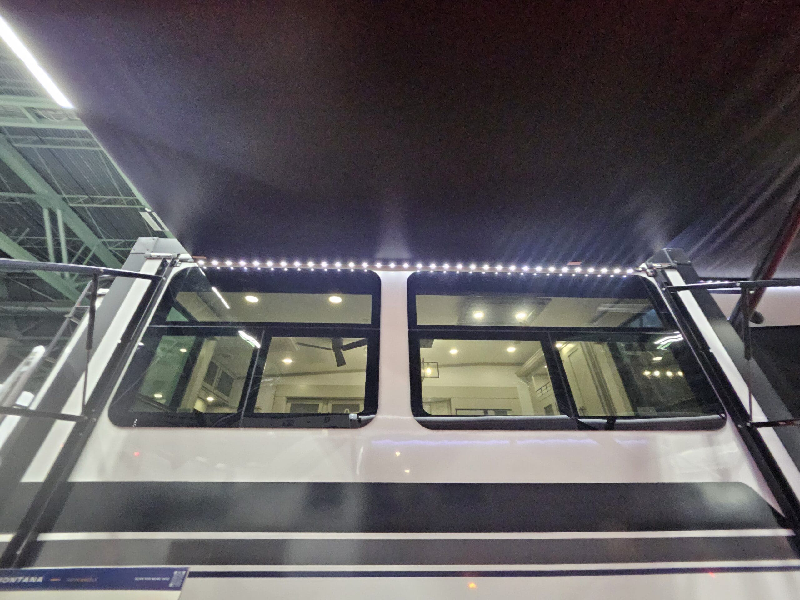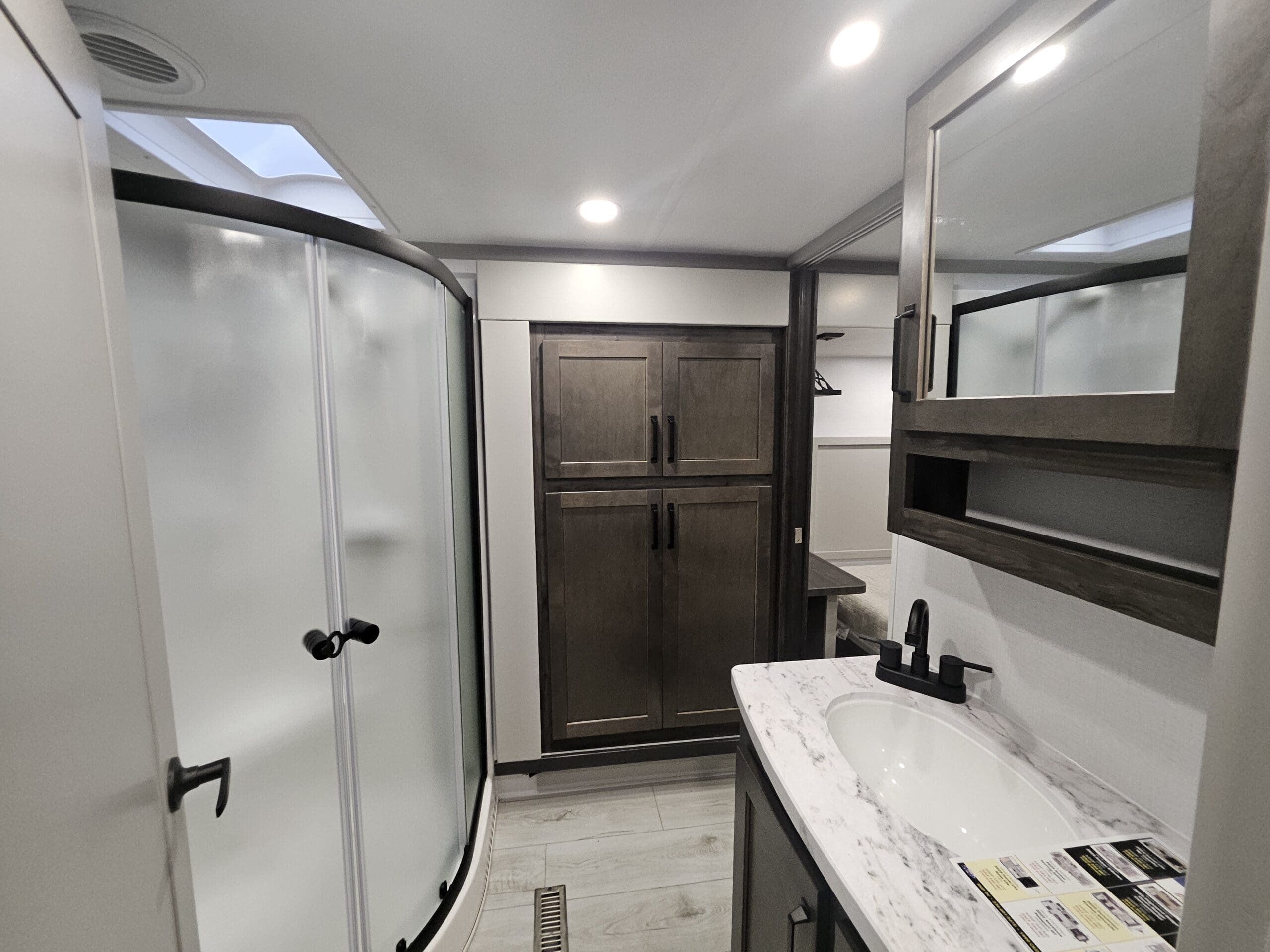 Private Master Suite: The front of the unit houses a private bedroom with a standard King bed. One of the most unique features is the patent-pending front windshield, which provides a view from the front cap. It also includes a dedicated closet prepped for a washer/dryer.