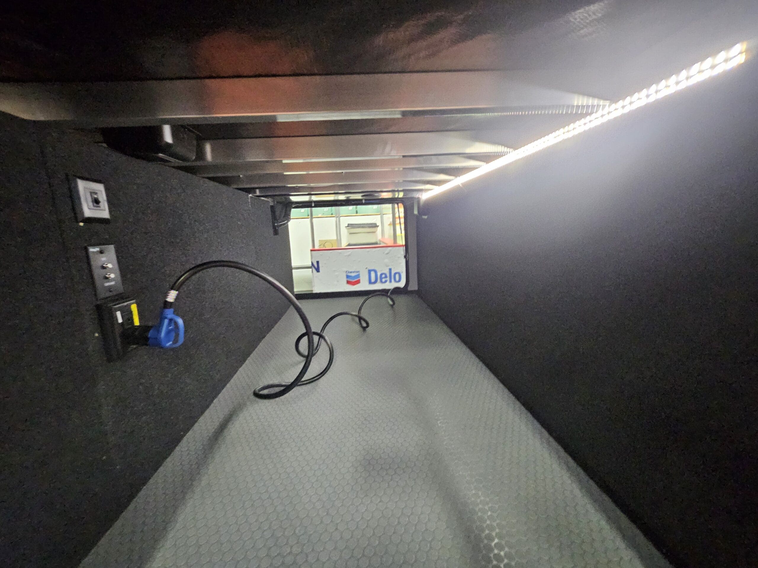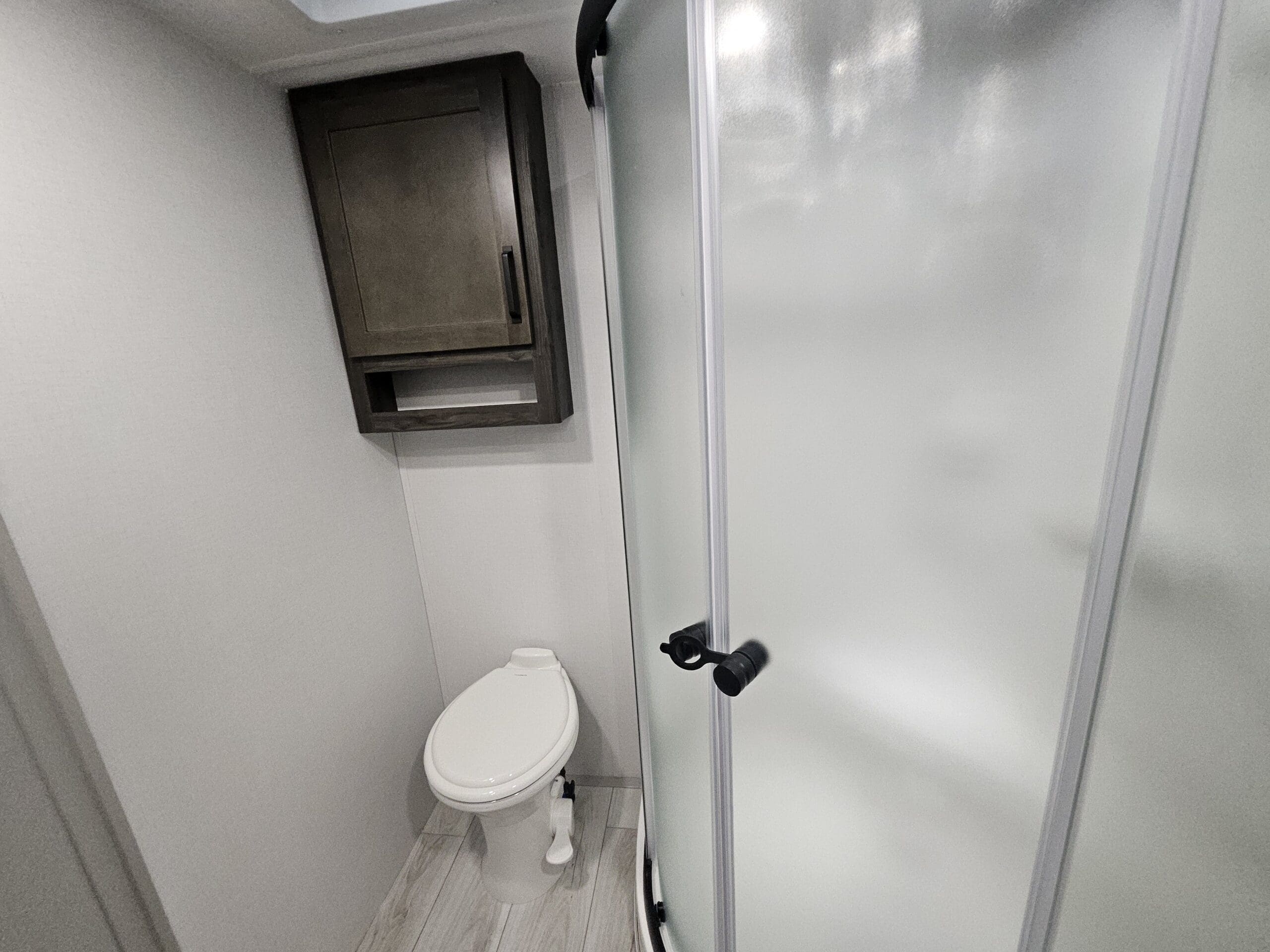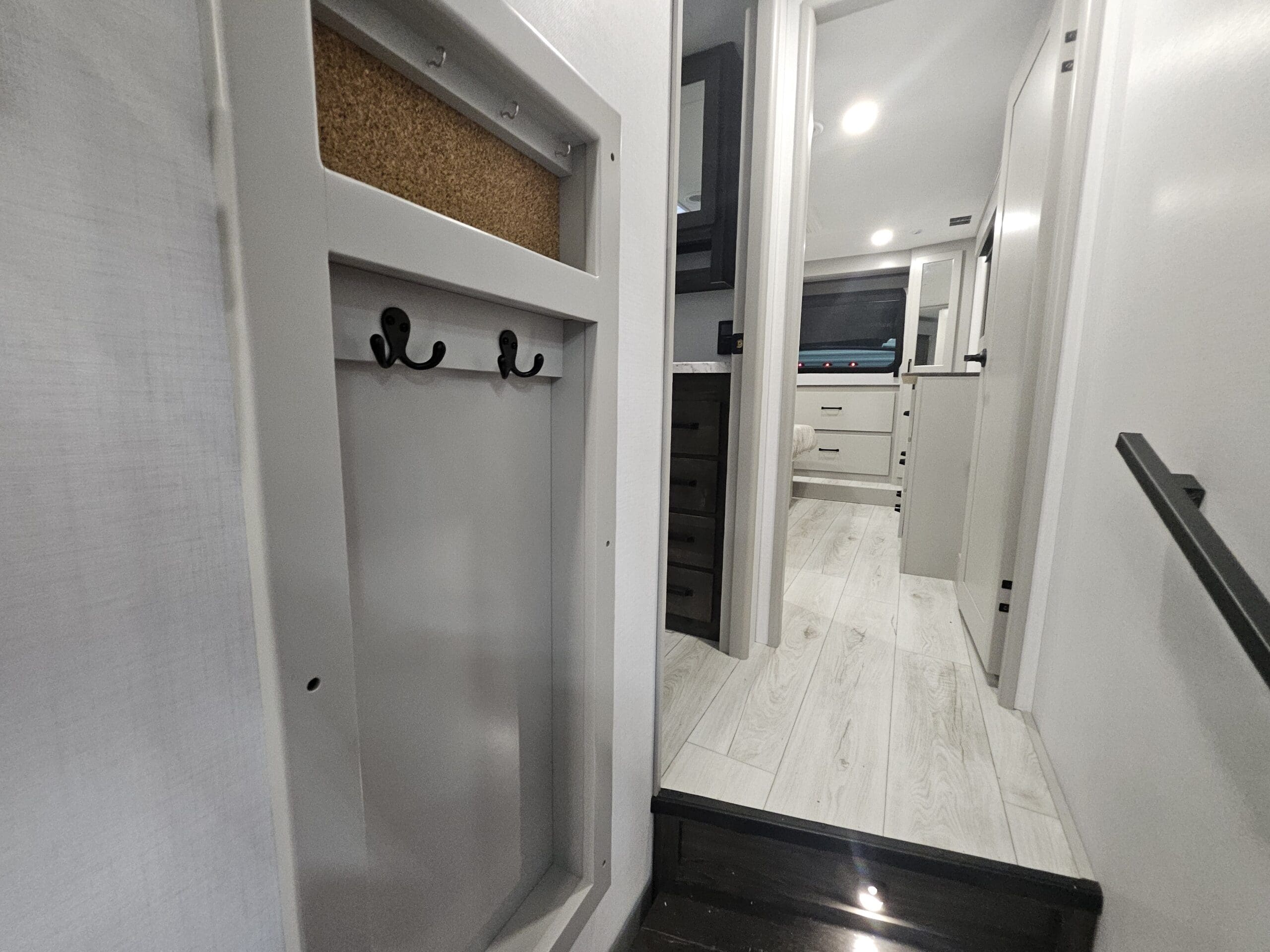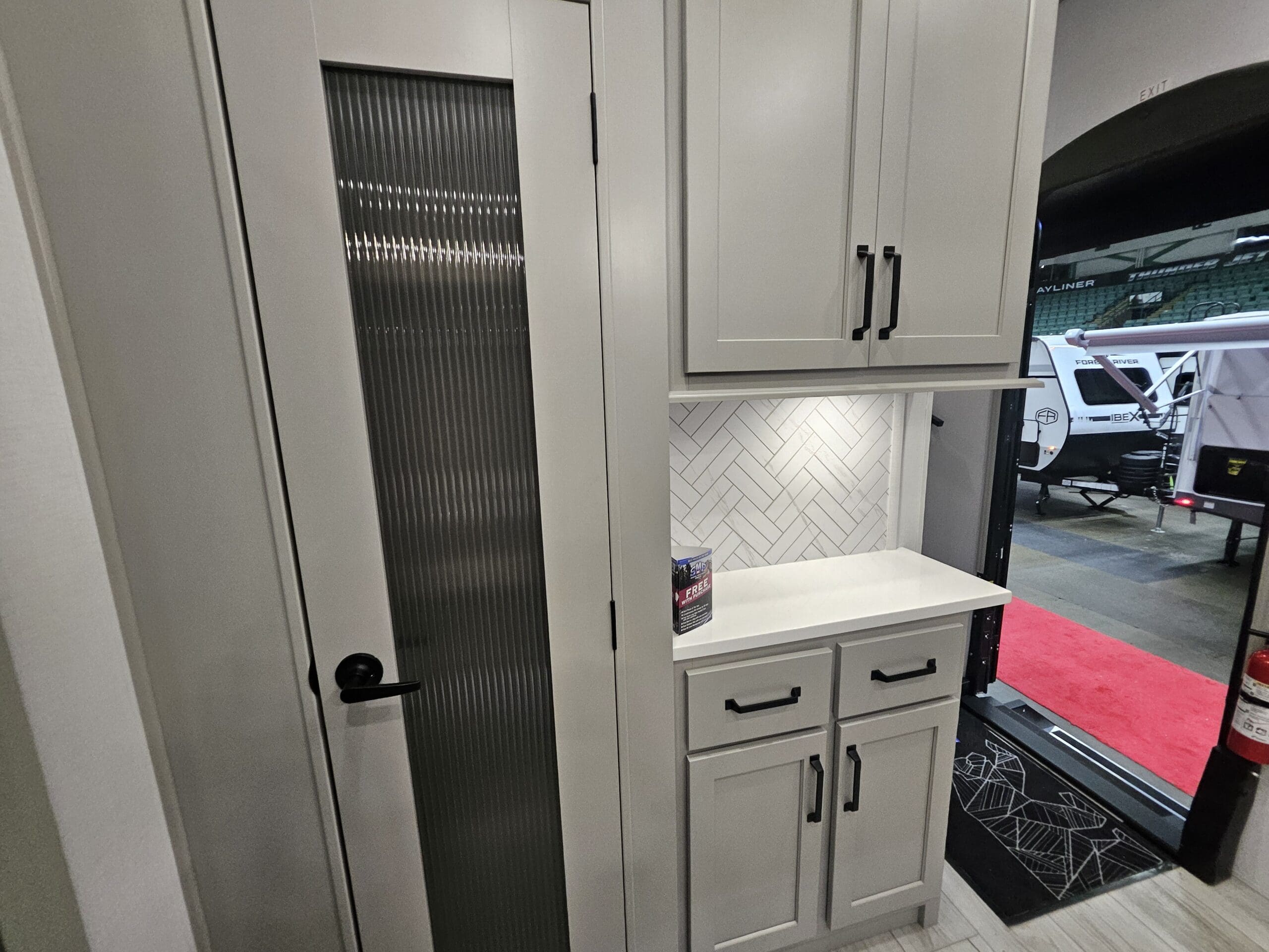 Private Master Suite: The front of the unit houses a private bedroom with a standard King bed. One of the most unique features is the patent-pending front windshield, which provides a view from the front cap. It also includes a dedicated closet prepped for a washer/dryer.