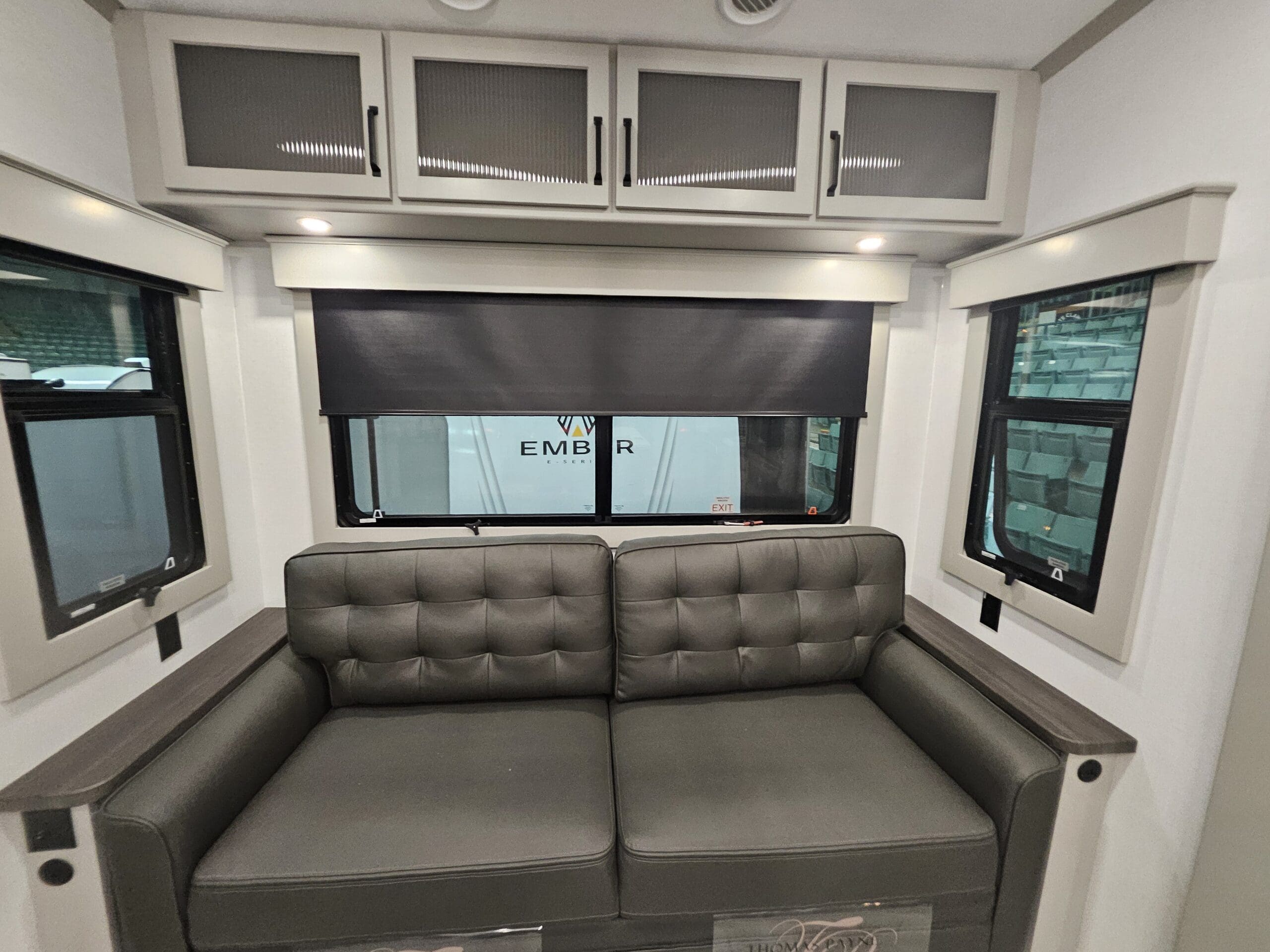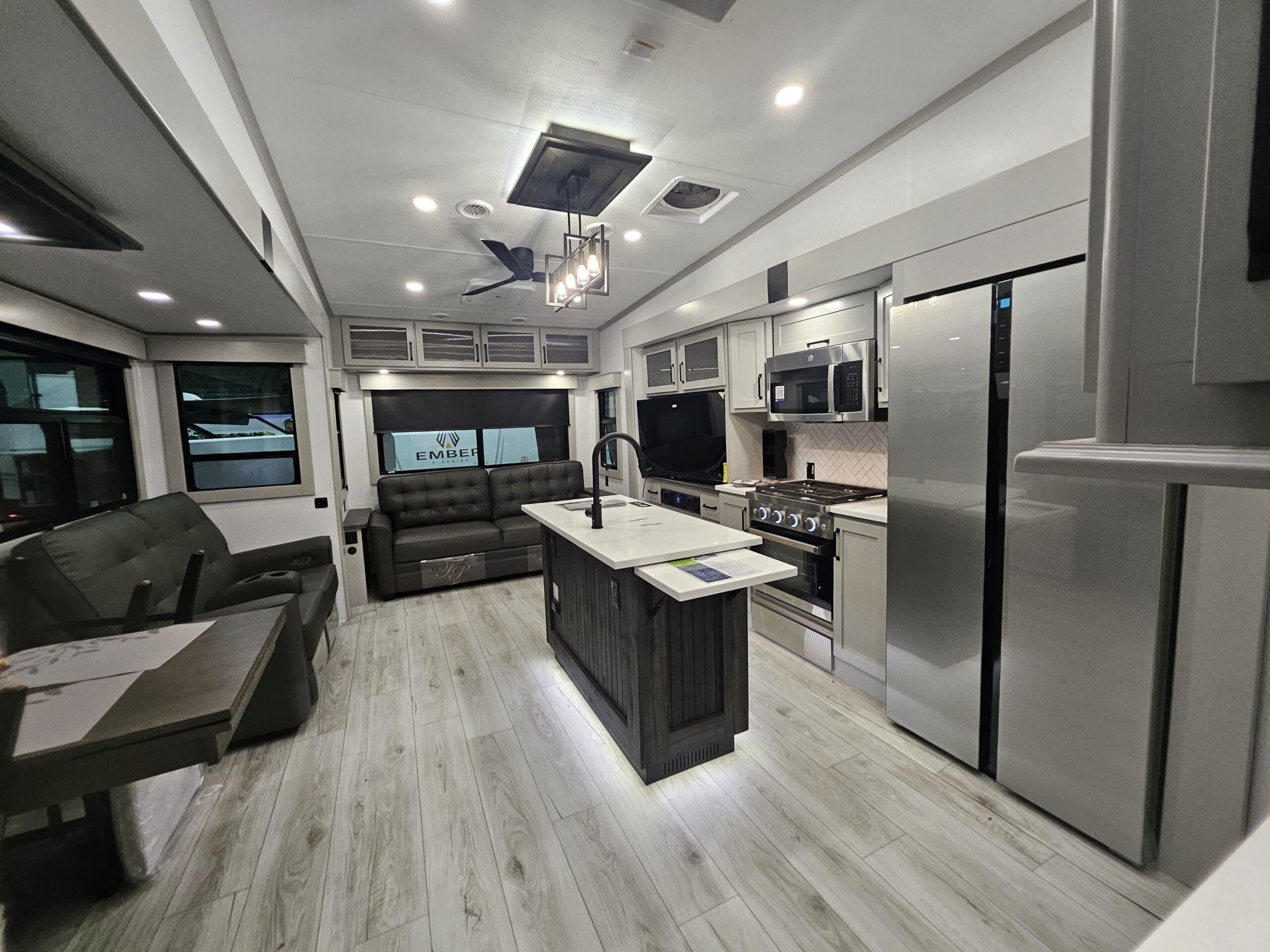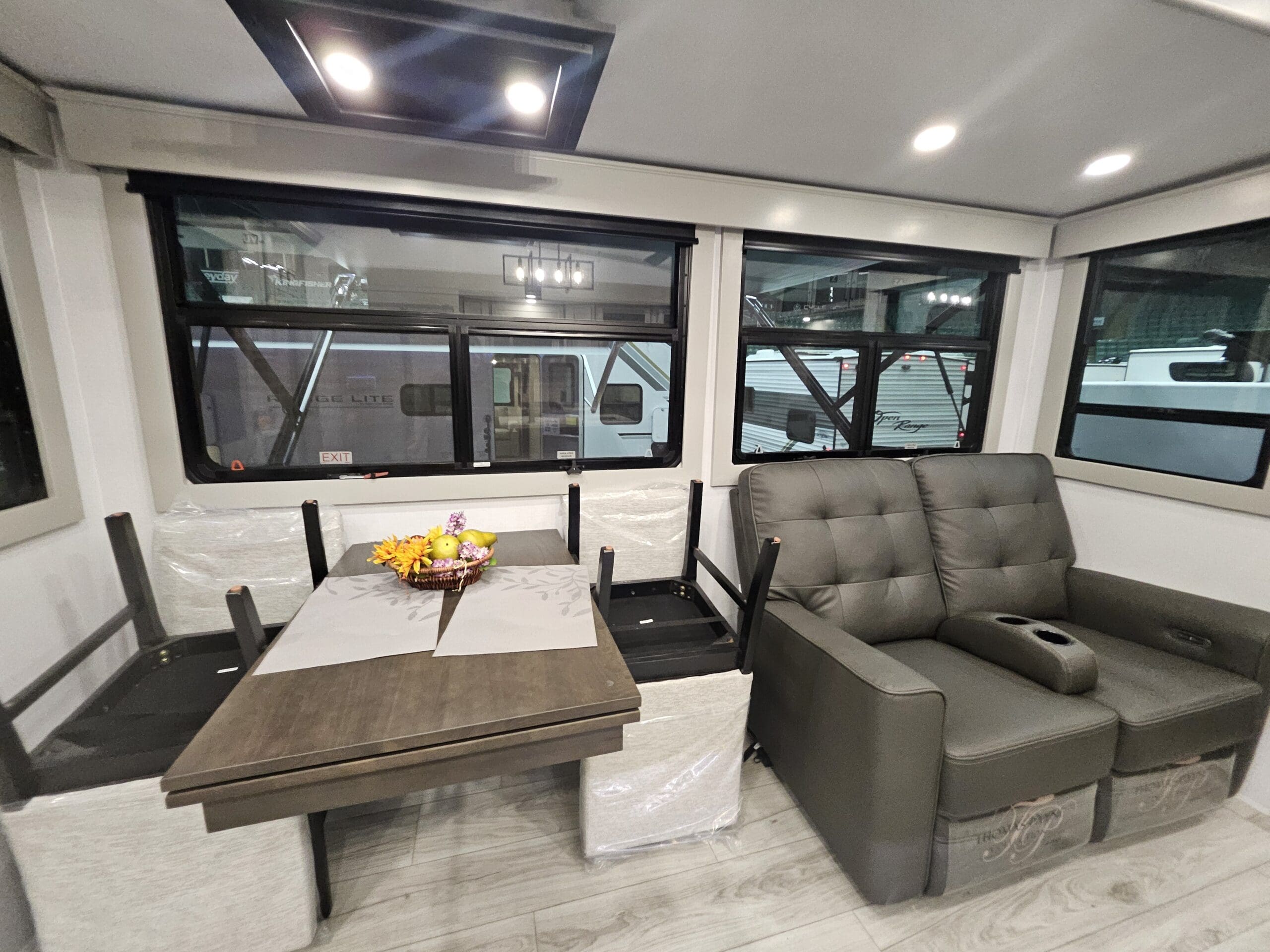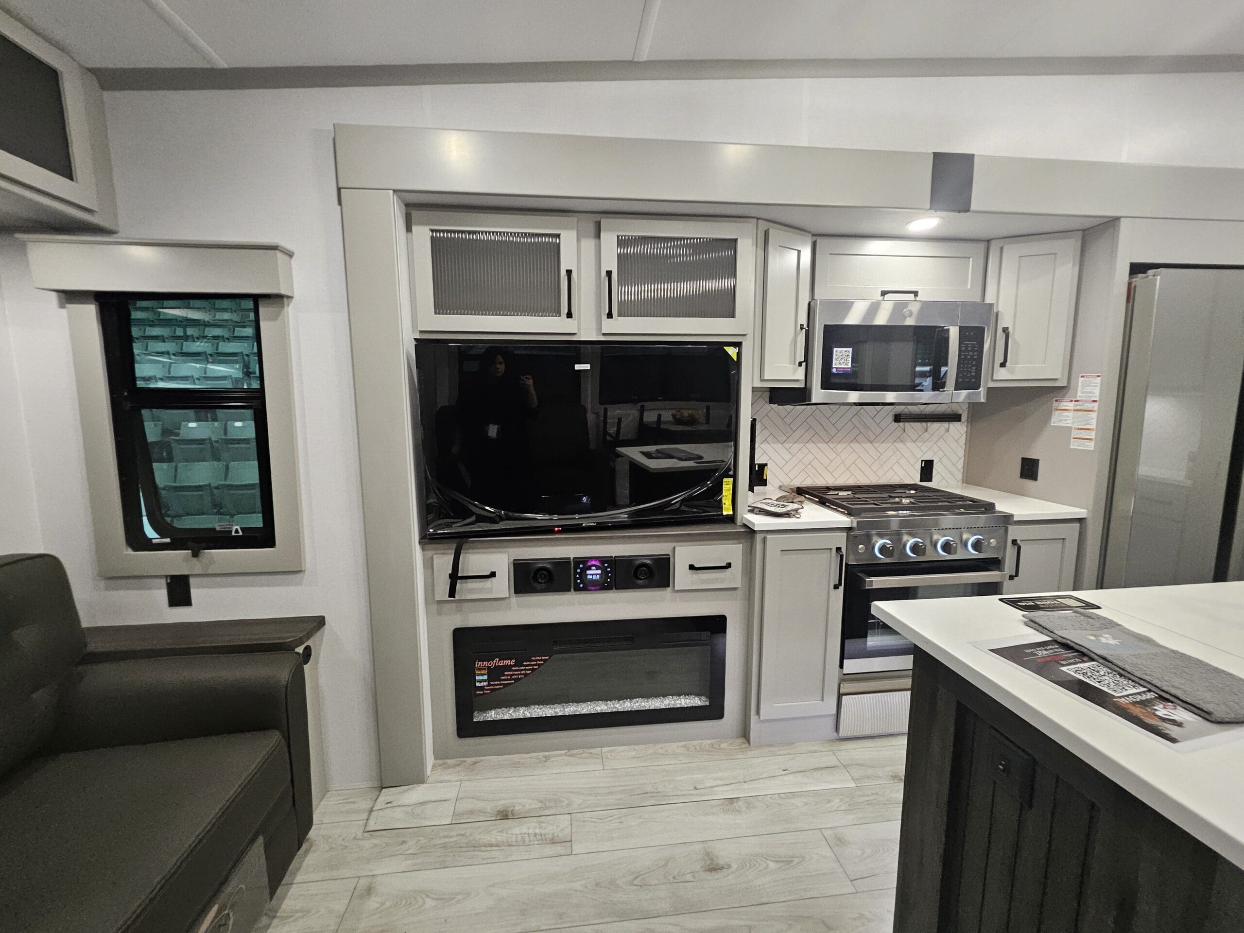 Rear Living Lounge: The “RL” stands for Rear Living. It features dual opposing slides that open up the floor space. You’ll typically find a Thomas Payne theater seating setup directly across from the entertainment center, which includes a 50″ LED Smart TV and a 5,000 BTU electric fireplace.