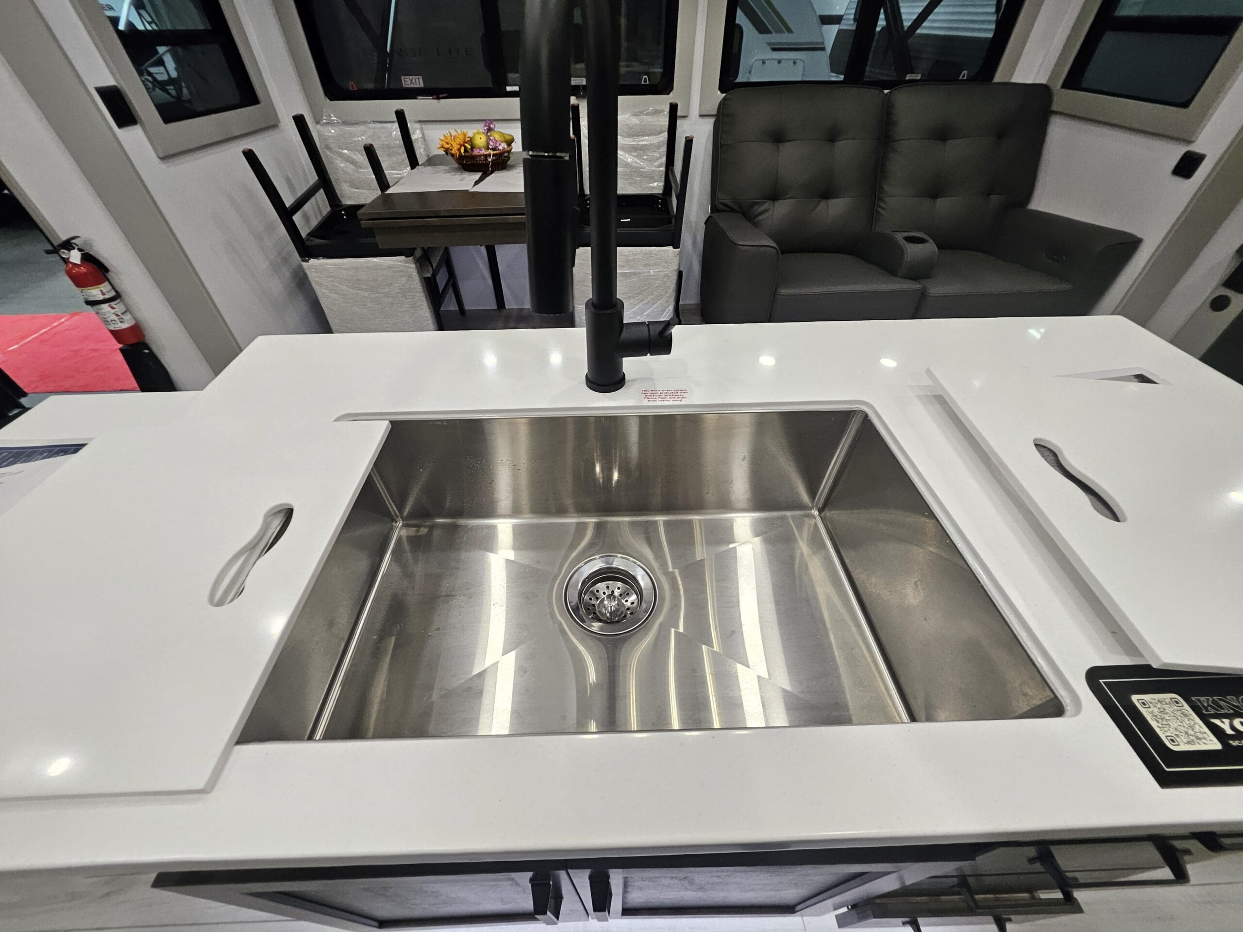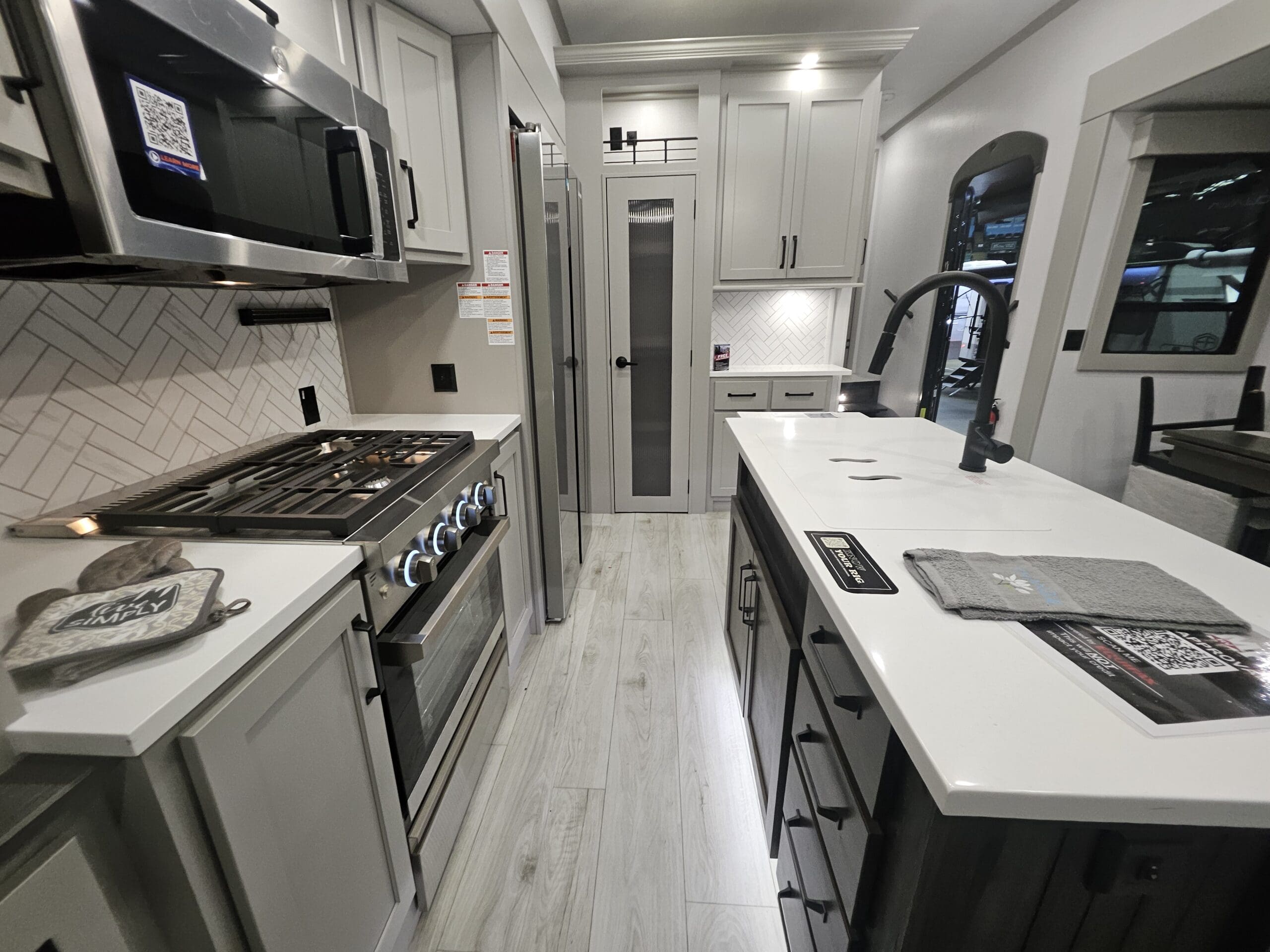 Gourmet Kitchen: A centerpiece island provides extra prep space and a deep stainless steel sink. It comes equipped with an 16 Cu. Ft. 12V refrigerator, a 3-burner cooktop, and an over-the-range microwave.