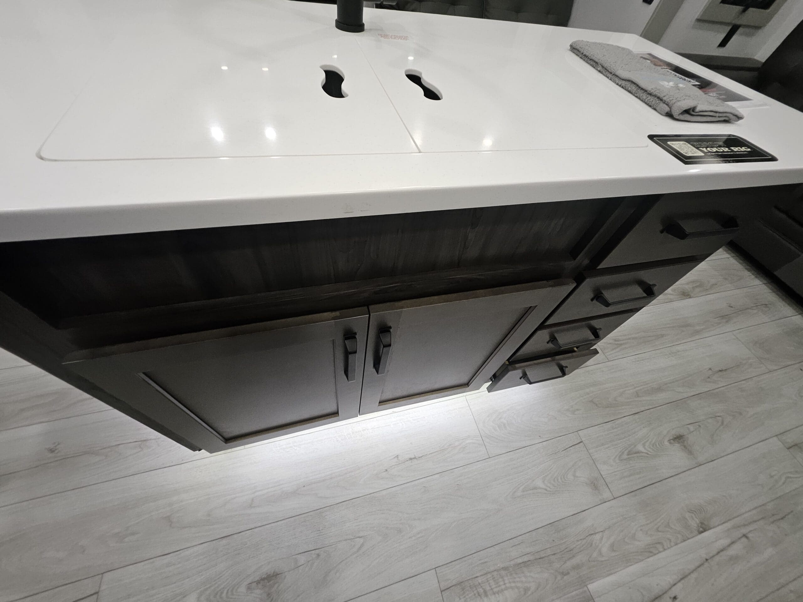 Towing & Setup: Equipped with Dexter Gladiator axles, MORryde CRE3000 suspension, and a 4-point electric auto-leveling system with hitch memory, making setup at the campsite nearly effortless.