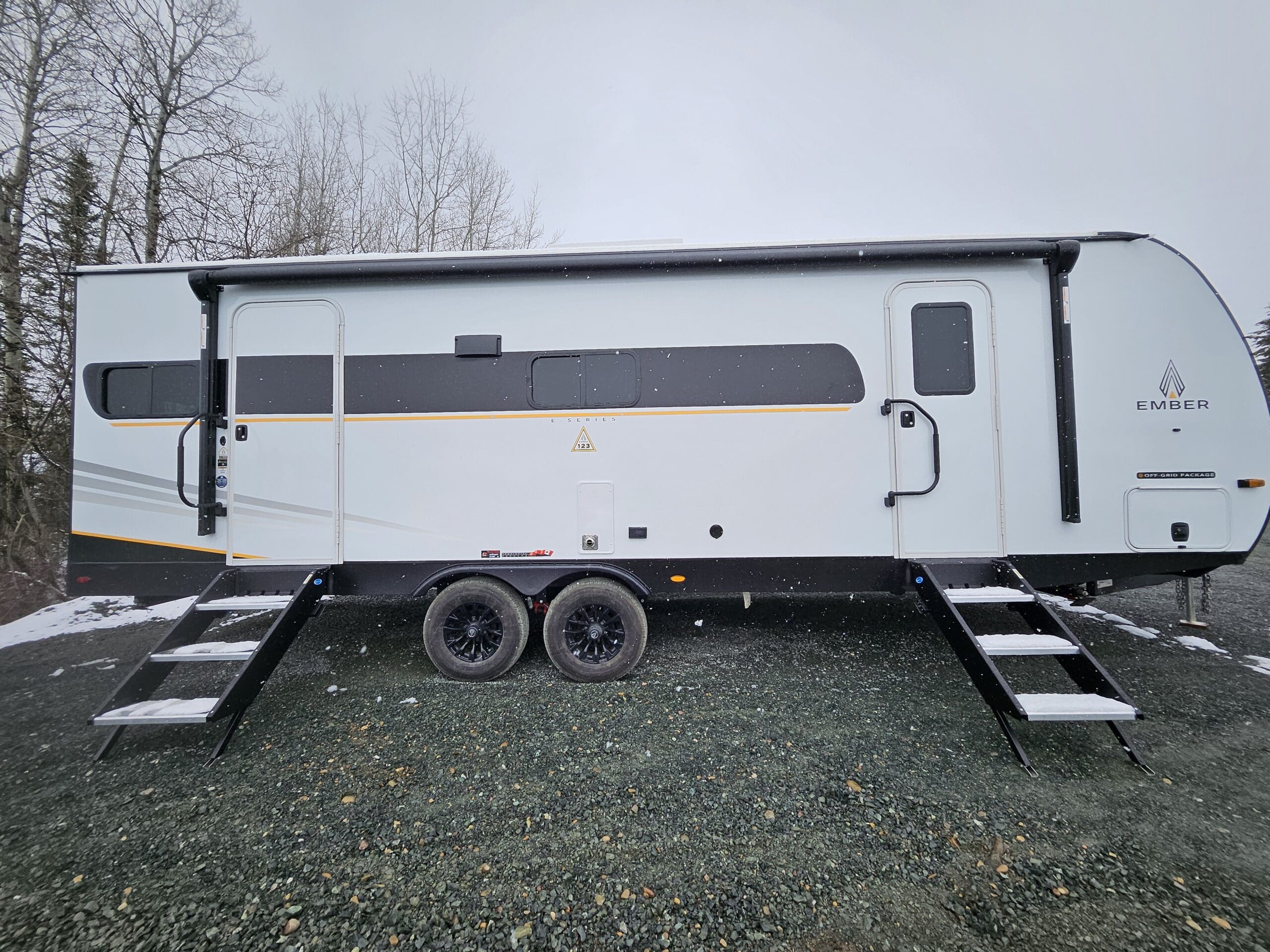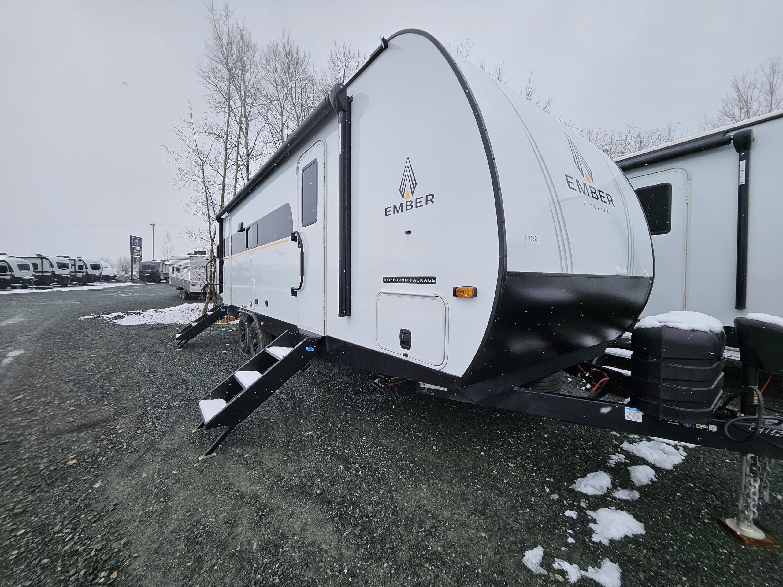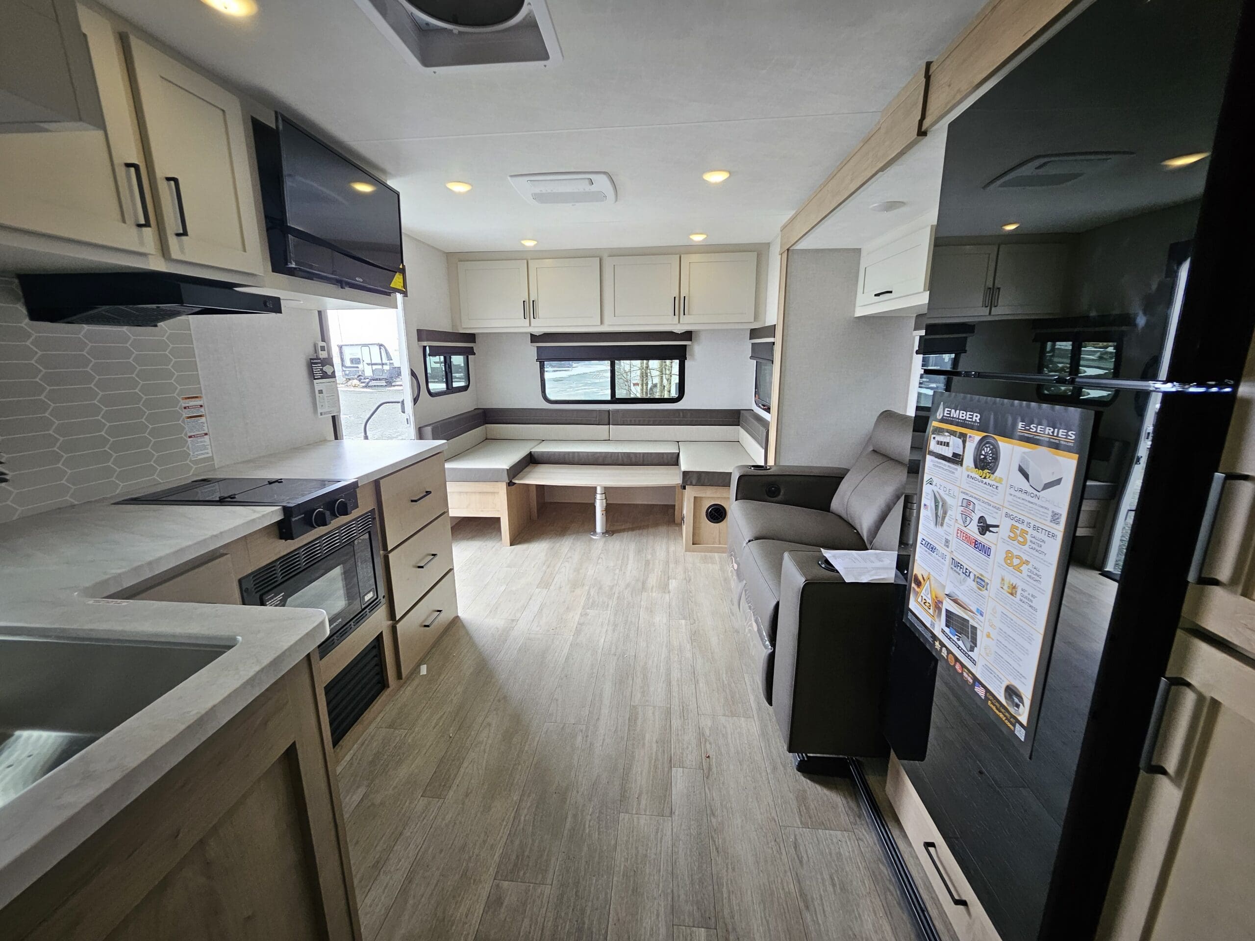 The 2026 Ember E-Series 25RUD is a mid-sized, lightweight travel trailer designed for couples or small families who prioritize a spacious living area and modern off-grid capabilities. Its standout feature is the “RUD” designation—Rear U-shaped Dinette—which provides a massive panoramic view of your campsite from the back of the rig.