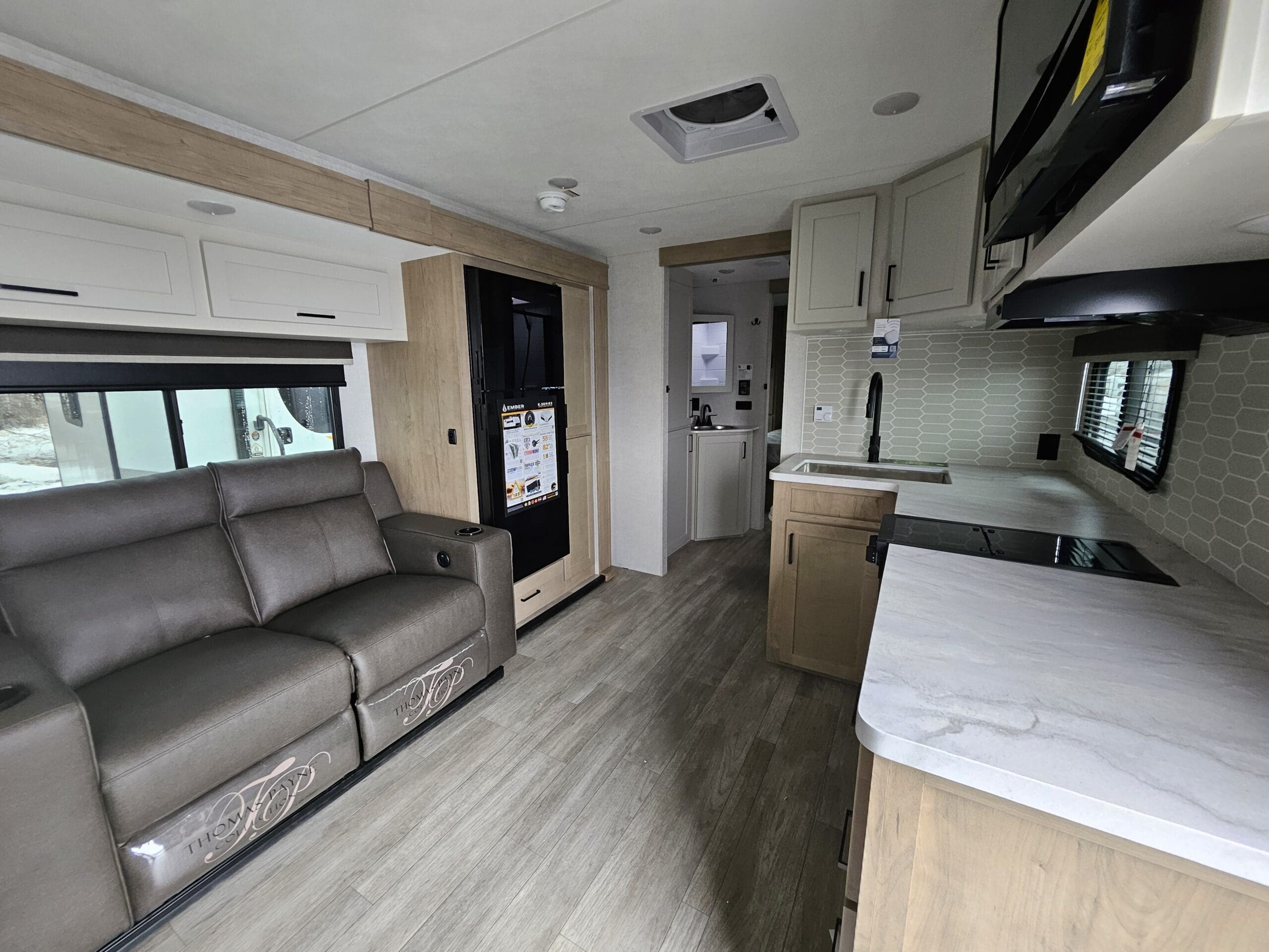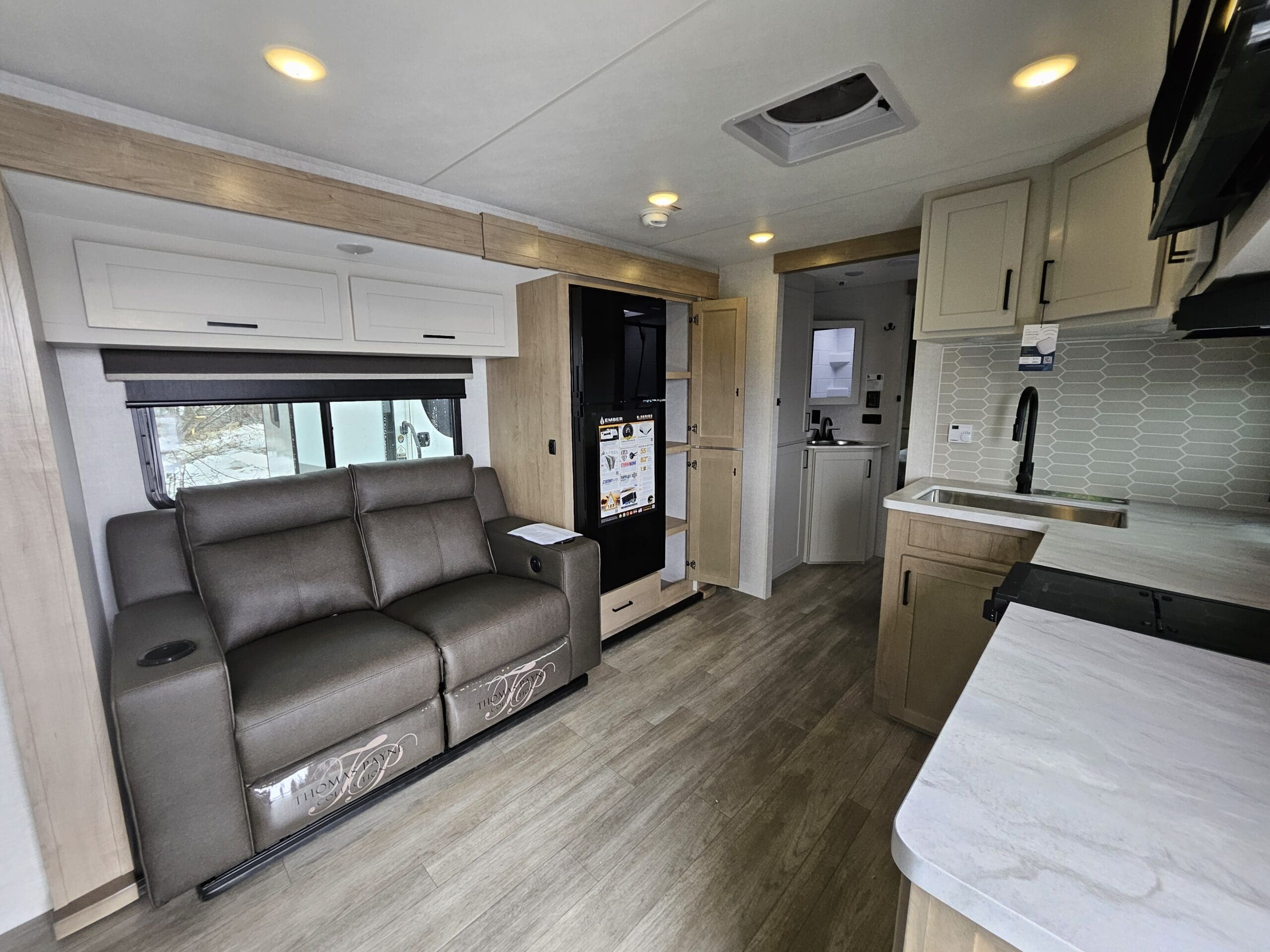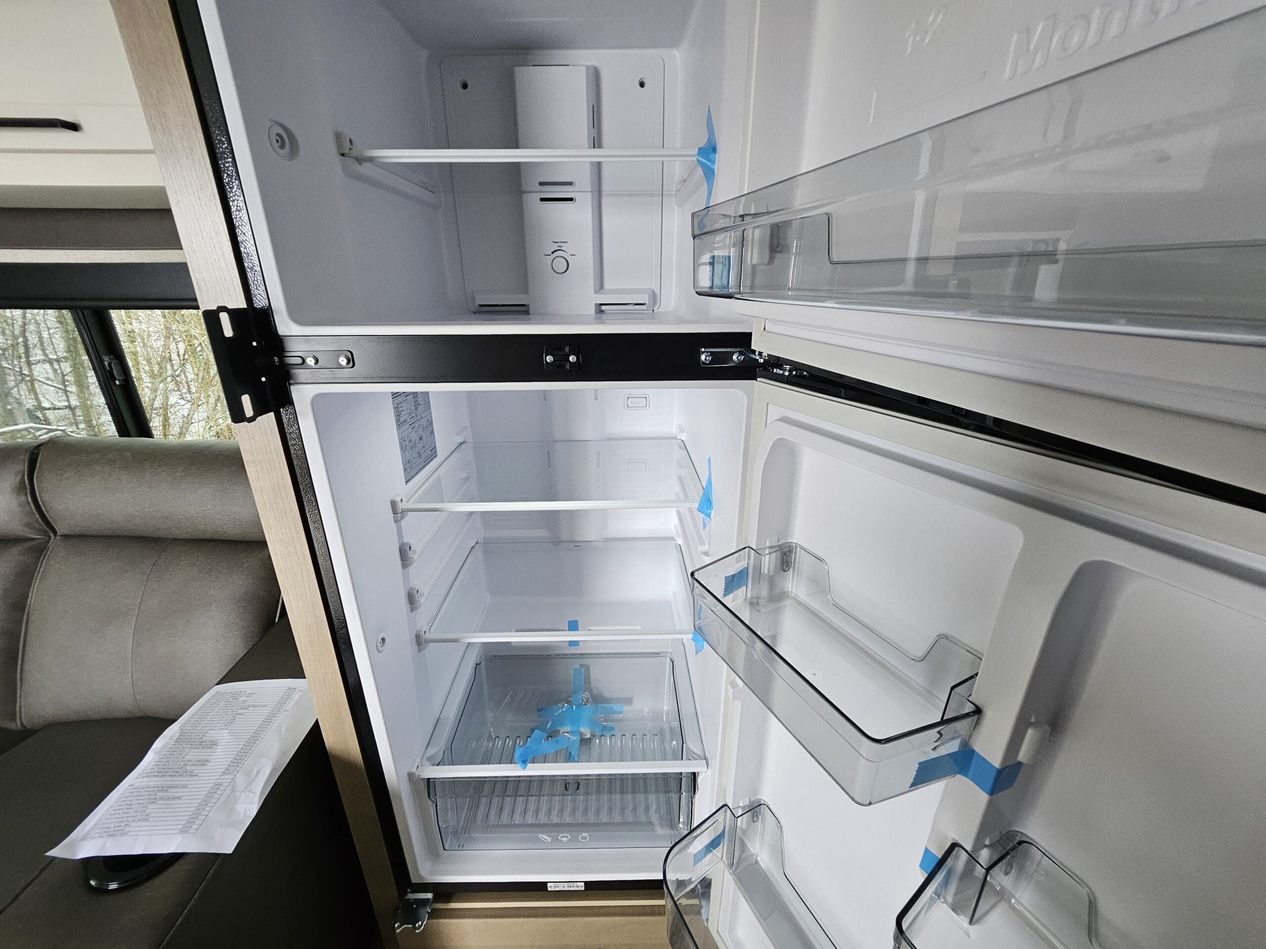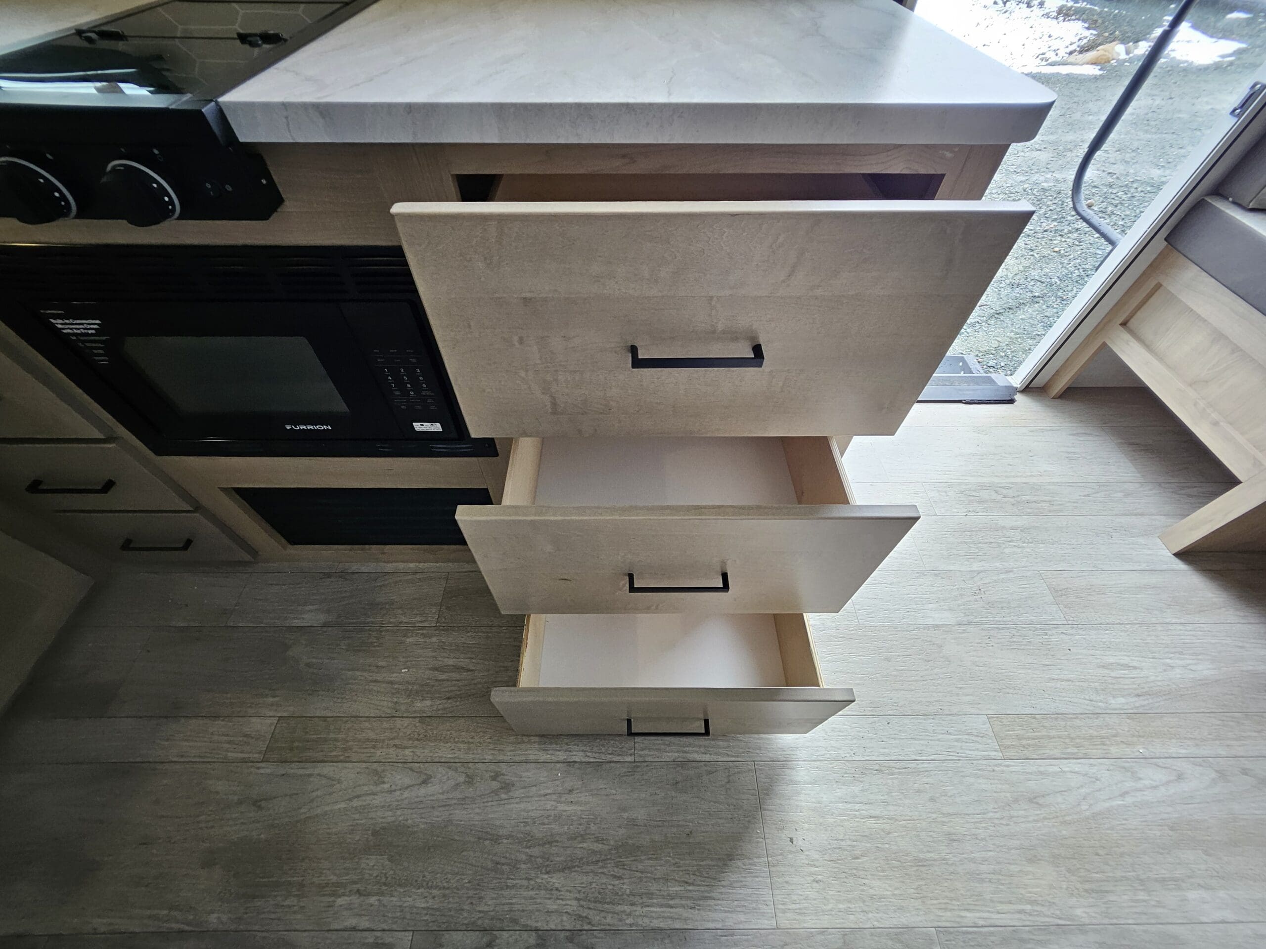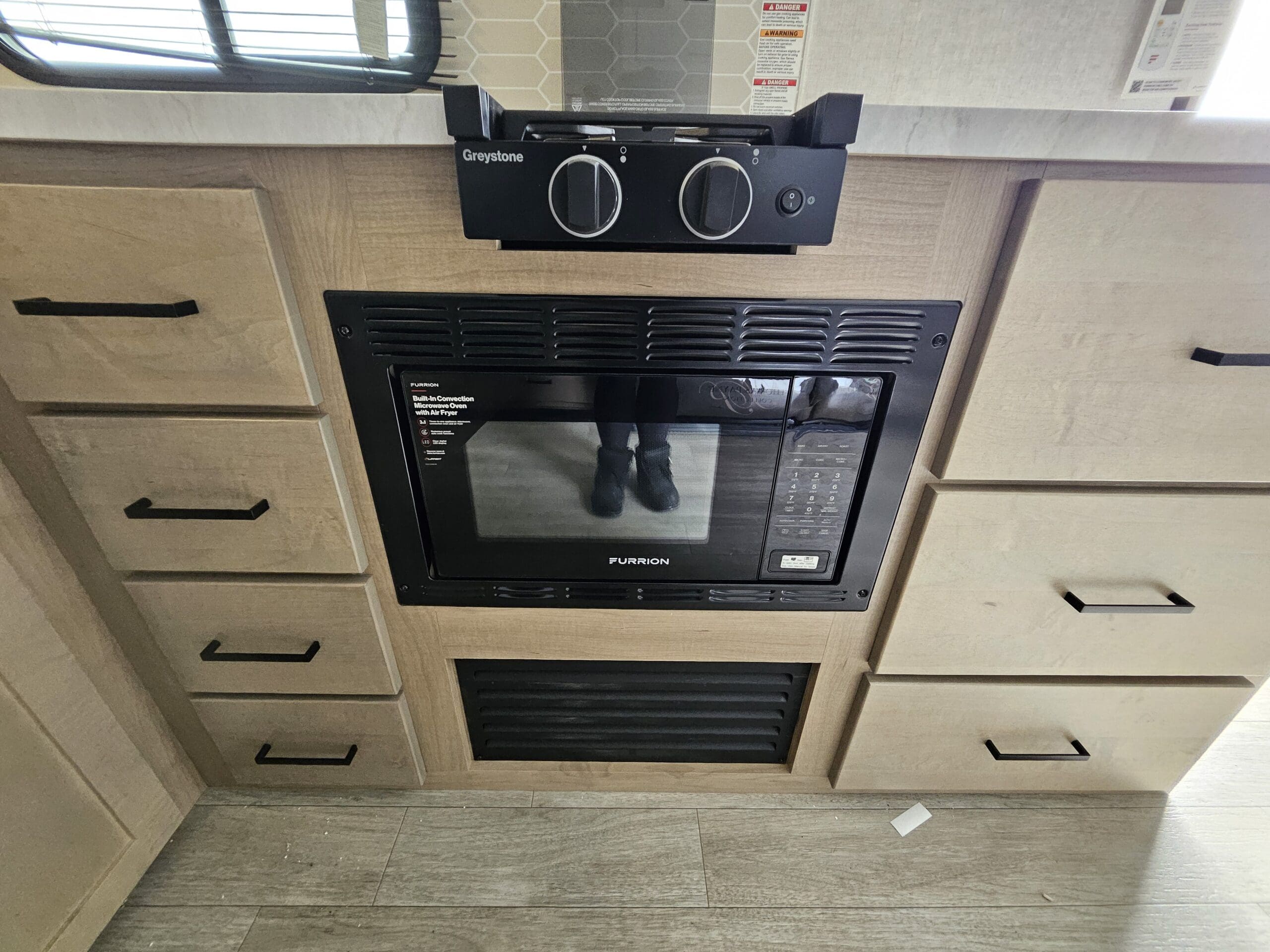 Kitchen: Equipped with a 10.6 cu. ft. 12V refrigerator and an air fryer/convection microwave combo instead of a traditional bulky oven.