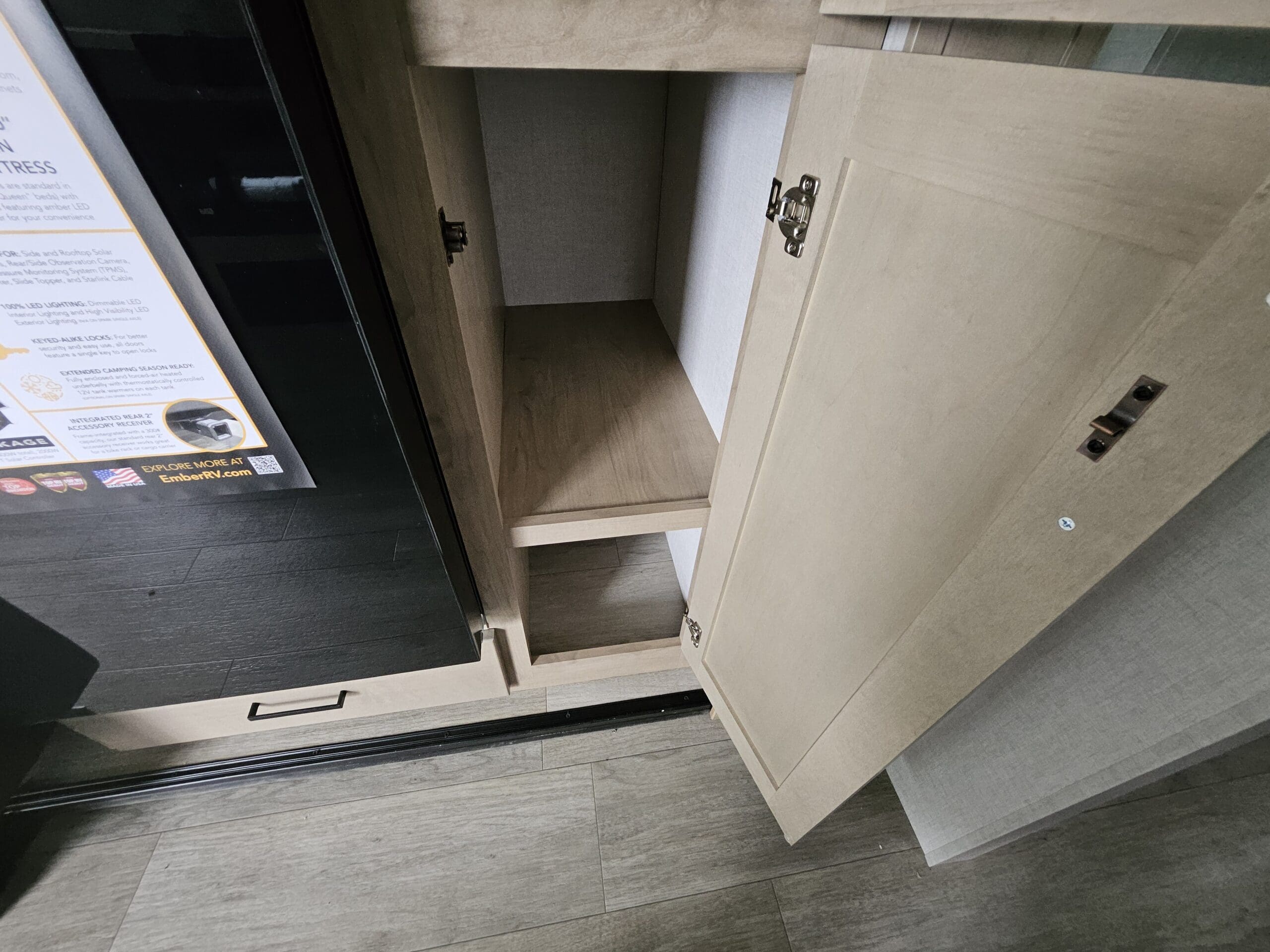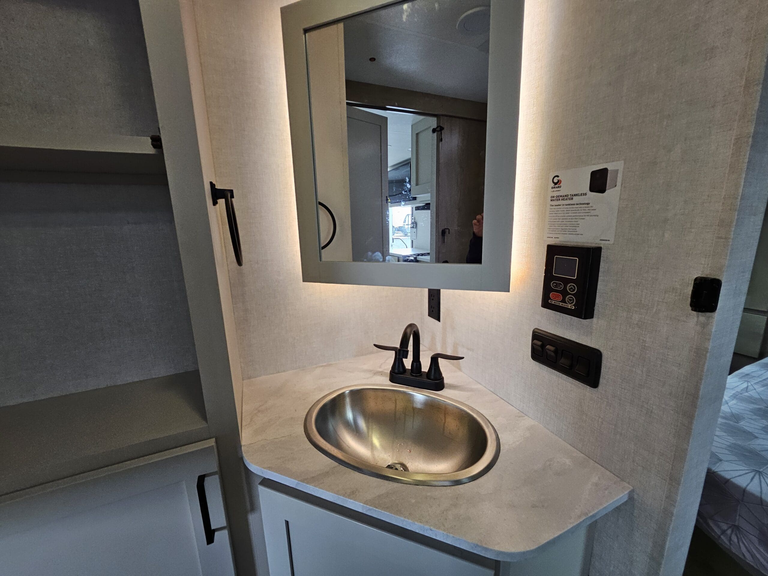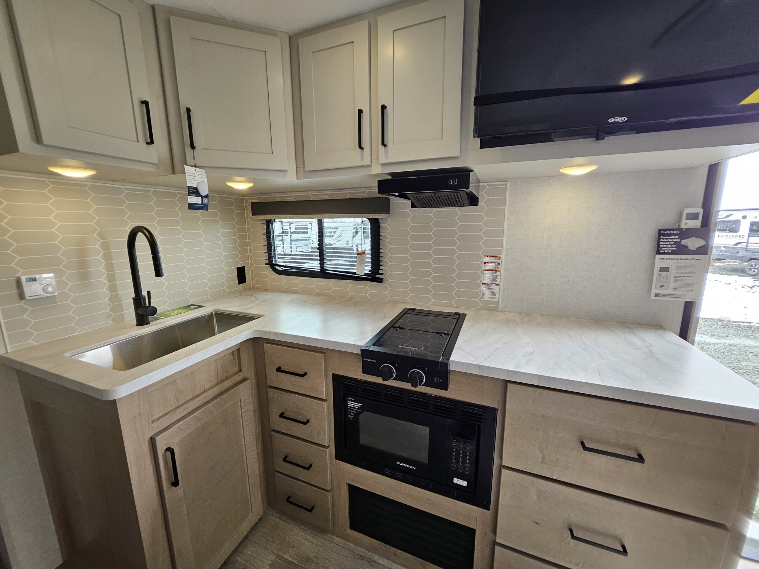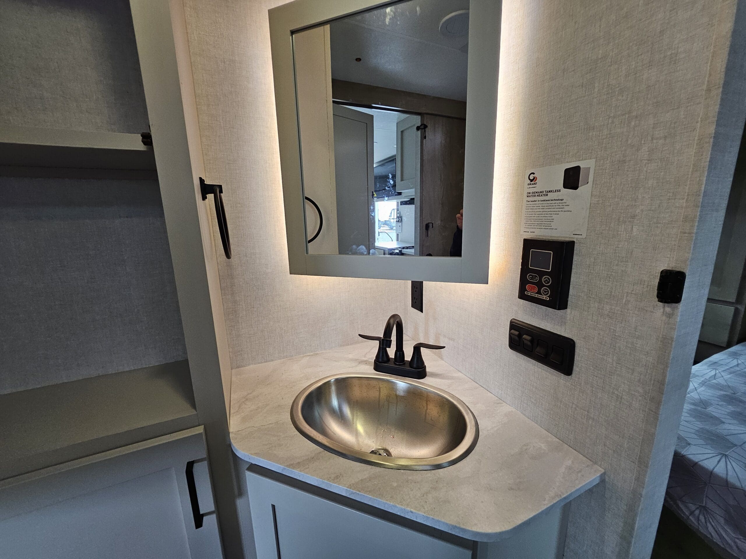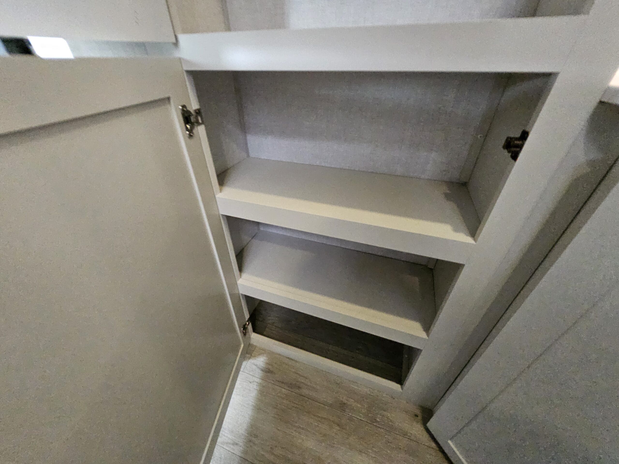Kitchen: Equipped with a 10.6 cu. ft. 12V refrigerator and an air fryer/convection microwave combo instead of a traditional bulky oven.