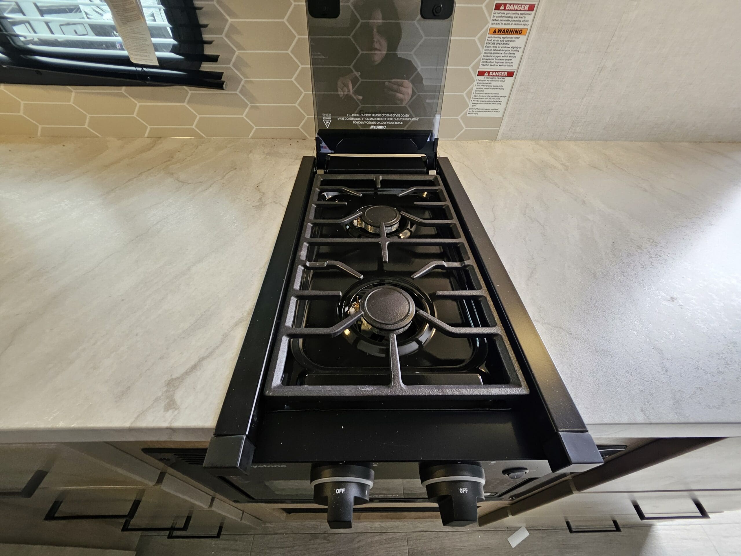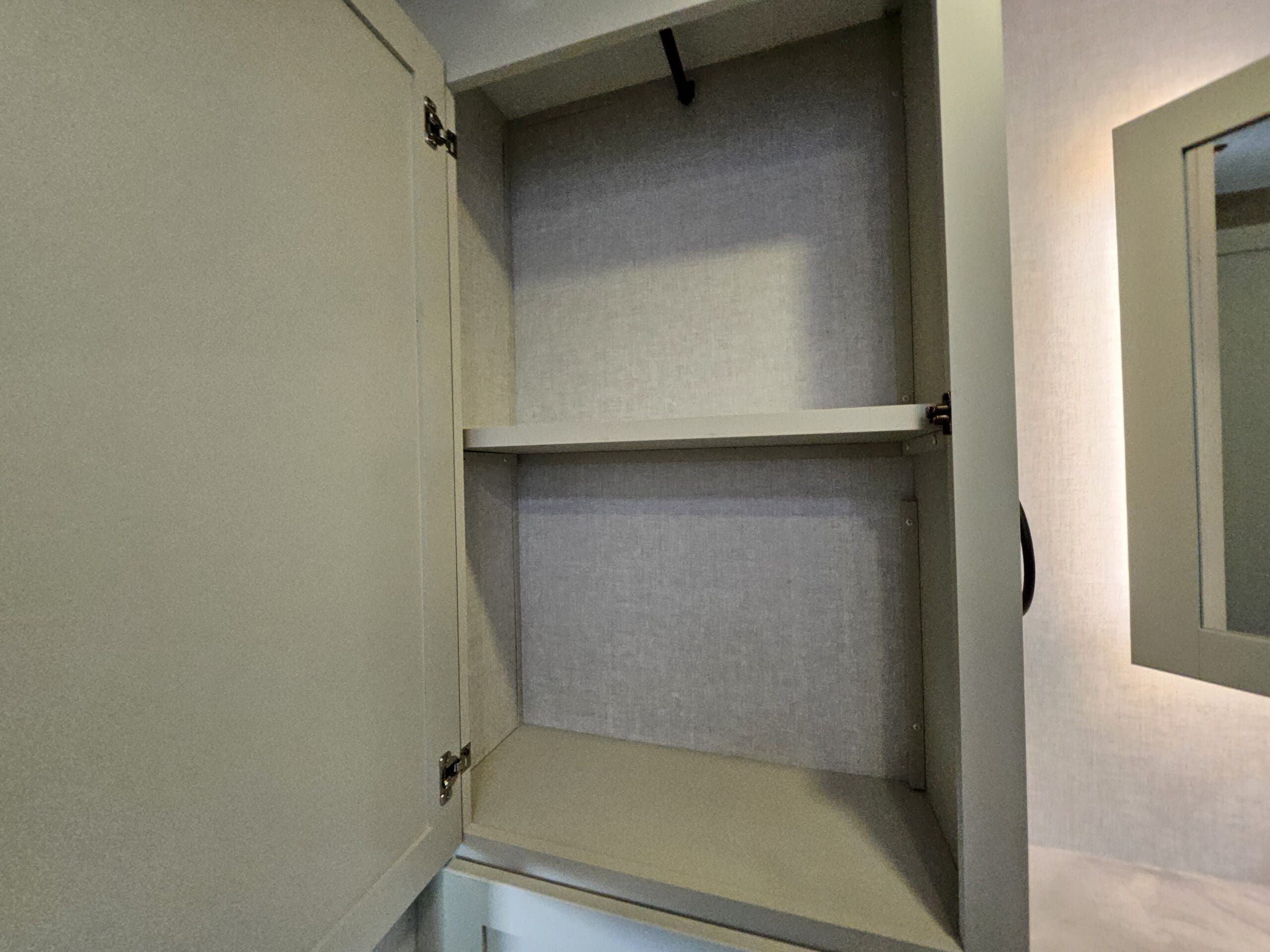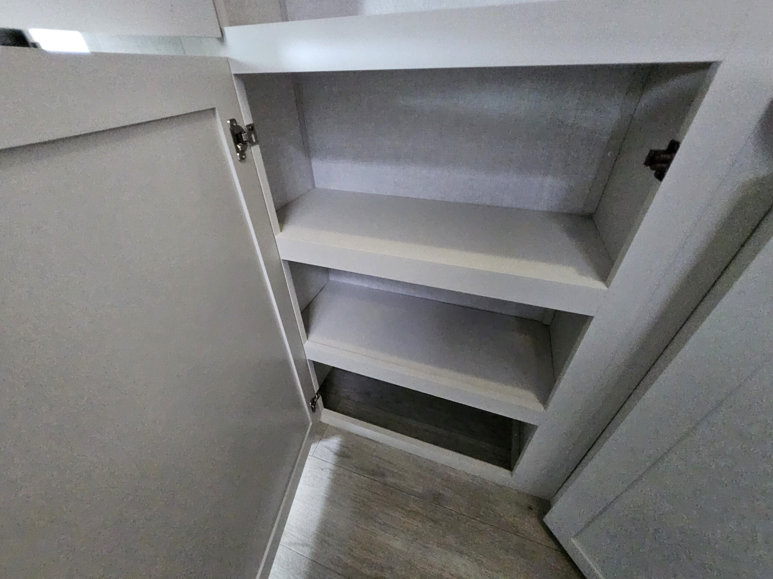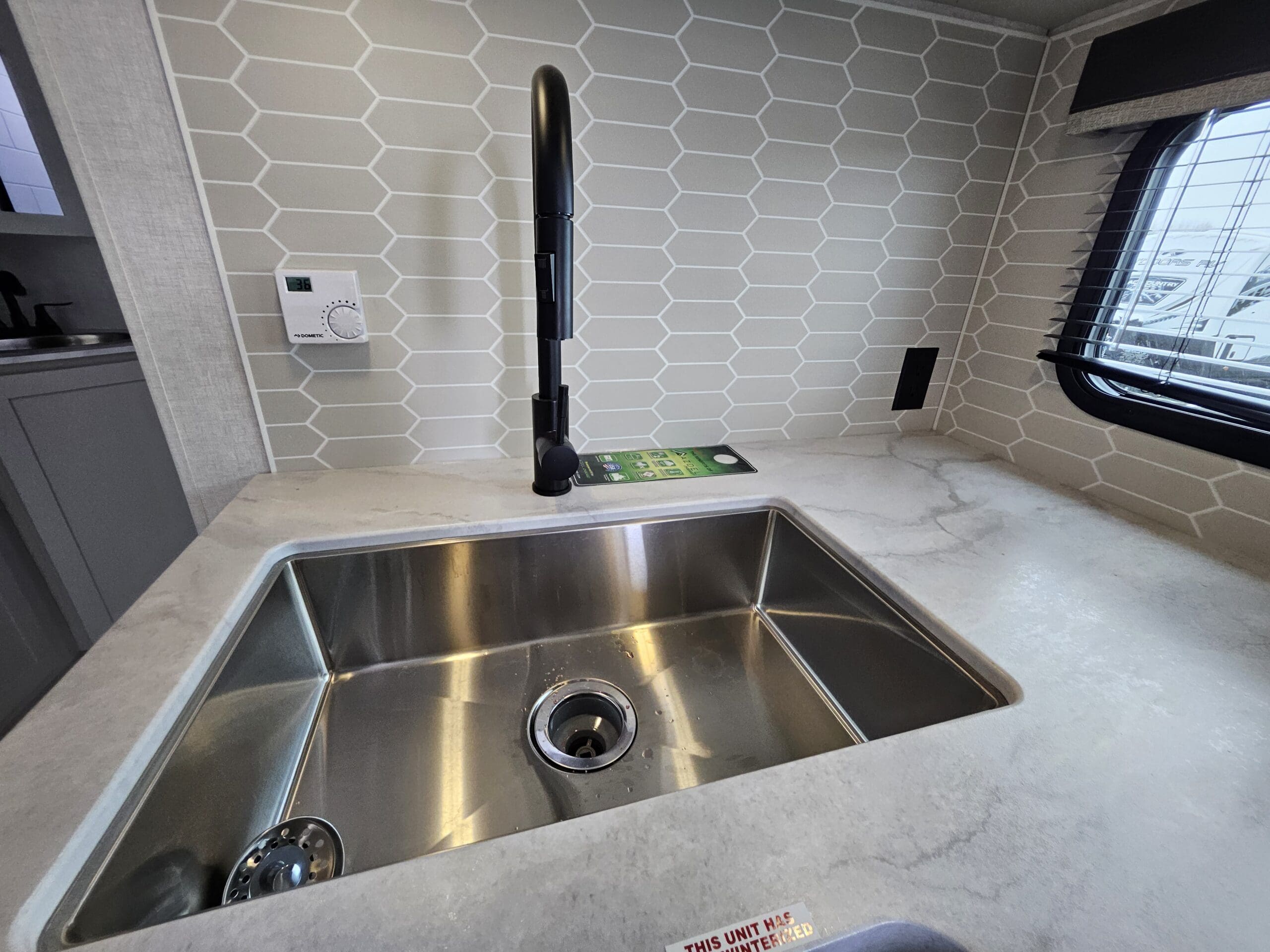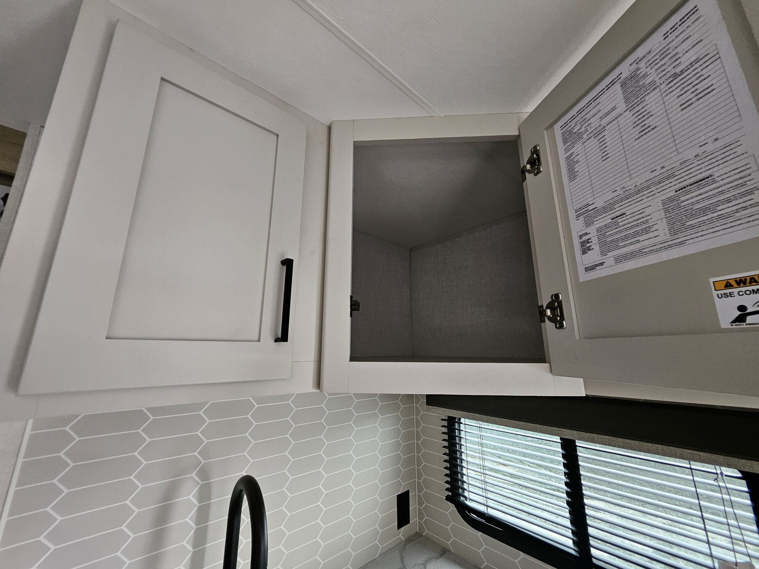 Kitchen: Equipped with a 10.6 cu. ft. 12V refrigerator and an air fryer/convection microwave combo instead of a traditional bulky oven.