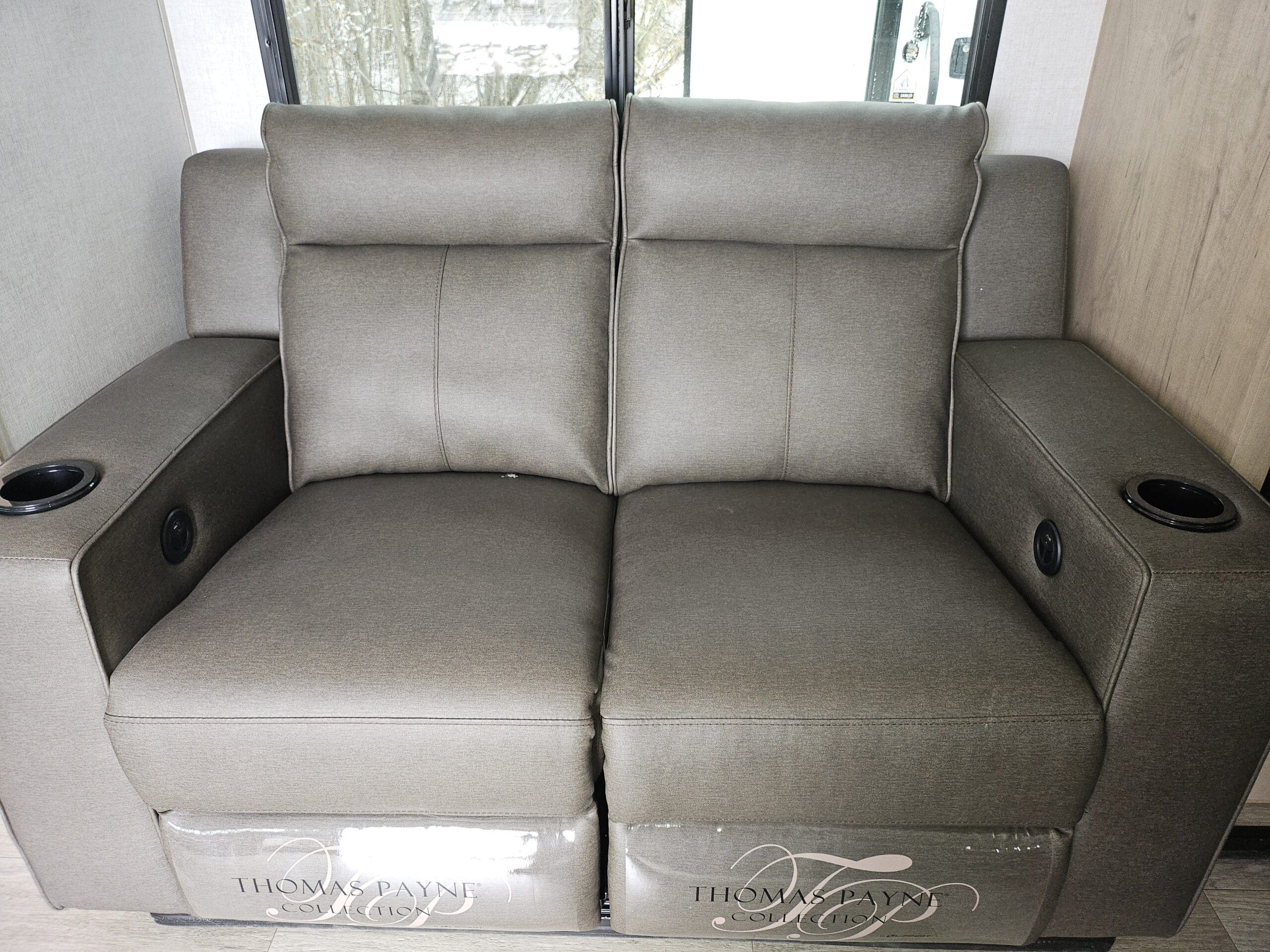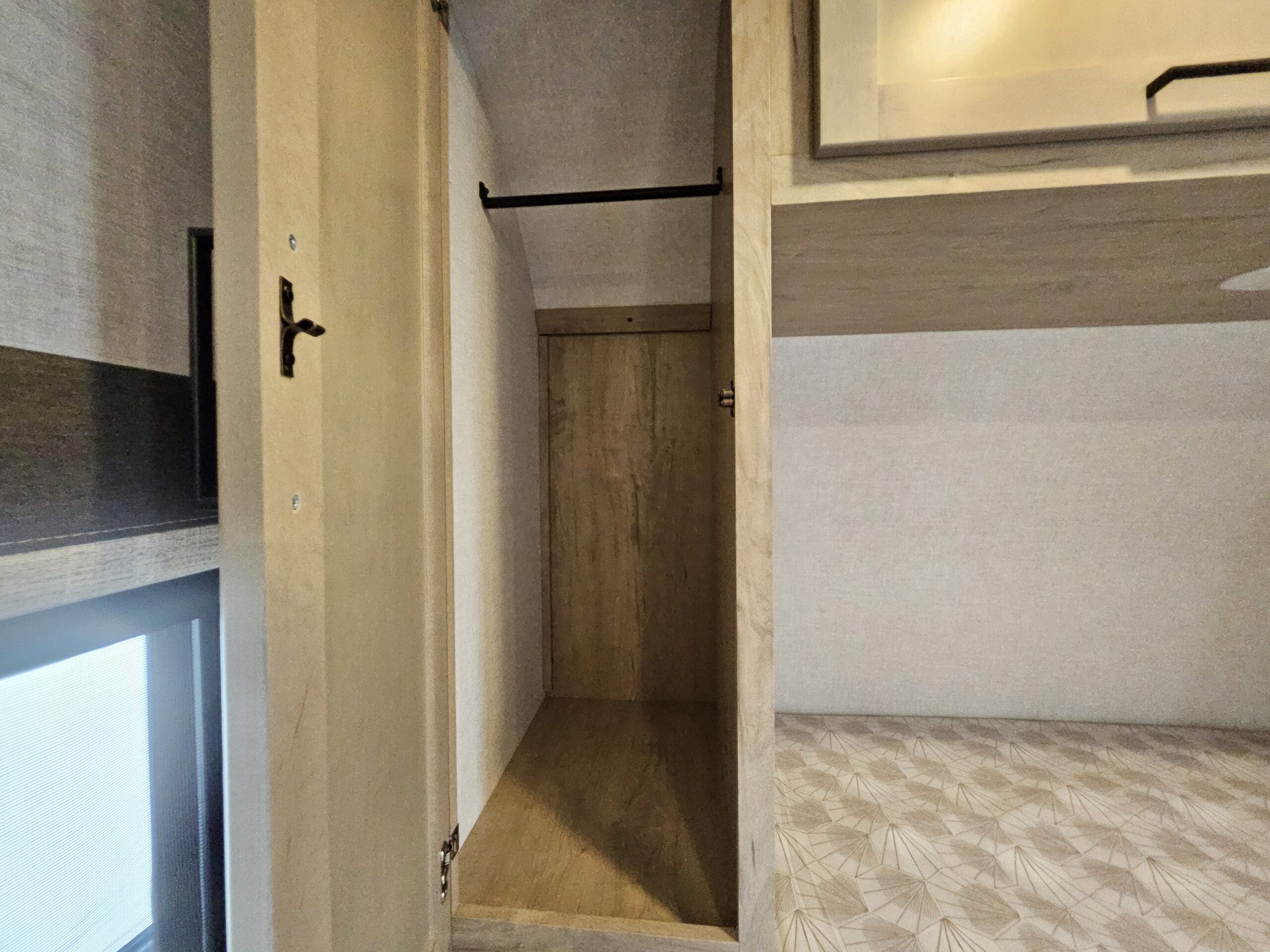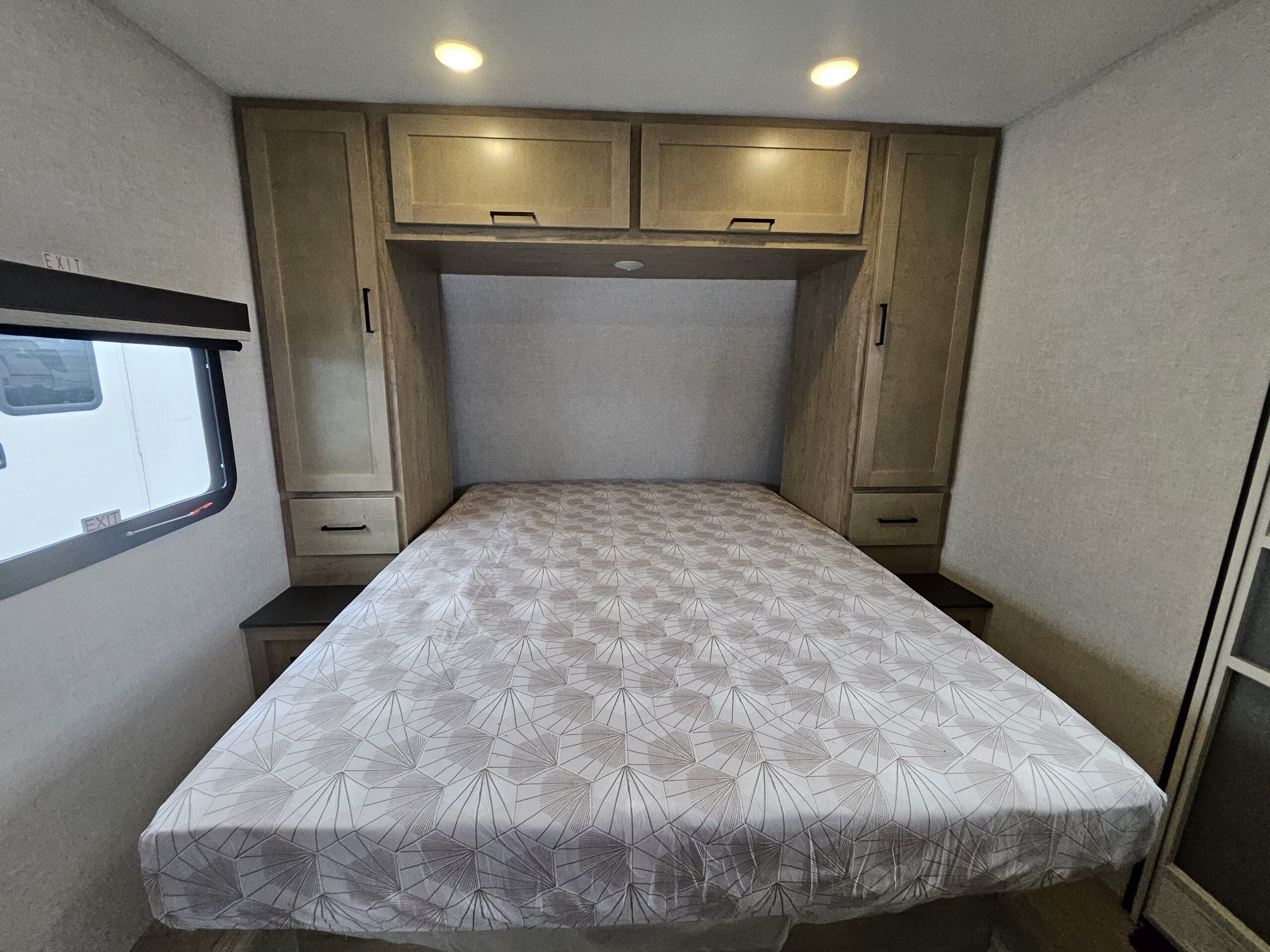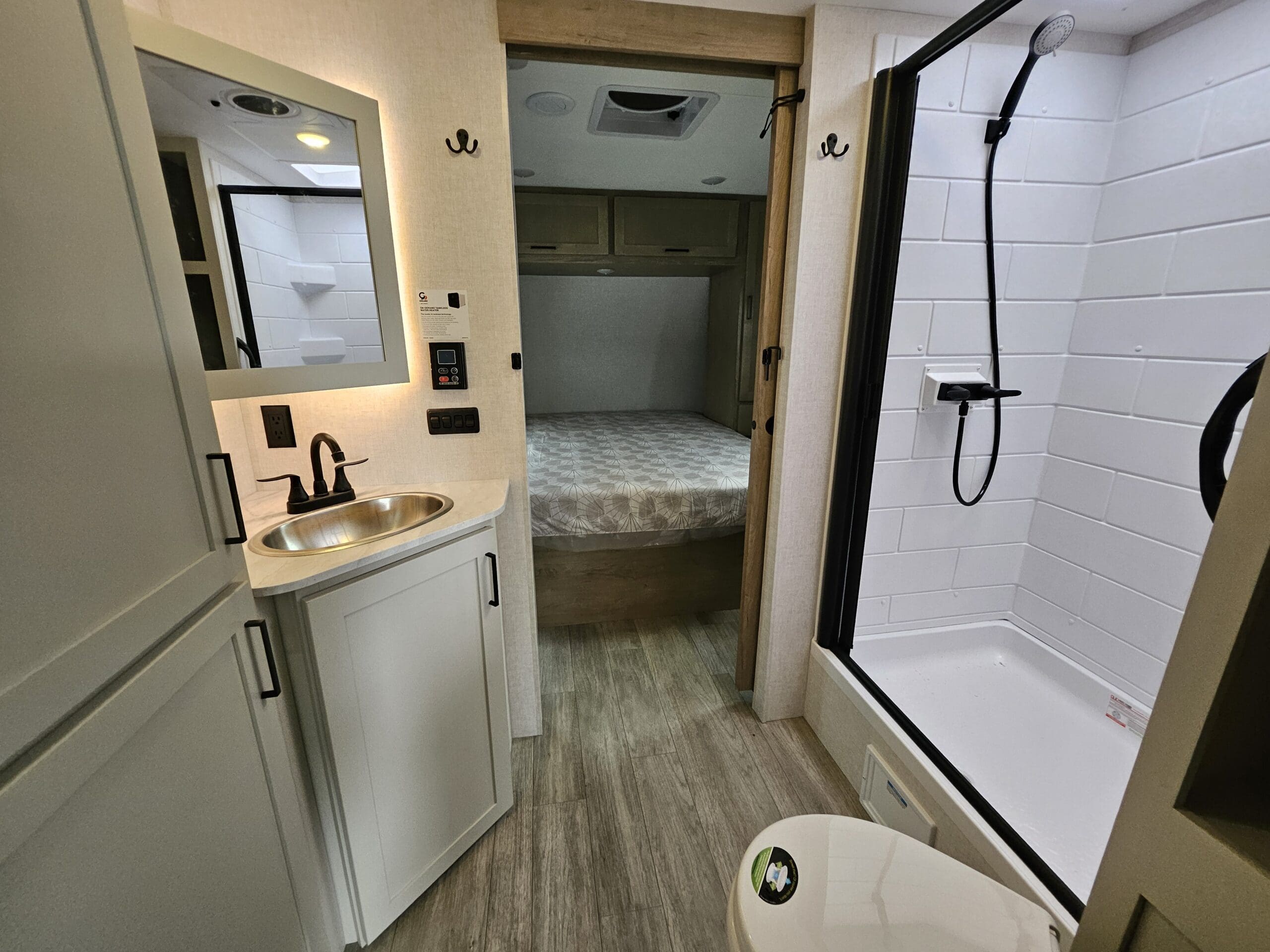 Bedroom: Features a residential-sized 60″ x 80″ Queen bed (no “RV King” shorties here) with specialized “power cubbies” on both sides that include USB-A, USB-C, and 120V outlets.
