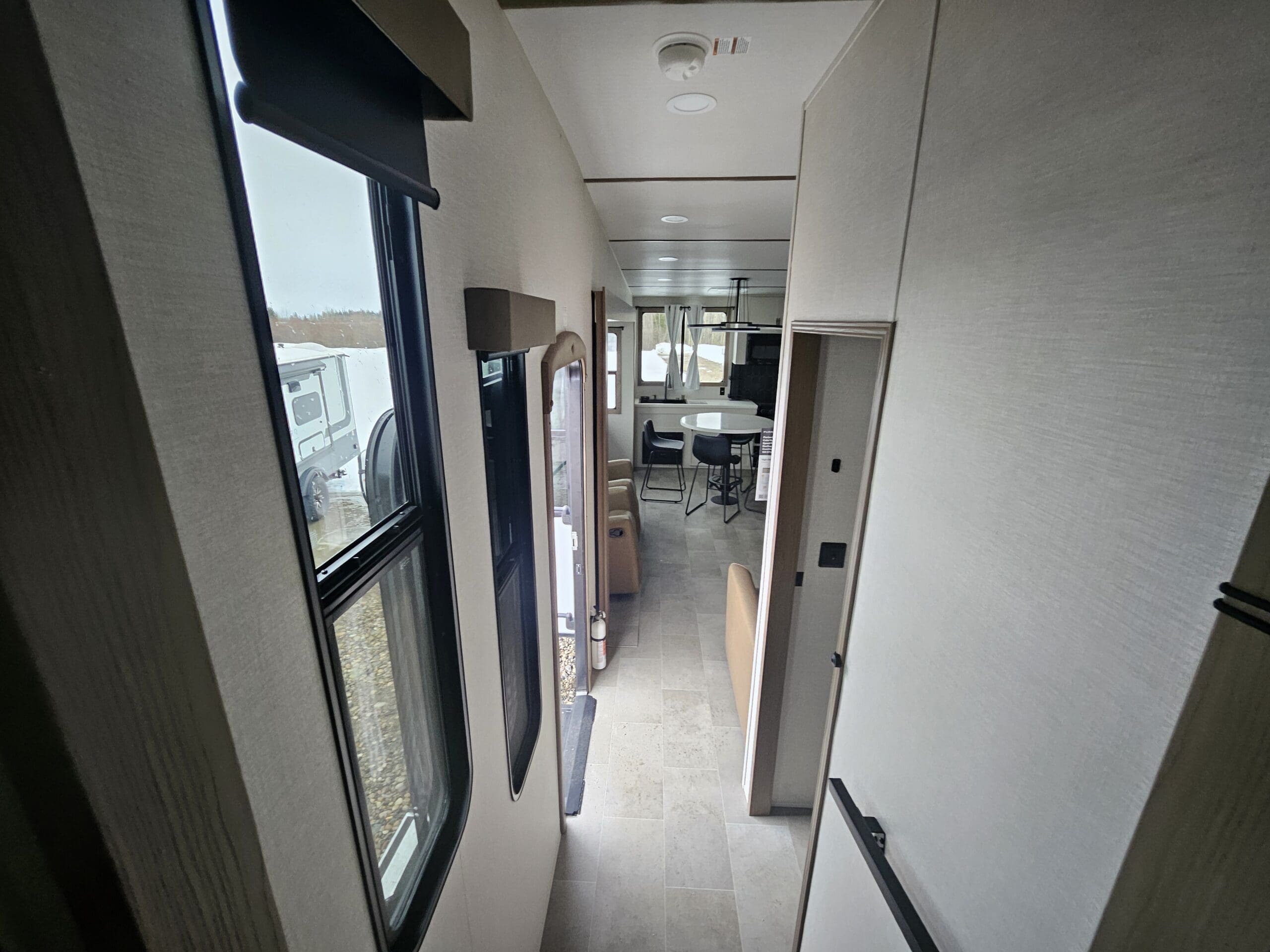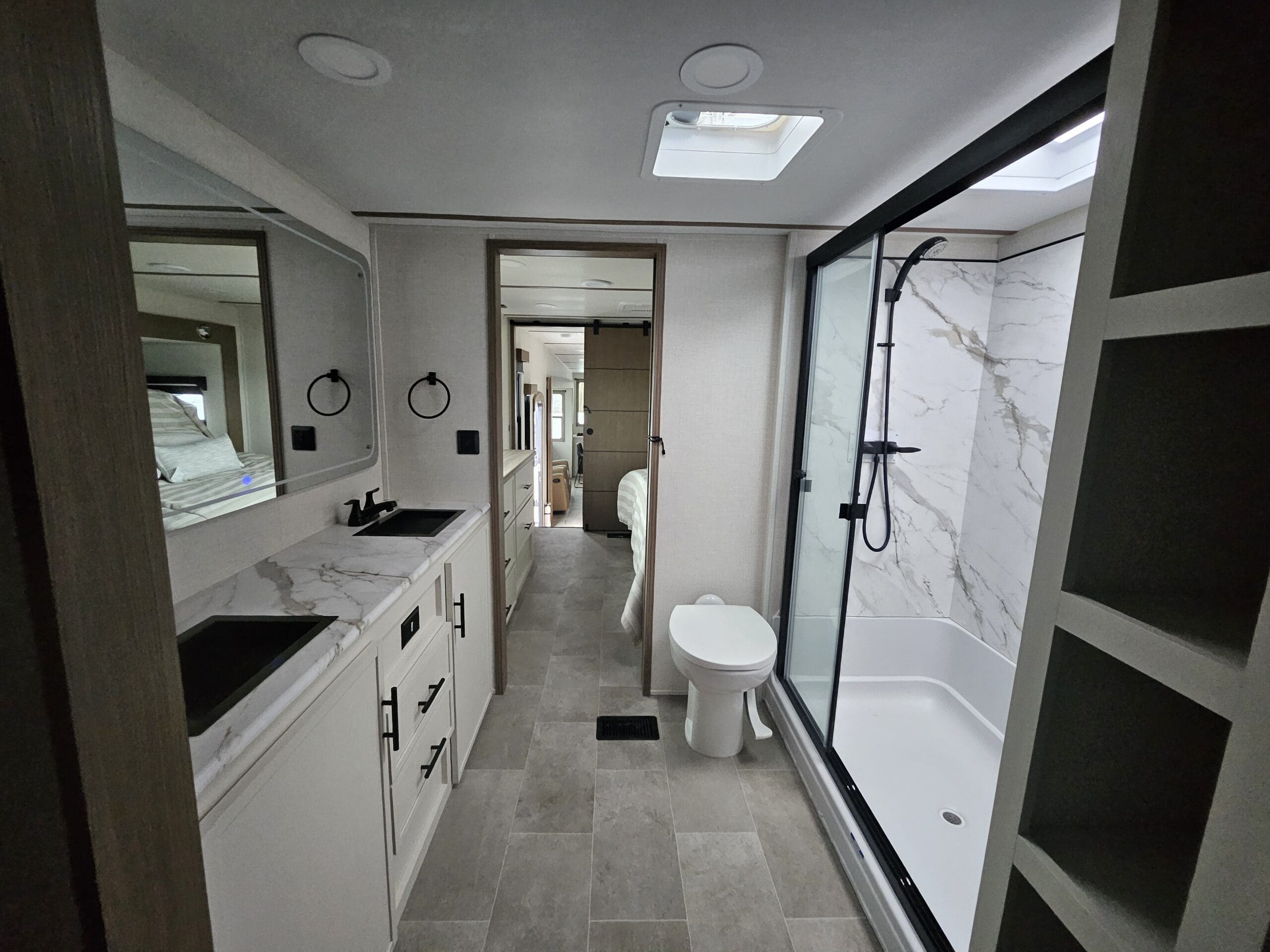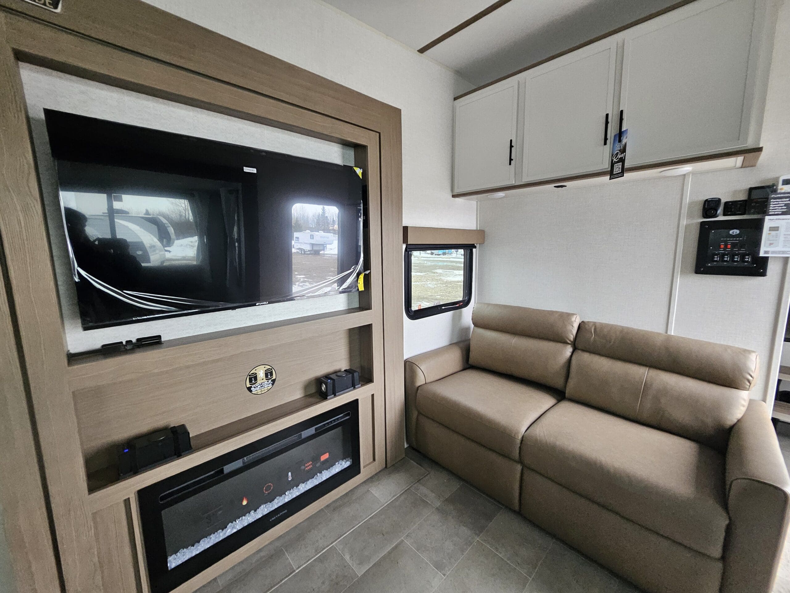 The Forest River Impression 360MYR is a mid-profile fifth wheel designed for travellers who want a “best of both worlds” layout. It’s particularly famous for its master bedroom & on-suite configuration, making it a favourite for couples, remote workers, lake lots, or those who spend their winters snow-birding.