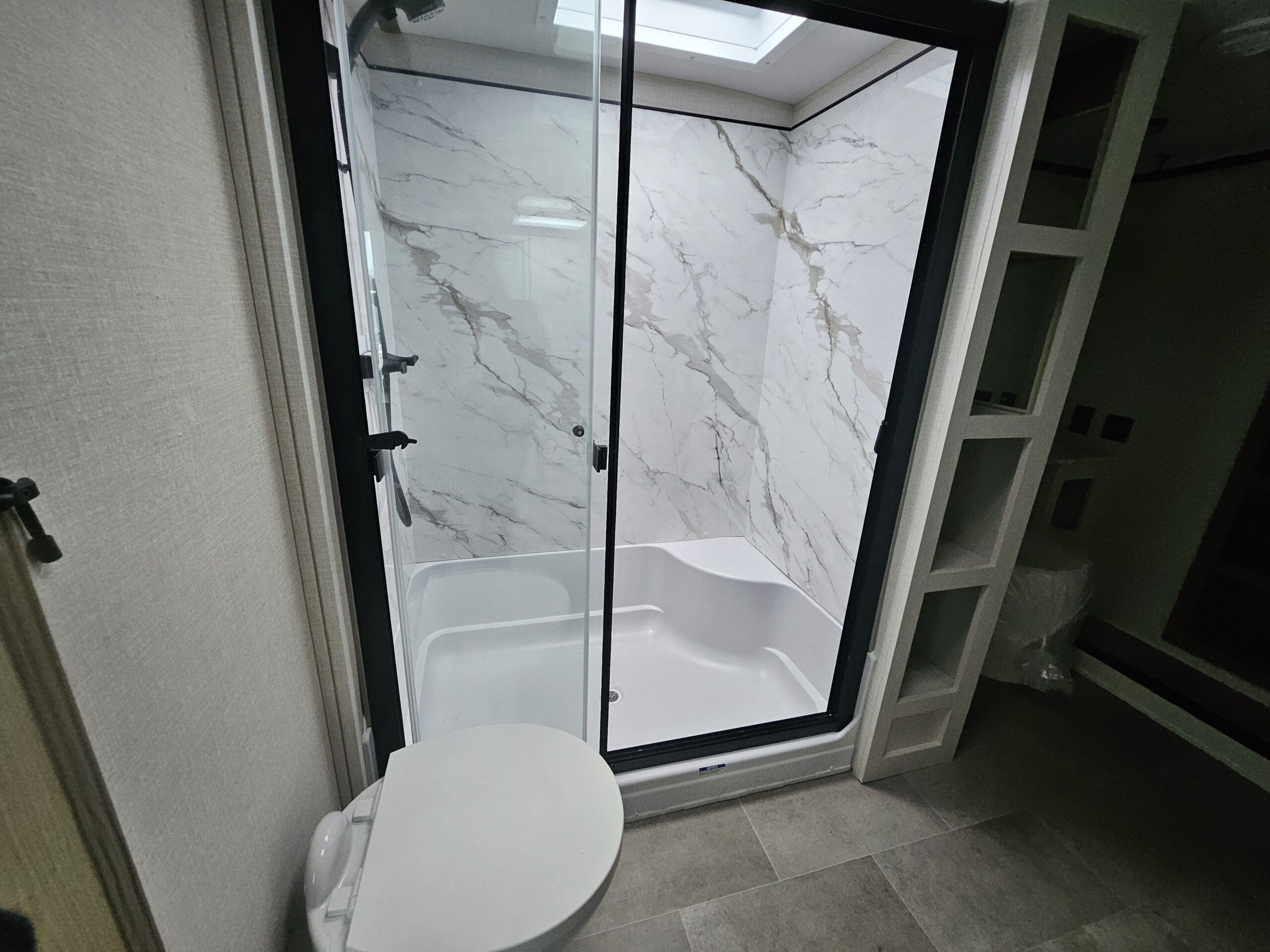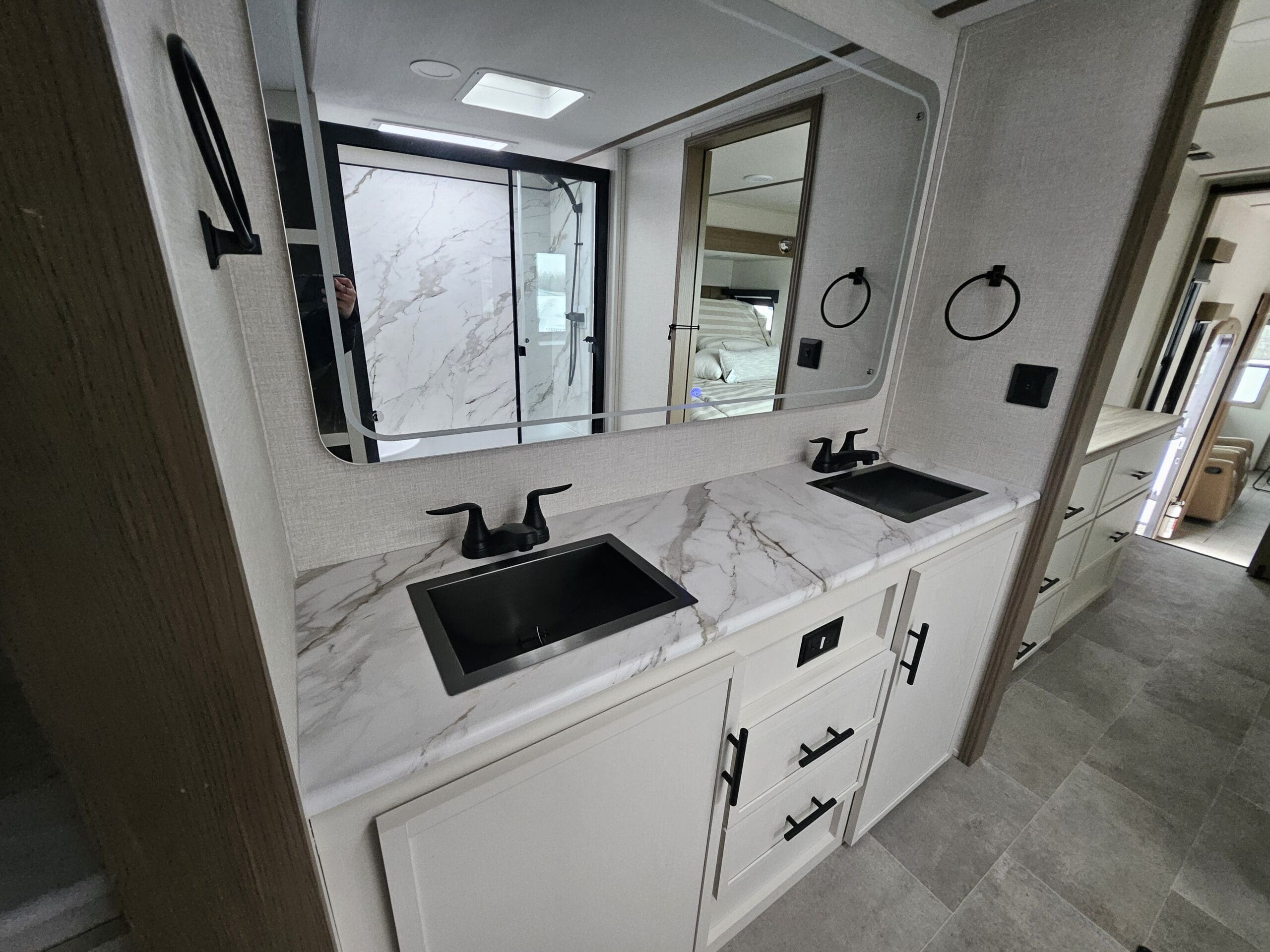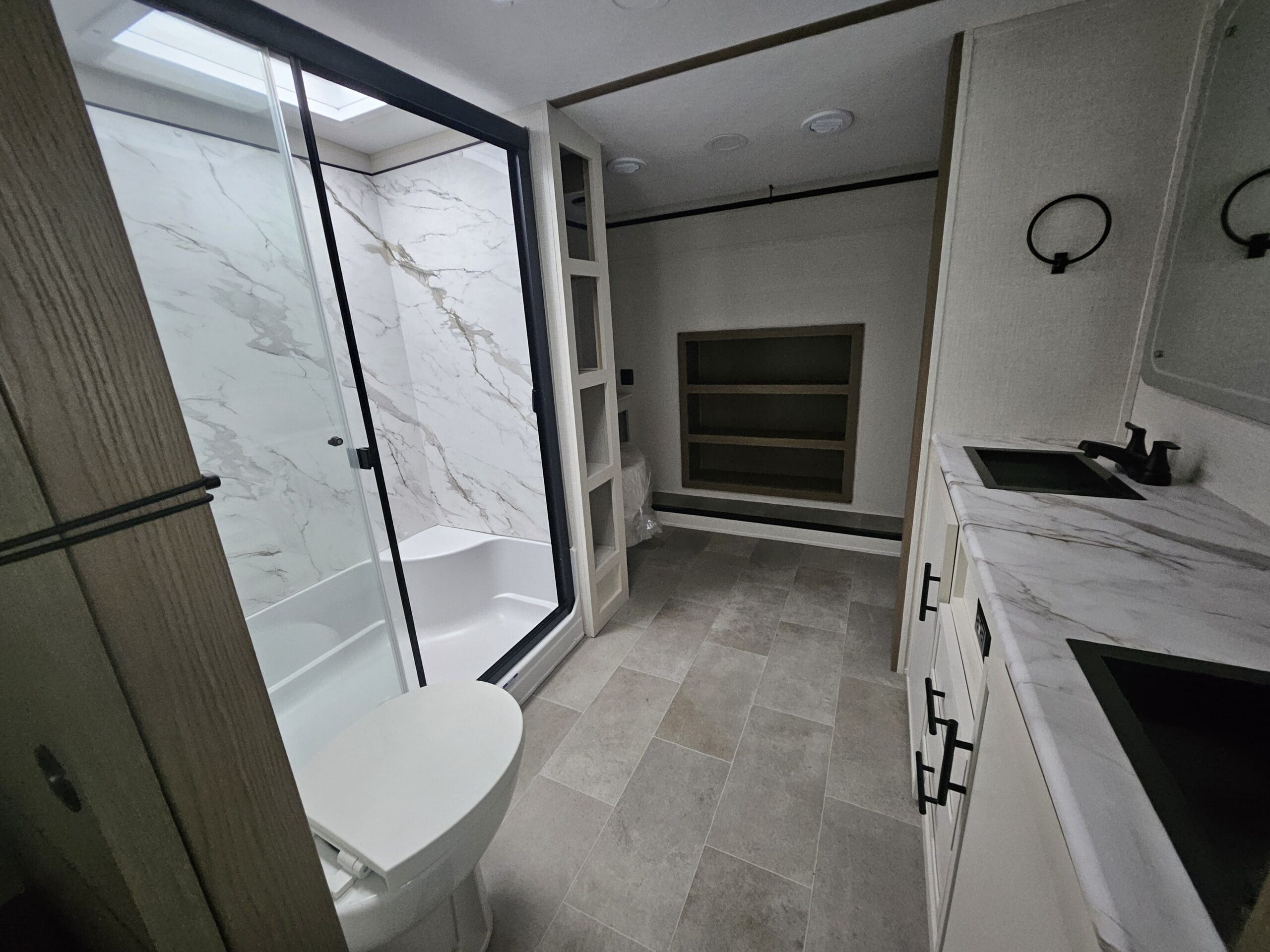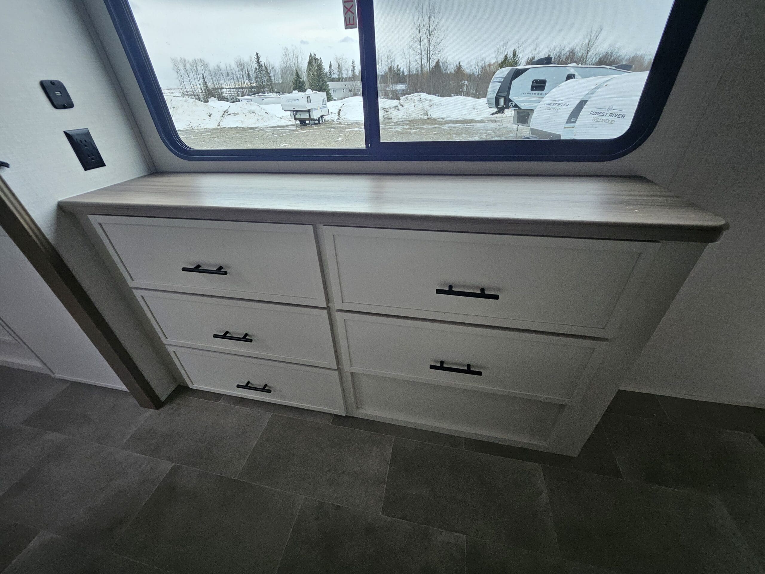 The Forest River Impression 360MYR is a mid-profile fifth wheel designed for travellers who want a “best of both worlds” layout. It’s particularly famous for its master bedroom & on-suite configuration, making it a favourite for couples, remote workers, lake lots, or those who spend their winters snow-birding.