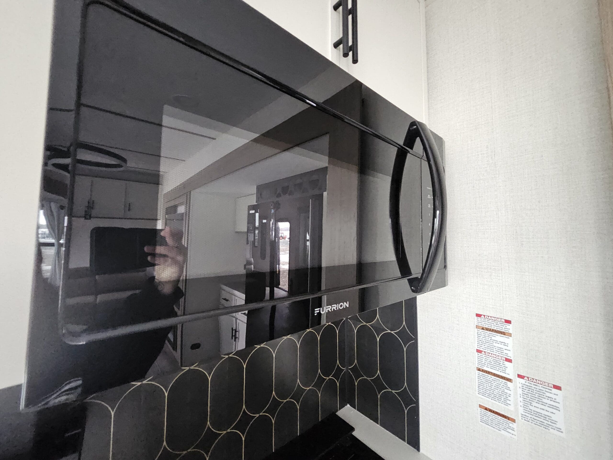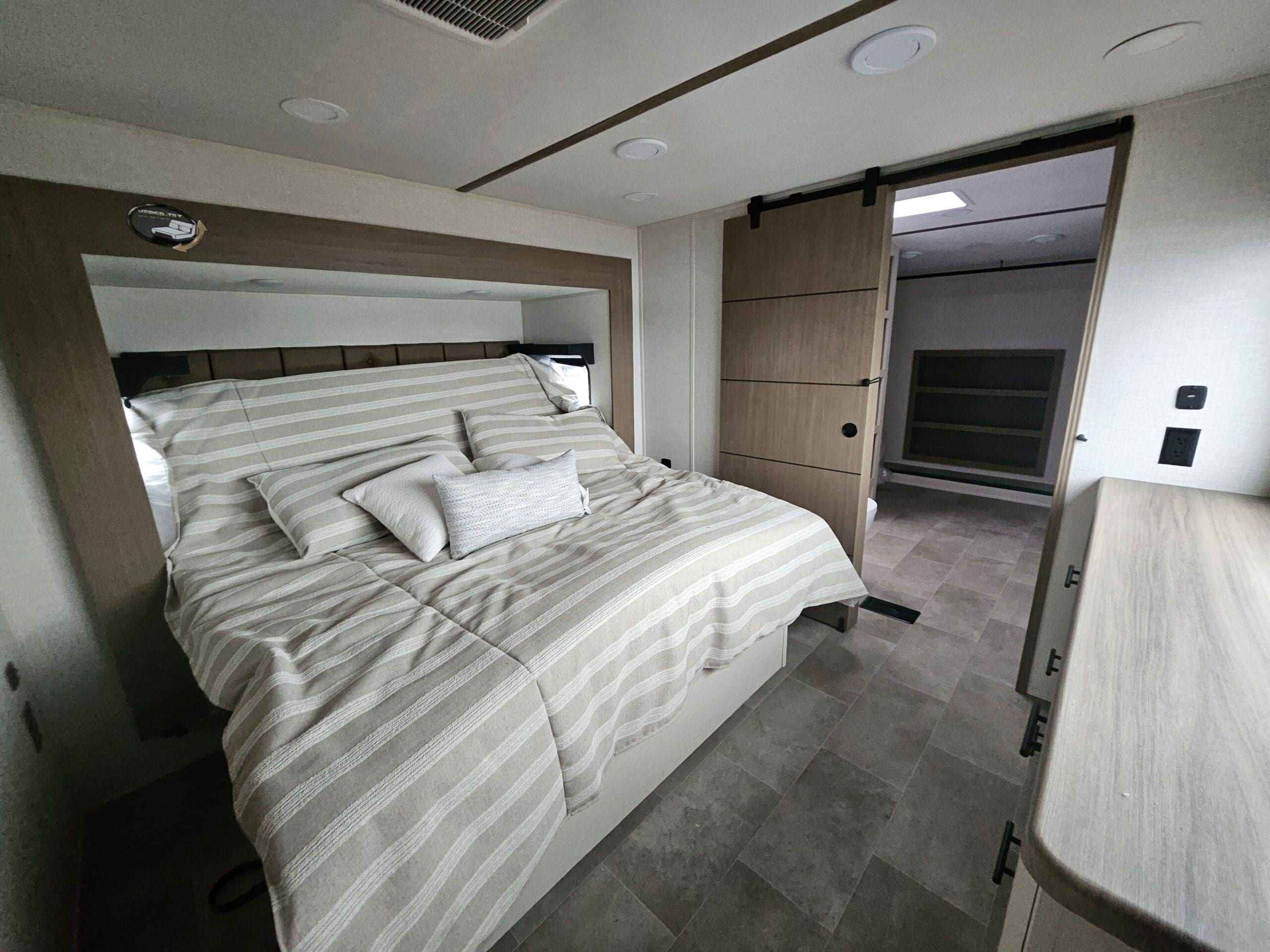 Bed: A residential 72″ x 80″ king bed with versa tilt technology sits in the front slide-out, providing plenty of walk-around space.