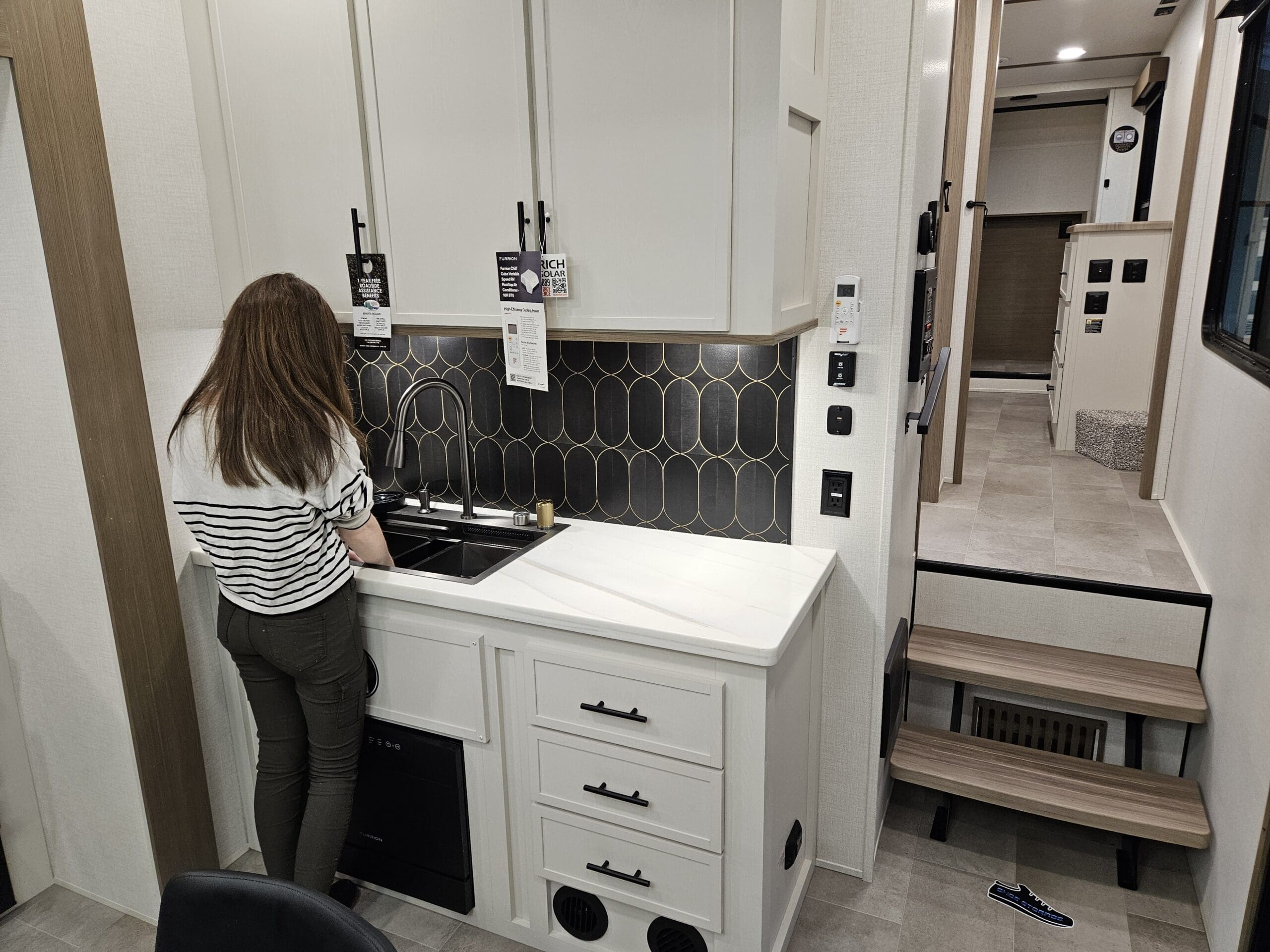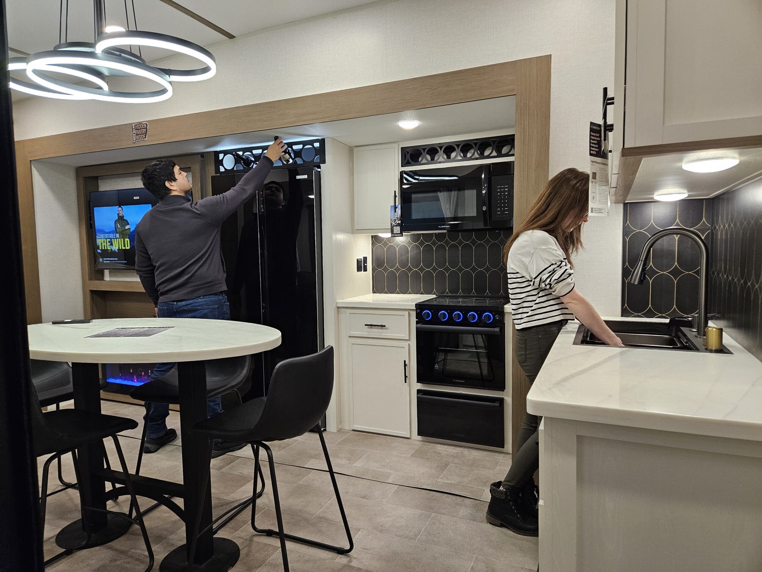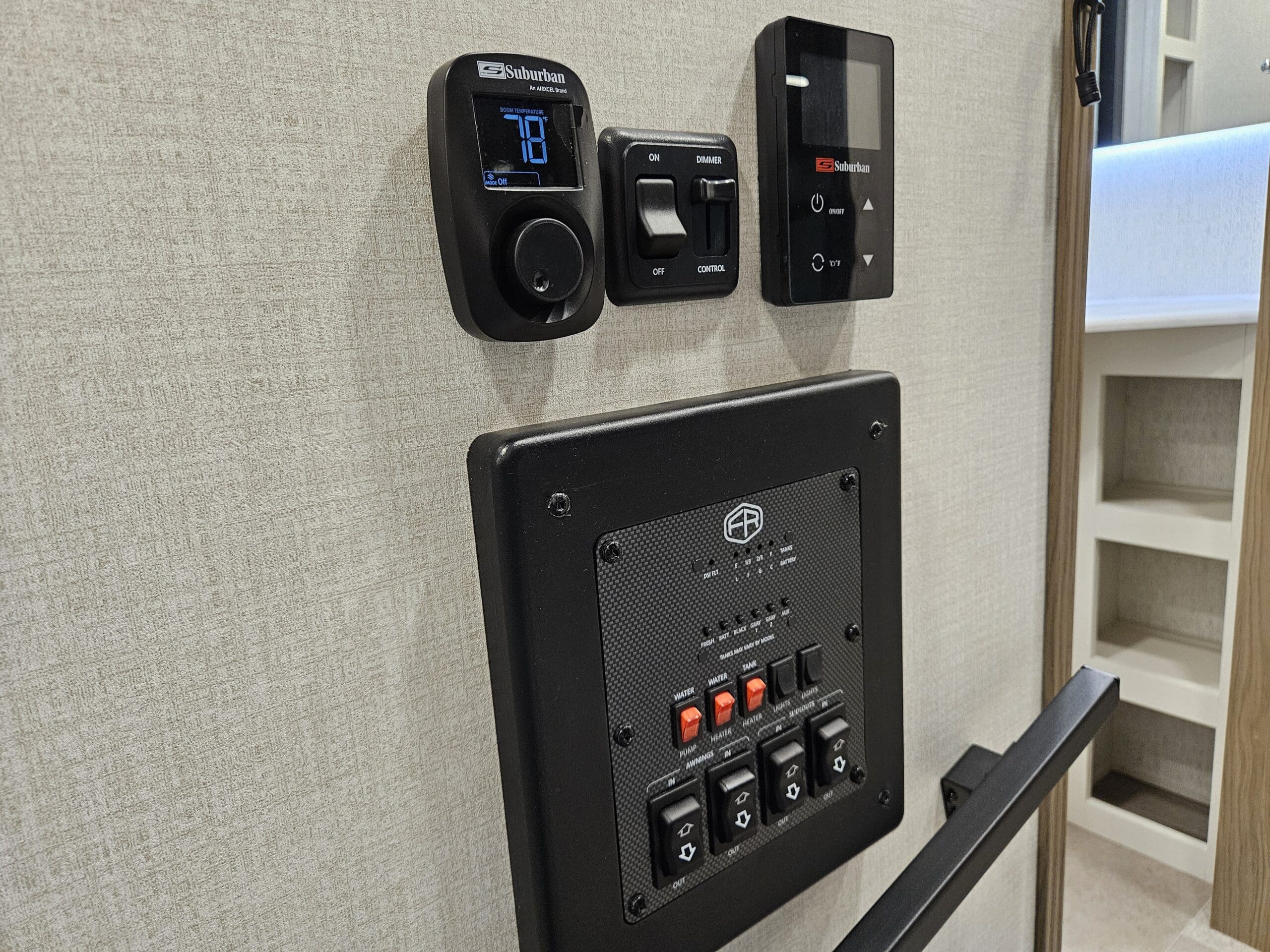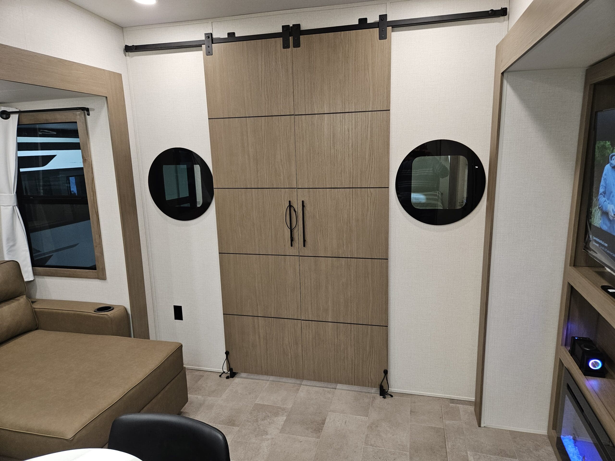 Living Area: Includes comfortable theater seating, a large LED TV, and an electric fireplace/space heater. The living space is carpet-free for easy cleaning.