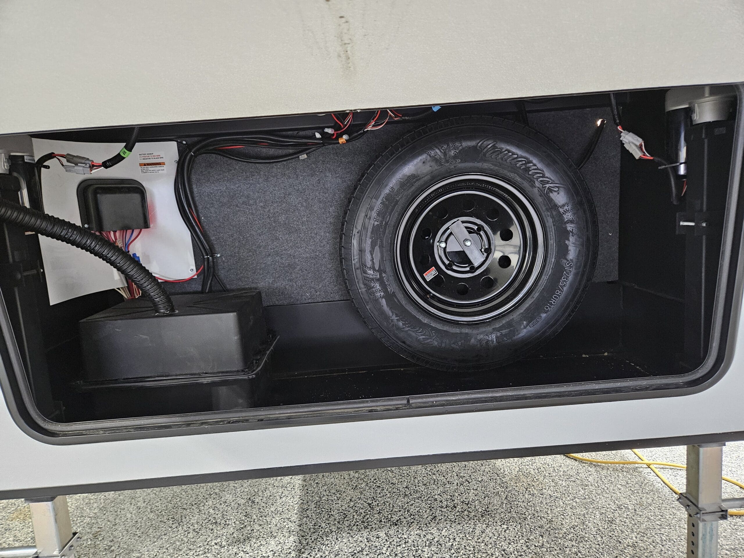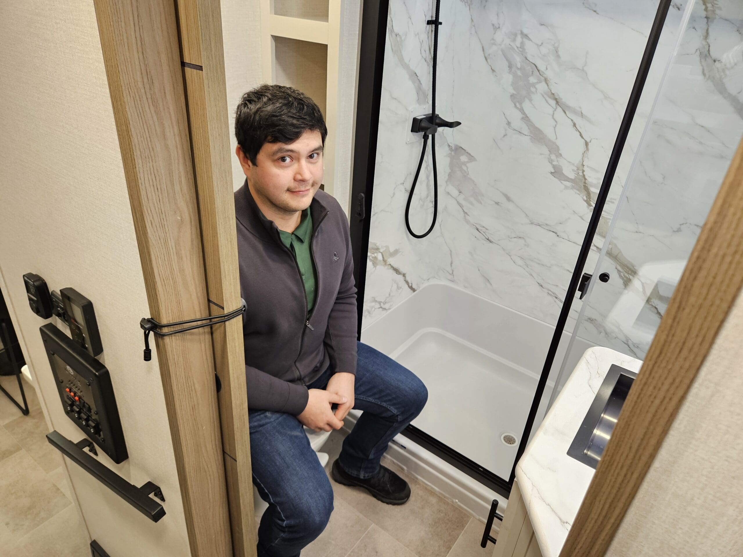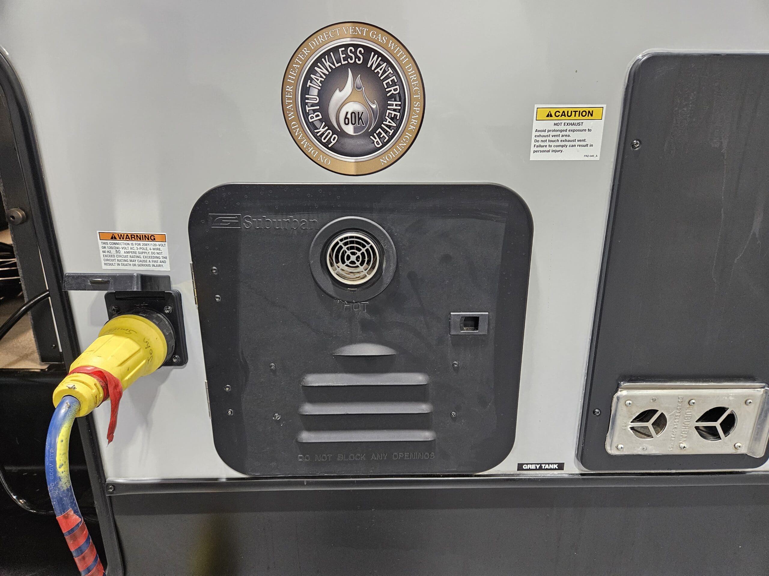 Living Area: Includes comfortable theater seating, a large LED TV, and an electric fireplace/space heater. The living space is carpet-free for easy cleaning.