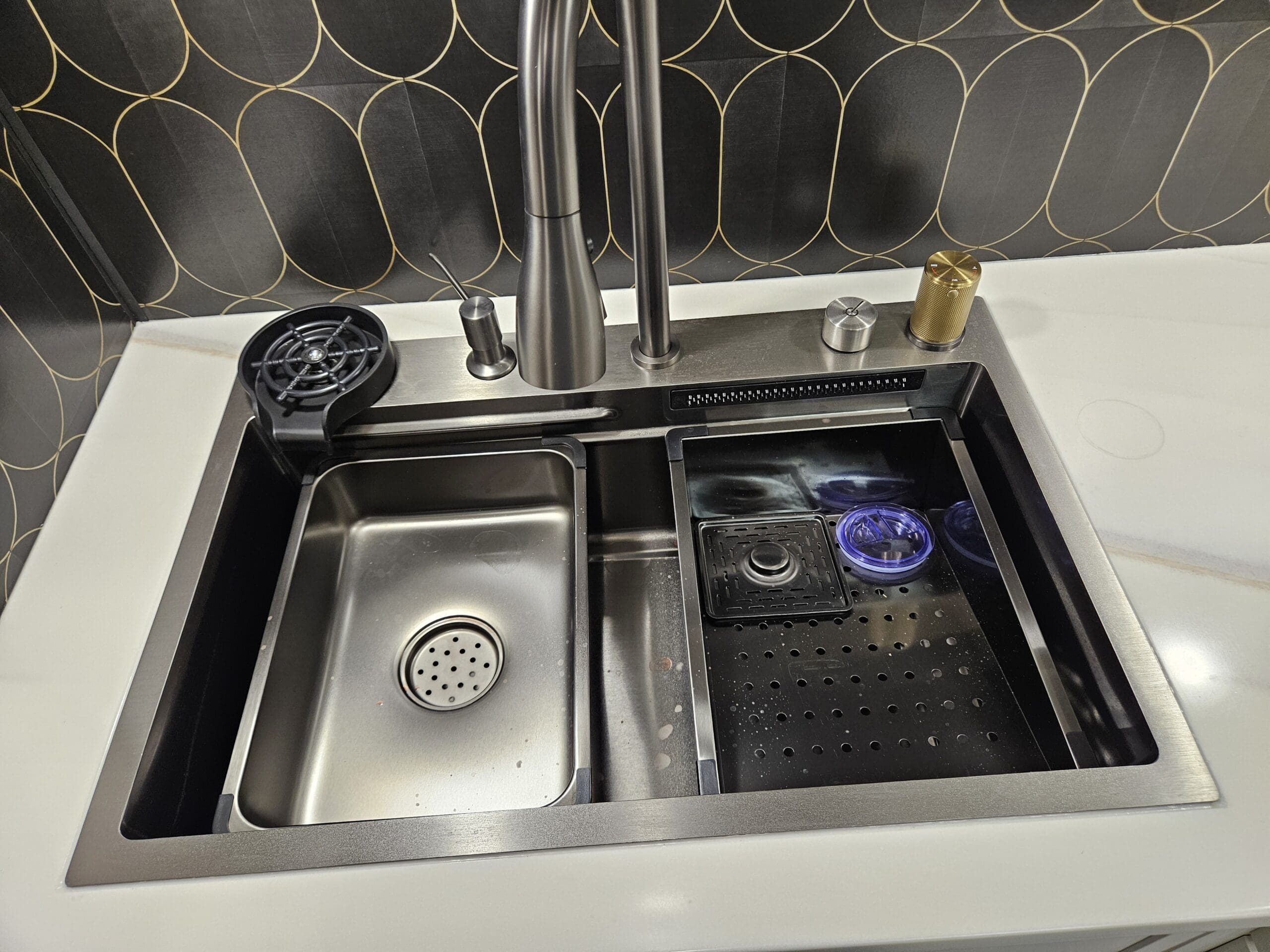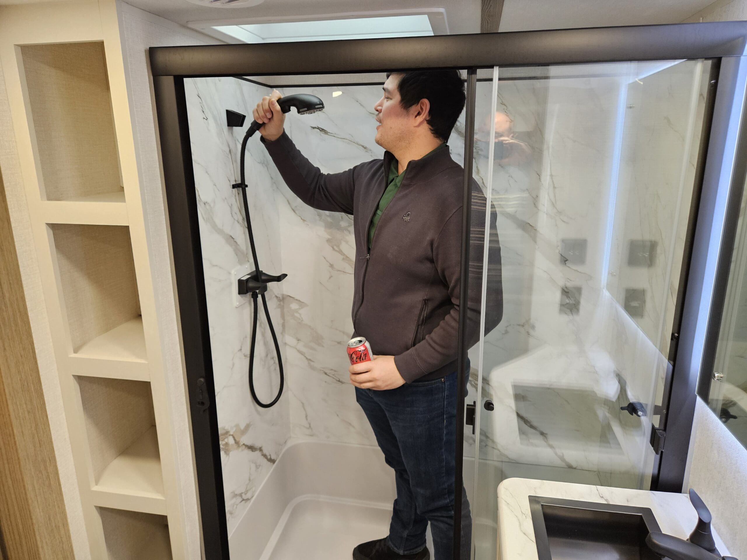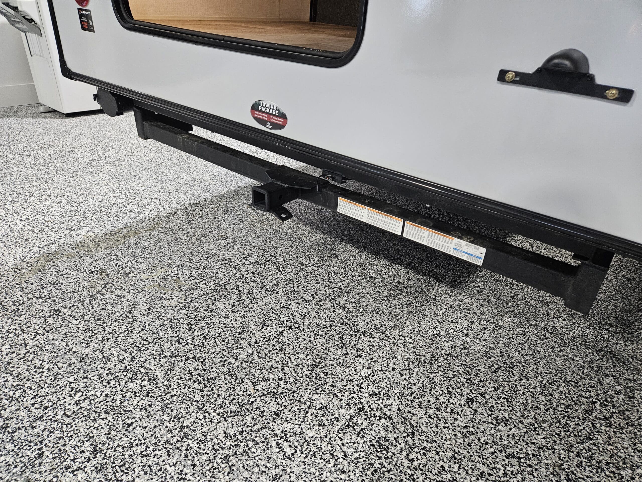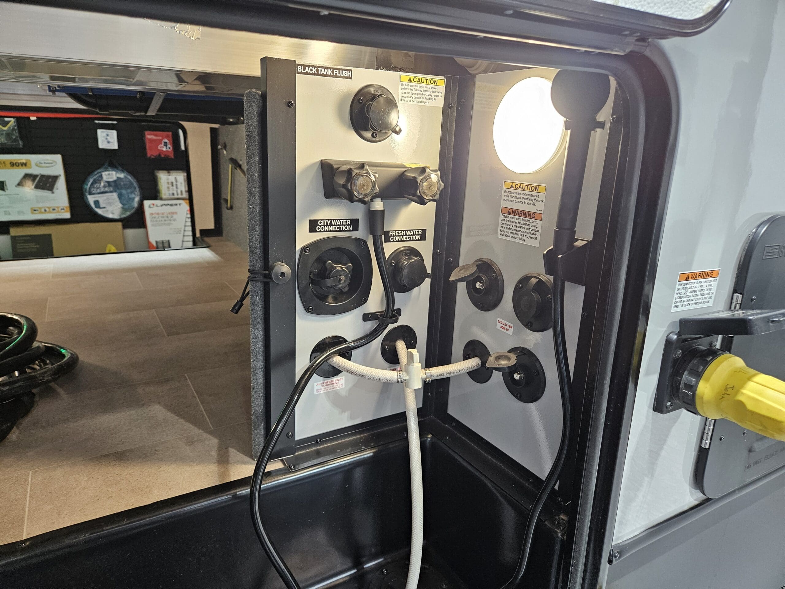 Living Area: Includes comfortable theater seating, a large LED TV, and an electric fireplace/space heater. The living space is carpet-free for easy cleaning.