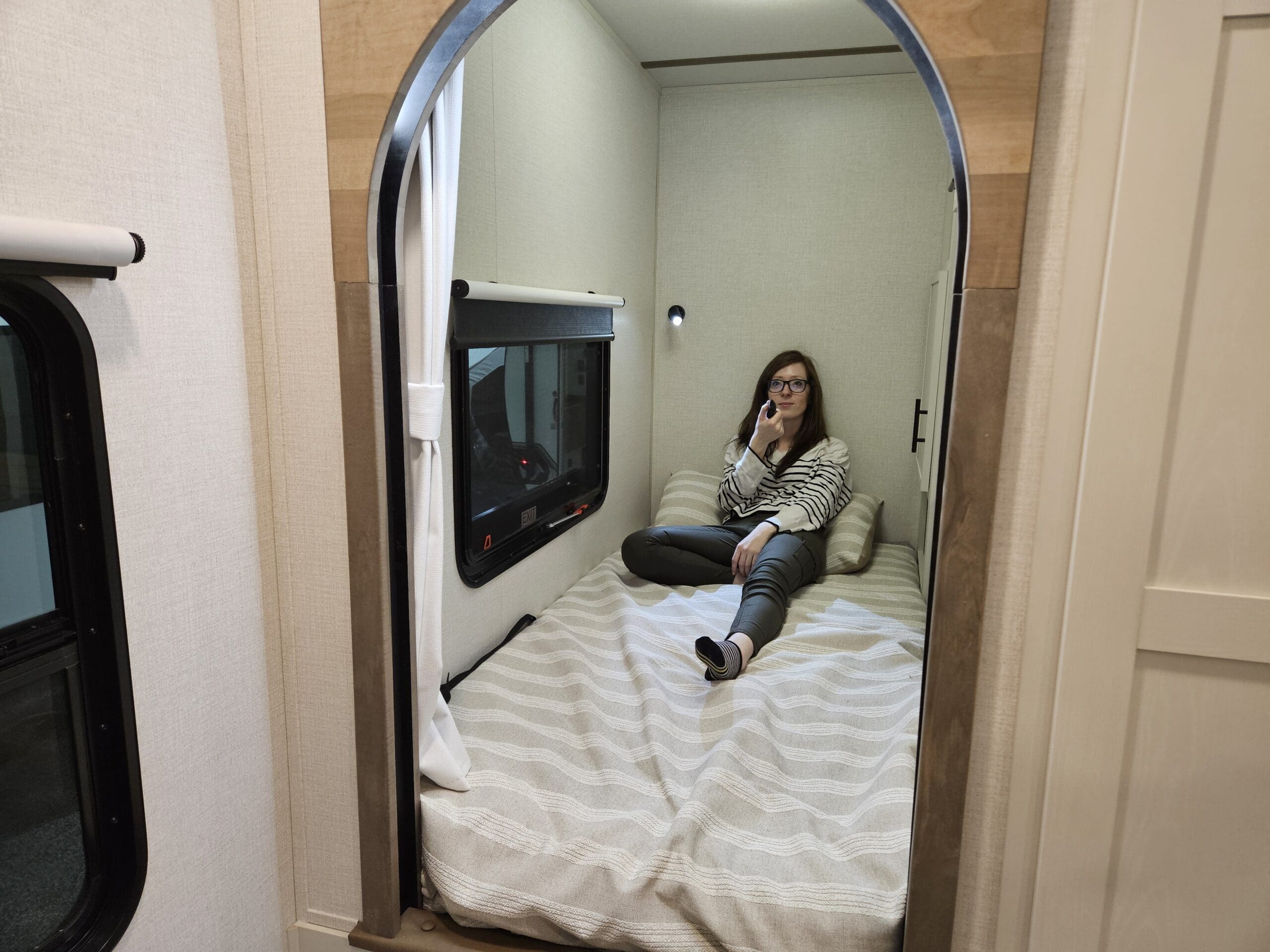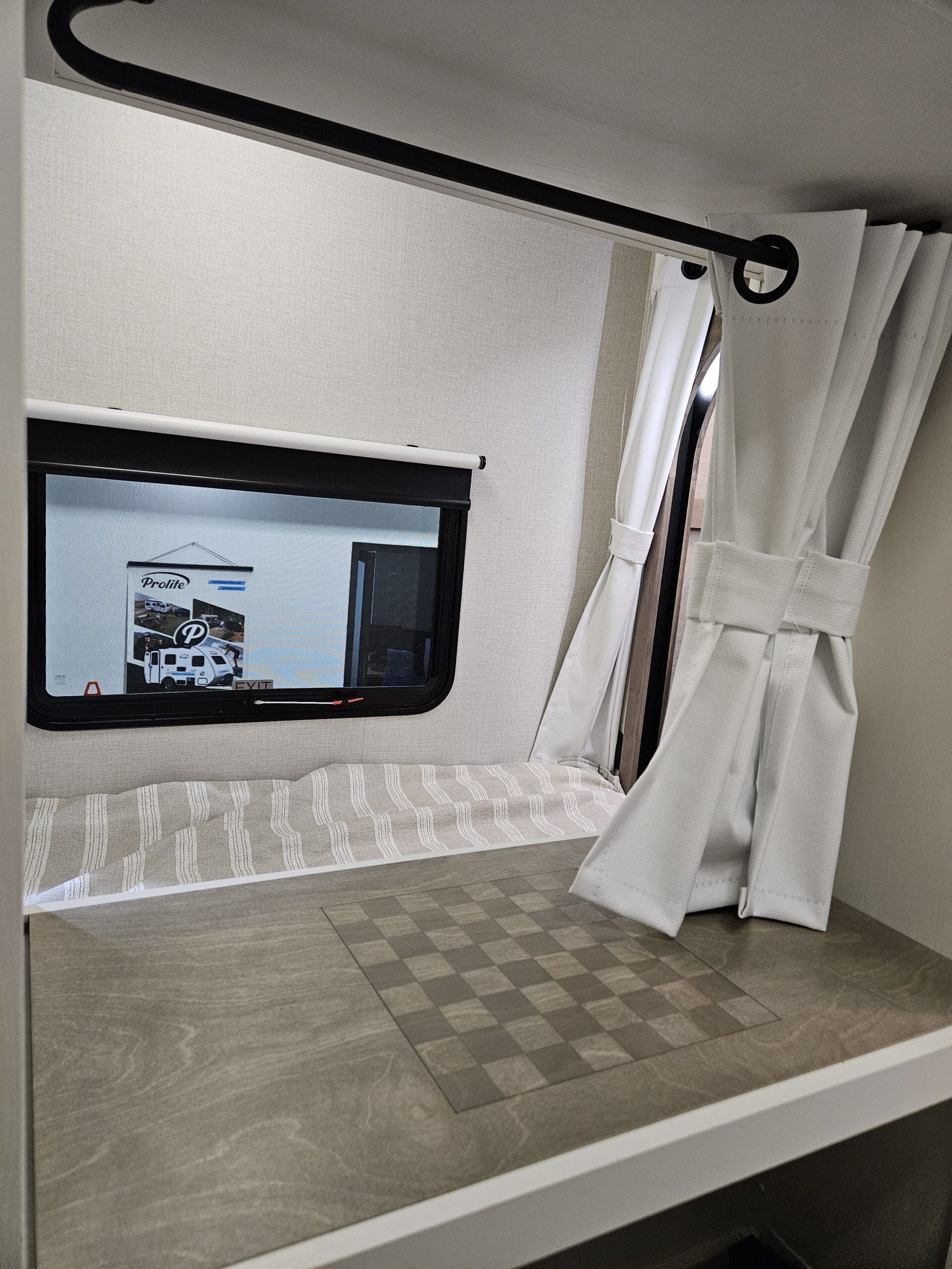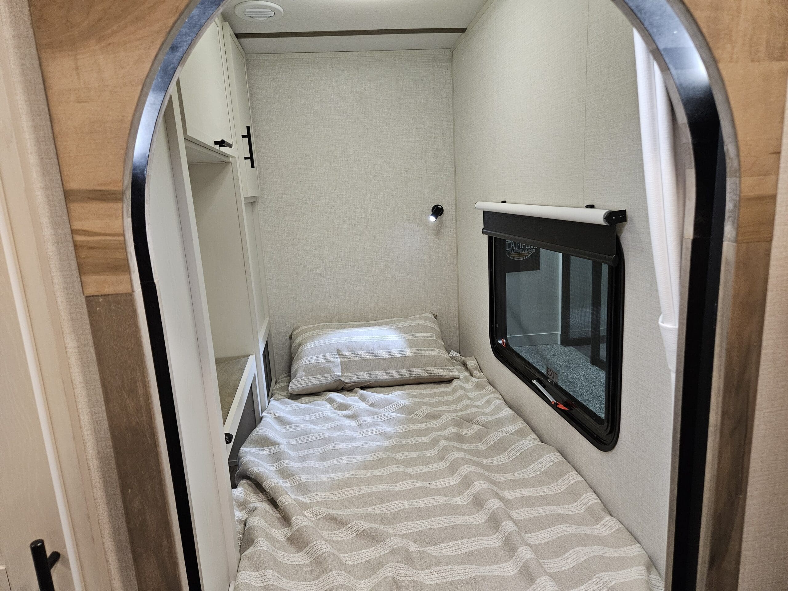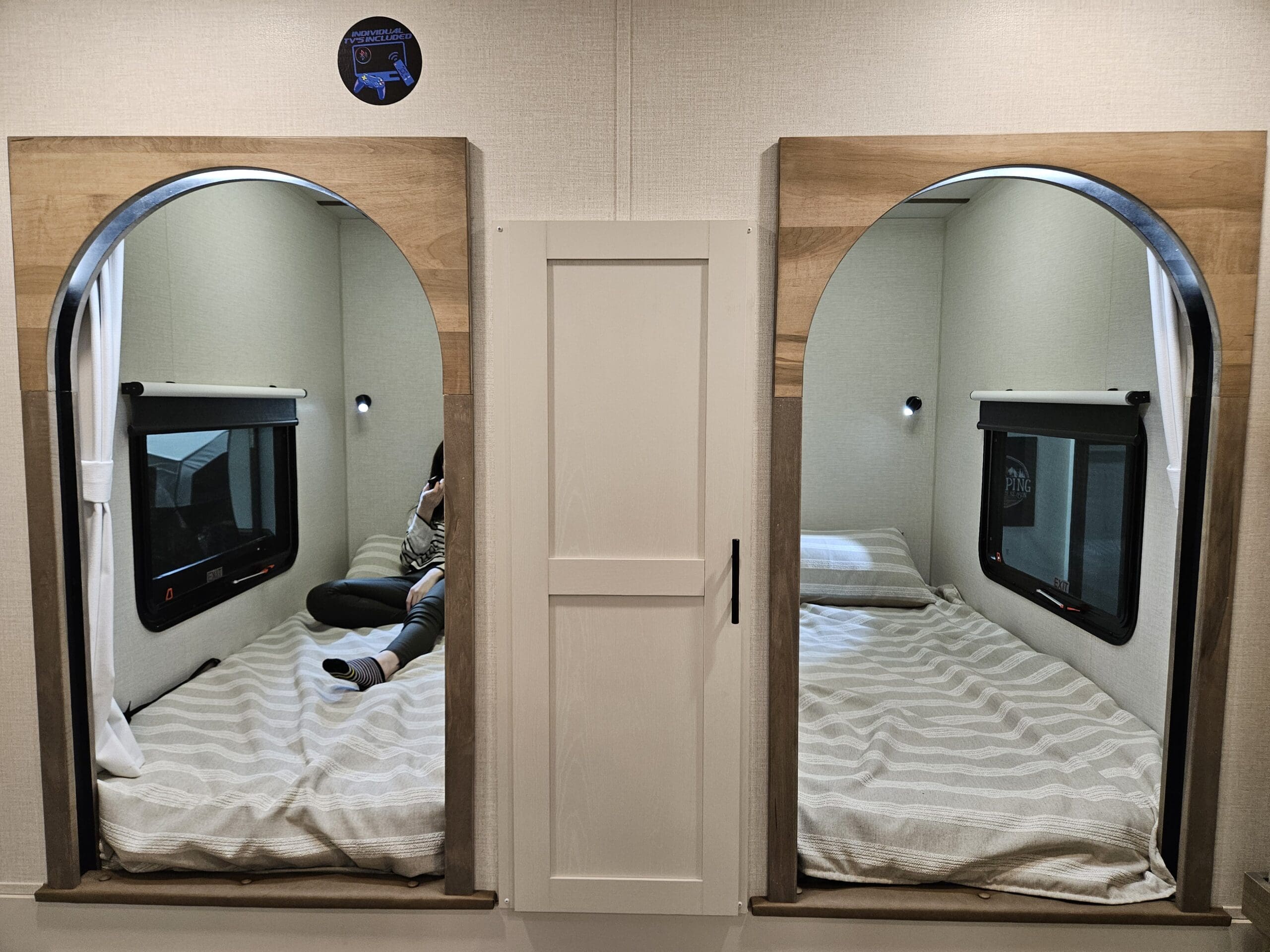 Secondary/Bunk Room (Rear): Designed for comfort and privacy, this room features two 36″ x 74″ twin beds (or bunks) with individual curtains for privacy, storage drawers, and doors for separation.