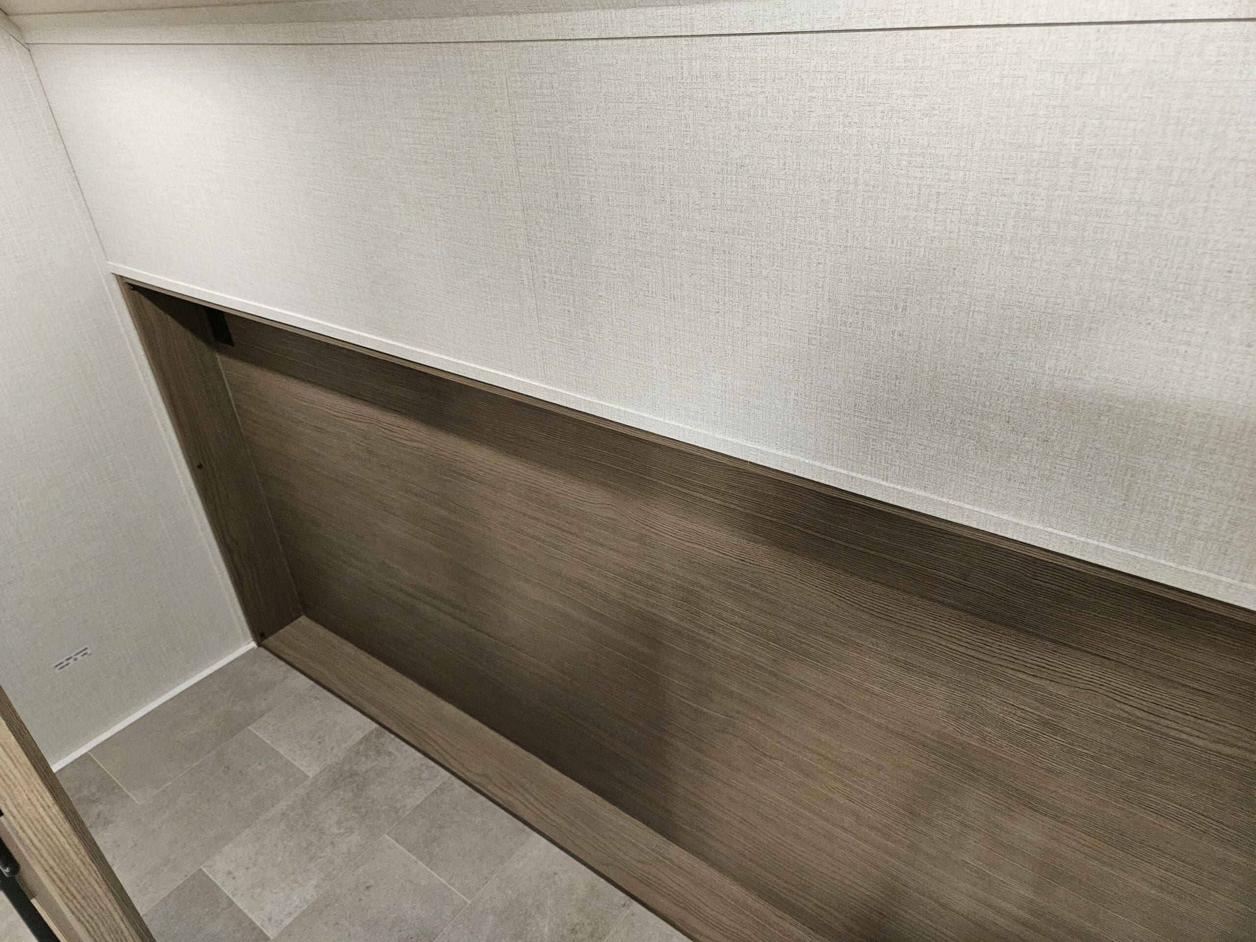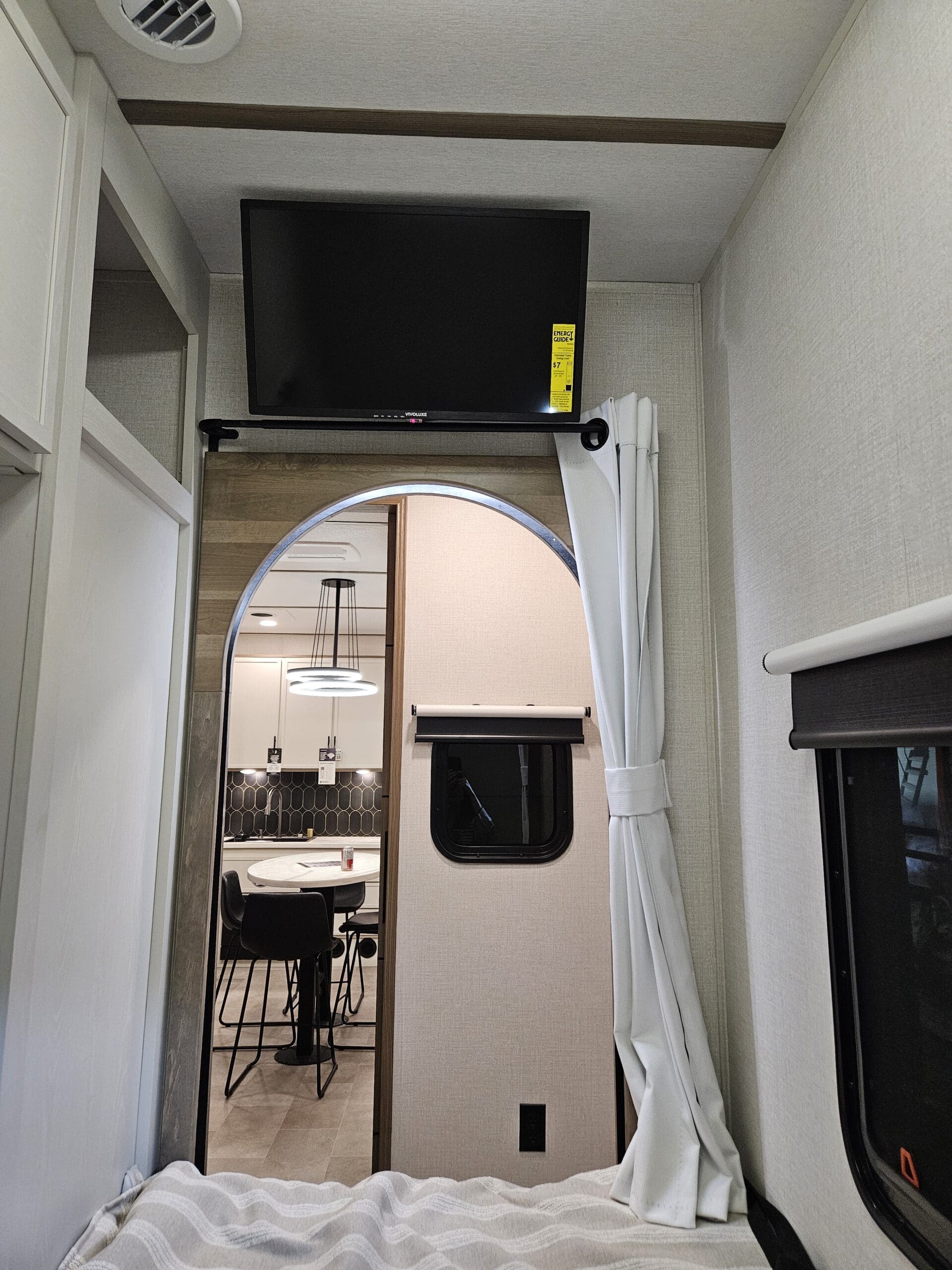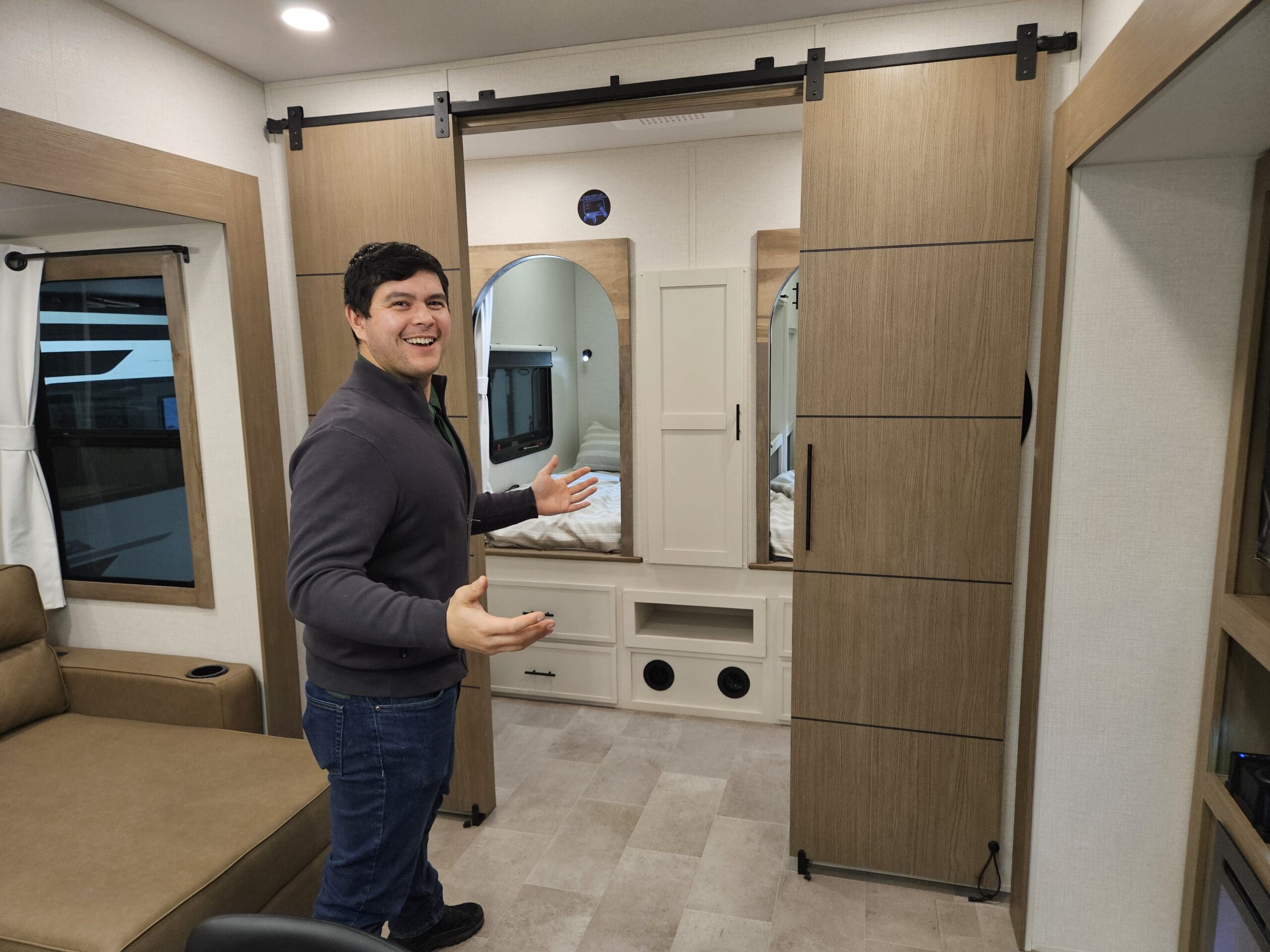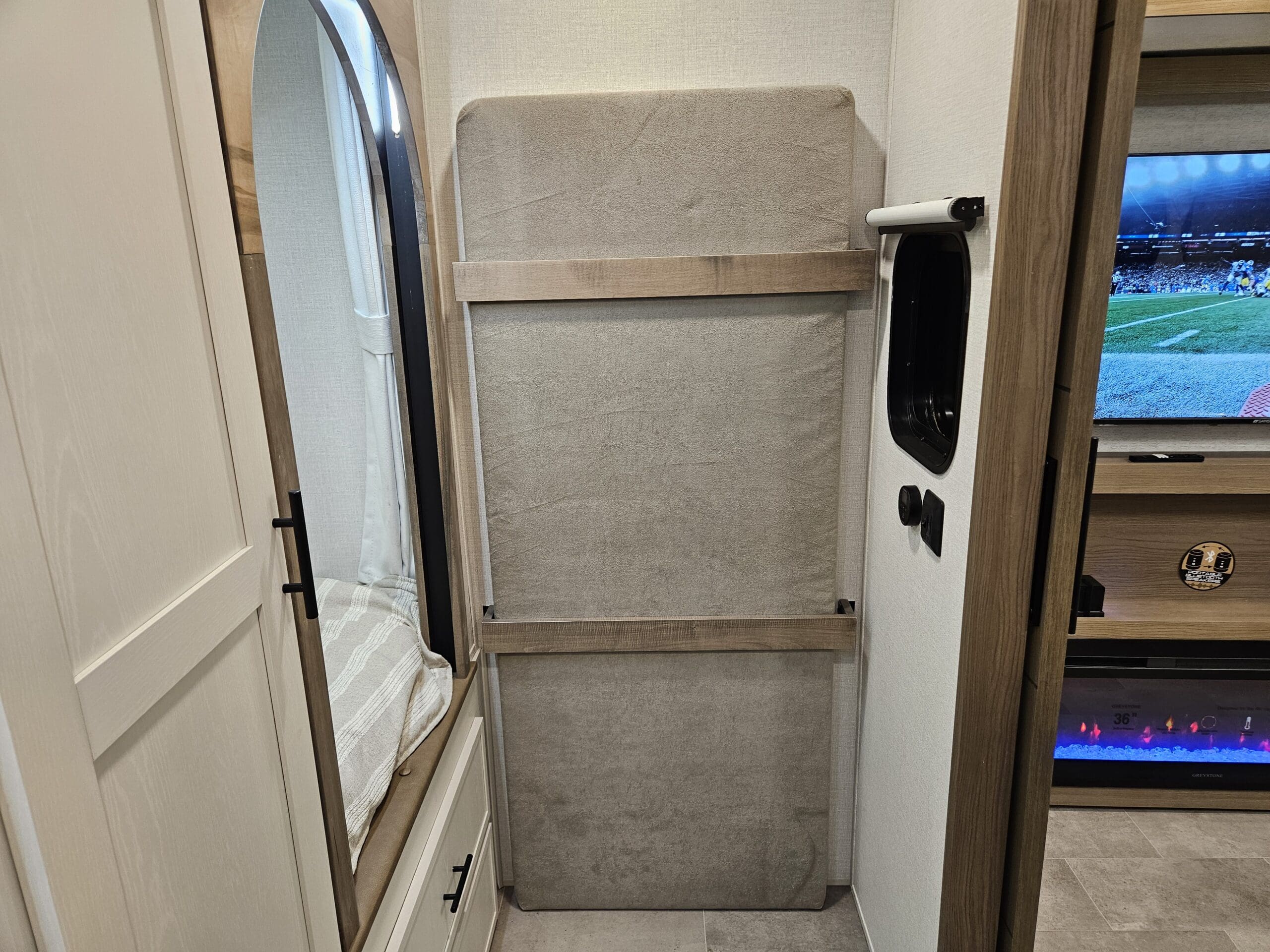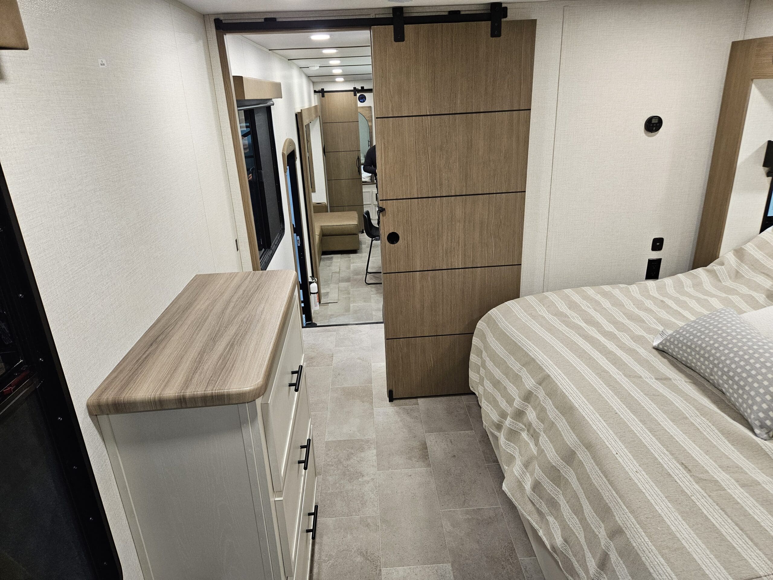 Secondary/Bunk Room (Rear): Designed for comfort and privacy, this room features two 36″ x 74″ twin beds (or bunks) with individual curtains for privacy, storage drawers, and doors for separation.