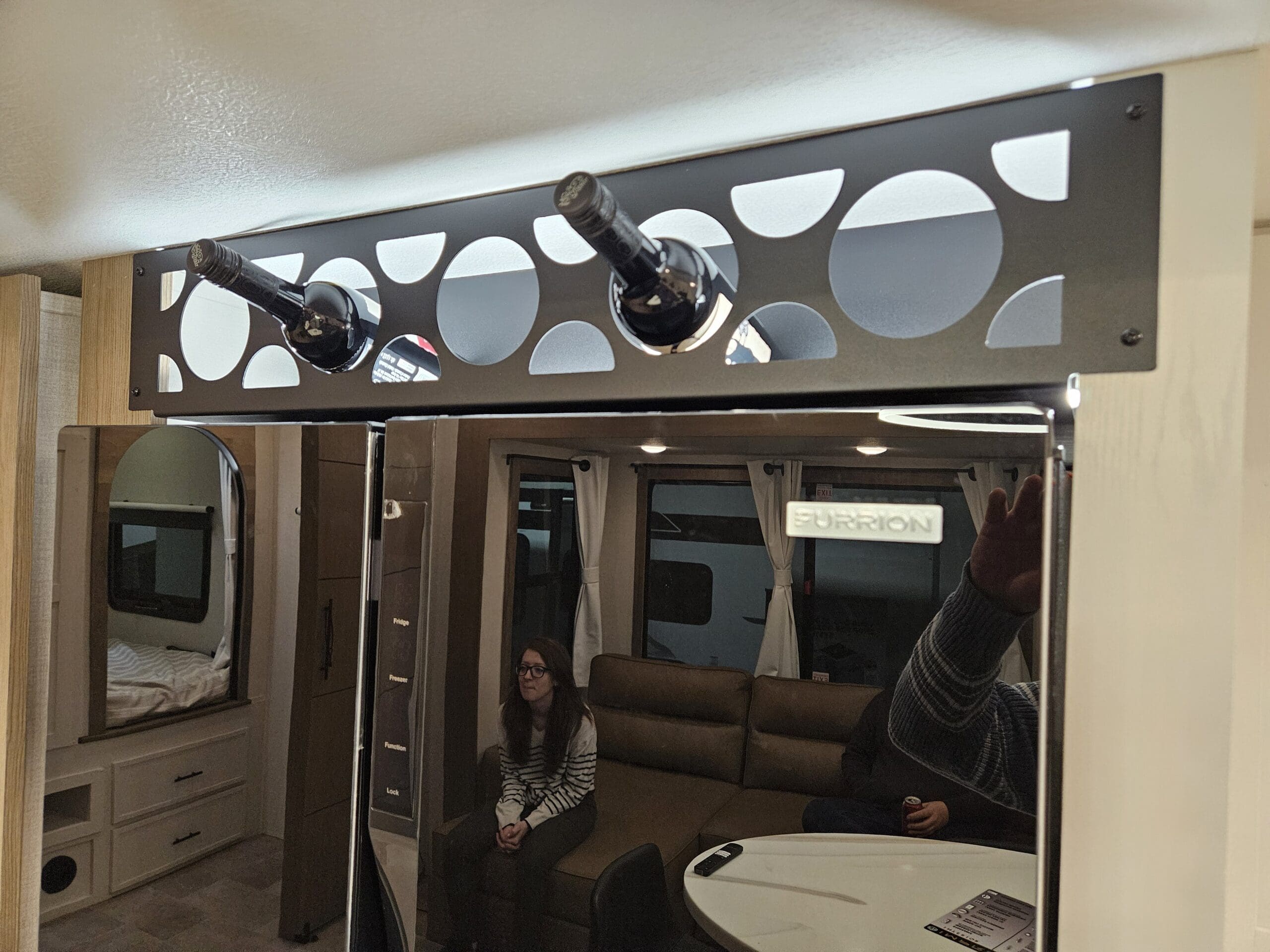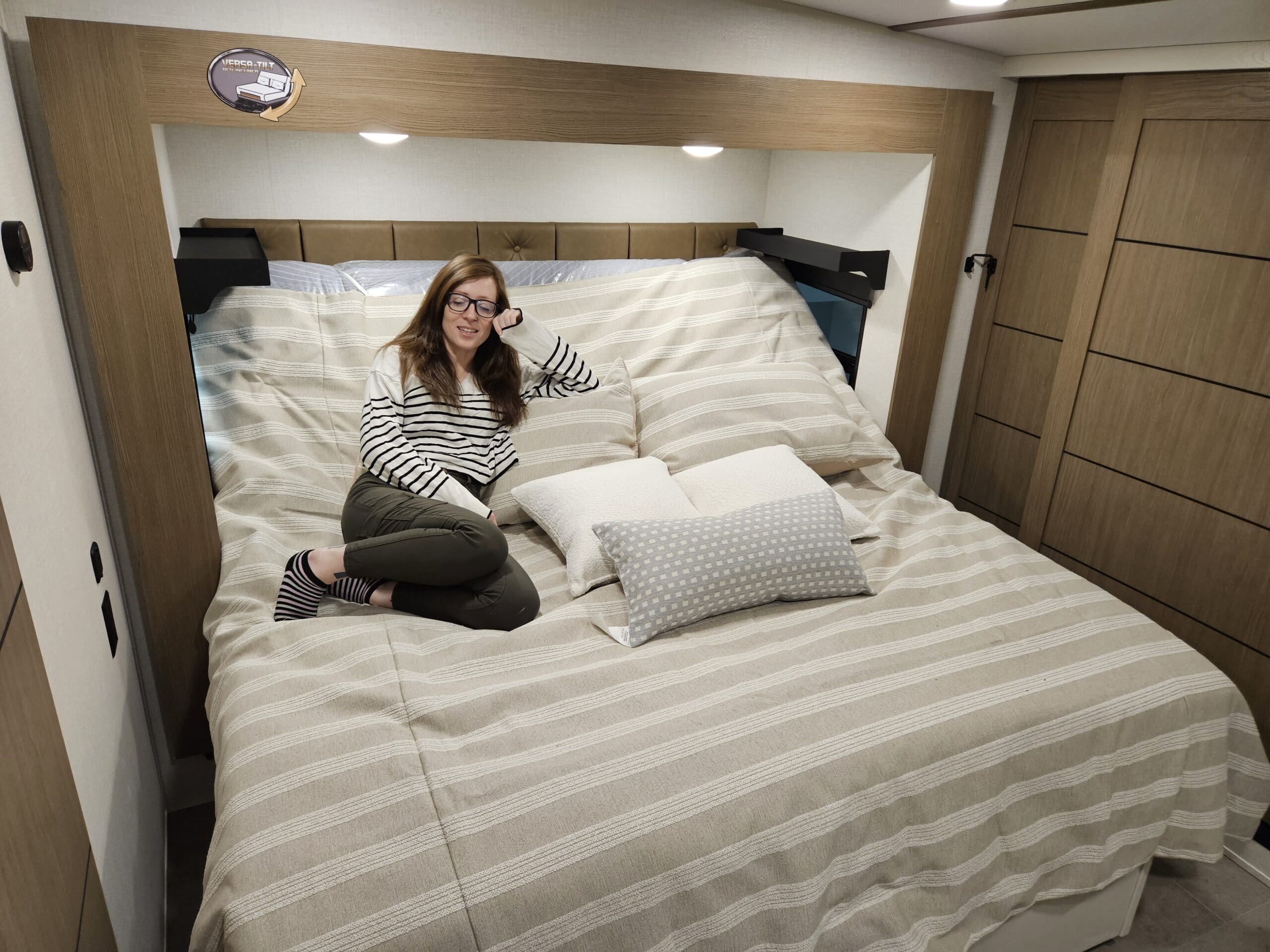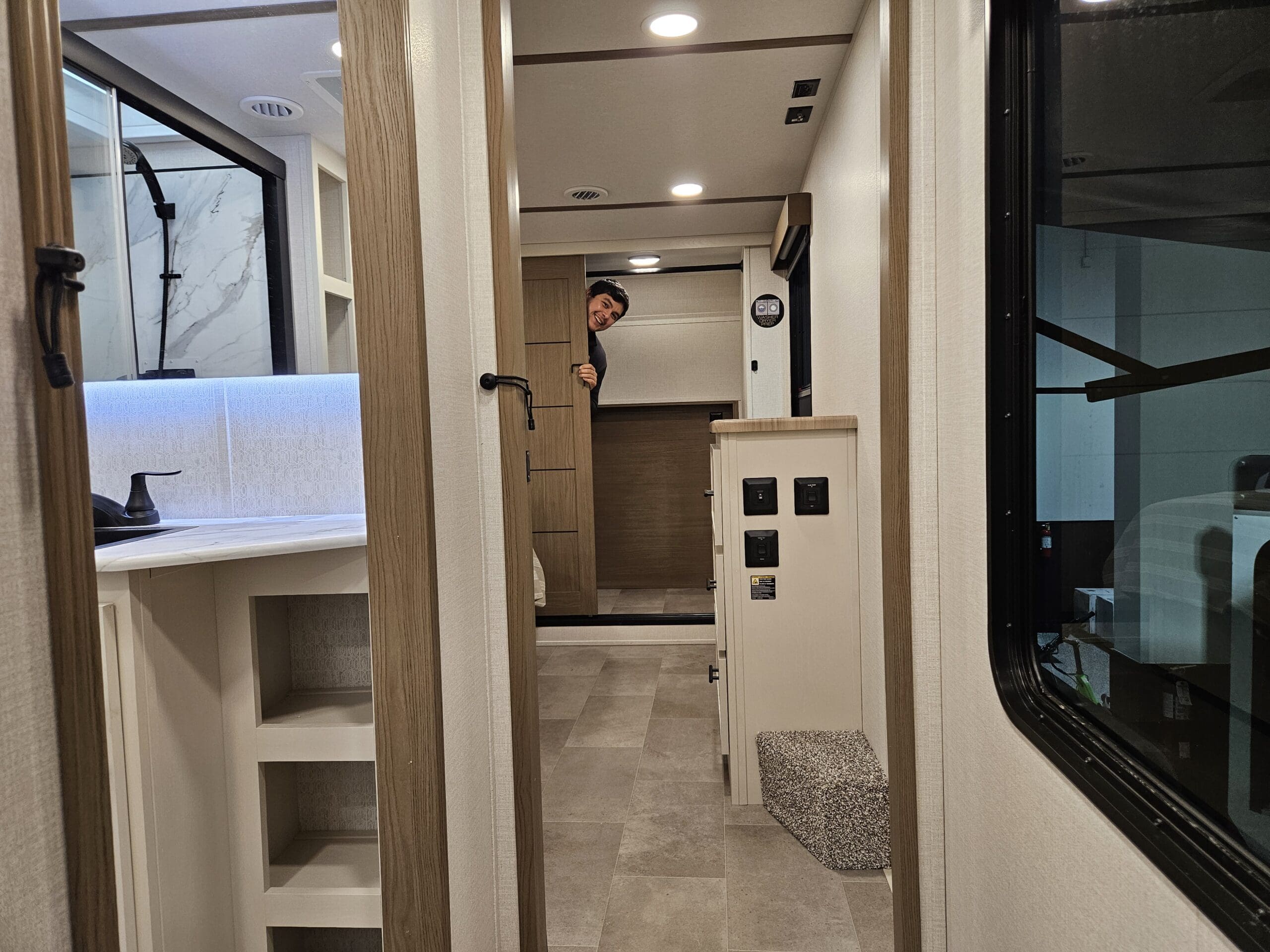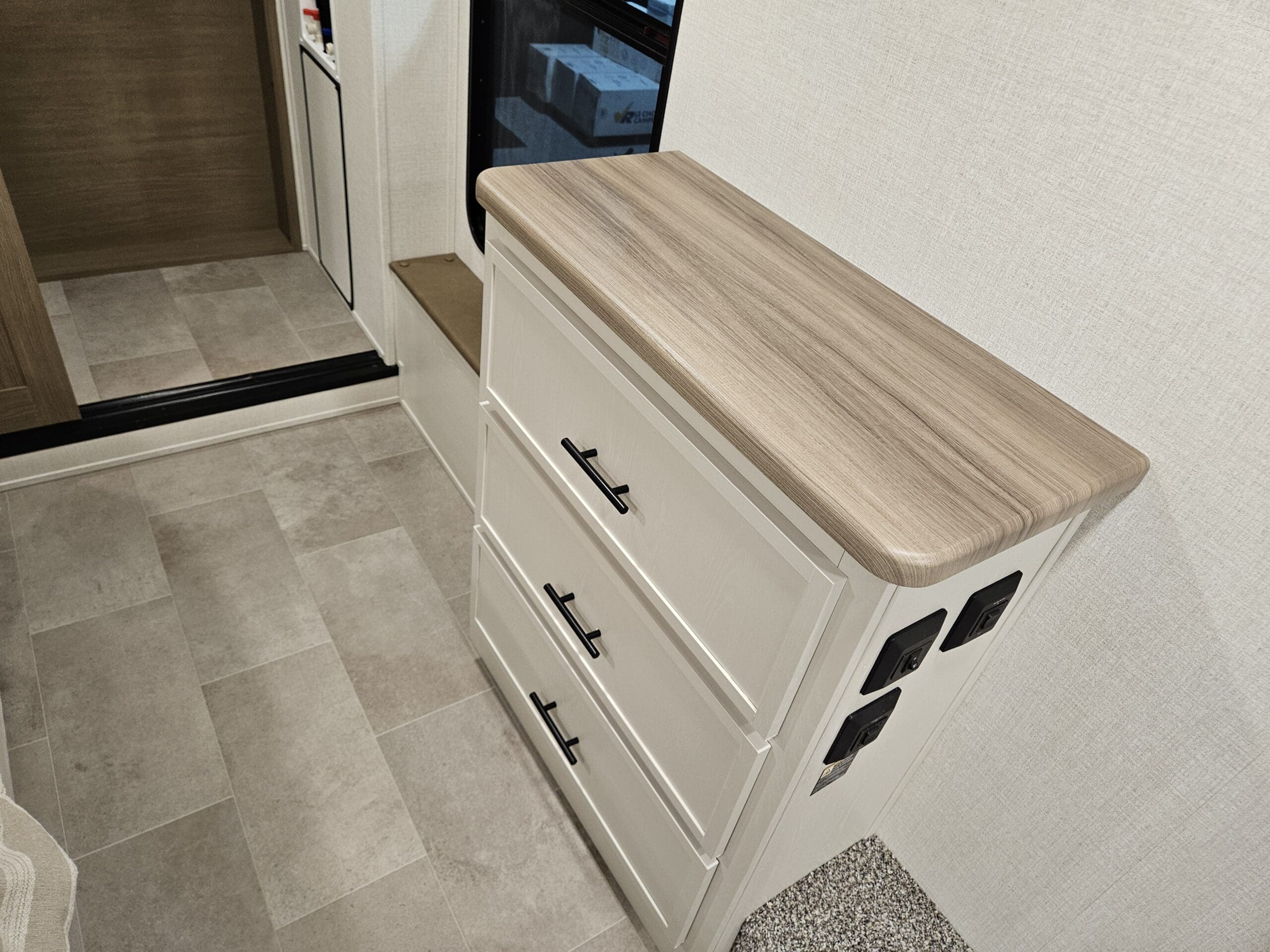 Secondary/Bunk Room (Rear): Designed for comfort and privacy, this room features two 36″ x 74″ twin beds (or bunks) with individual curtains for privacy, storage drawers, and doors for separation.