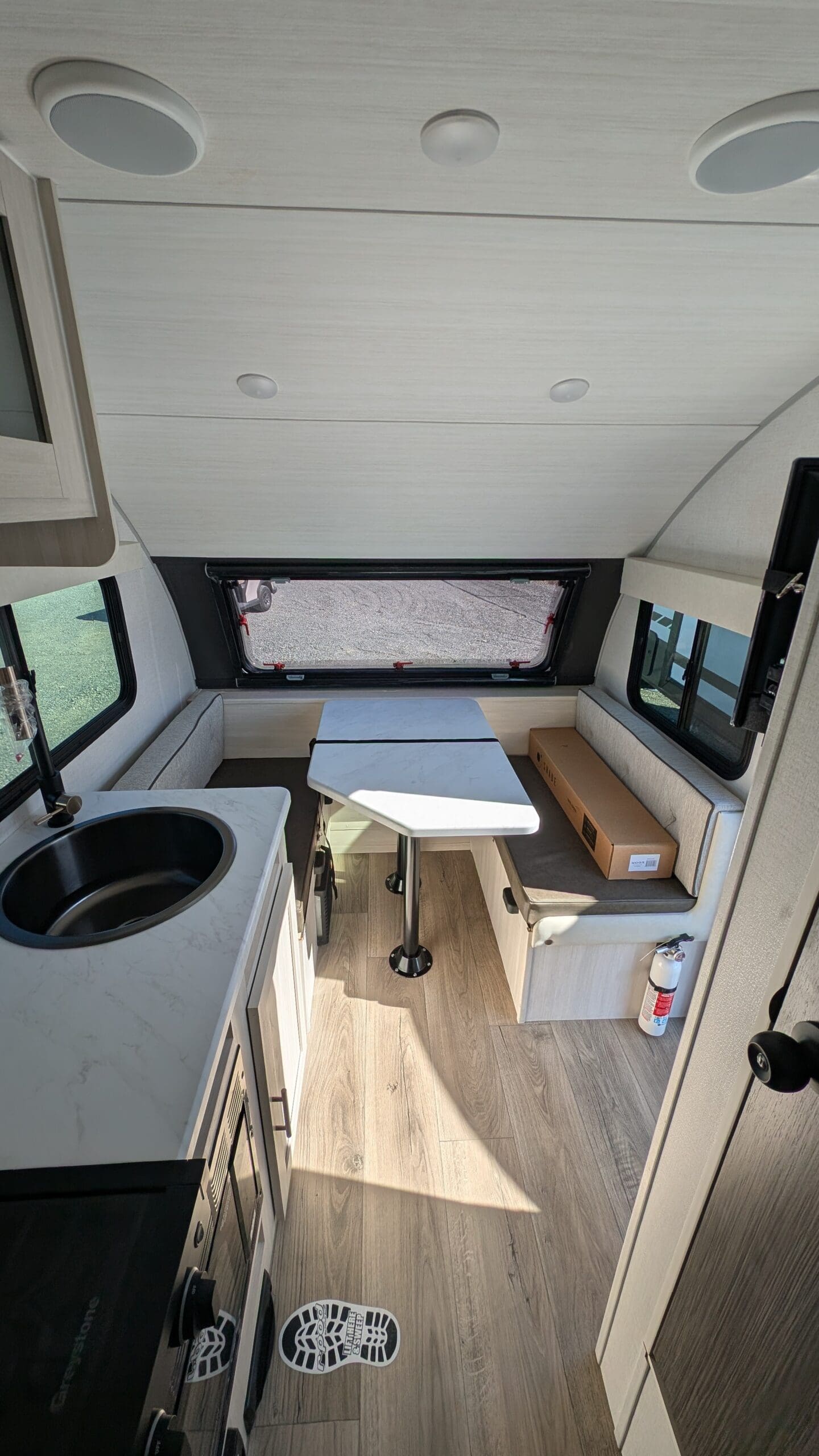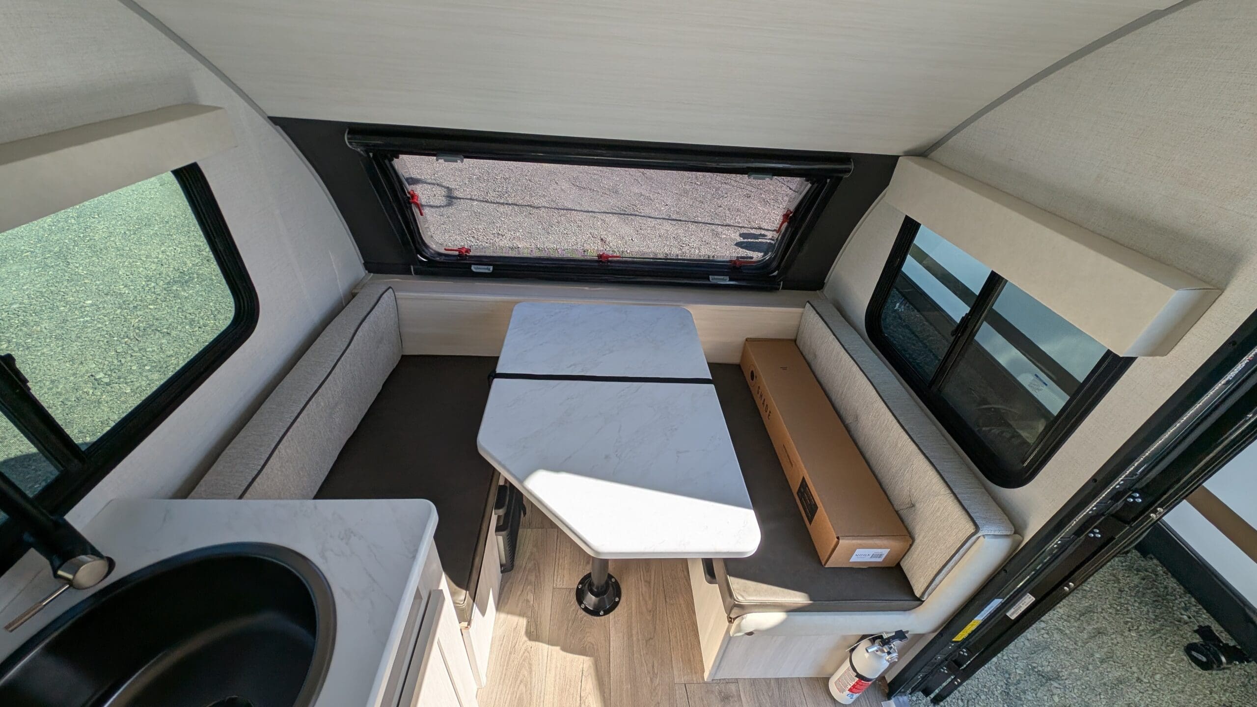 Front: A spacious Booth Dinette sits under the iconic R-Pod curved front window. This dinette also converts into a secondary sleeping area.