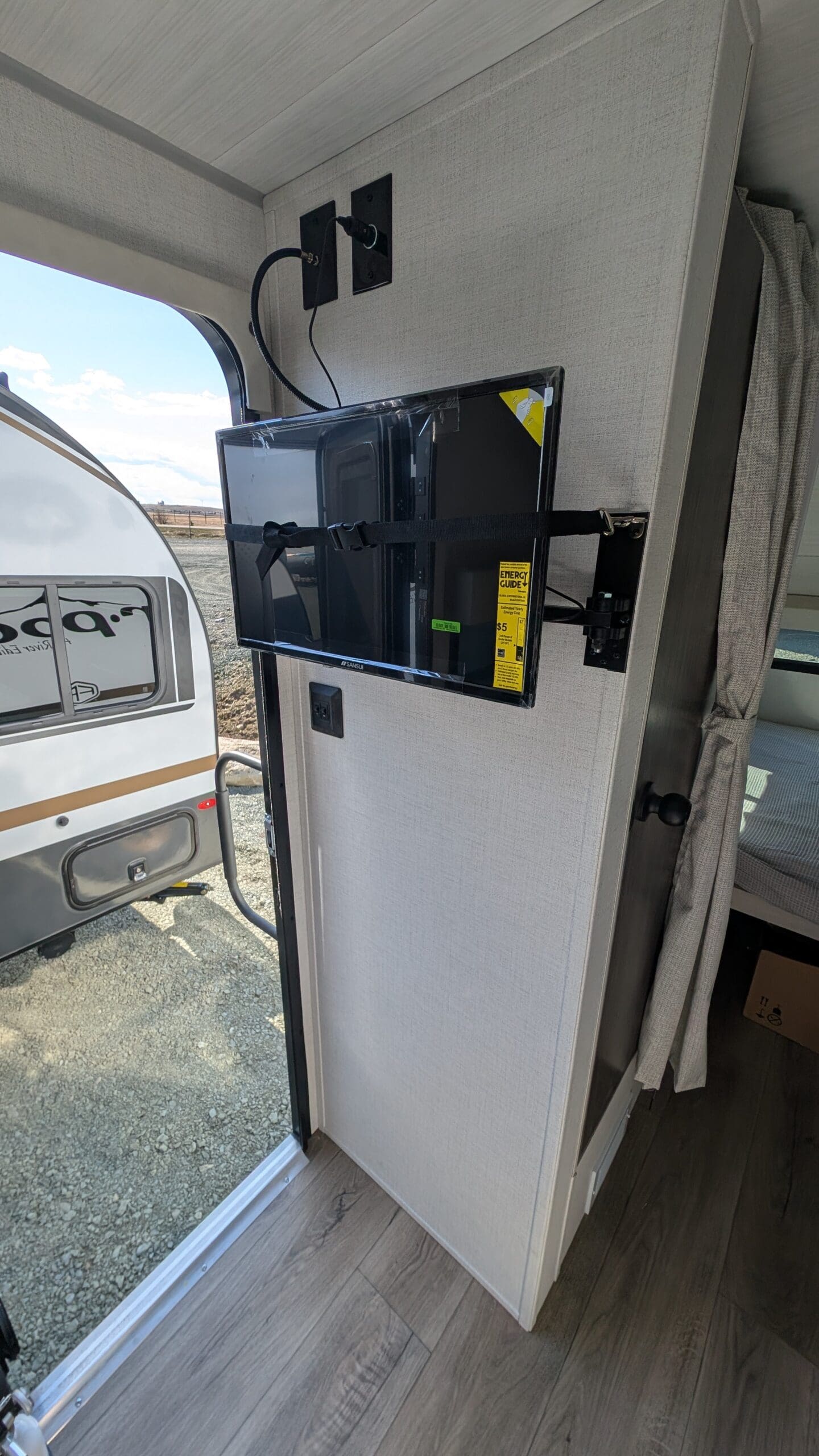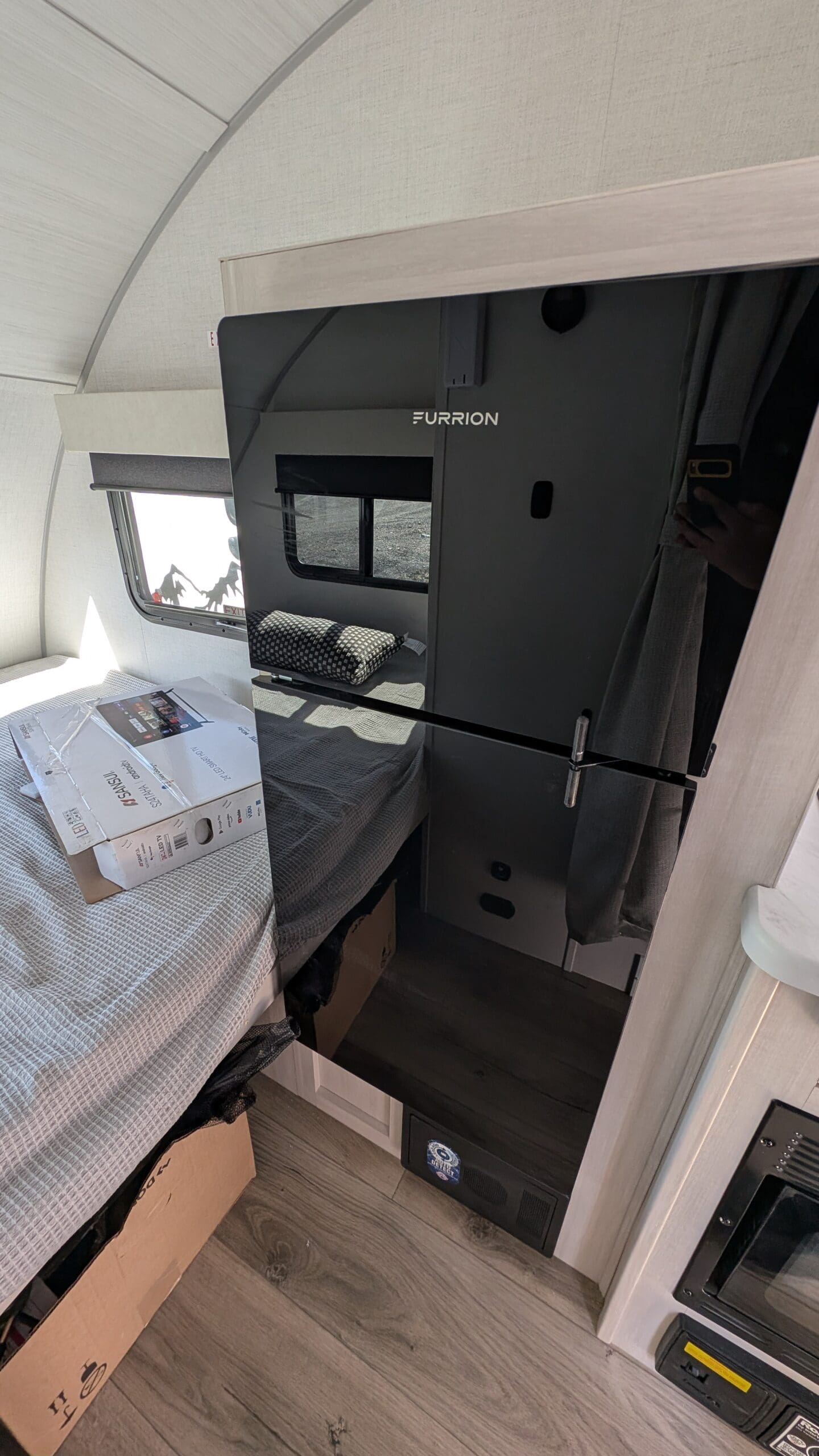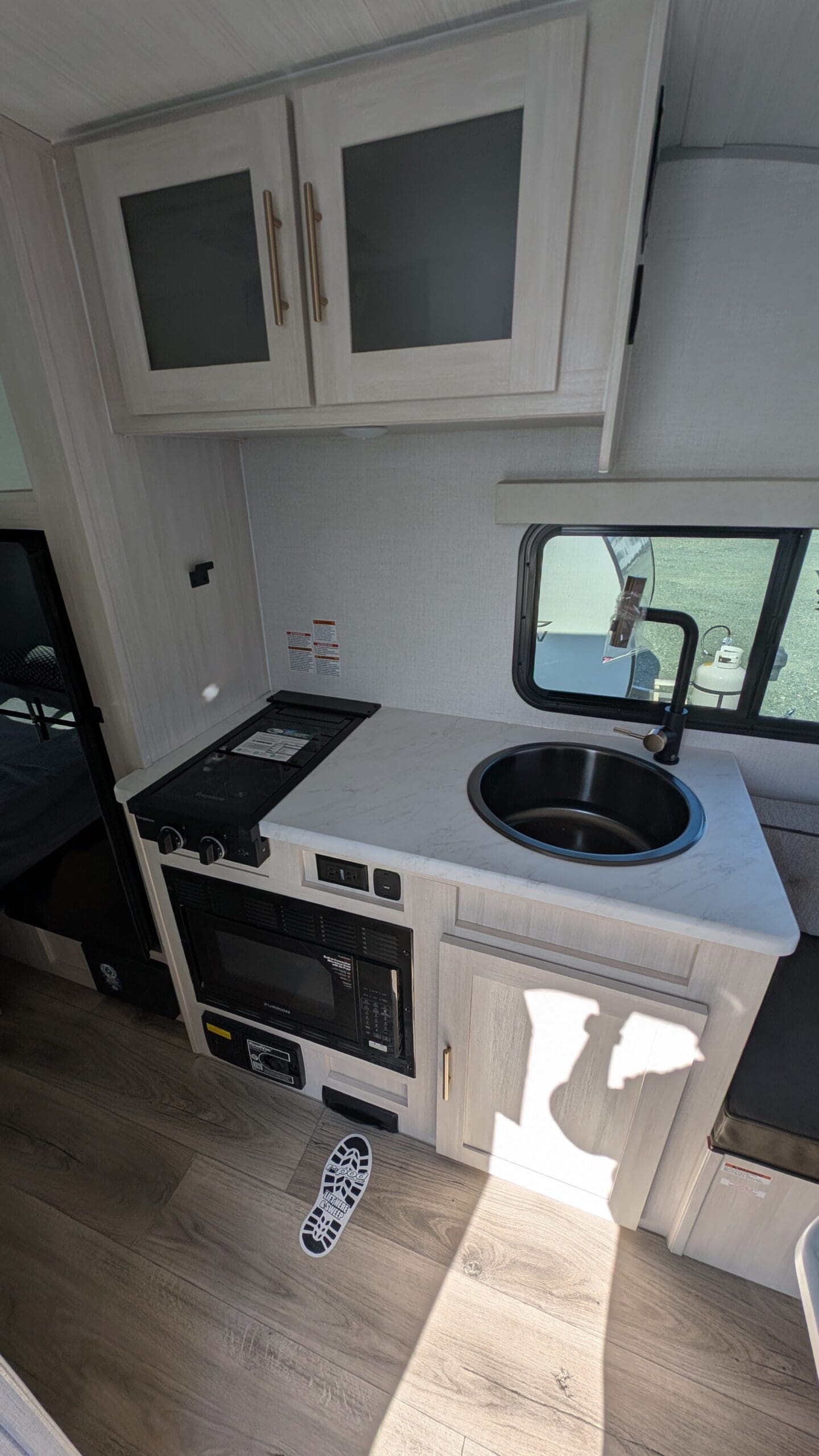 Appliances: Features a 12V Black Glass Refrigerator (which stays colder during travel than propane models) and a high-efficiency Air Fryer Microwave.