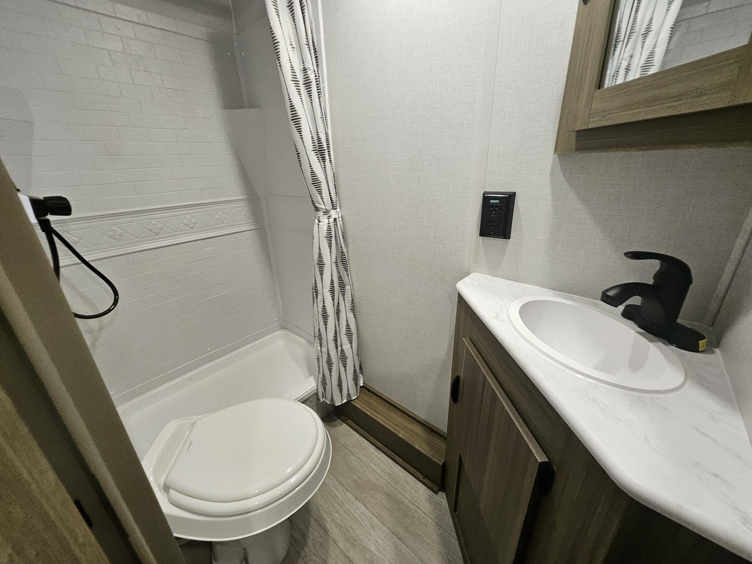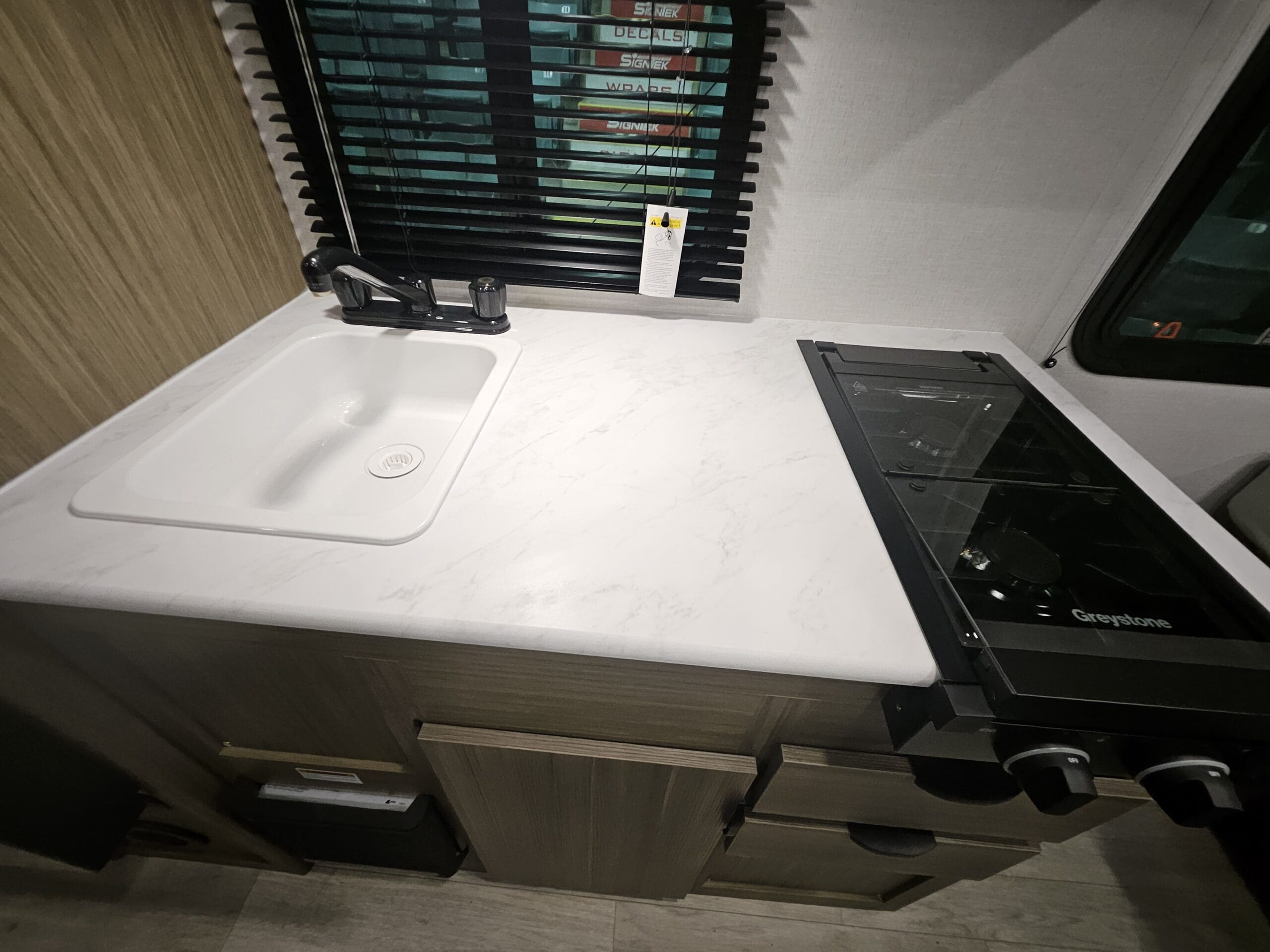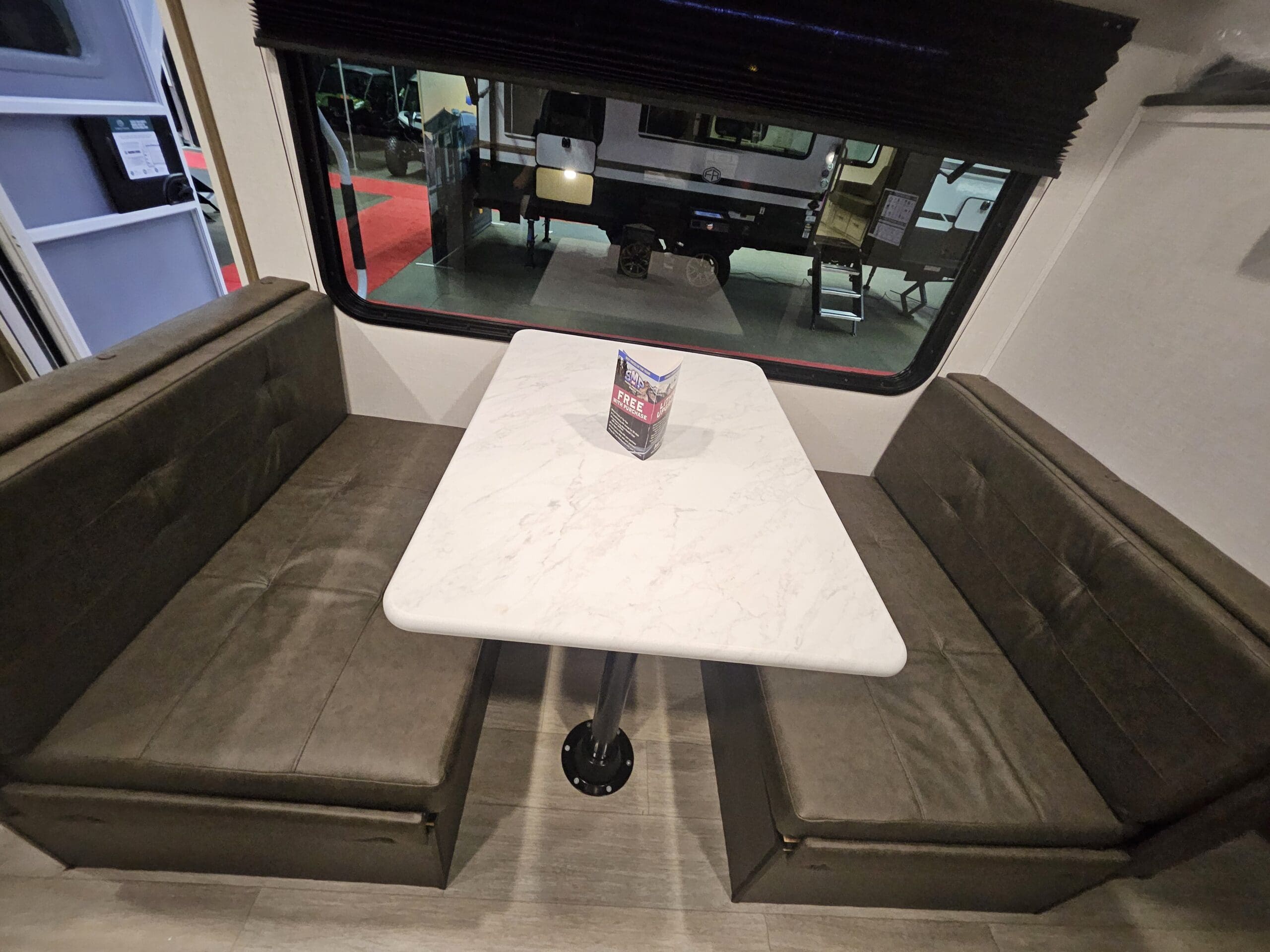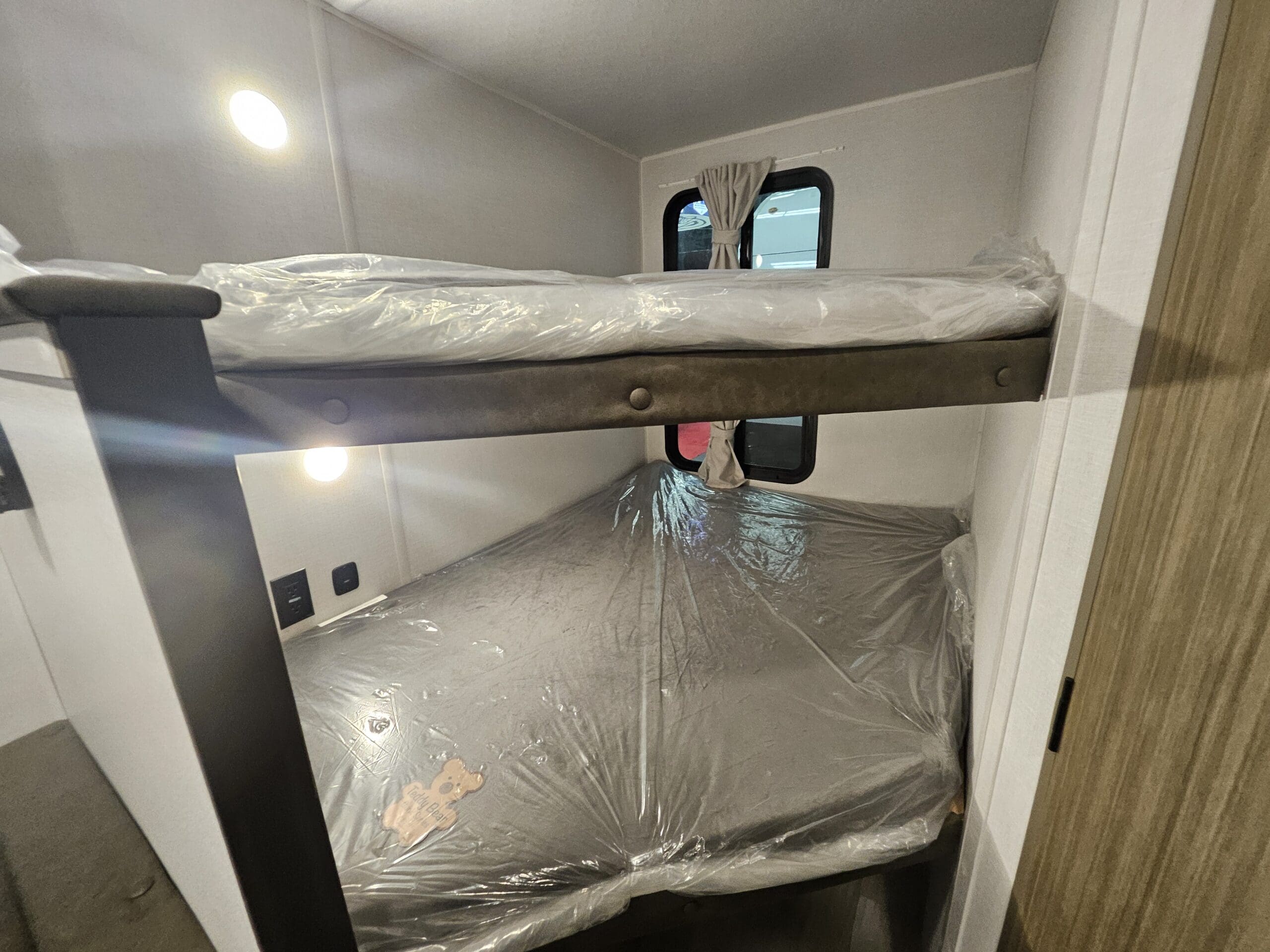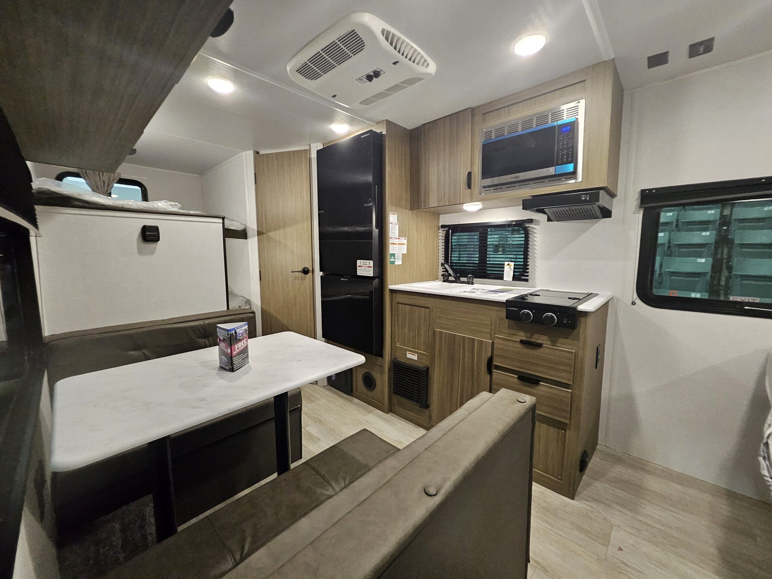 The 179DBK is packed with features and weighs in at less than 4,000 lb. The unique front queen bed flips up to create additional seating space during the day. The kitchen provides a booth dinette, panoramic window, and modern appliances, while the rear bunkhouse gives you double over double bunks for additional flexibility and comfort.
