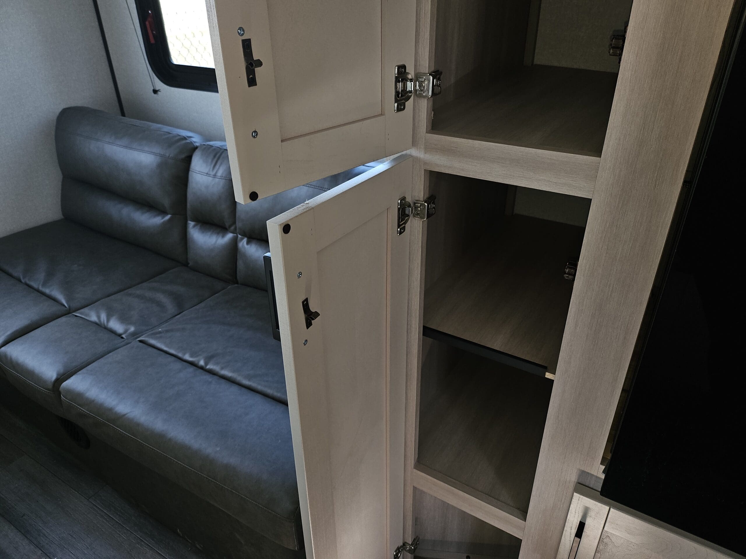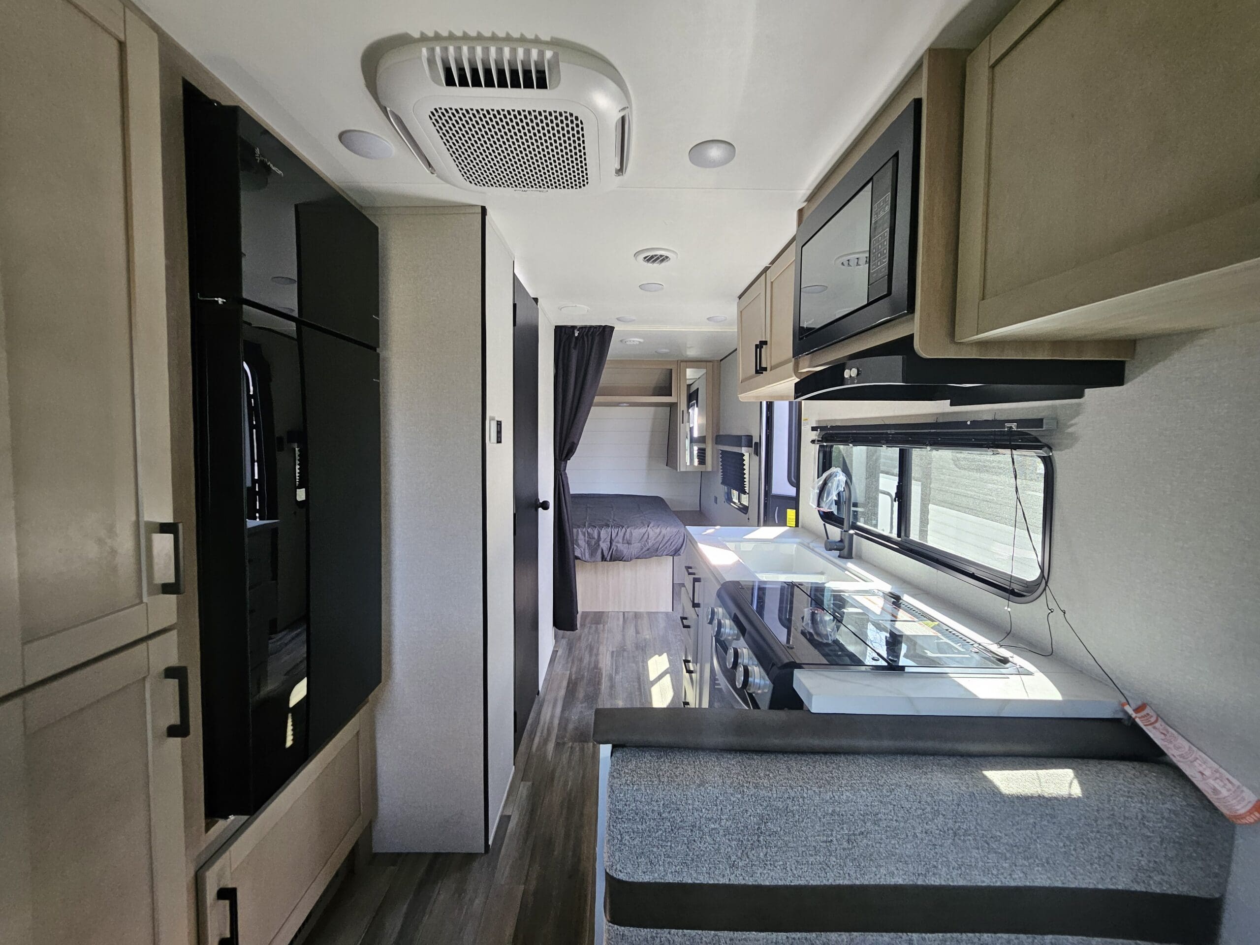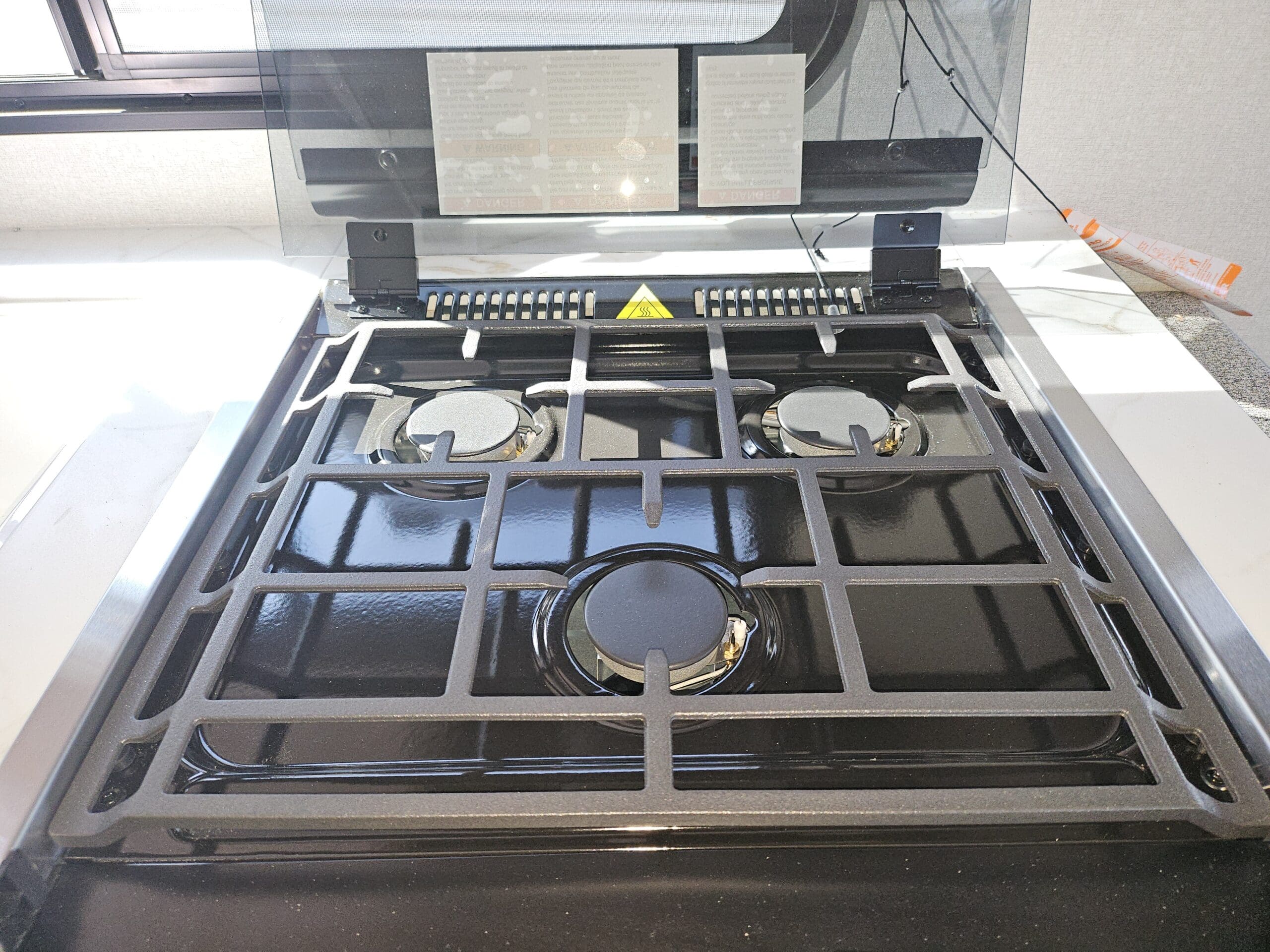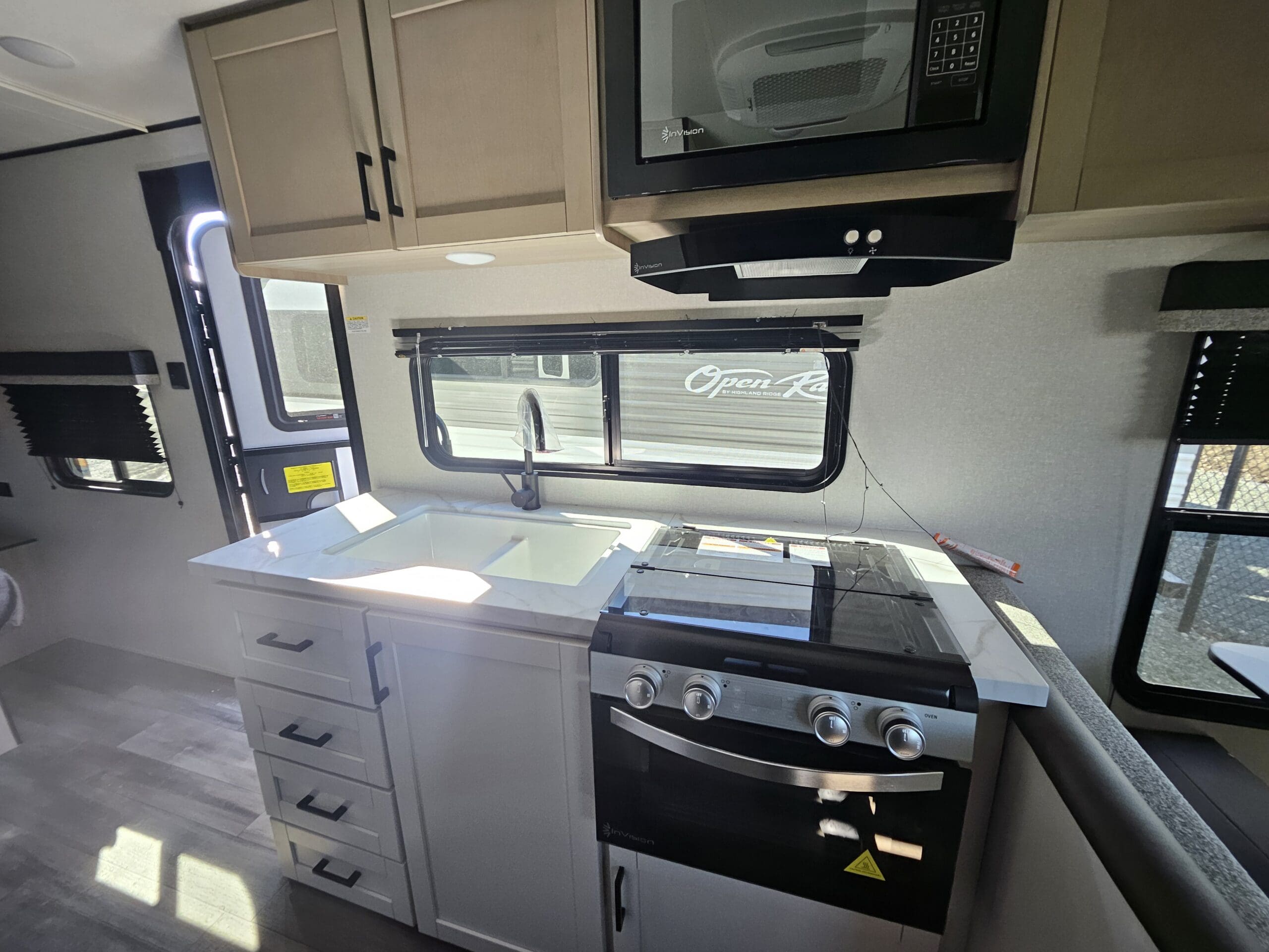 Kitchen: Equipped with residential-grade countertops, a 3-burner cooktop, an 8 cu. ft. 12V refrigerator, and a microwave.