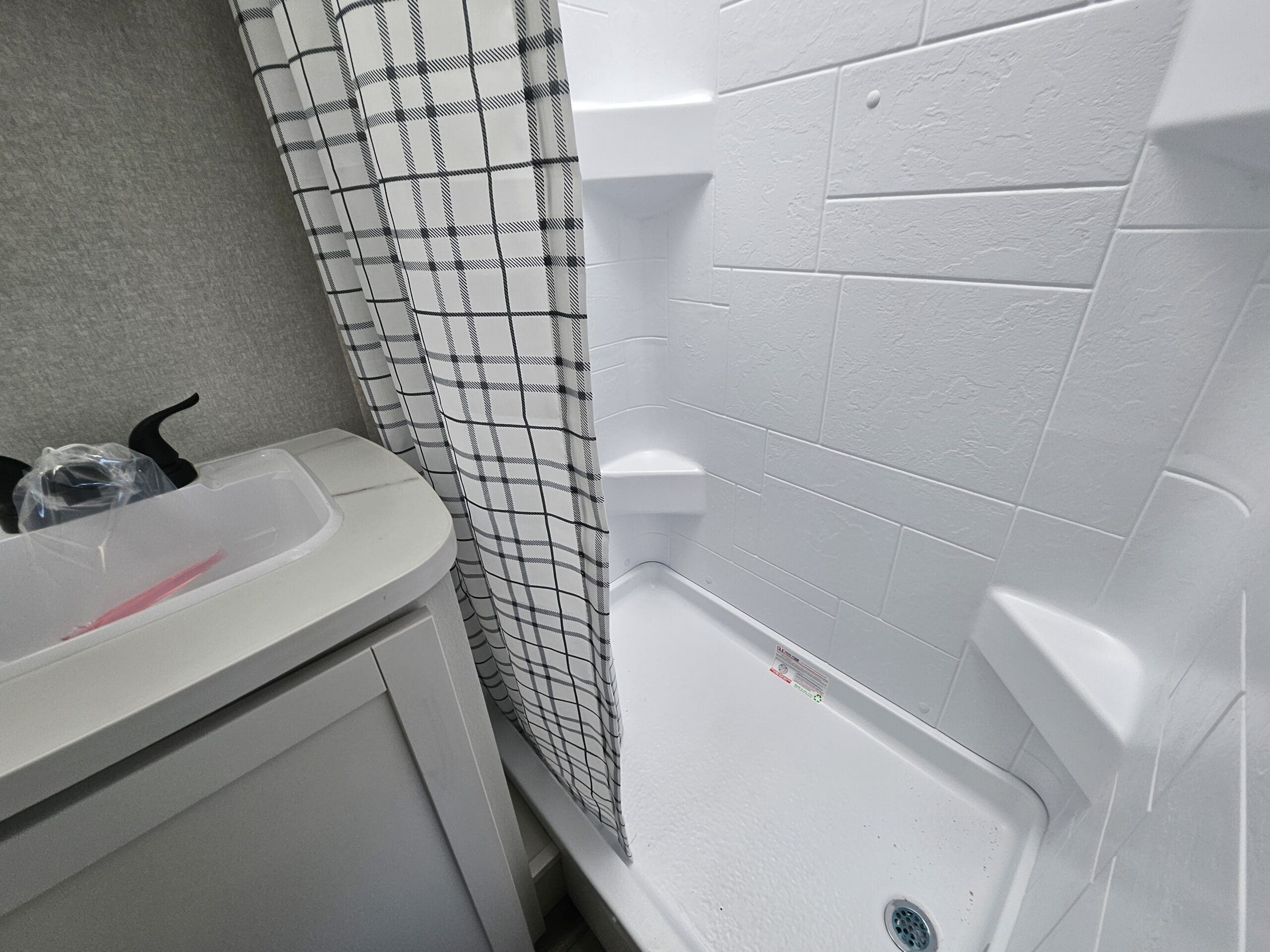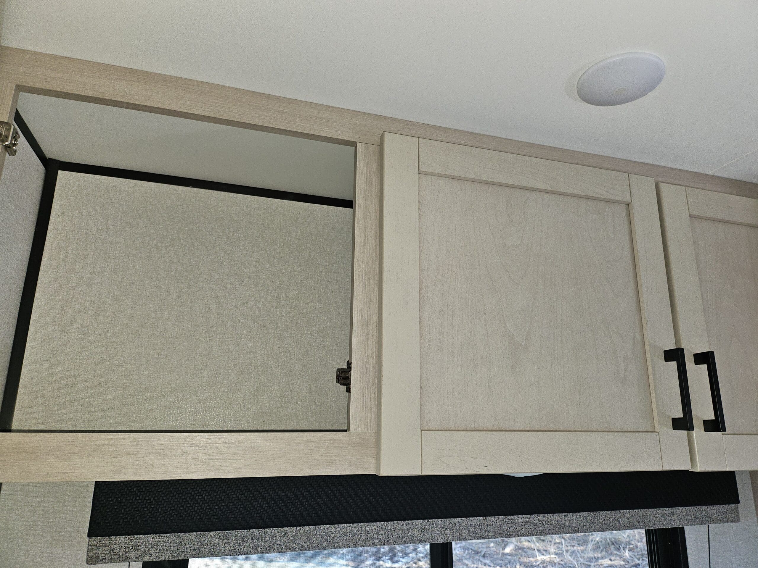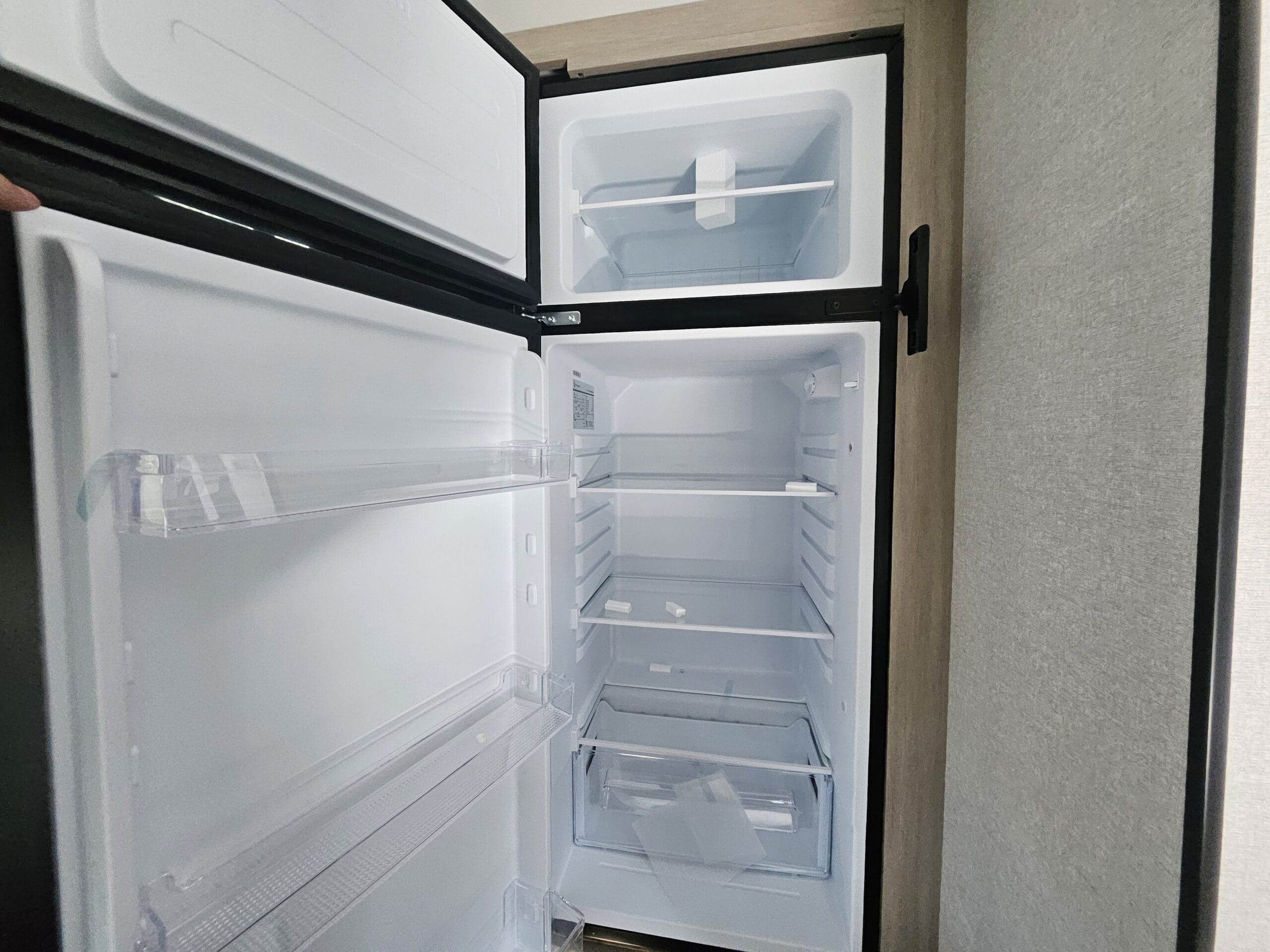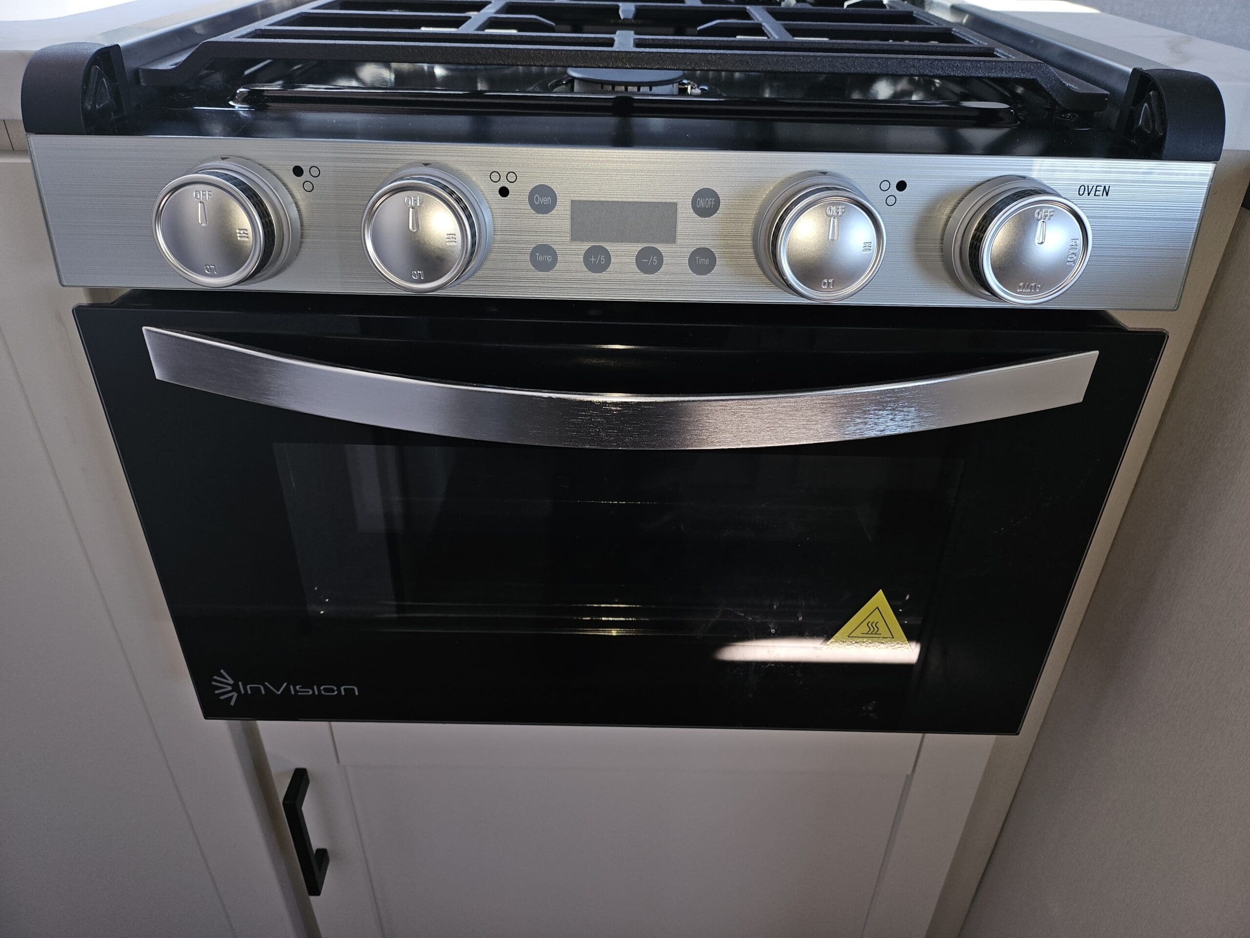 Kitchen: Equipped with residential-grade countertops, a 3-burner cooktop, an 8 cu. ft. 12V refrigerator, and a microwave.