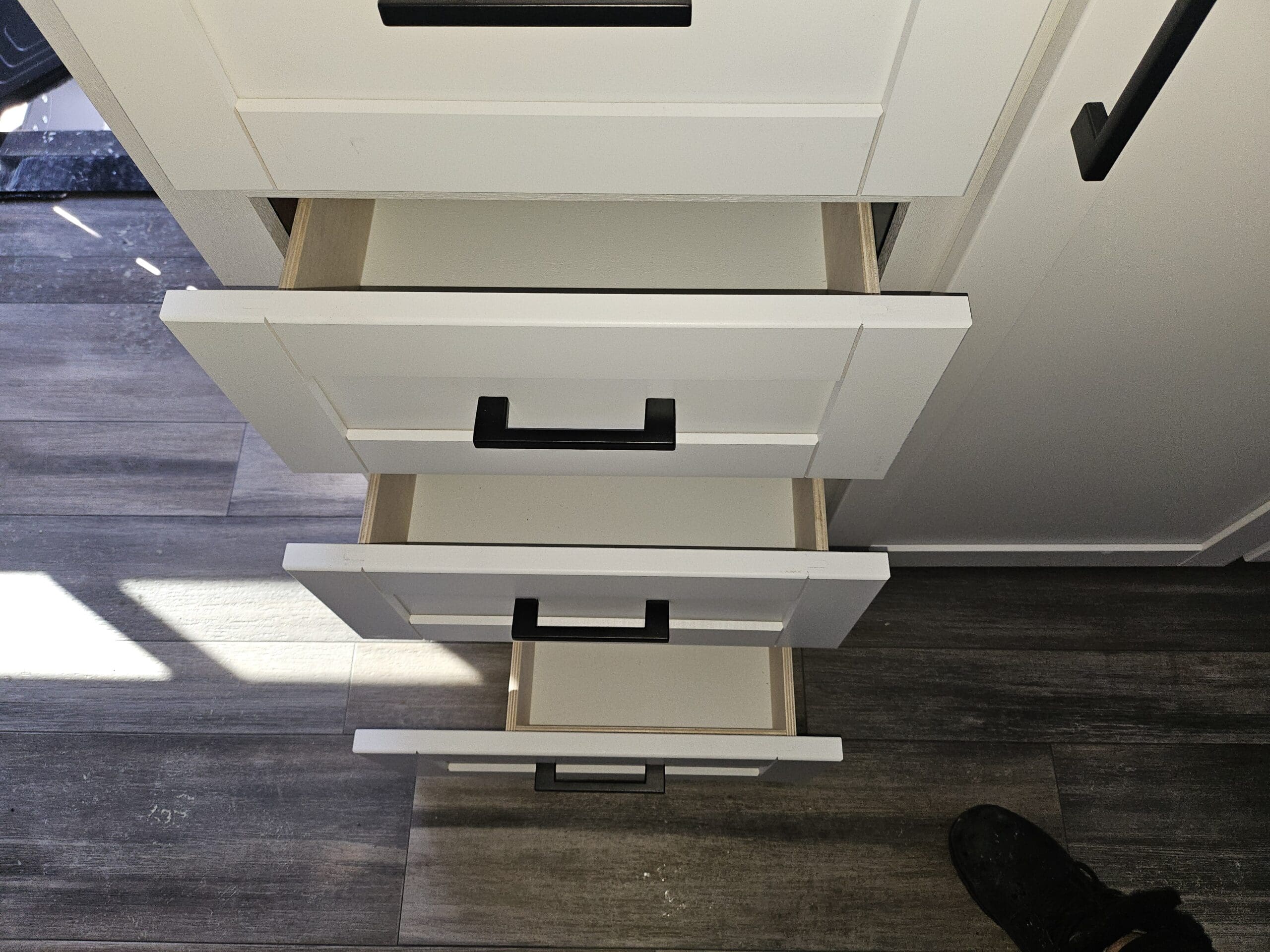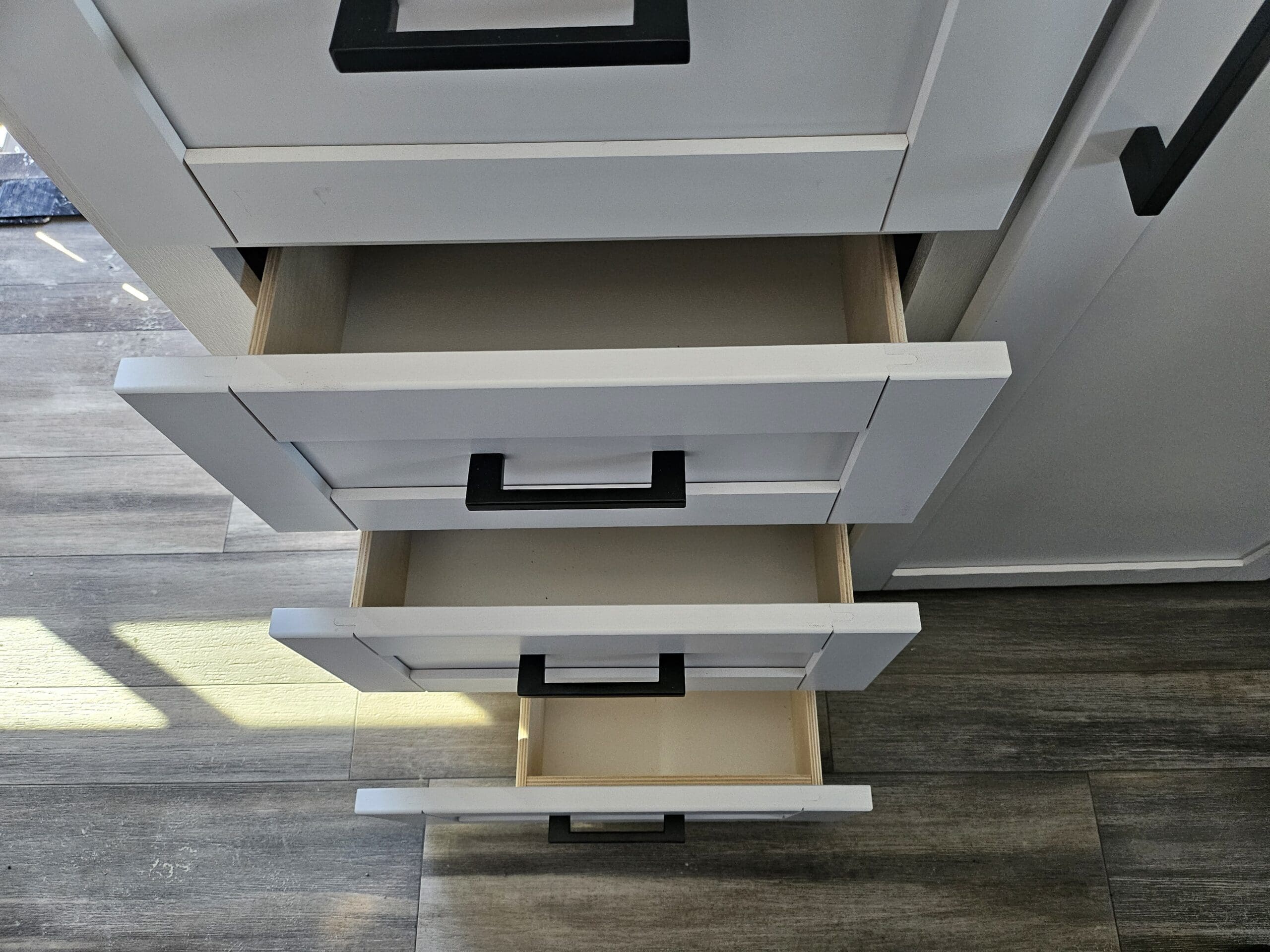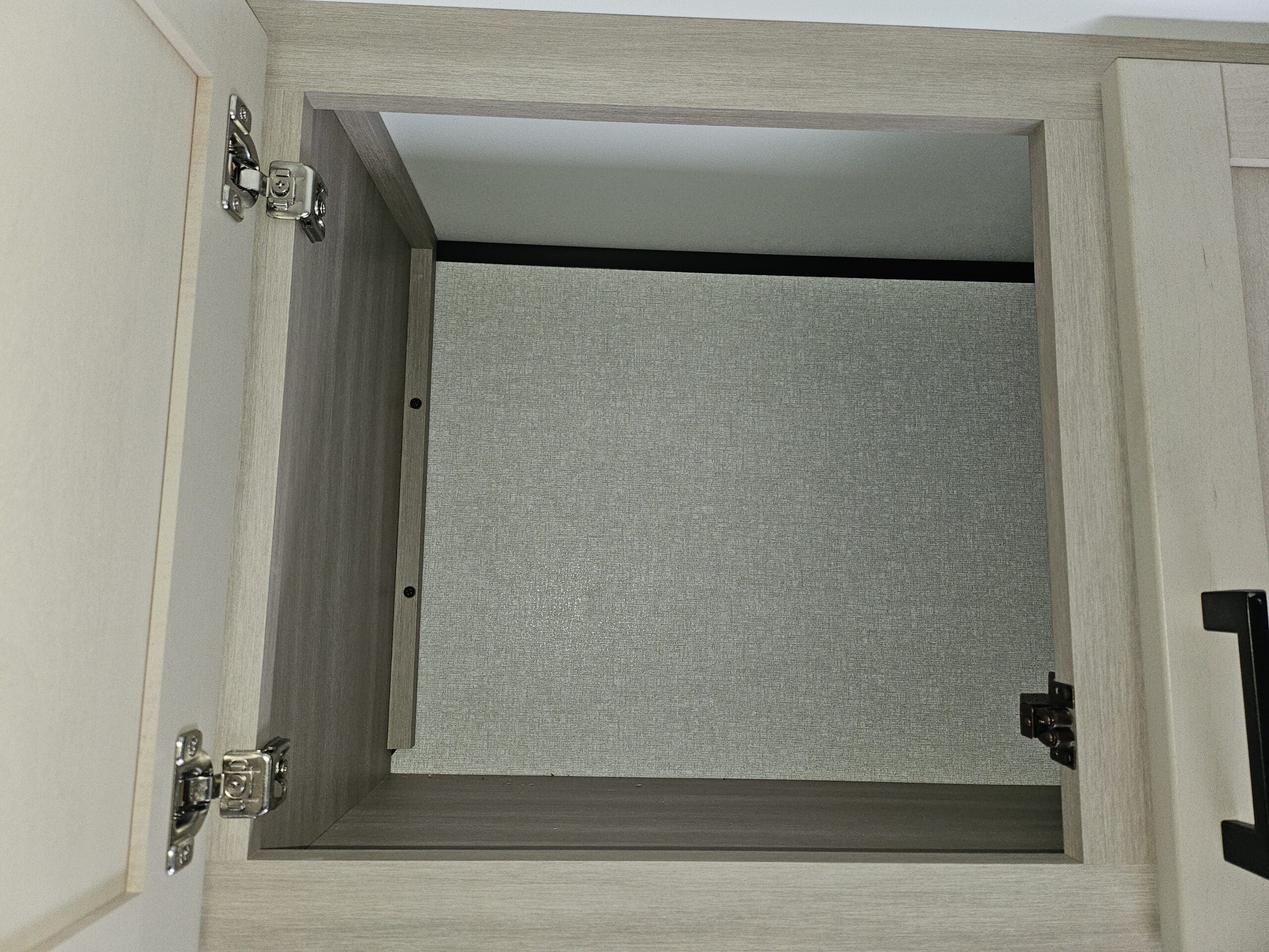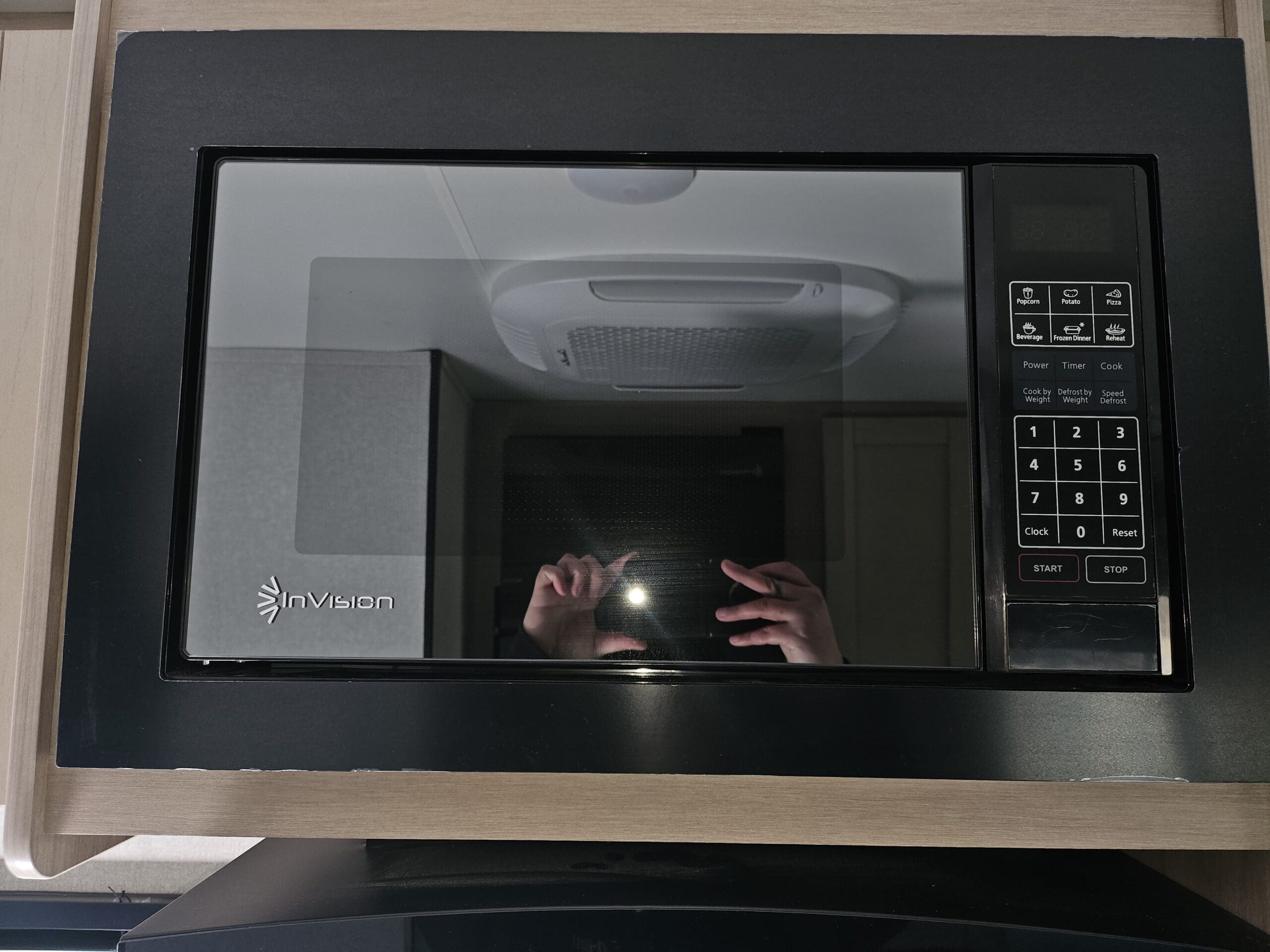 Kitchen: Equipped with residential-grade countertops, a 3-burner cooktop, an 8 cu. ft. 12V refrigerator, and a microwave.