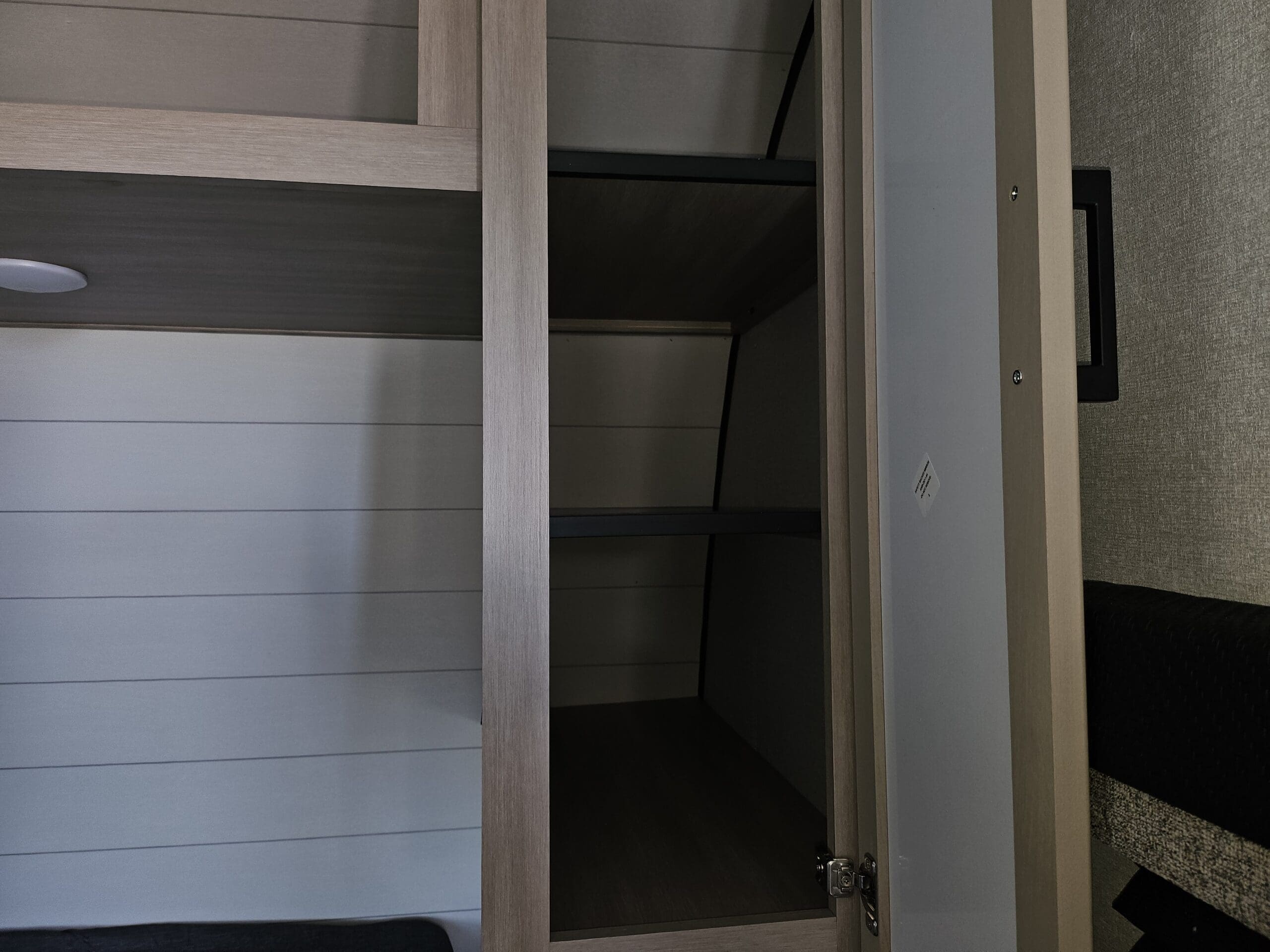 Master Suite: Features a front-facing RV Queen bed with dual bedside wardrobes and overhead storage.