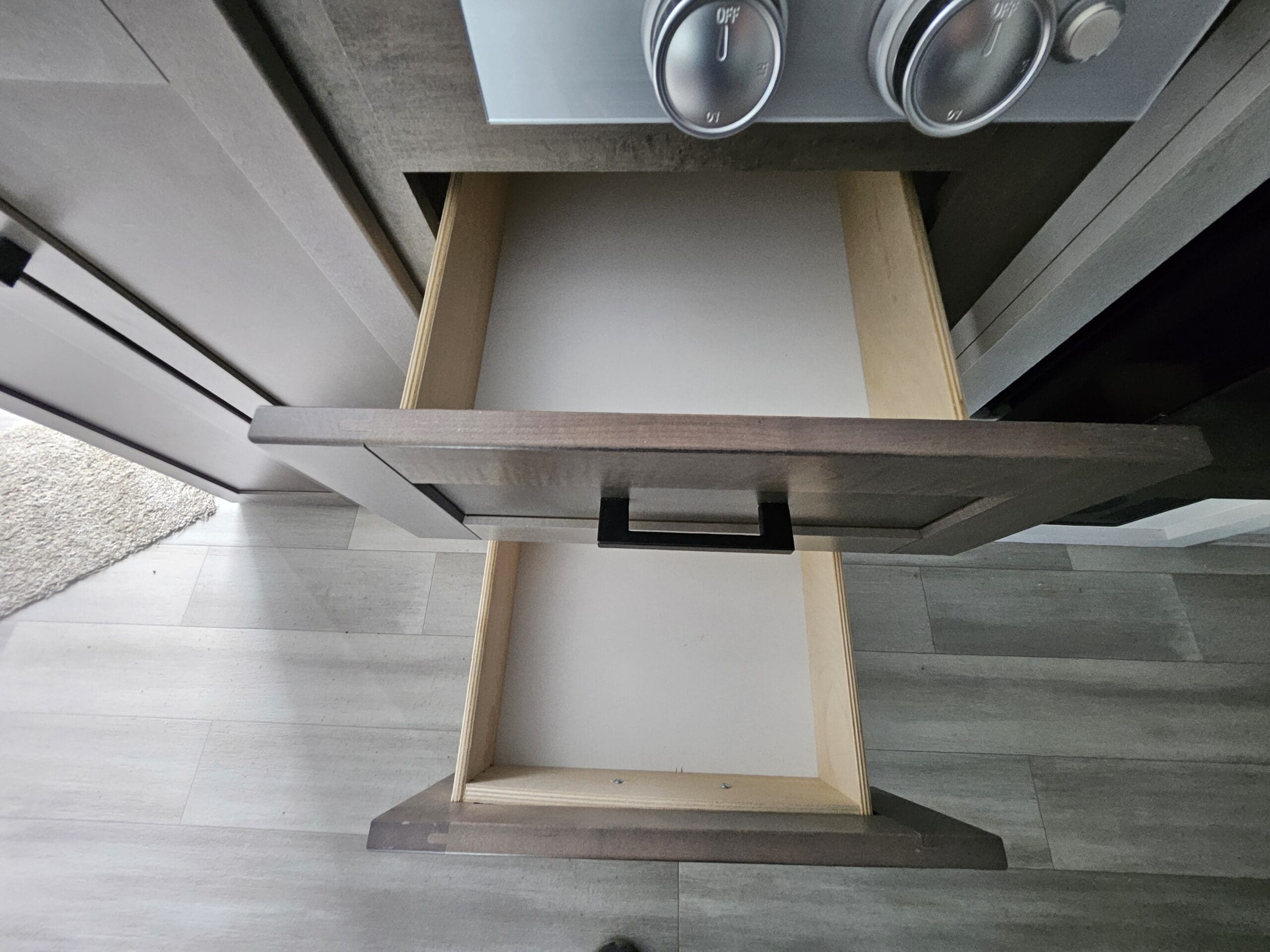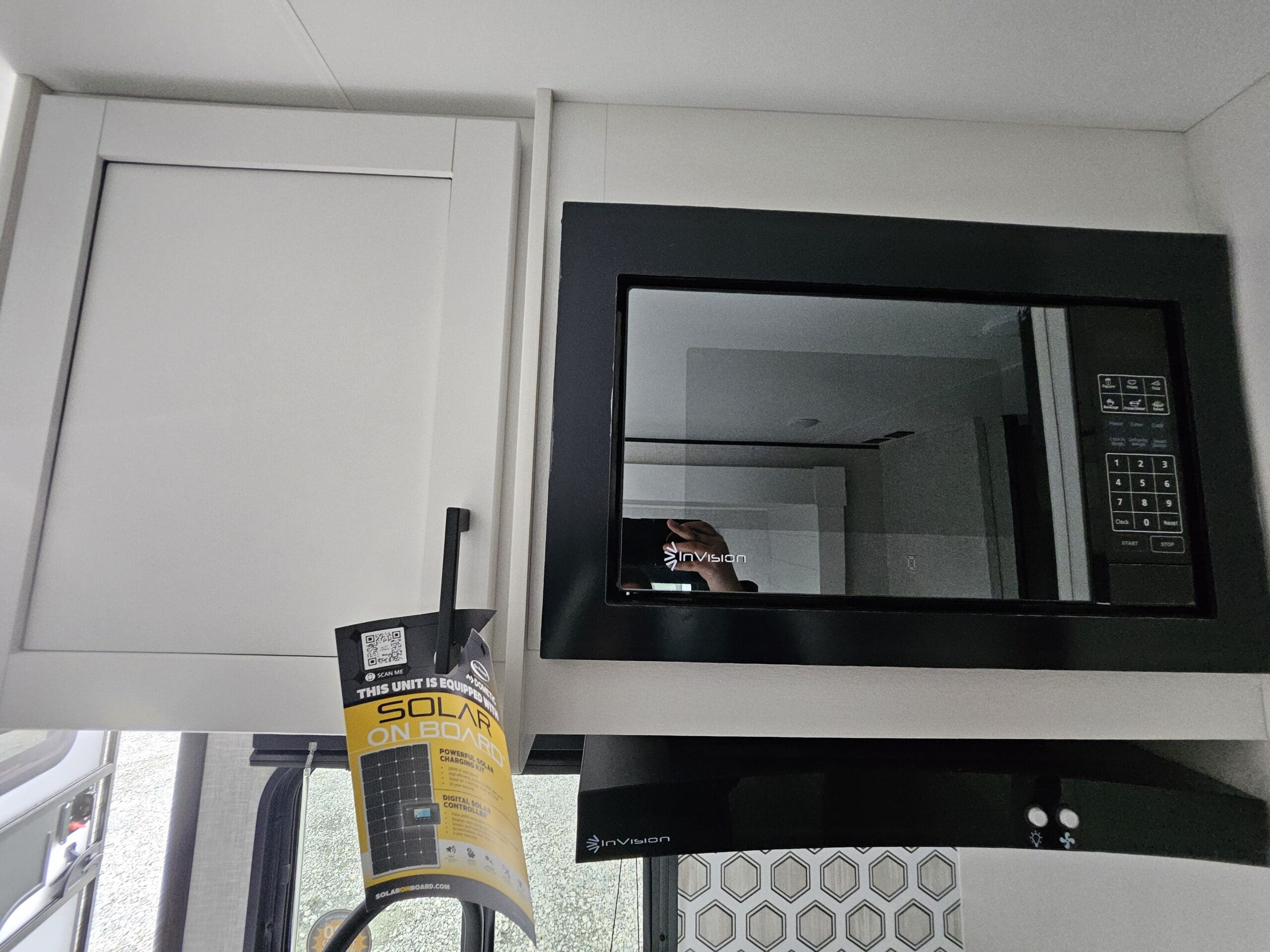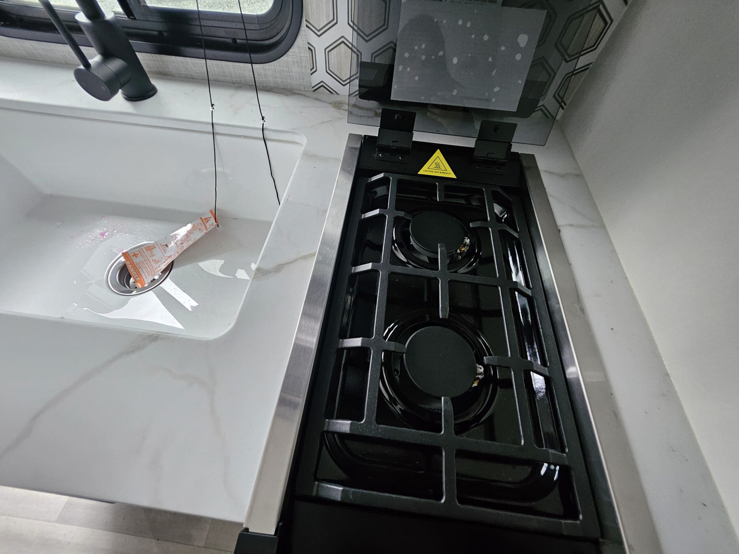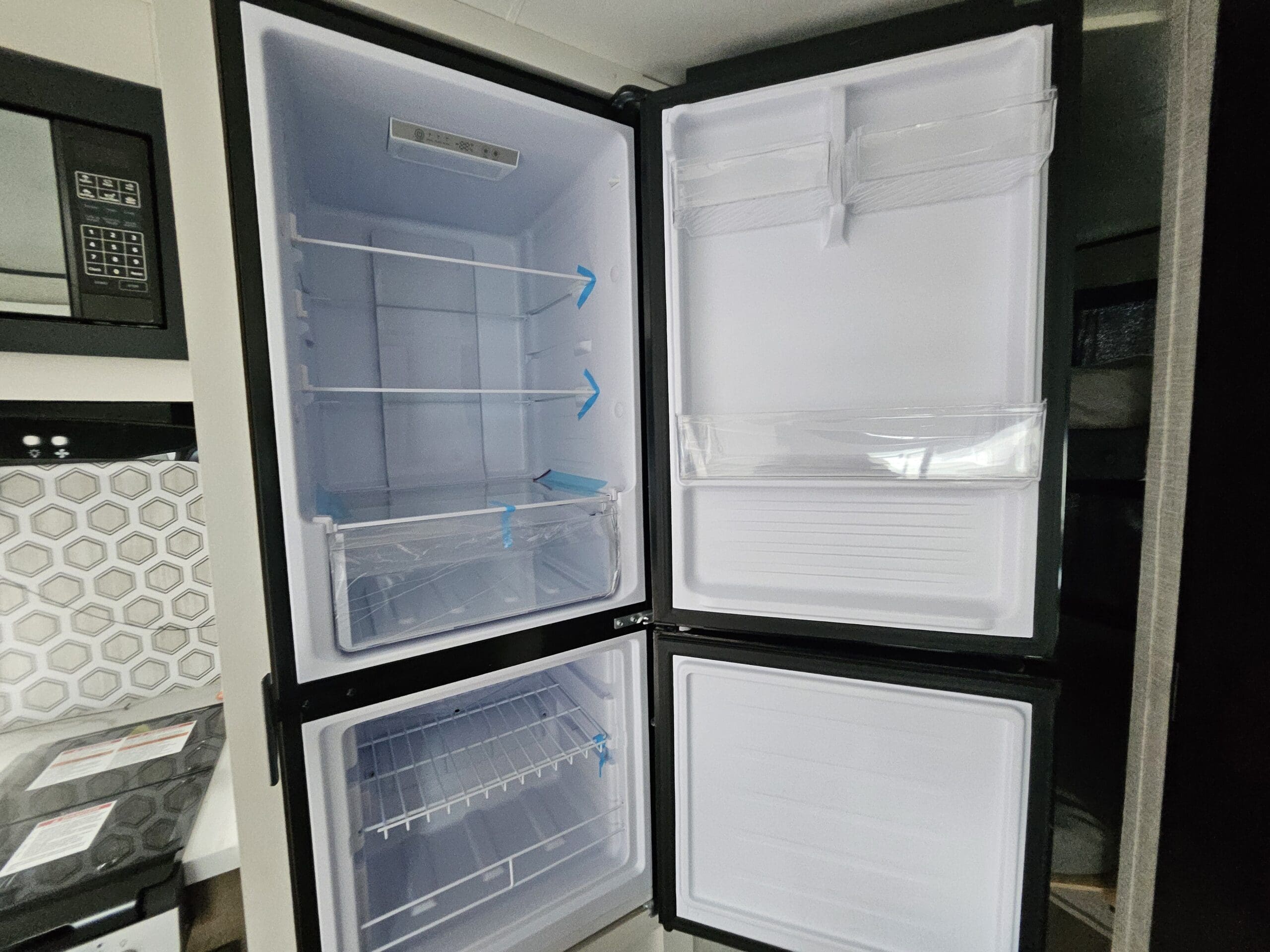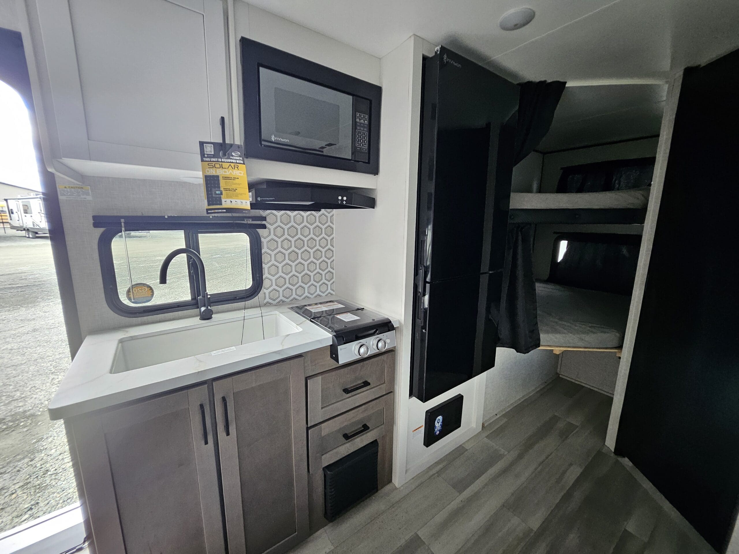 Modern Kitchen: Equipped with an 8 cu. ft. 12V refrigerator, a 2-burner range with a glass cover, and a microwave.