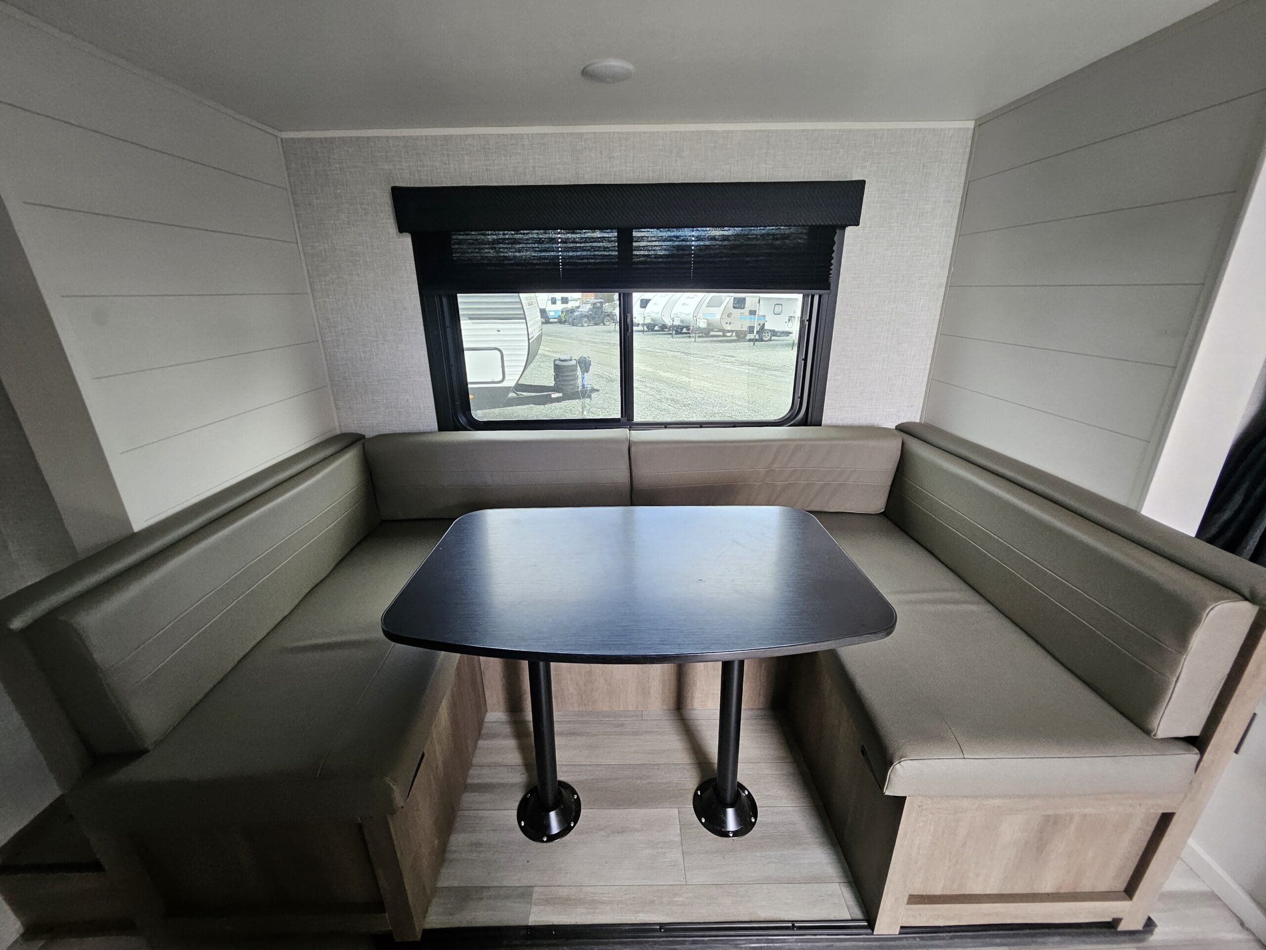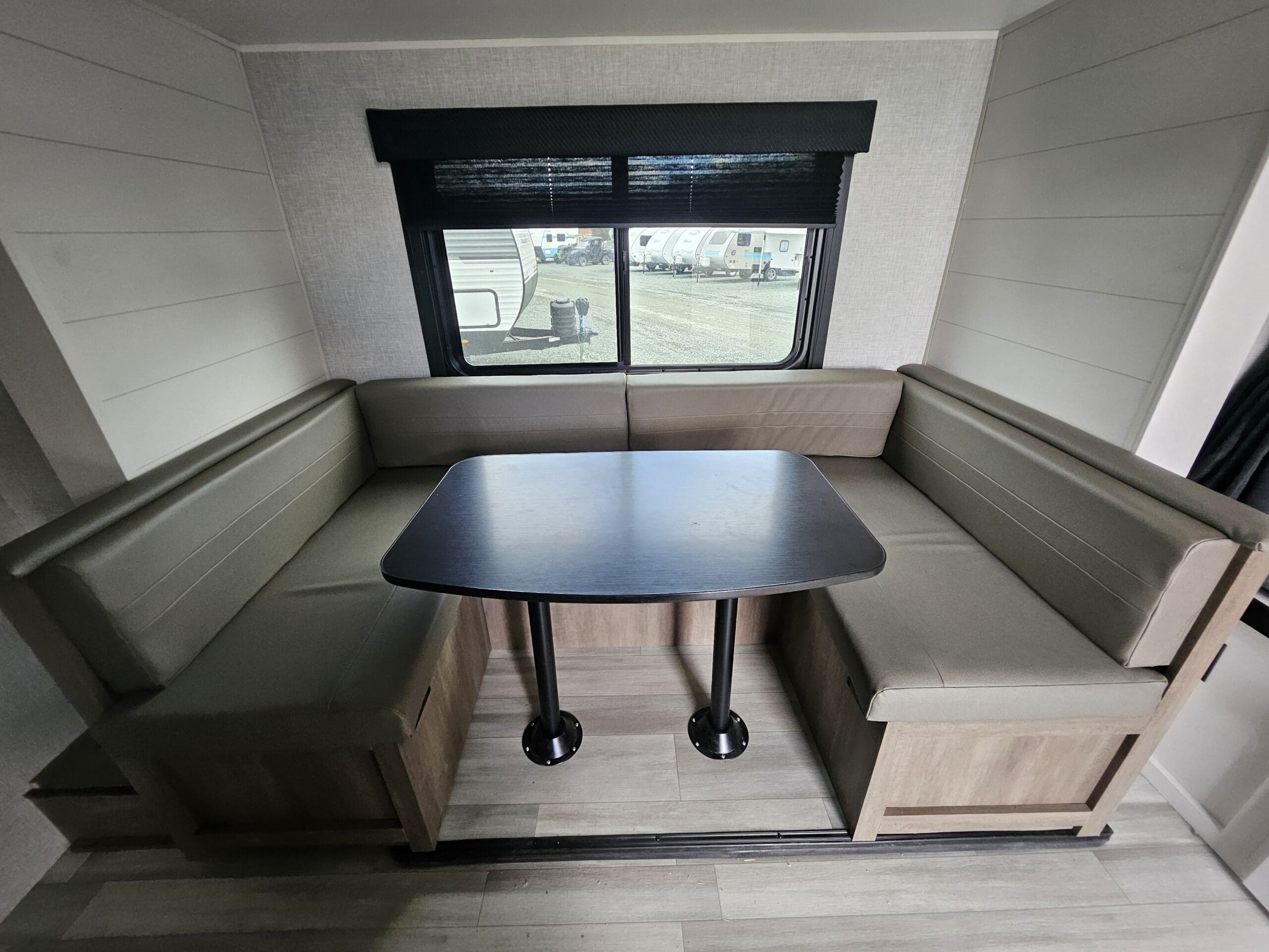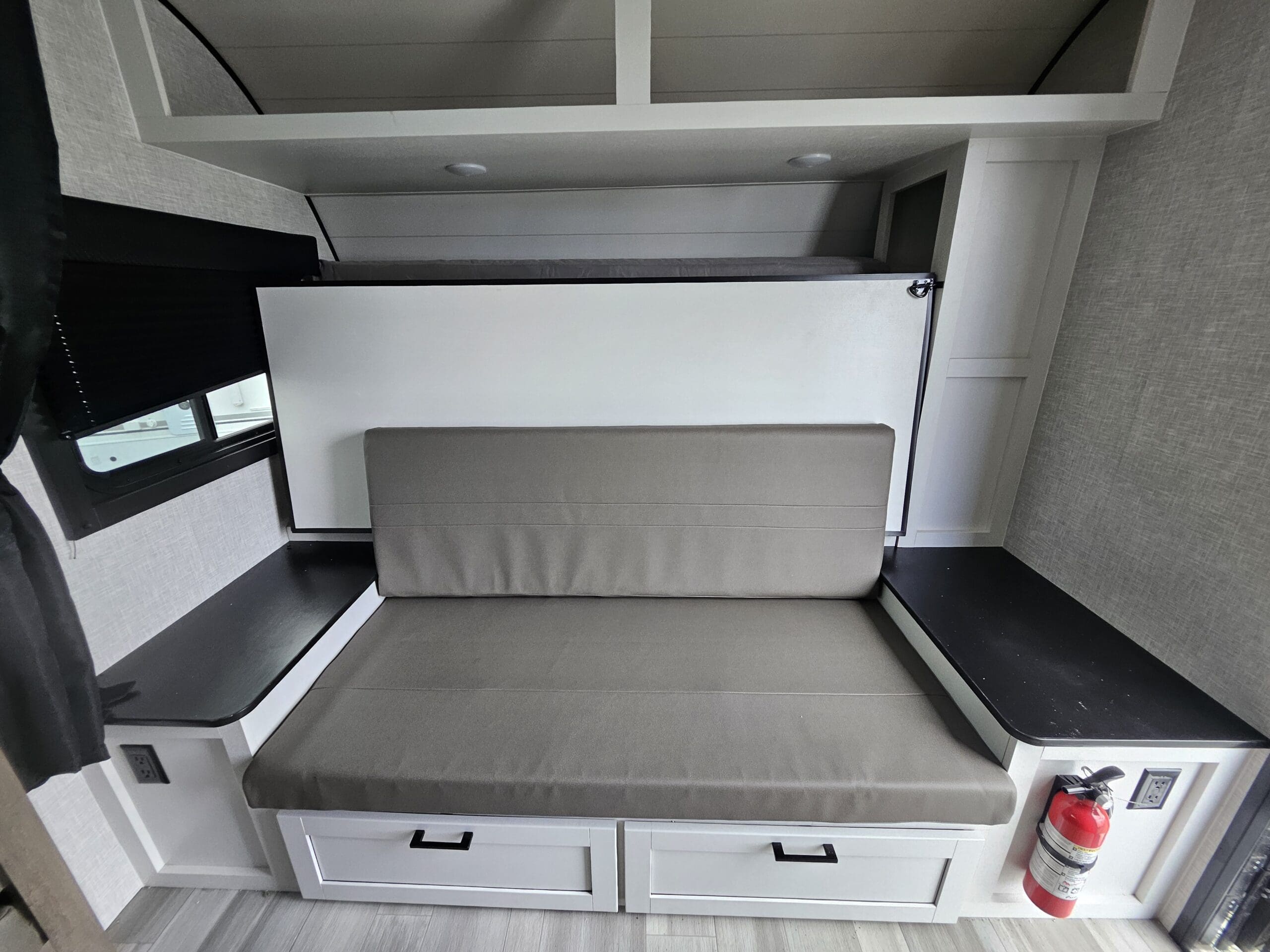 Versatile Sleeping: It features a front 60″ x 76″ Murphy bed that folds over a sofa during the day, plus rear double-over-double bunk beds. The U-shaped dinette also converts into a bed.