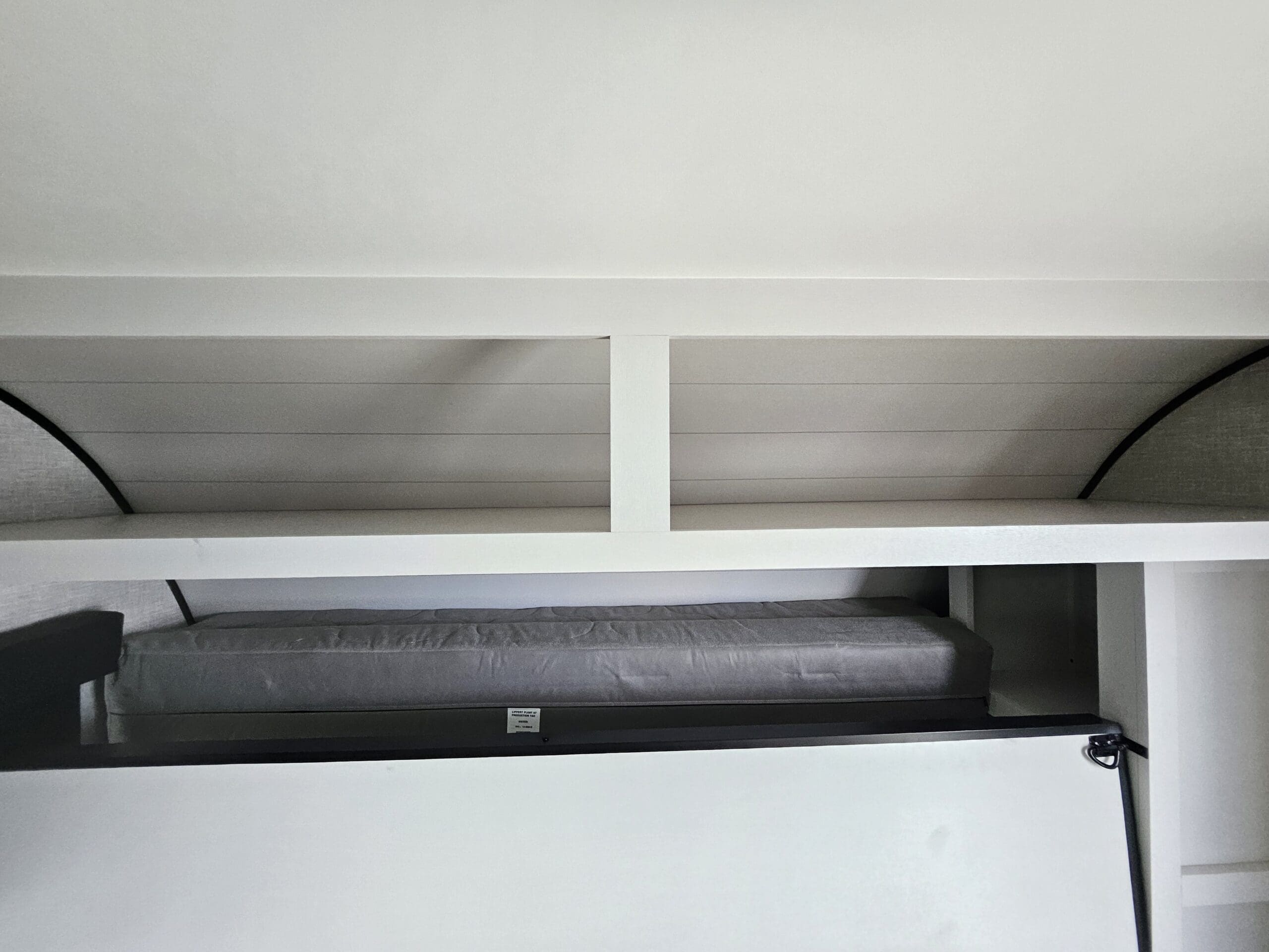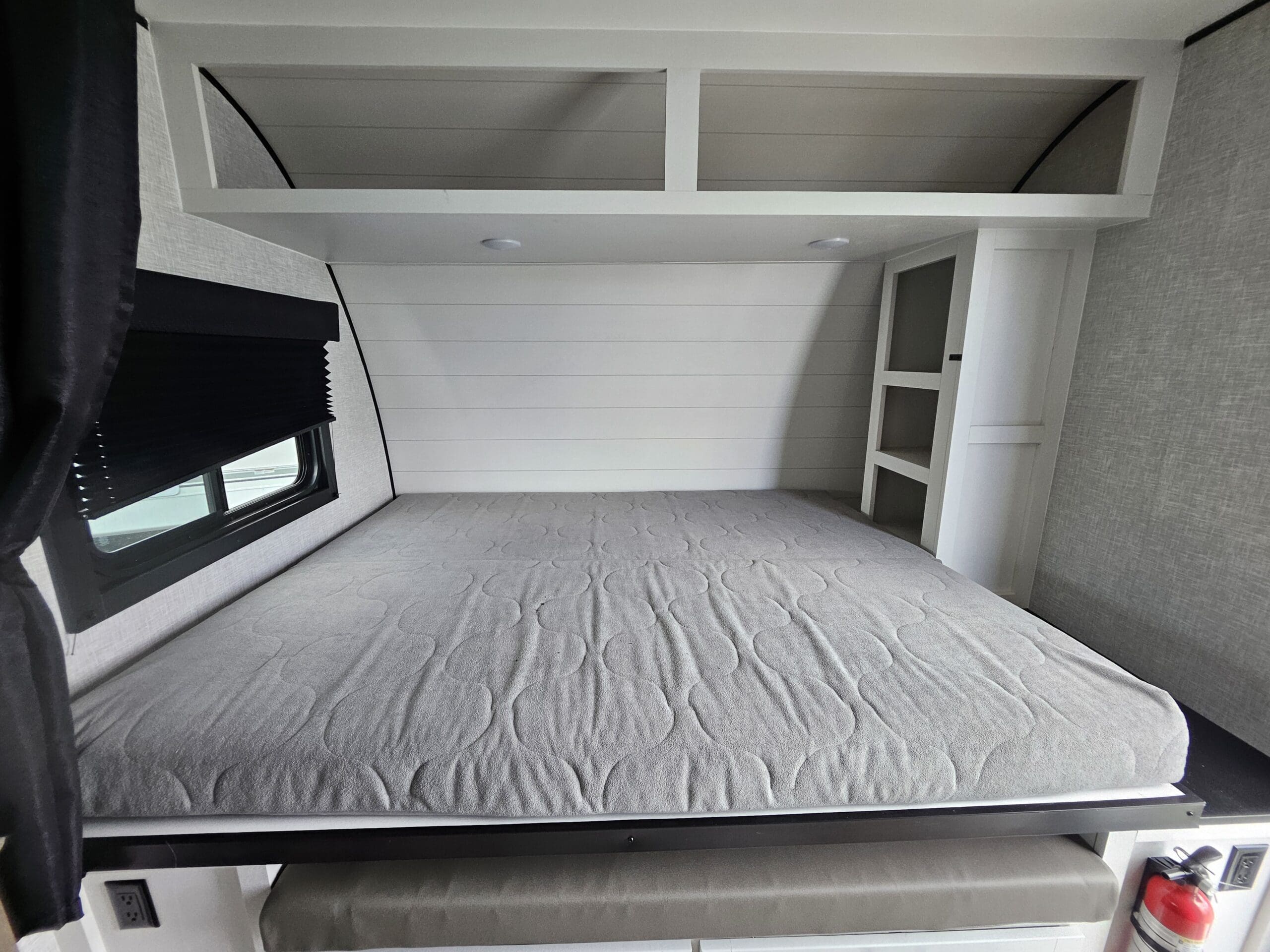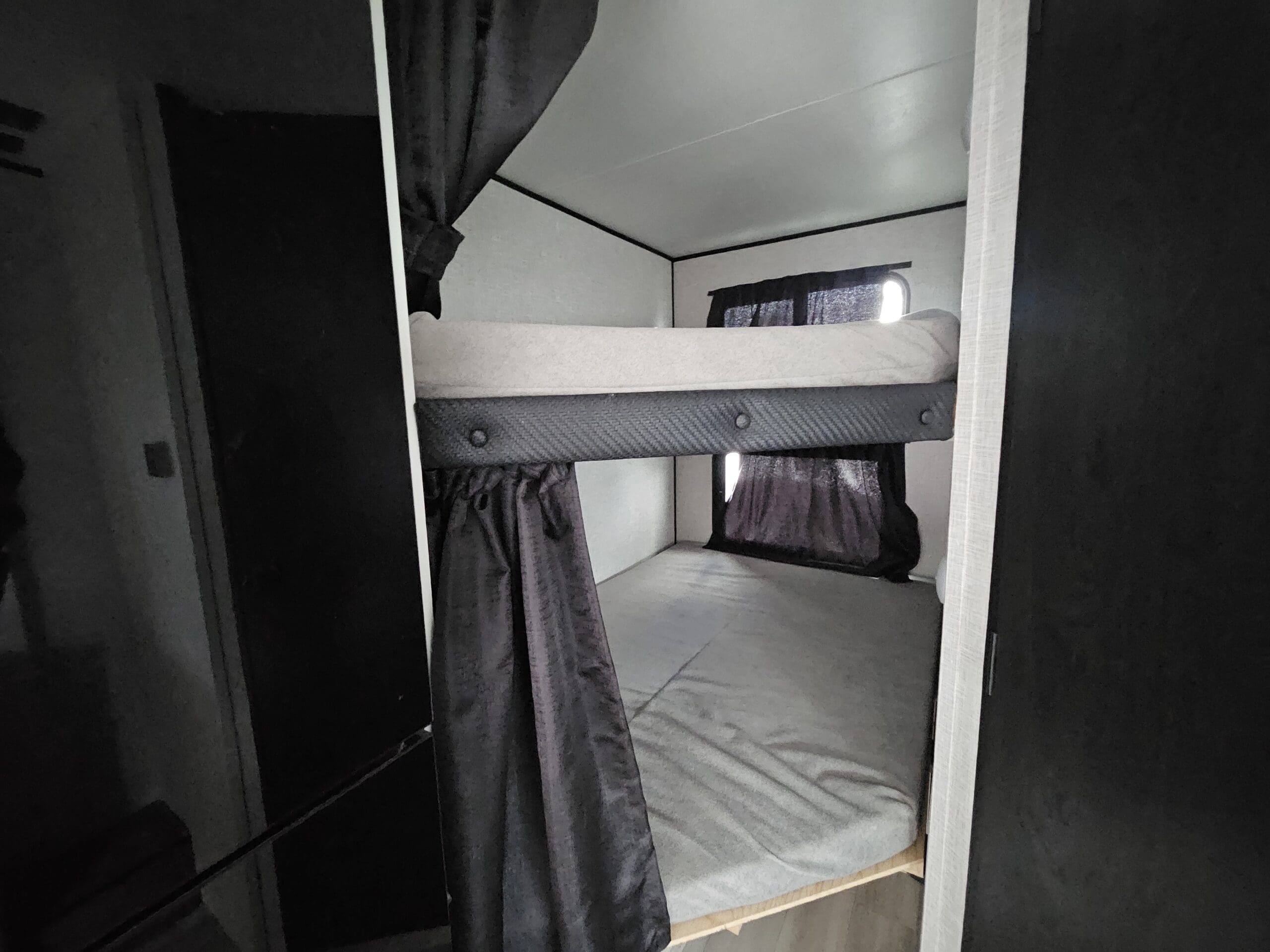 Versatile Sleeping: It features a front 60″ x 76″ Murphy bed that folds over a sofa during the day, plus rear double-over-double bunk beds. The U-shaped dinette also converts into a bed.