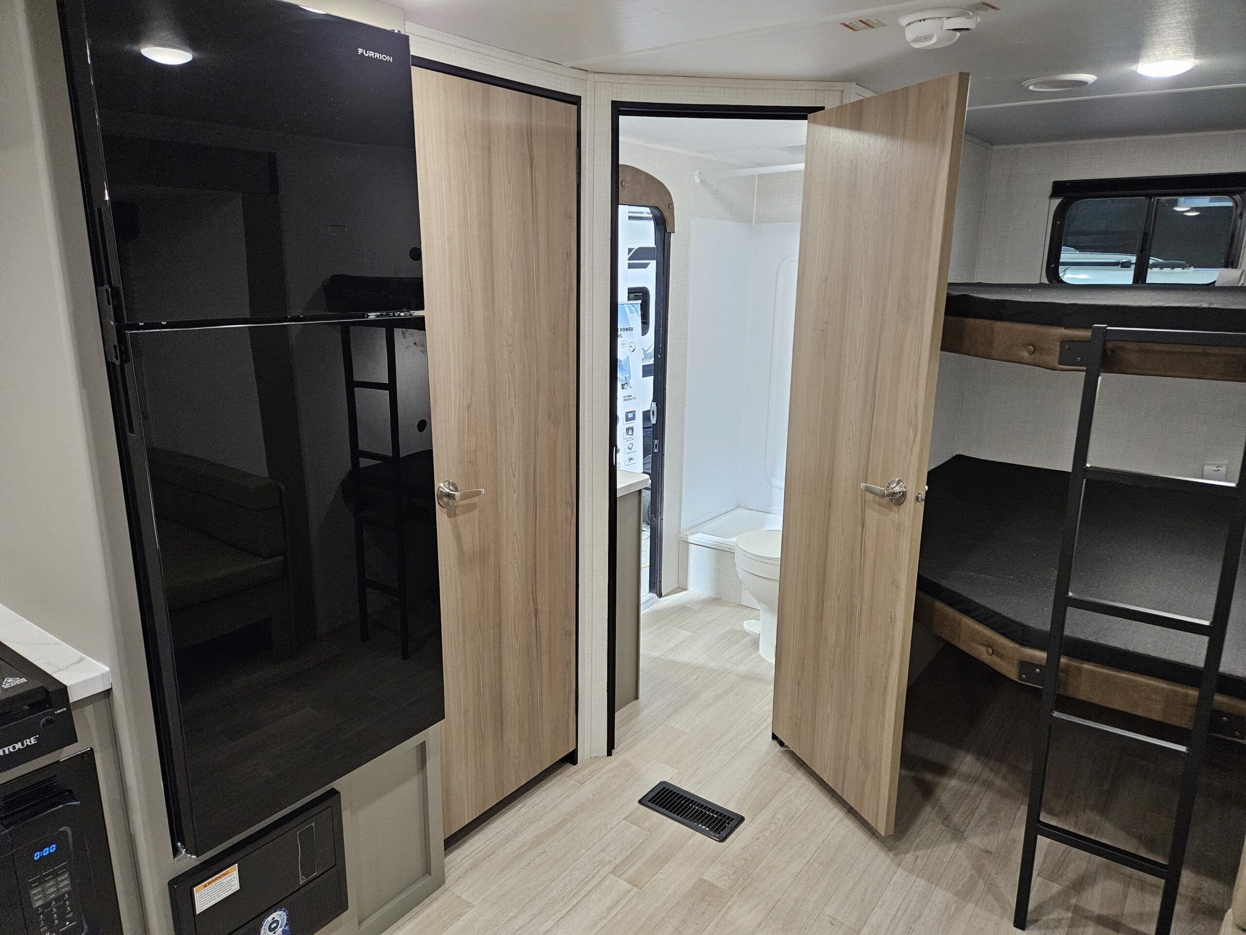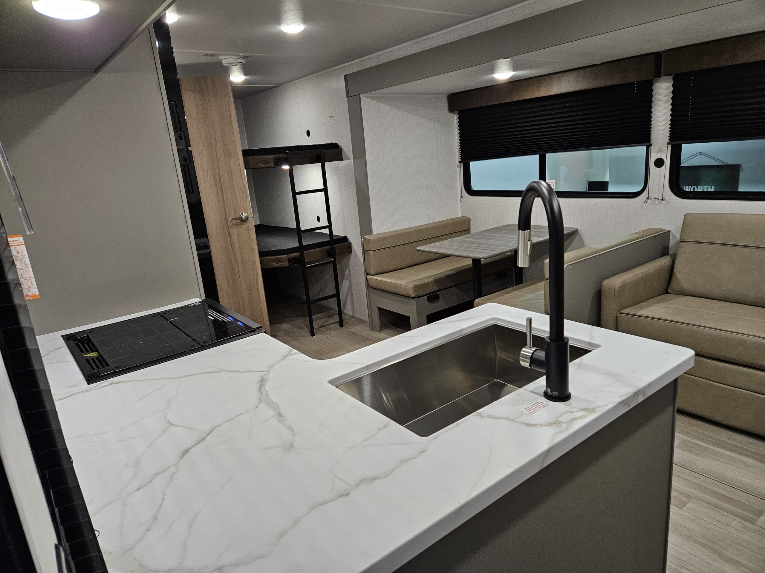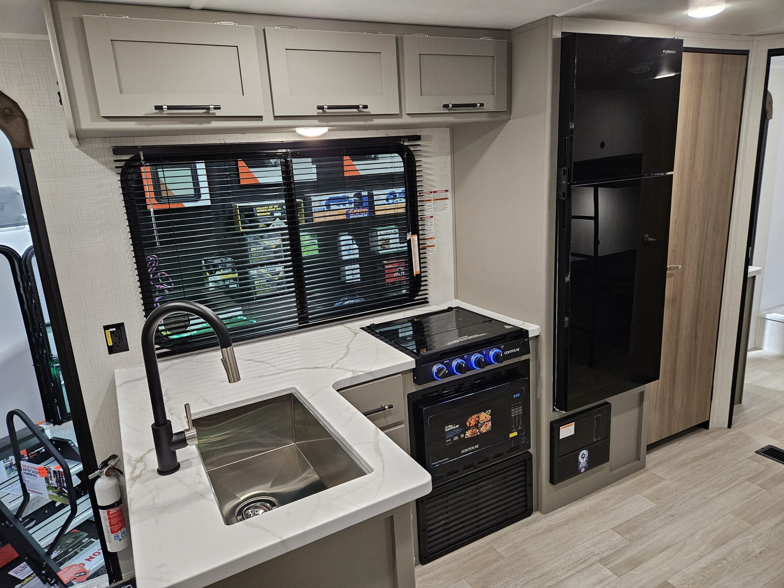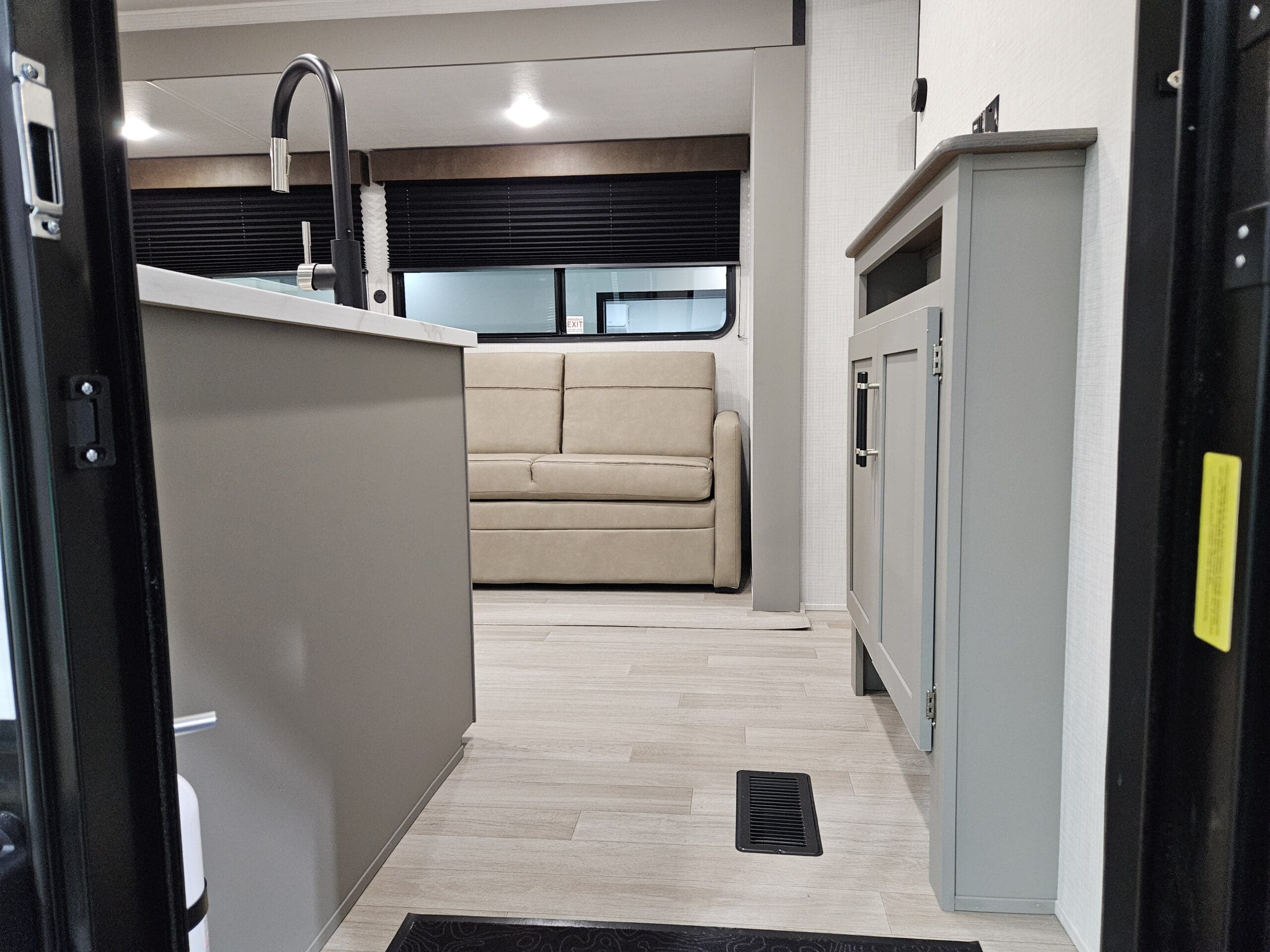 Kitchen: Equipped with a 10 cu. ft. 12V refrigerator, a 3-burner cooktop, and an extra-large pantry, which is a standout feature for this size of trailer.