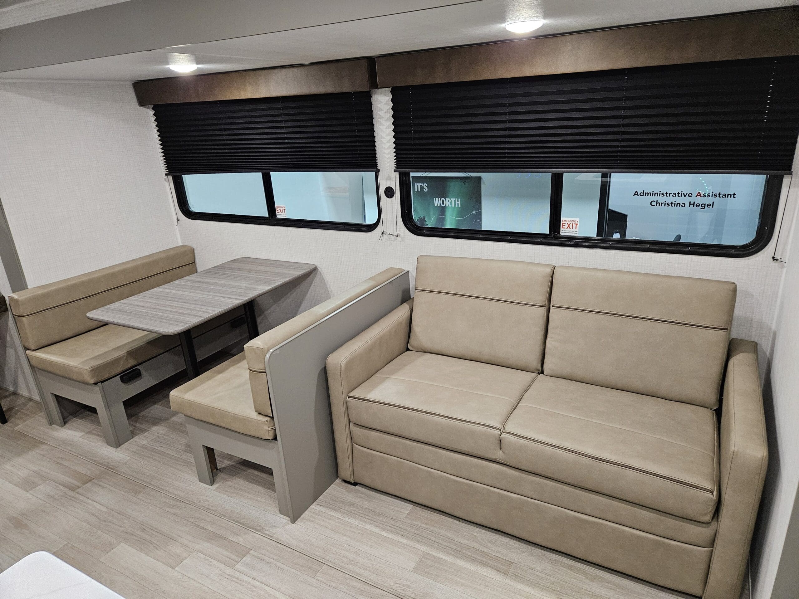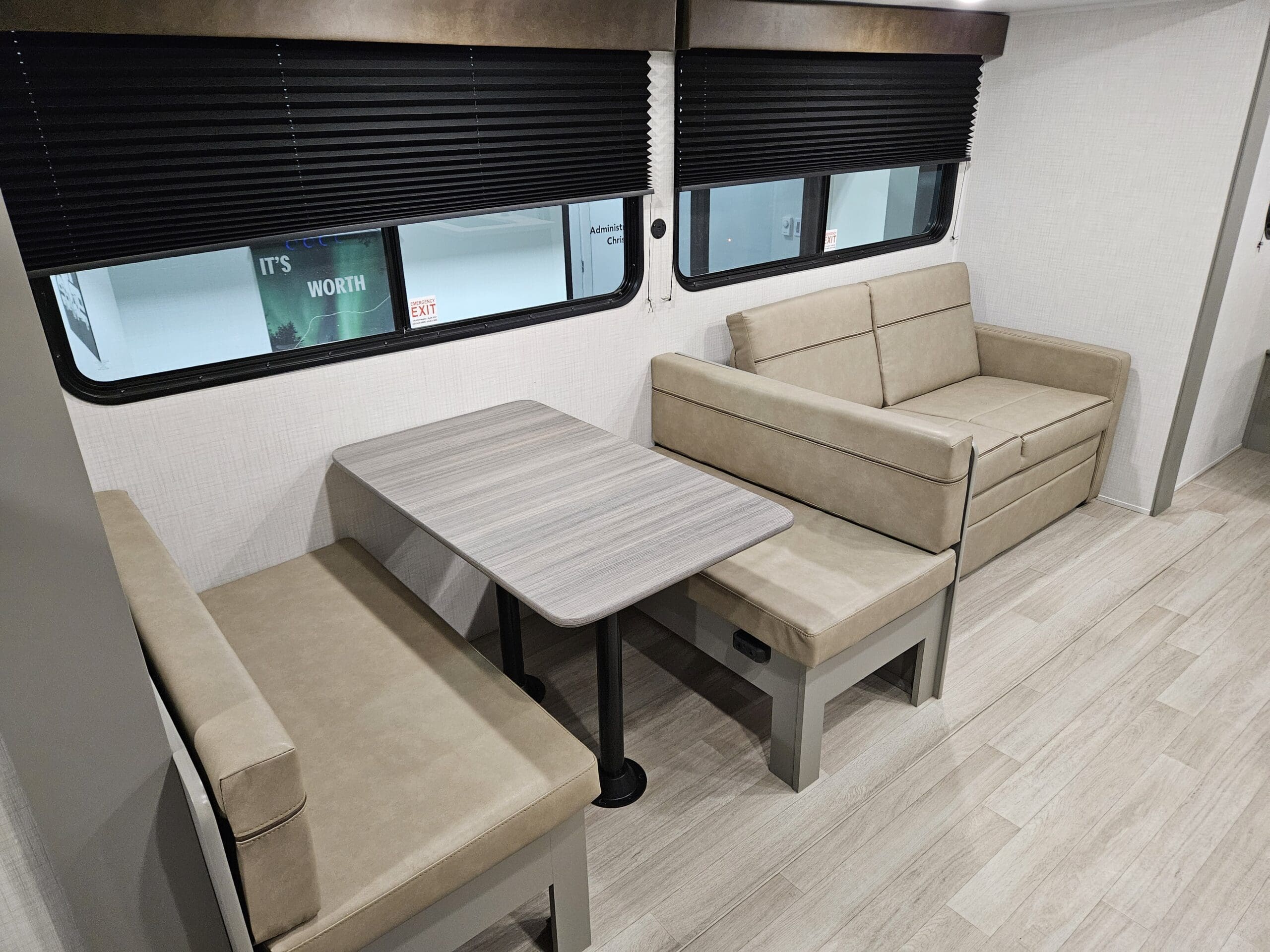 Convertible Furniture: Both the booth dinette and the sofa can be converted into additional sleeping spaces.