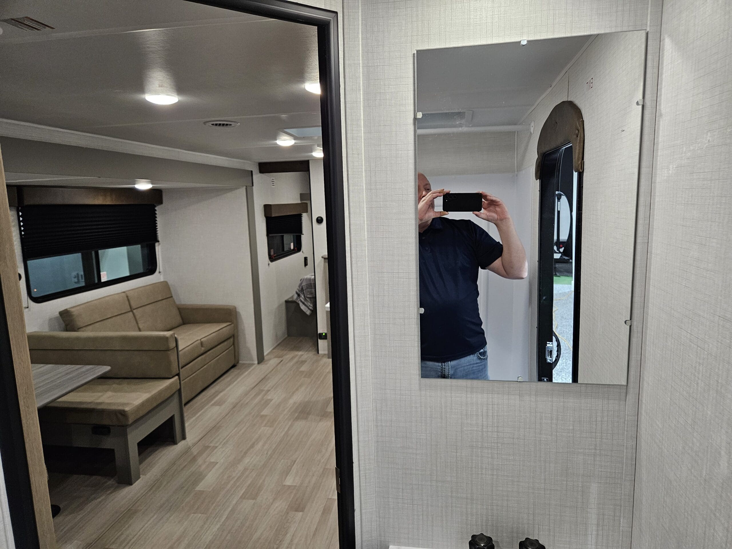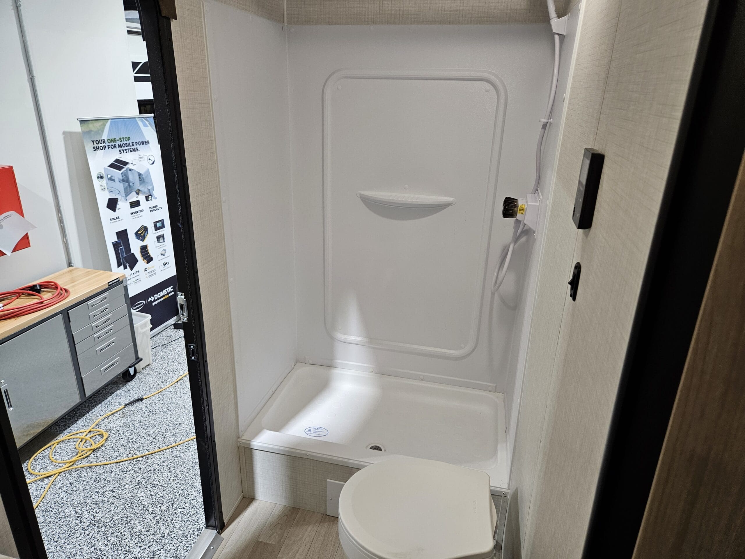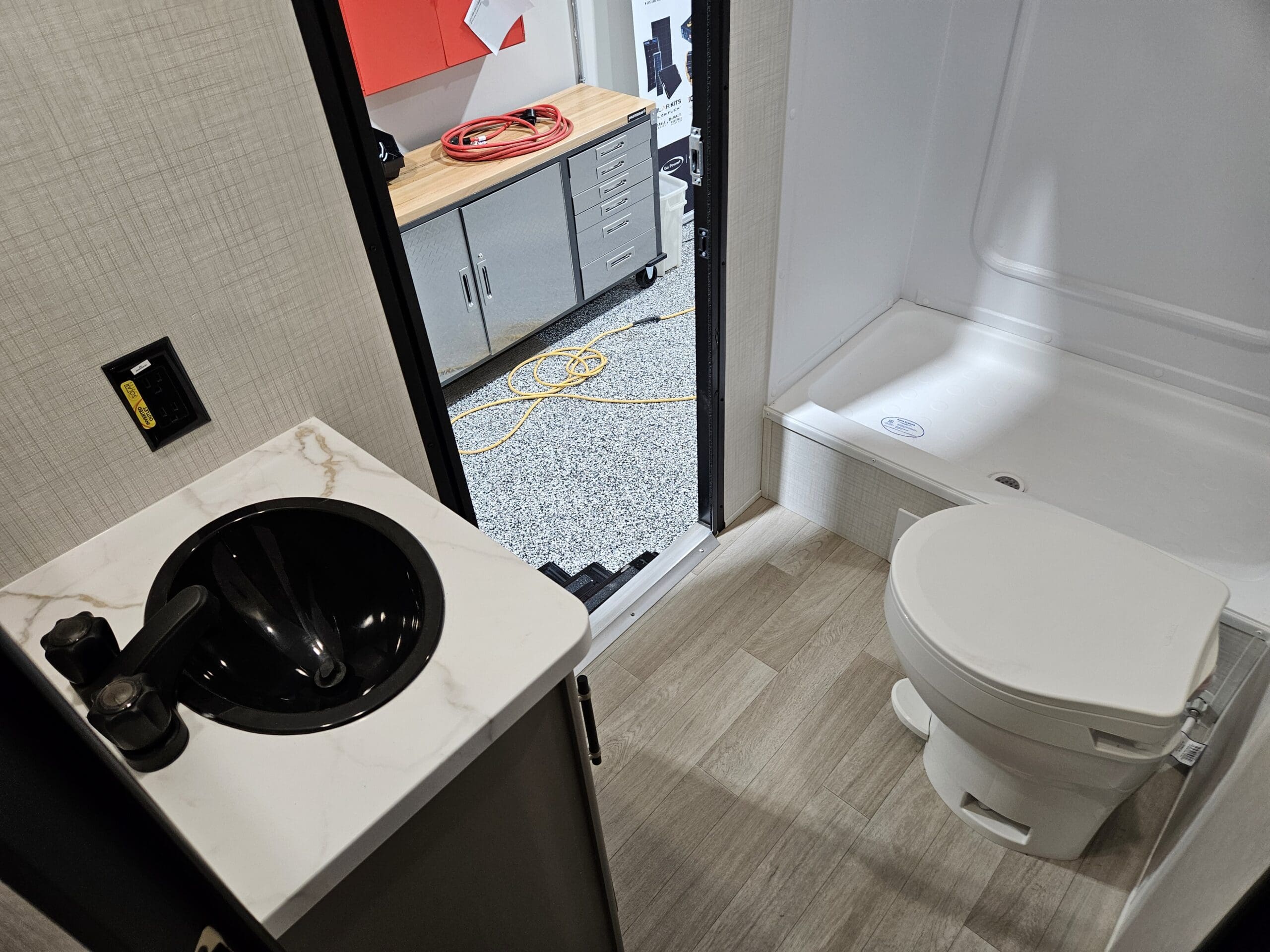 Dual Entry Doors: This is a major convenience feature; one door leads into the main living area, while the second provides direct access to the bathroom. This keeps dirt from being tracked through the entire trailer during quick pit stops.