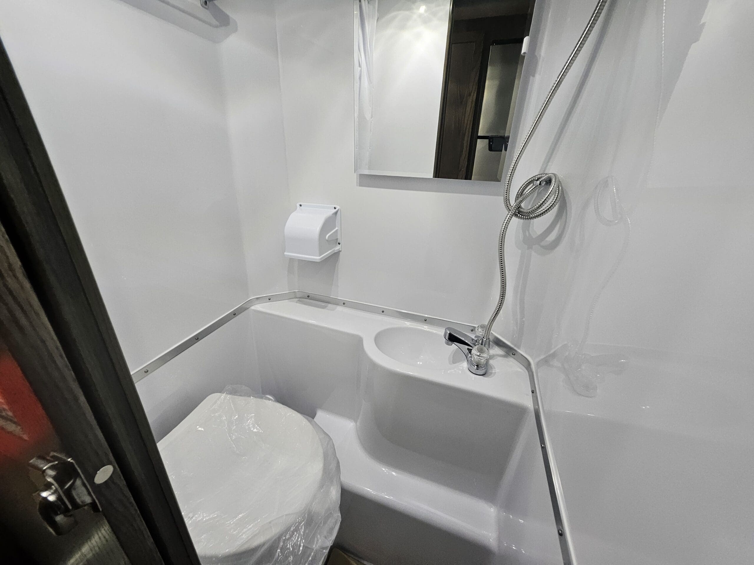 Unlike the “Dry Bath” version (which has a separate shower stall), the Wet Bath model maximizes living space by combining the toilet and shower into one waterproof fiberglass room.