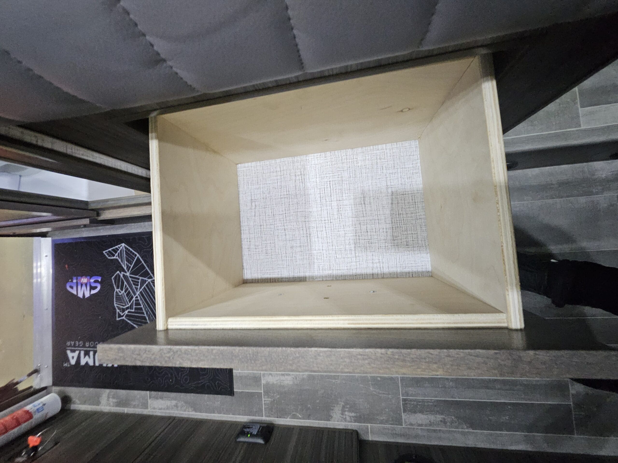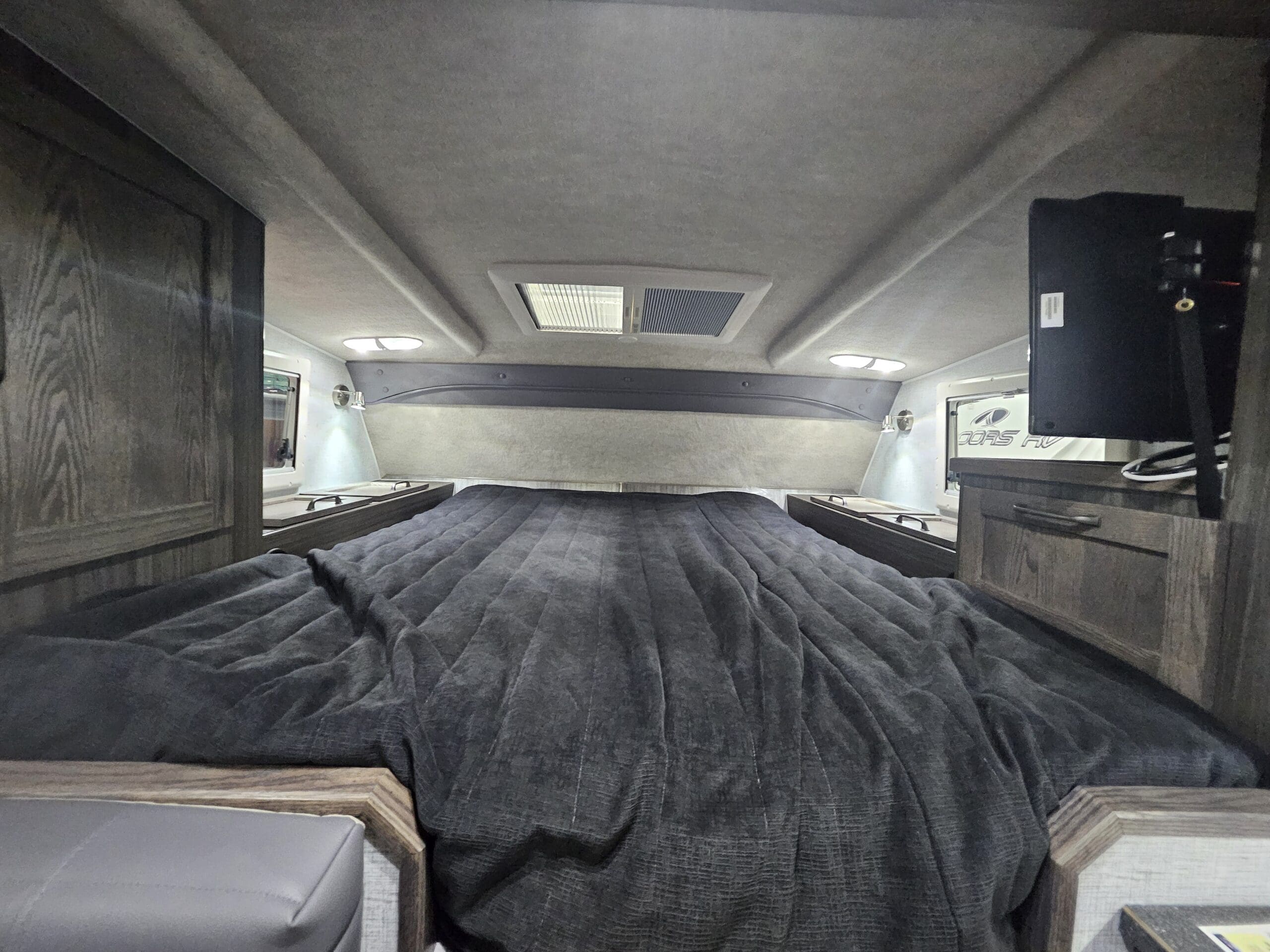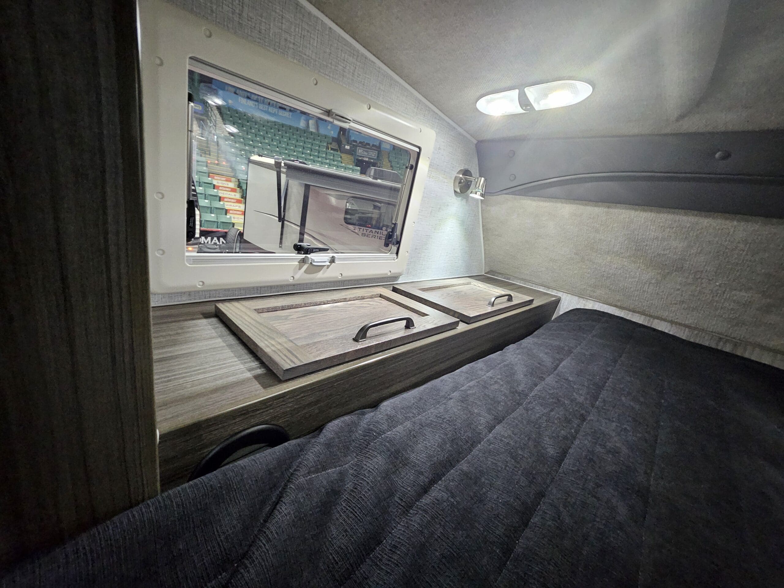 • Sleeping: A true North-South Queen (60″ x 80″) mattress in the cabover, which eliminates the need to “crawl over” a partner to get out of bed.