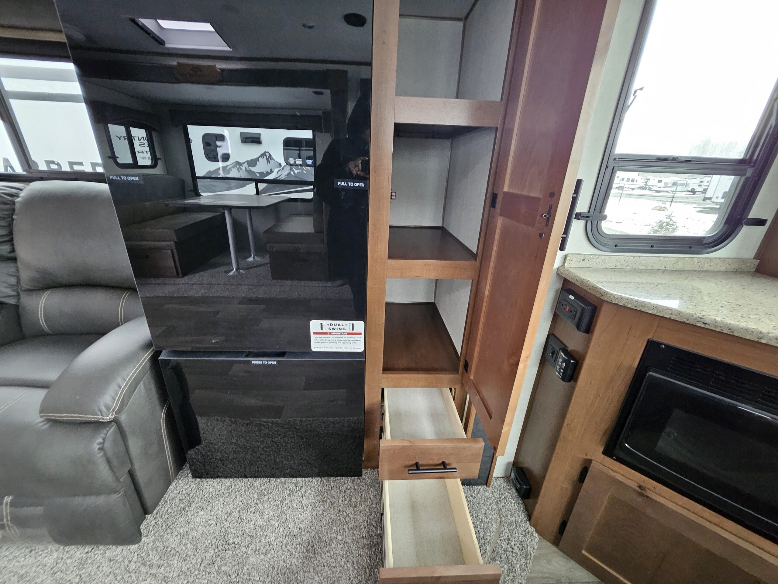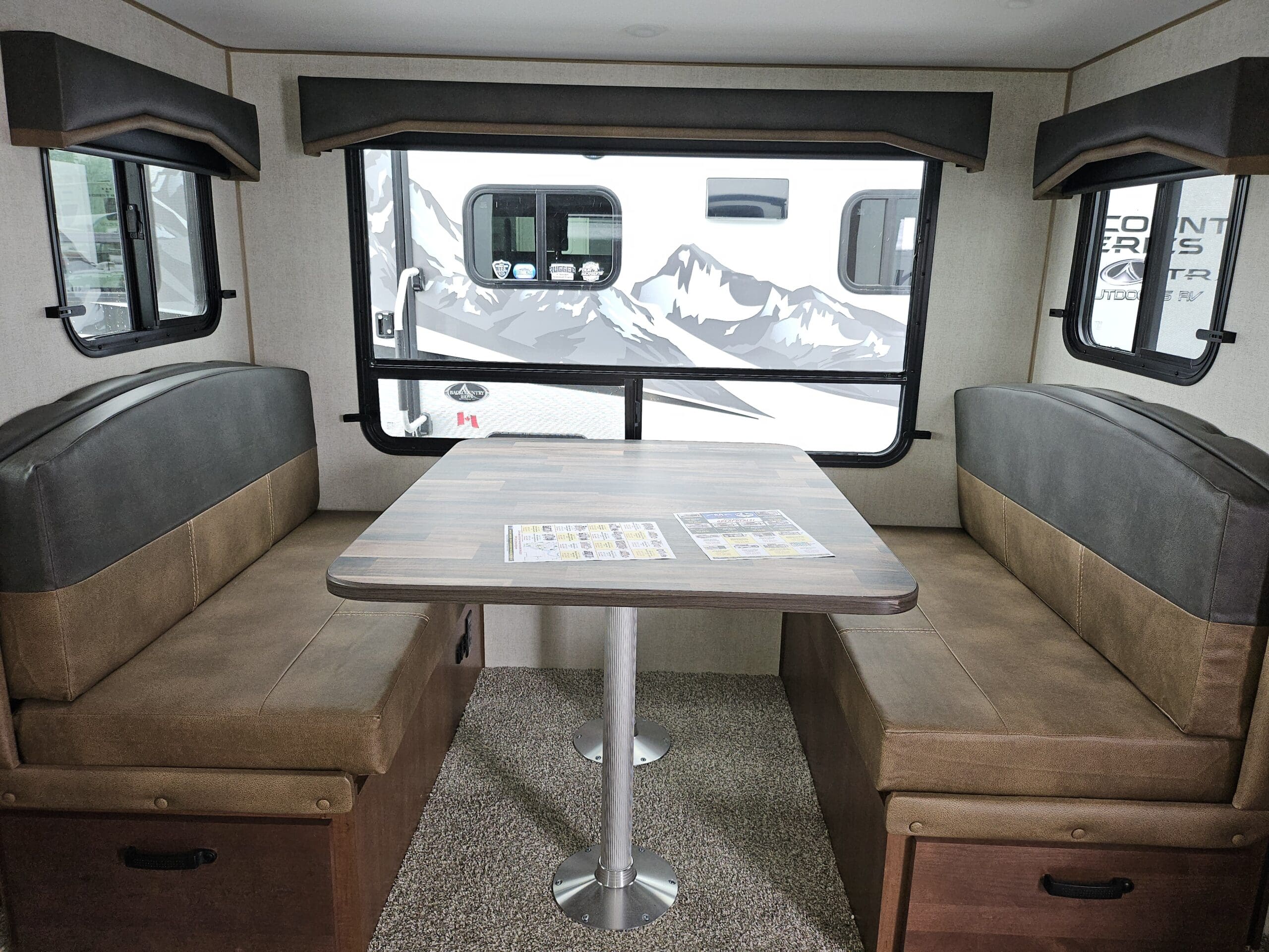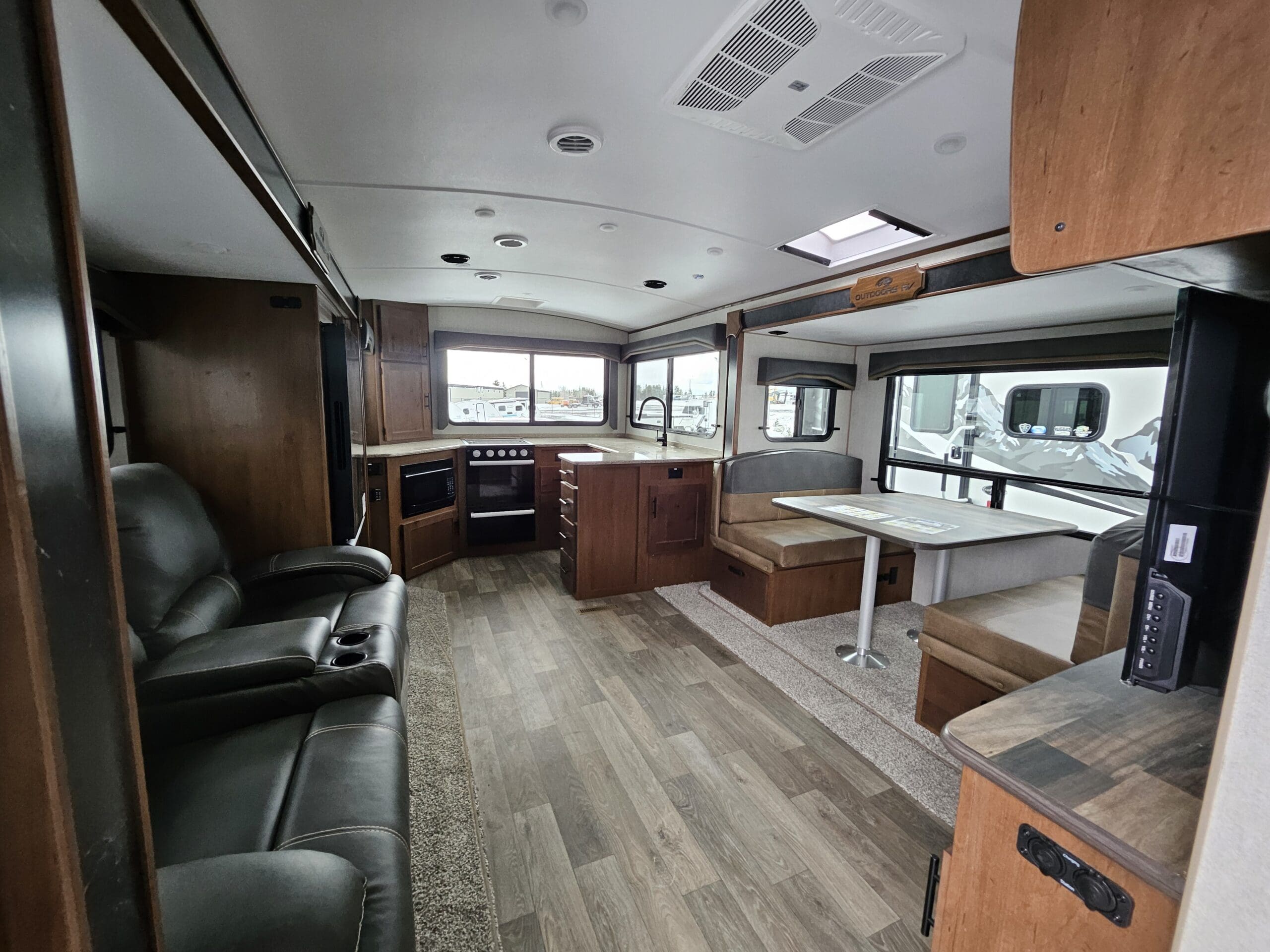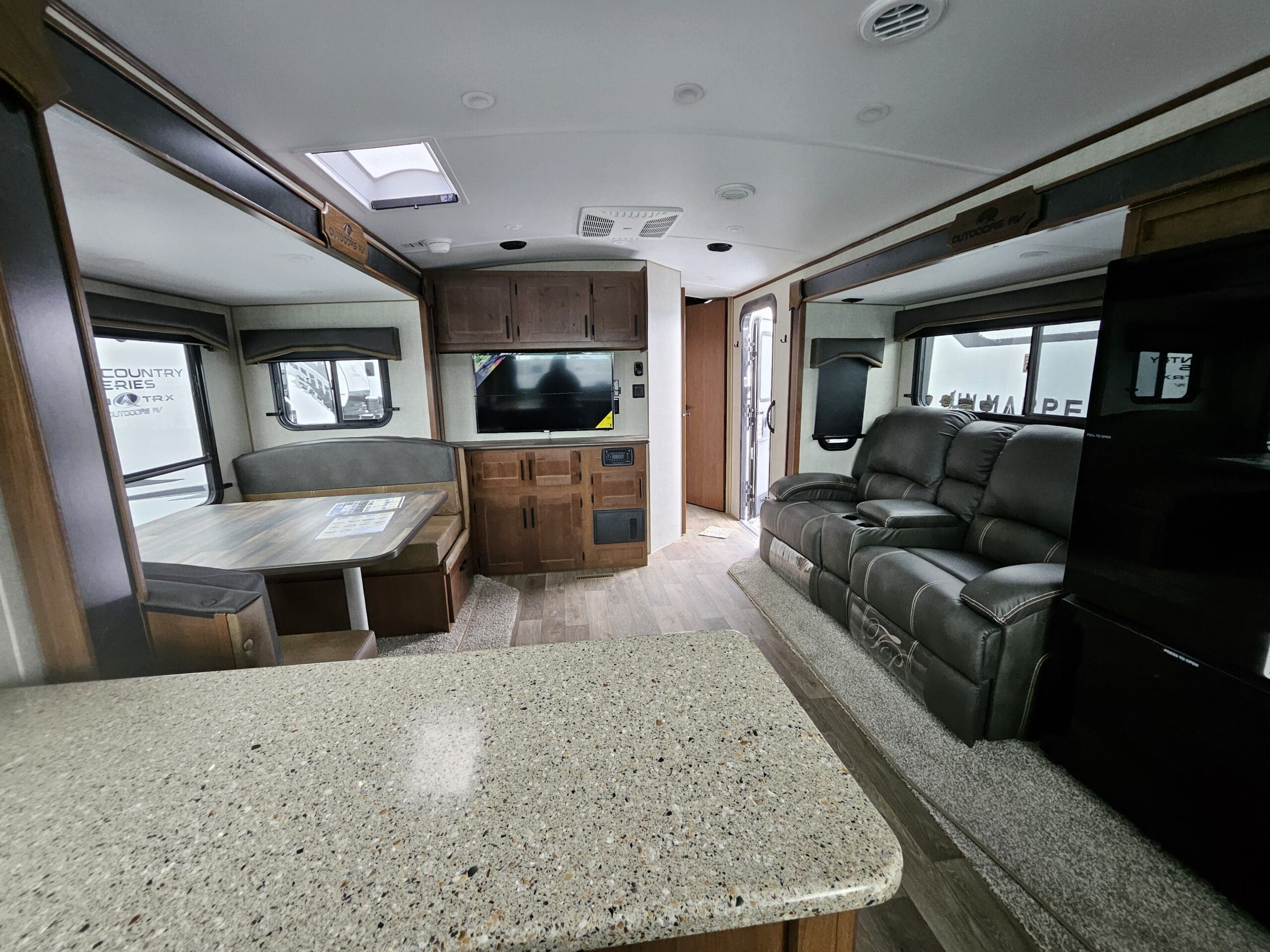 Opposing Slides: Creates a “great room” feel in the center of the trailer with theater seating/recliners facing a mountain dinette.